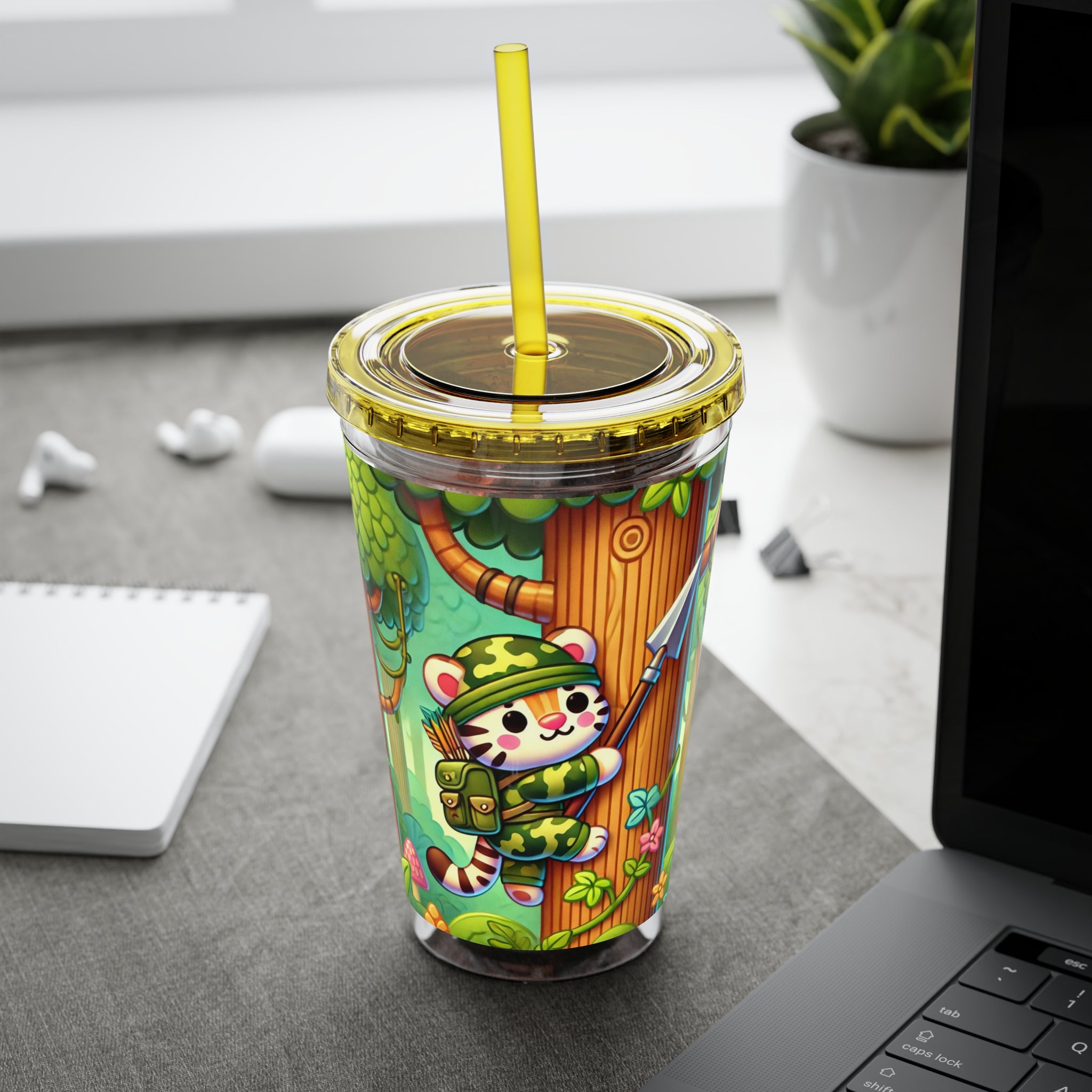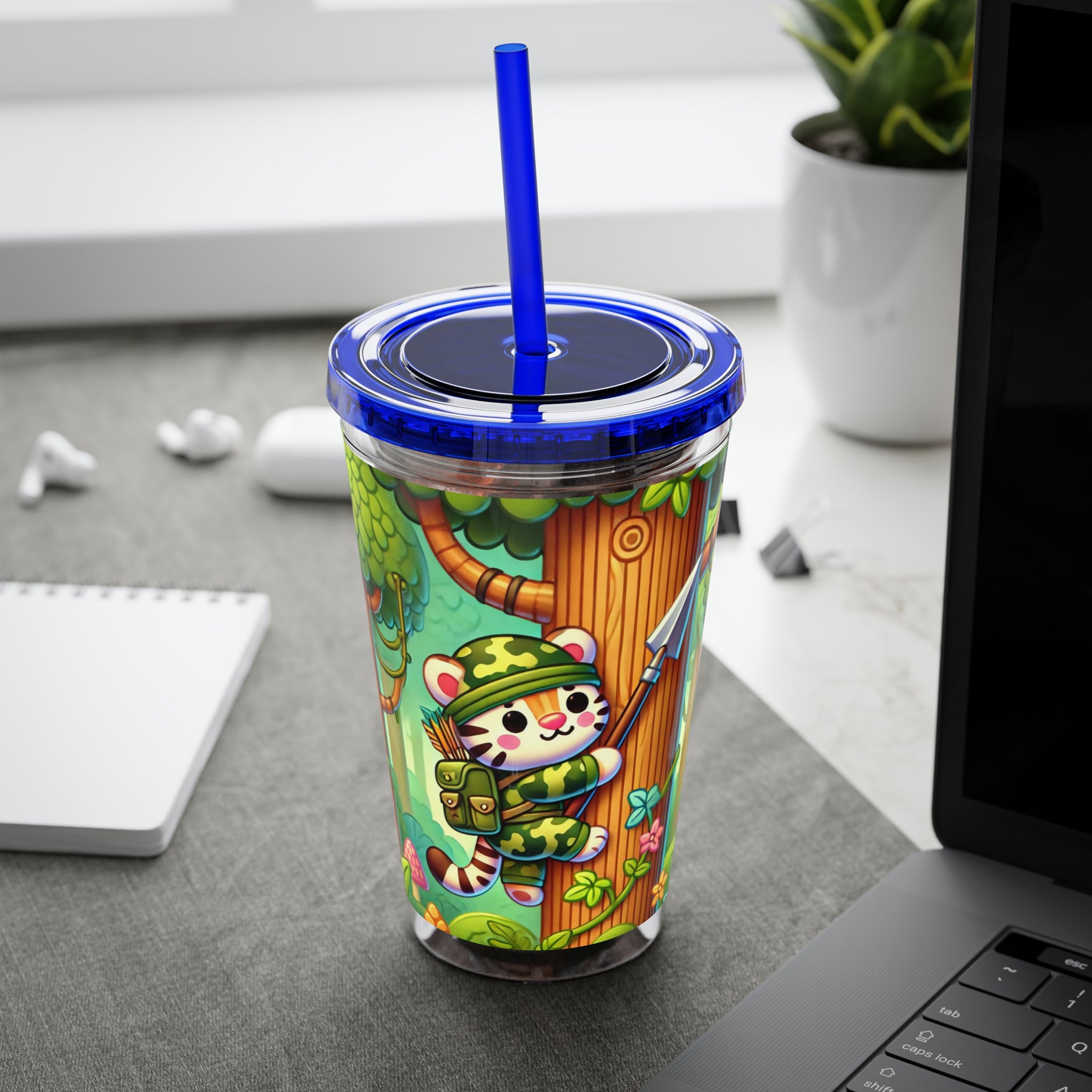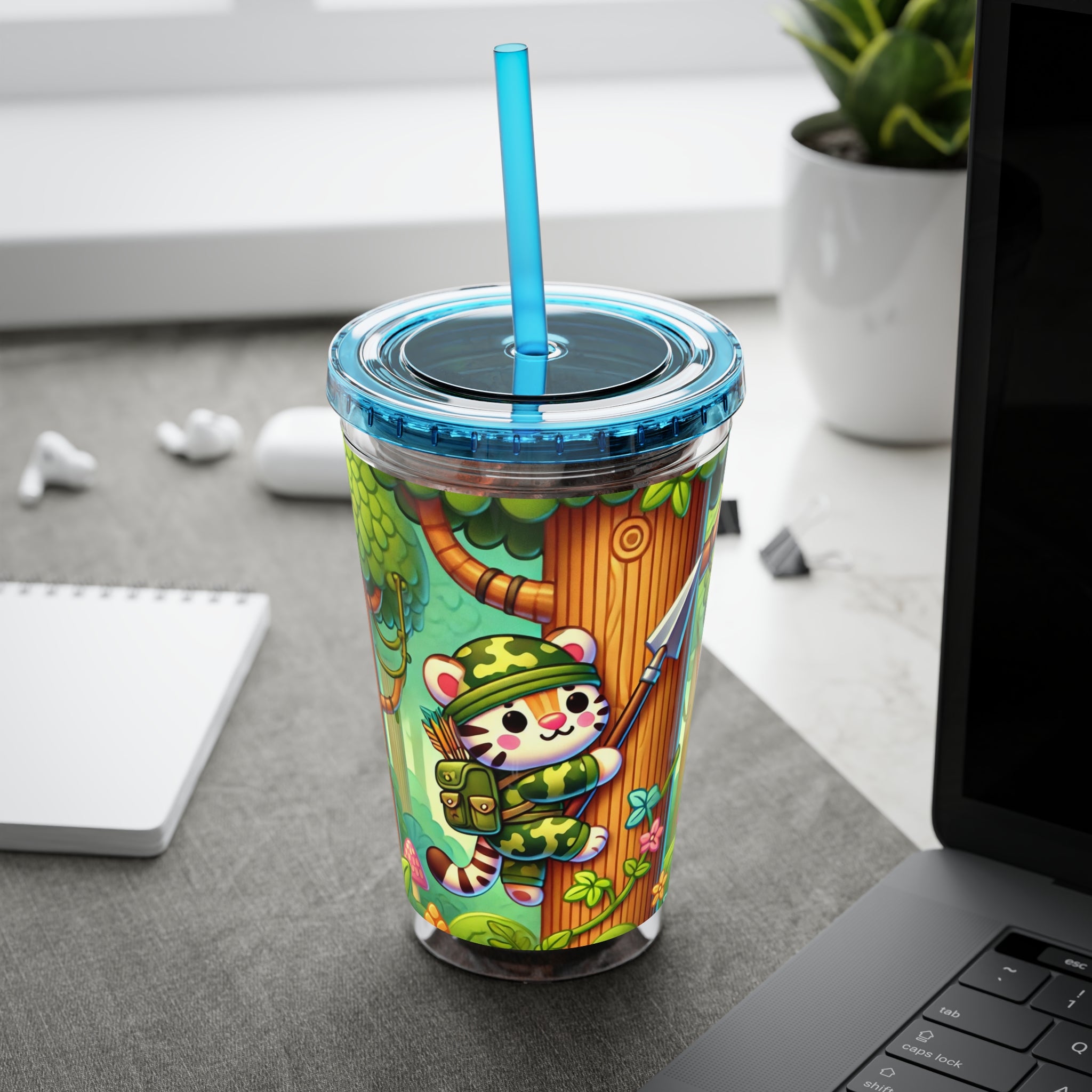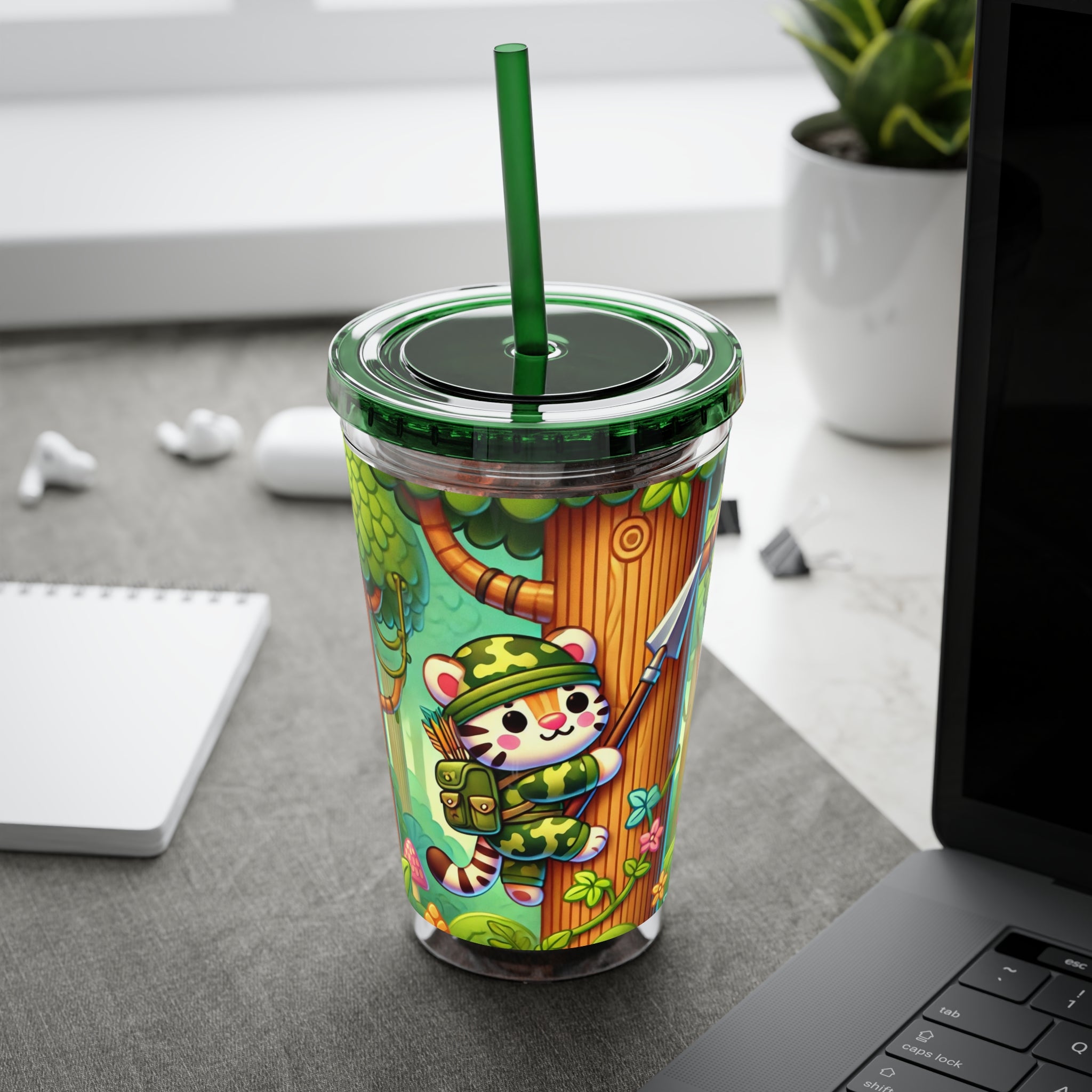 Created, designed, and digitally remastered by Sarasvati Designs, this super cute and whimsical illustration features a stealthy tiger in jungle camouflage, climbing a towering tree with a spear strapped to its back. The vibrant scene blends playful charm with an adventurous spirit, bringing the jungle to life in a fun and enchanting way.