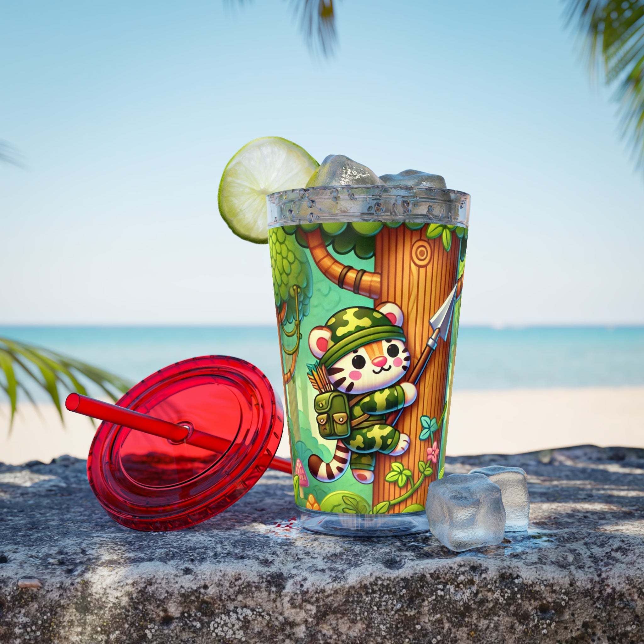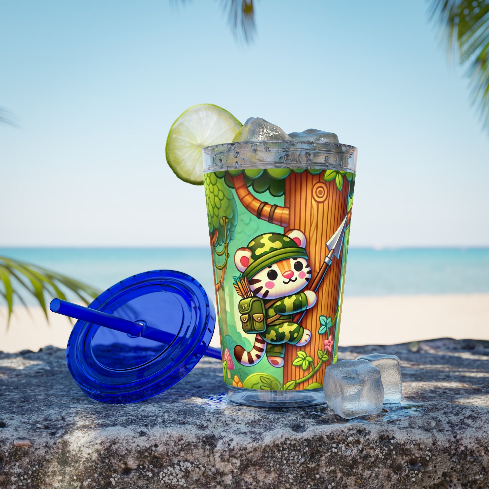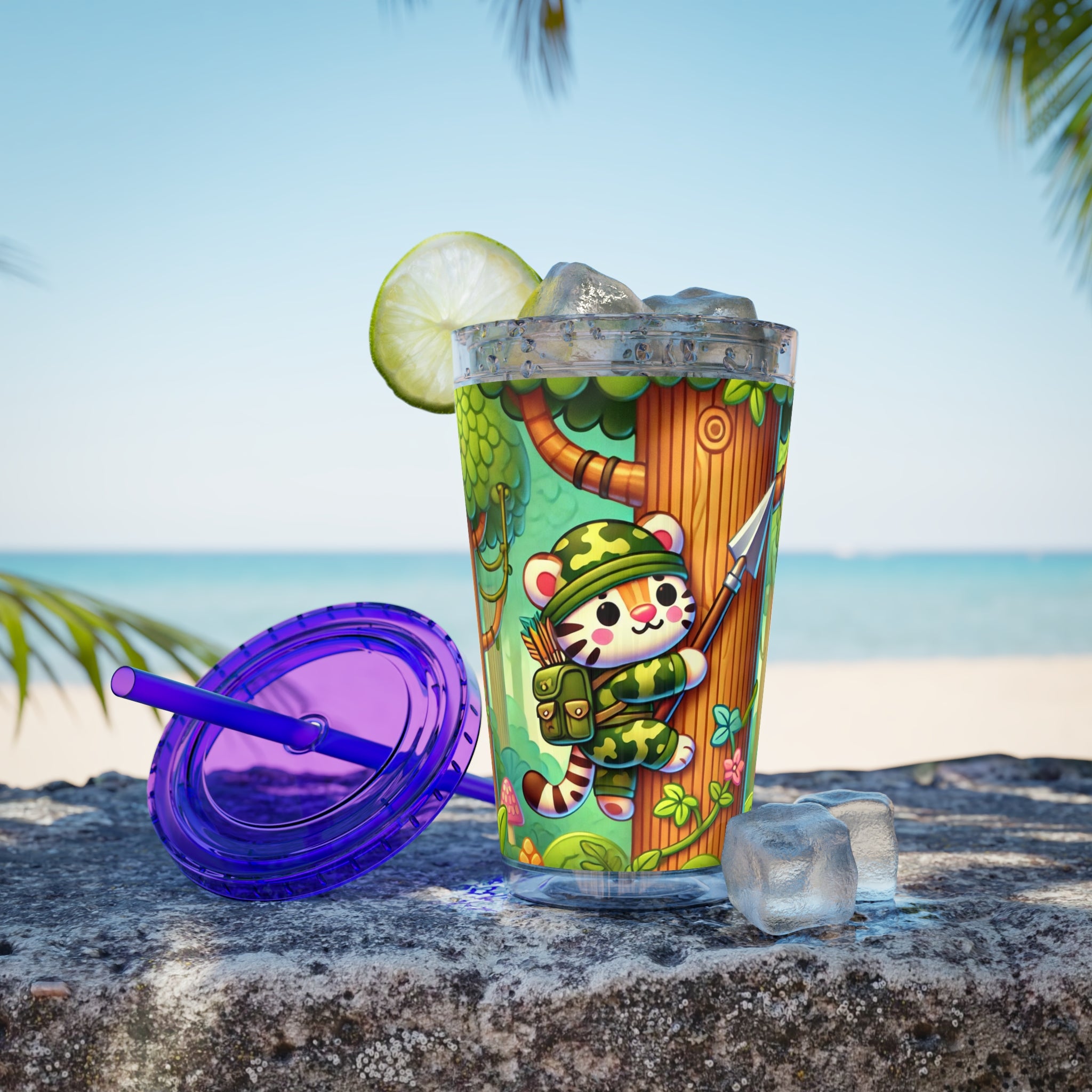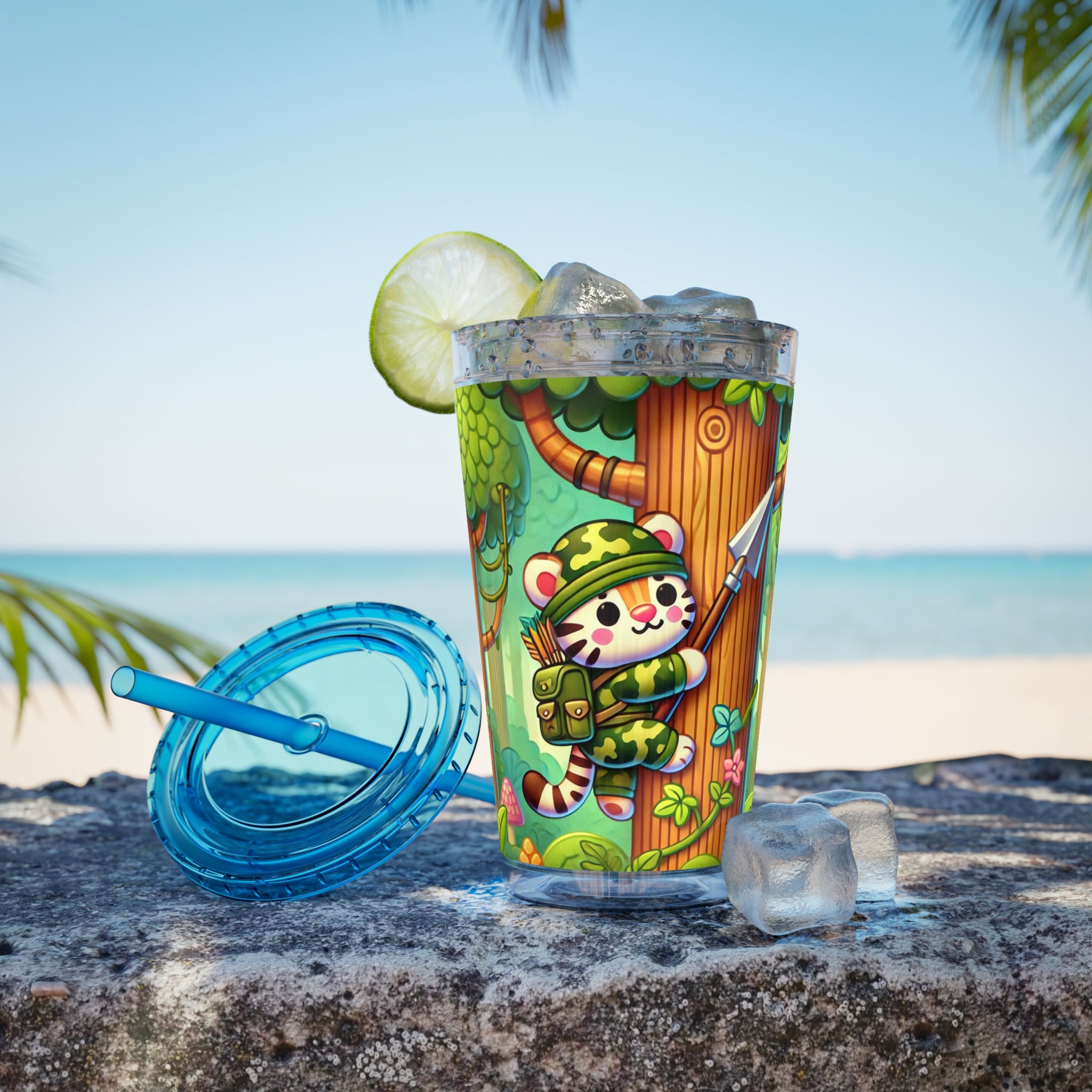 Created, designed, and digitally remastered by Sarasvati Designs, this super cute and whimsical illustration features a stealthy tiger in jungle camouflage, climbing a towering tree with a spear strapped to its back. The vibrant scene blends playful charm with an adventurous spirit, bringing the jungle to life in a fun and enchanting way.