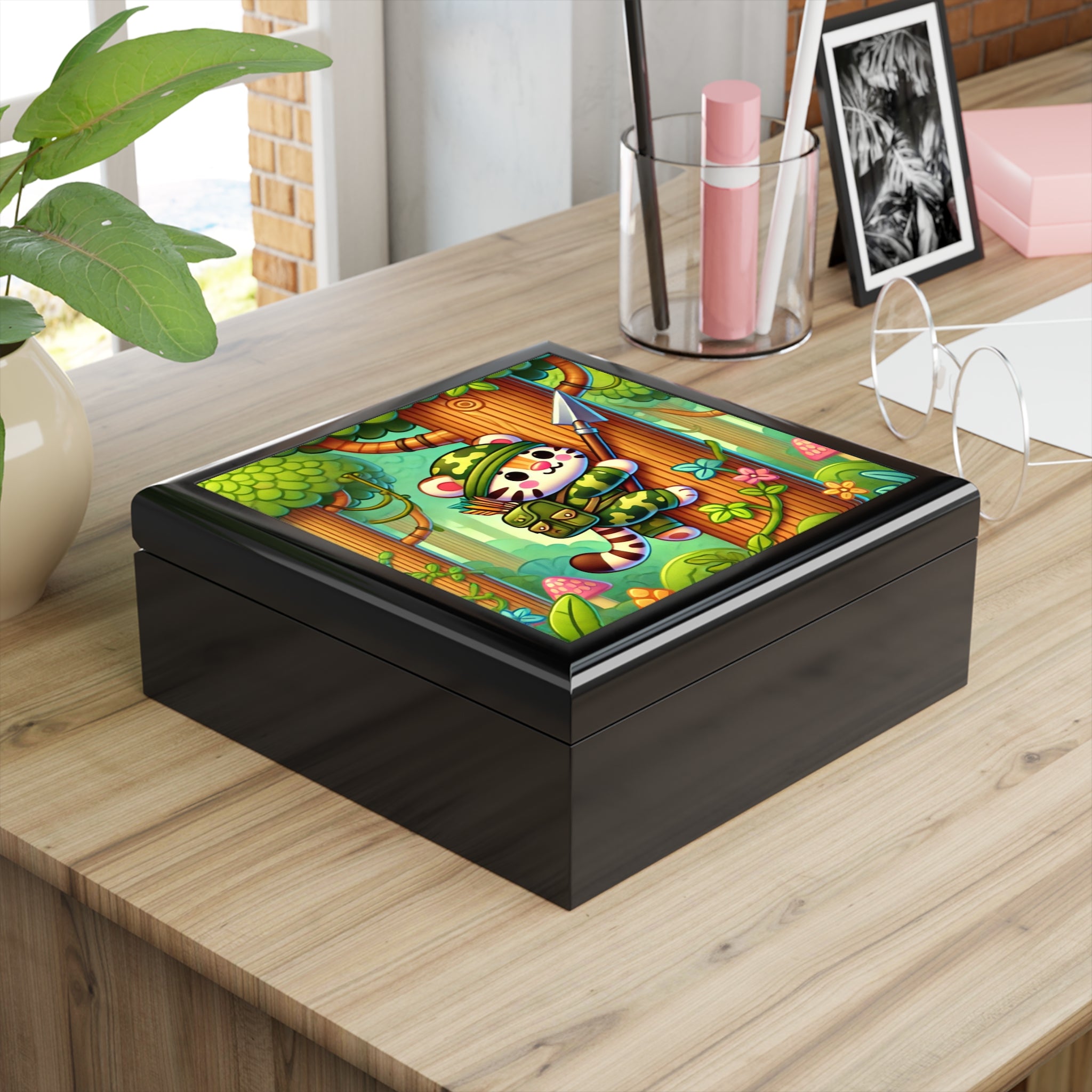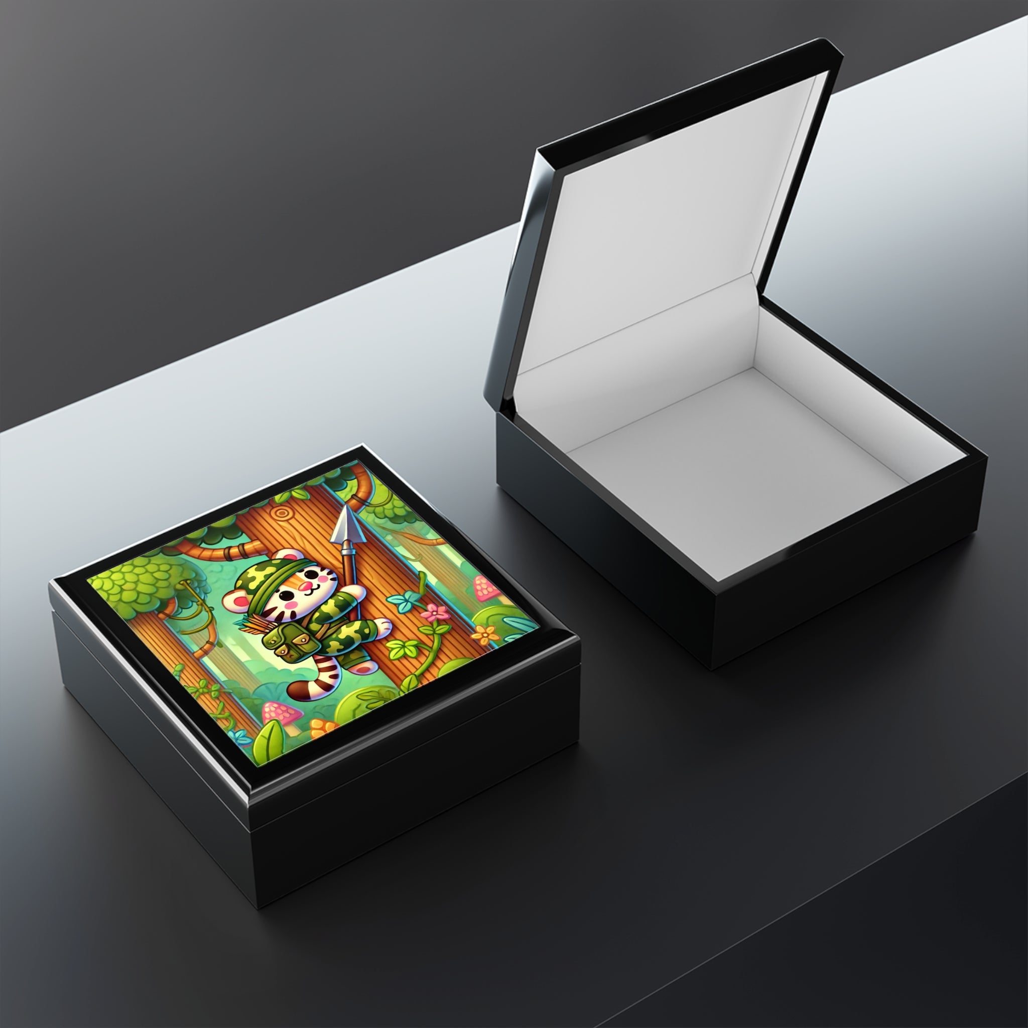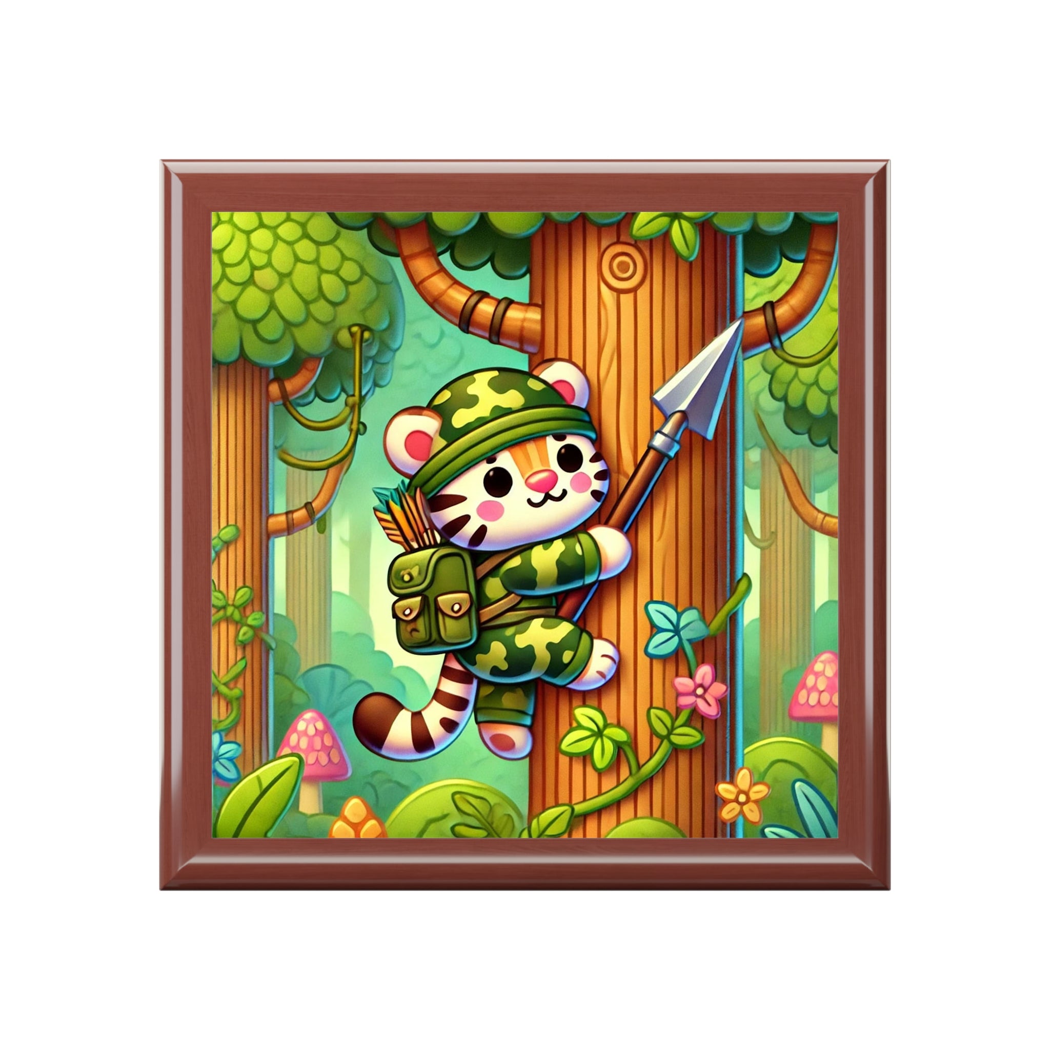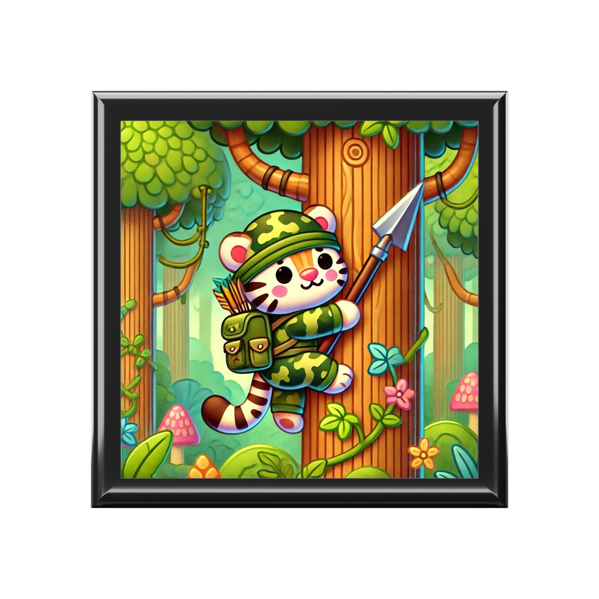 Stealthy Stripes Tiger Explorer Chest is made for young adventurers, collectors, and daydreamers who love mysterious jungles and bold stories. On the glossy ceramic tile lid, a stealthy tiger expertly blends into jungle camouflage as it climbs a towering tree, a spear strapped confidently to its back. The vibrant scene strikes the perfect balance between playful charm and adventurous spirit, turning this chest into a tiny glimpse of a hidden world deep in the wild.