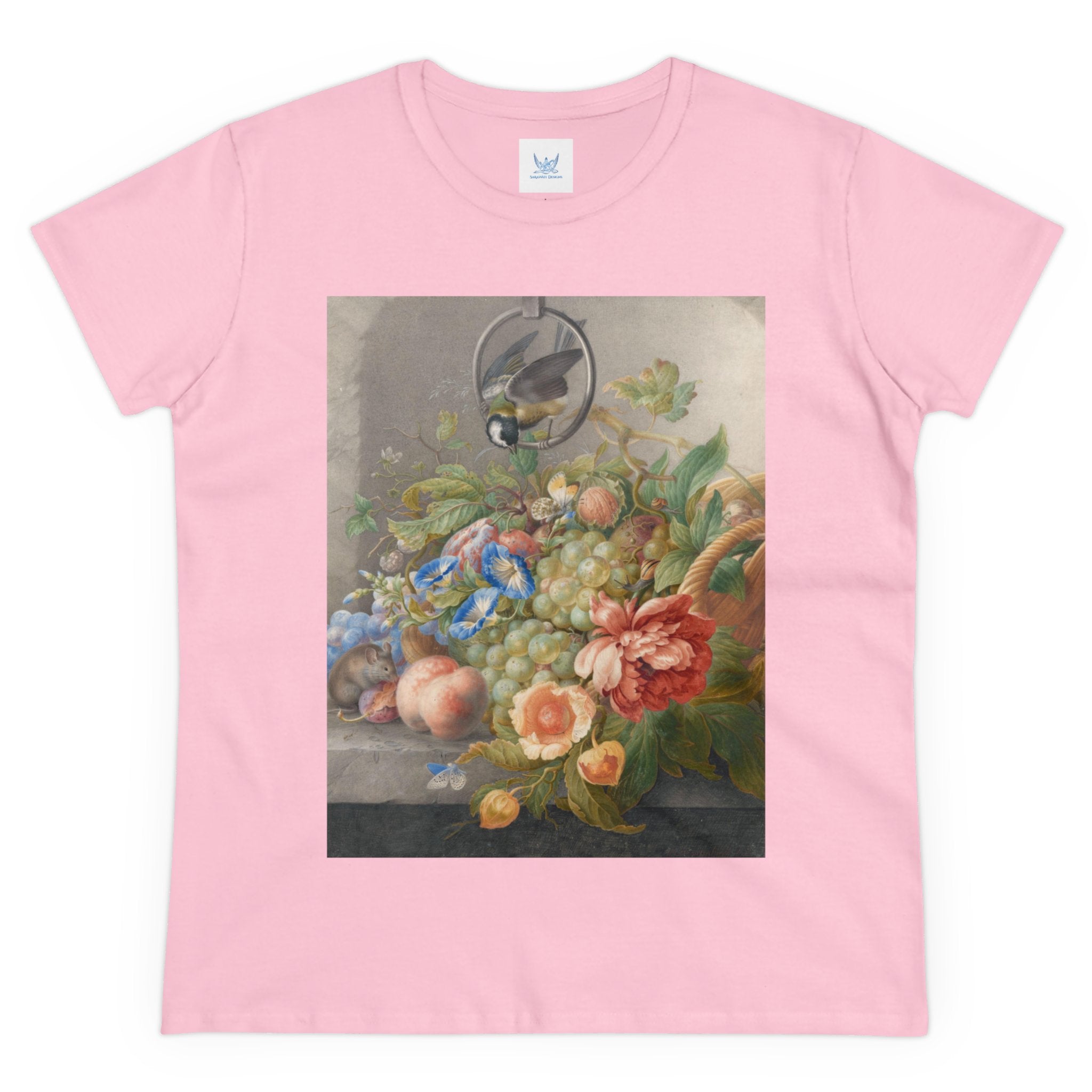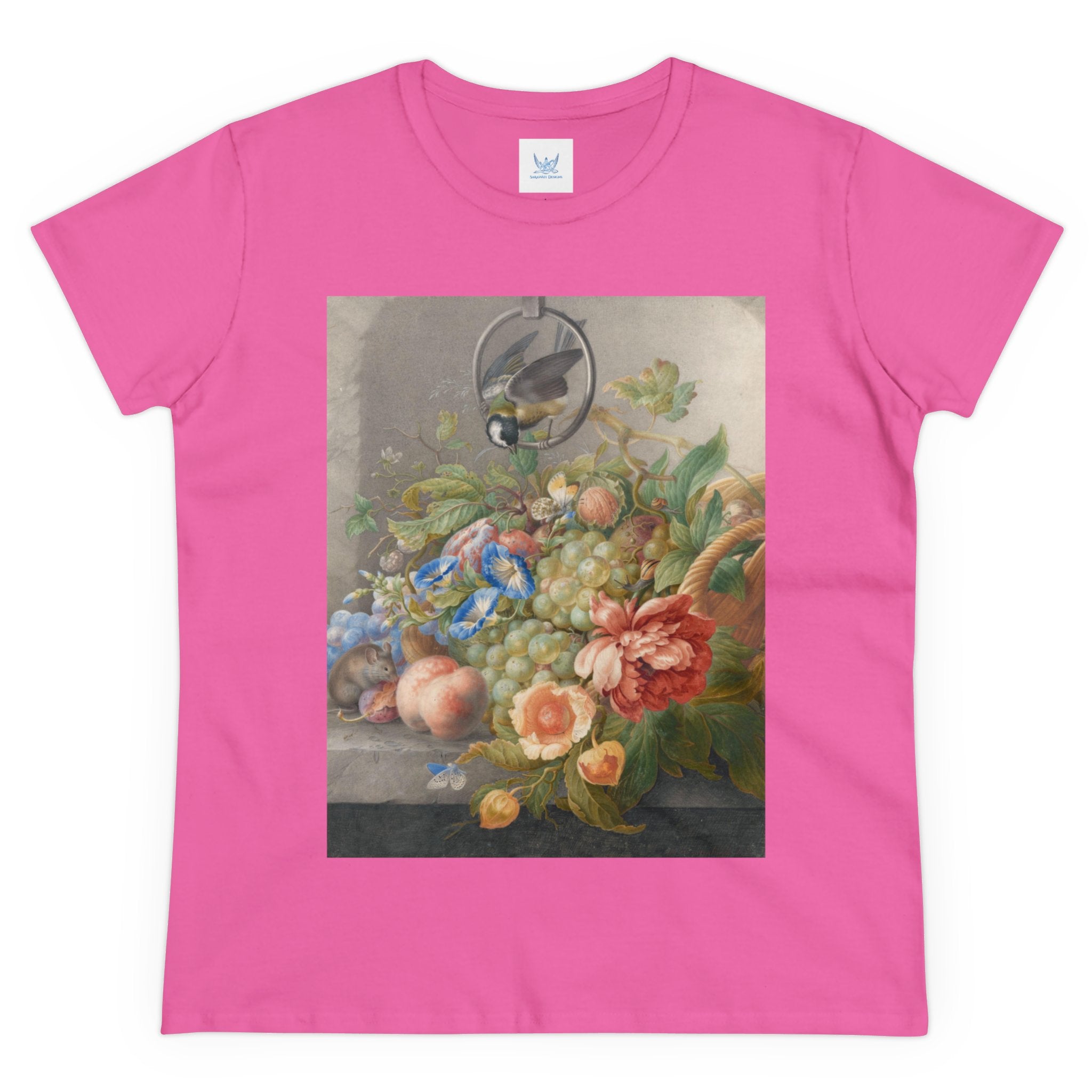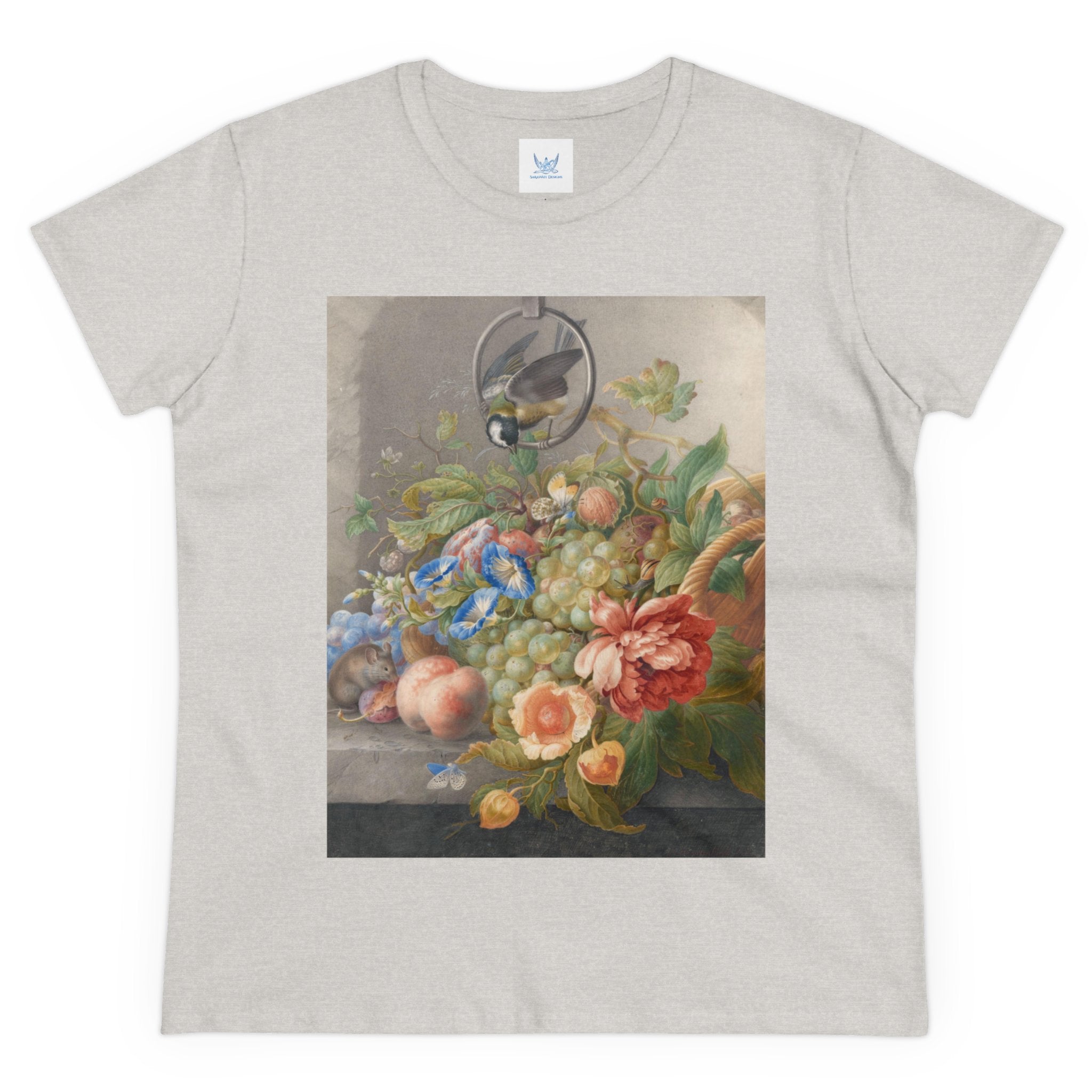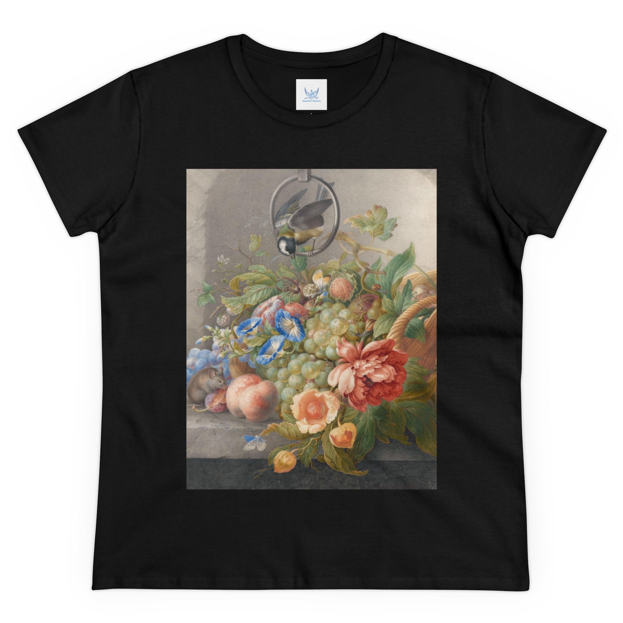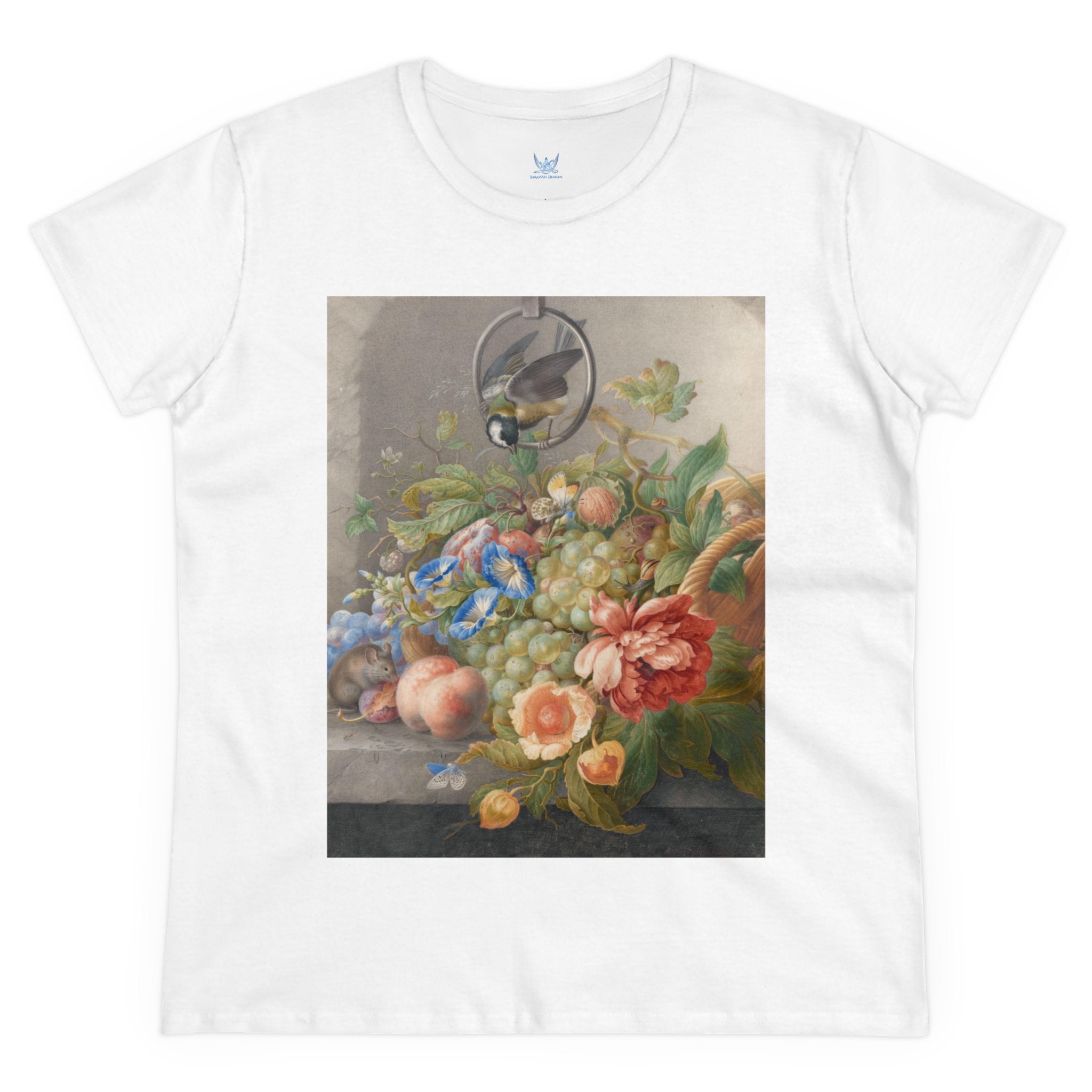 Artwork designed and digitally remastered by Sarasvati Designs. "Still Life With Flowers, Fruit, A Great Tit And A Mouse" by Herman Henstenburgh is a captivating and meticulously detailed artwork that brings together elements of nature in a harmonious composition. The painting features an assortment of vibrant flowers, ripe fruits, a great tit bird, and a curious mouse, all carefully arranged on a tabletop.