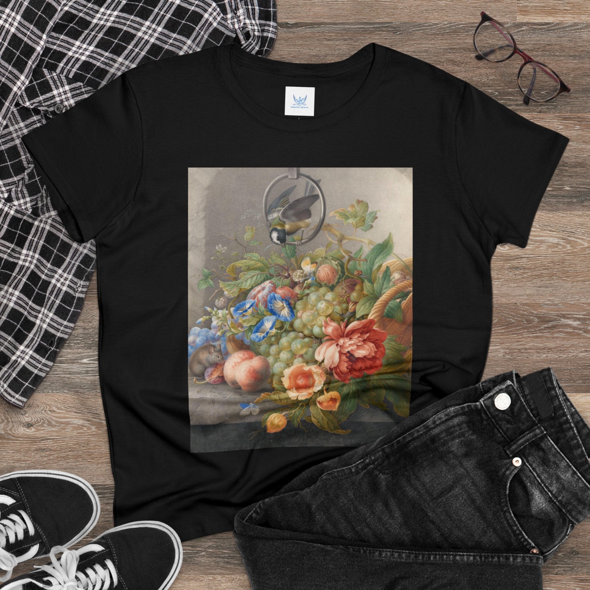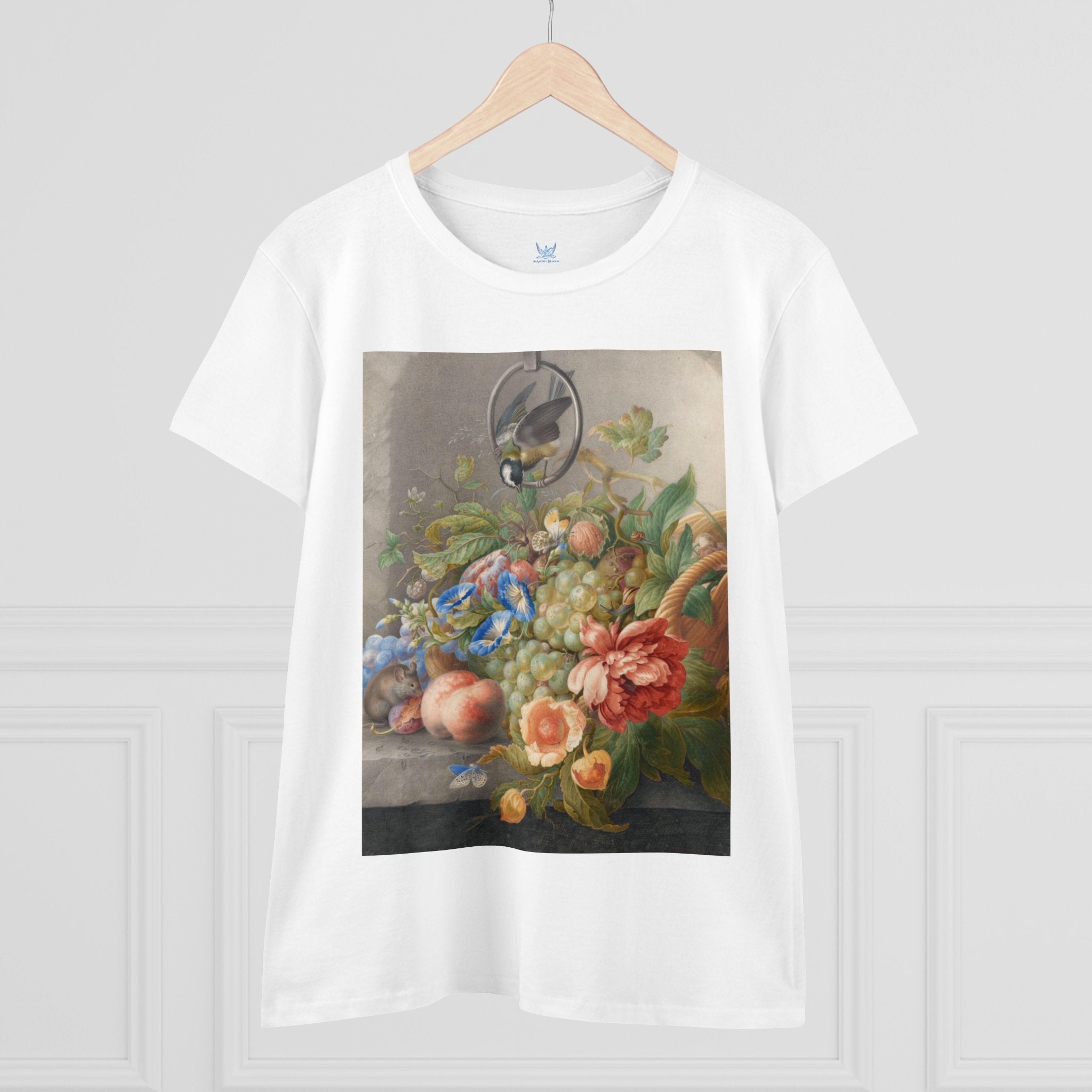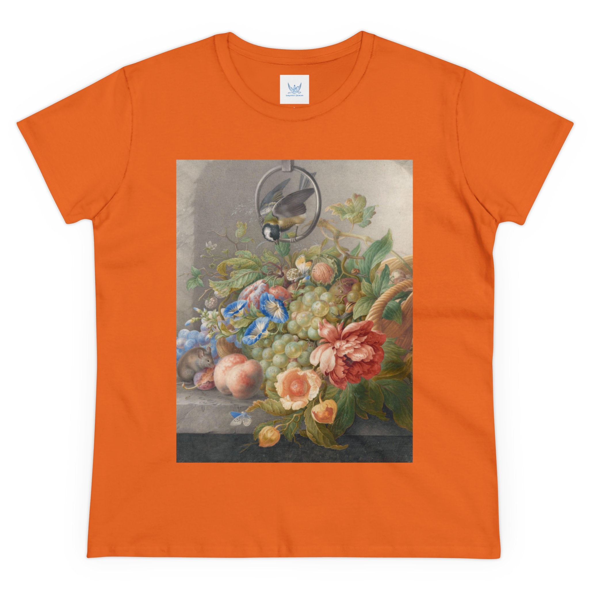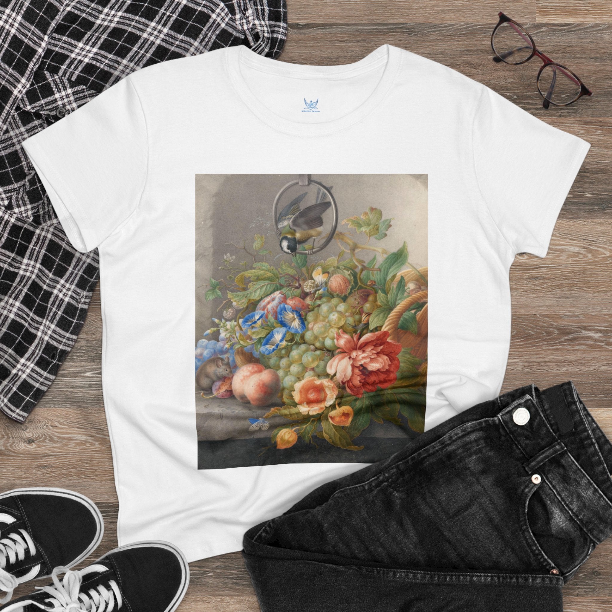 Artwork designed and digitally remastered by Sarasvati Designs. "Still Life With Flowers, Fruit, A Great Tit And A Mouse" by Herman Henstenburgh is a captivating and meticulously detailed artwork that brings together elements of nature in a harmonious composition. The painting features an assortment of vibrant flowers, ripe fruits, a great tit bird, and a curious mouse, all carefully arranged on a tabletop.