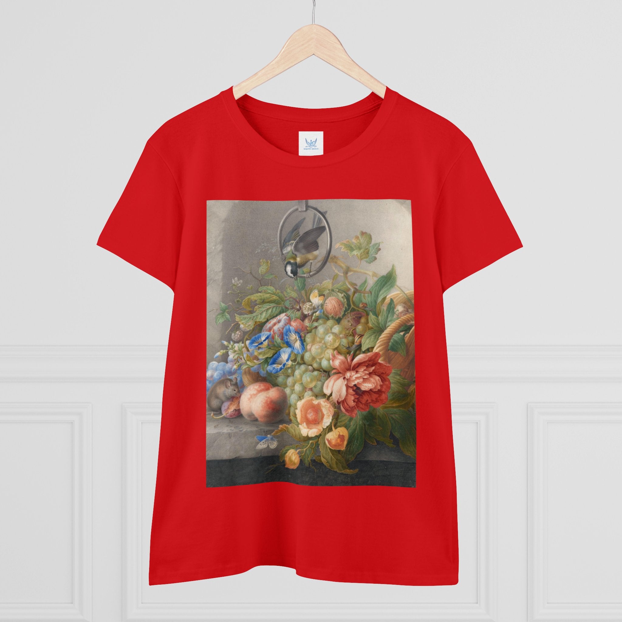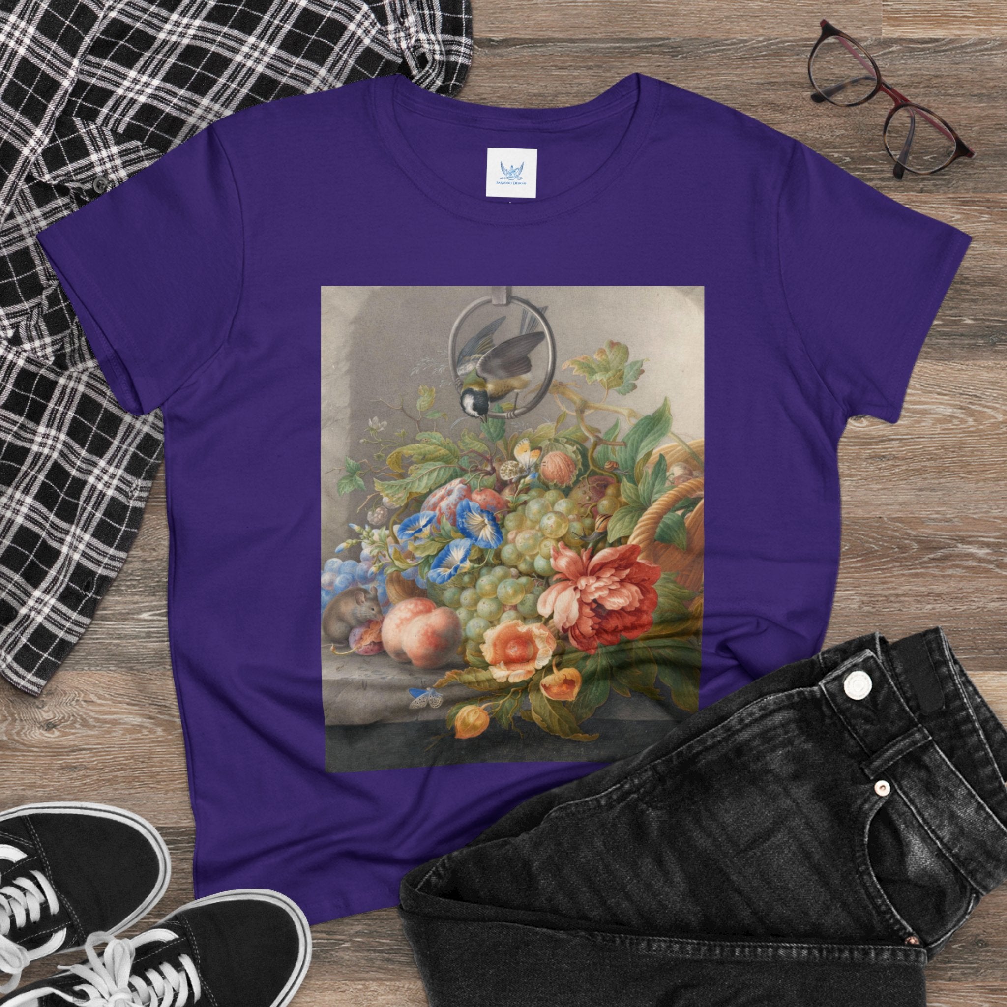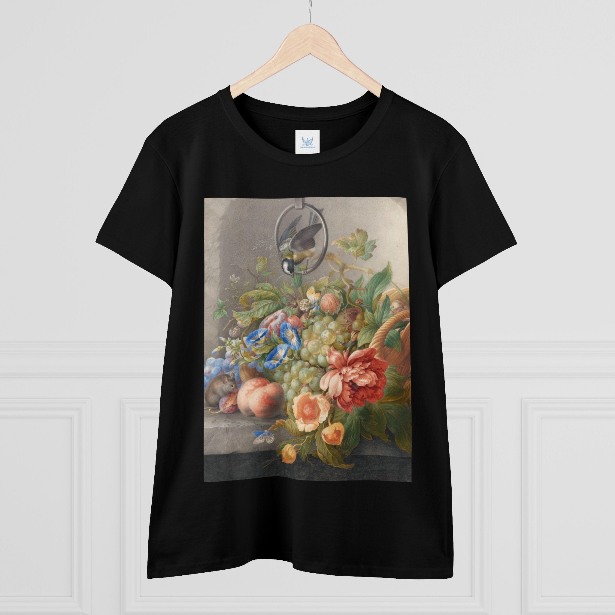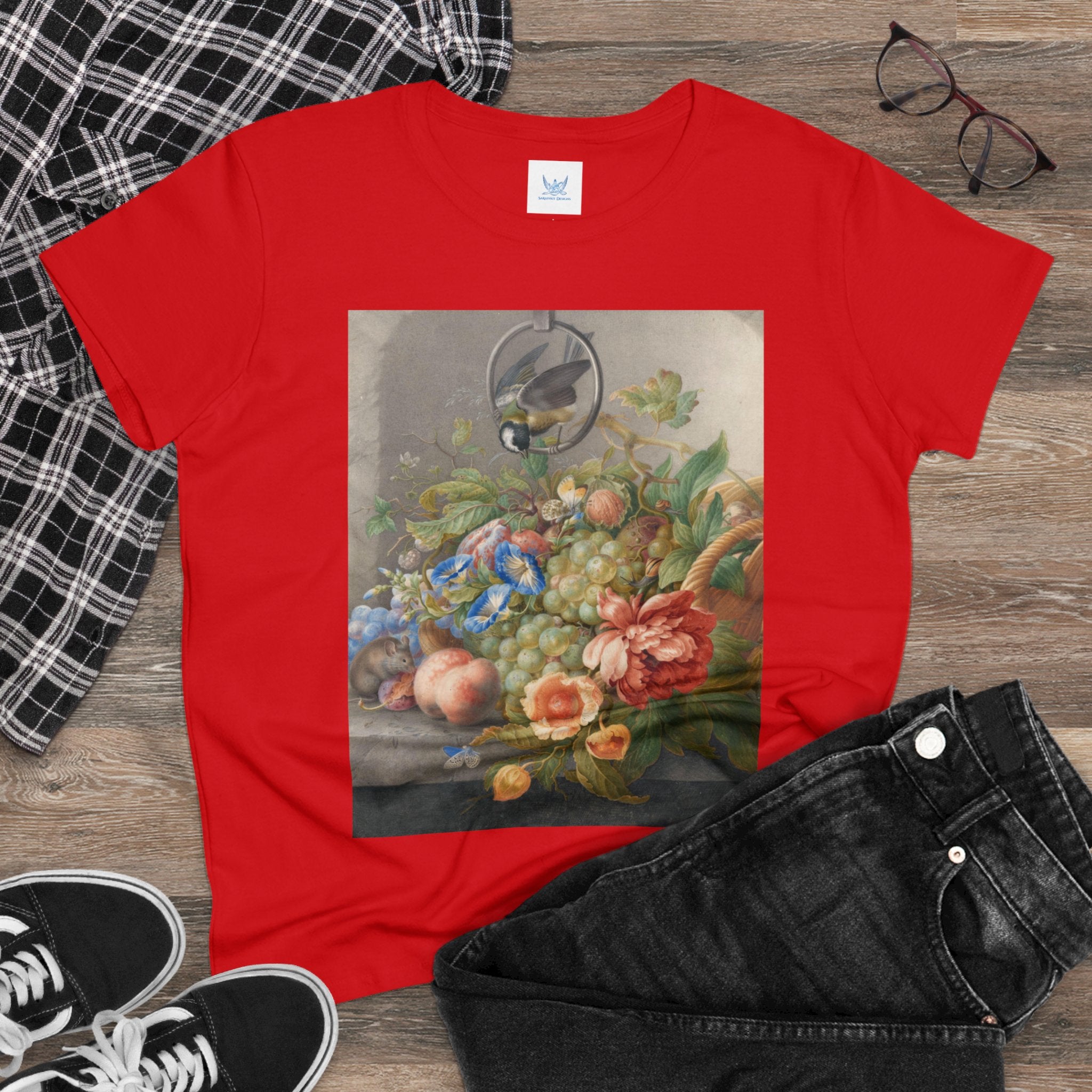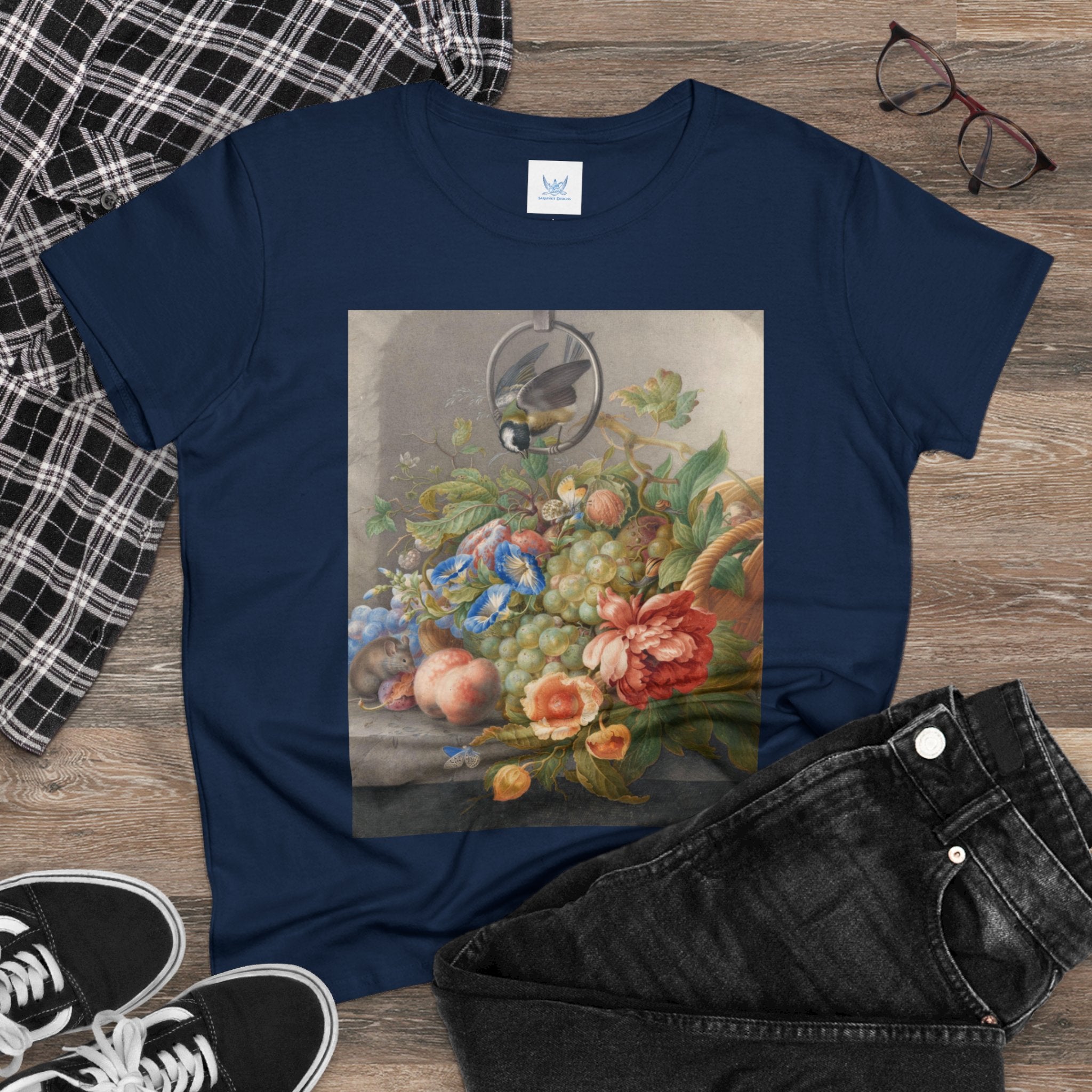 Artwork designed and digitally remastered by Sarasvati Designs. "Still Life With Flowers, Fruit, A Great Tit And A Mouse" by Herman Henstenburgh is a captivating and meticulously detailed artwork that brings together elements of nature in a harmonious composition. The painting features an assortment of vibrant flowers, ripe fruits, a great tit bird, and a curious mouse, all carefully arranged on a tabletop.