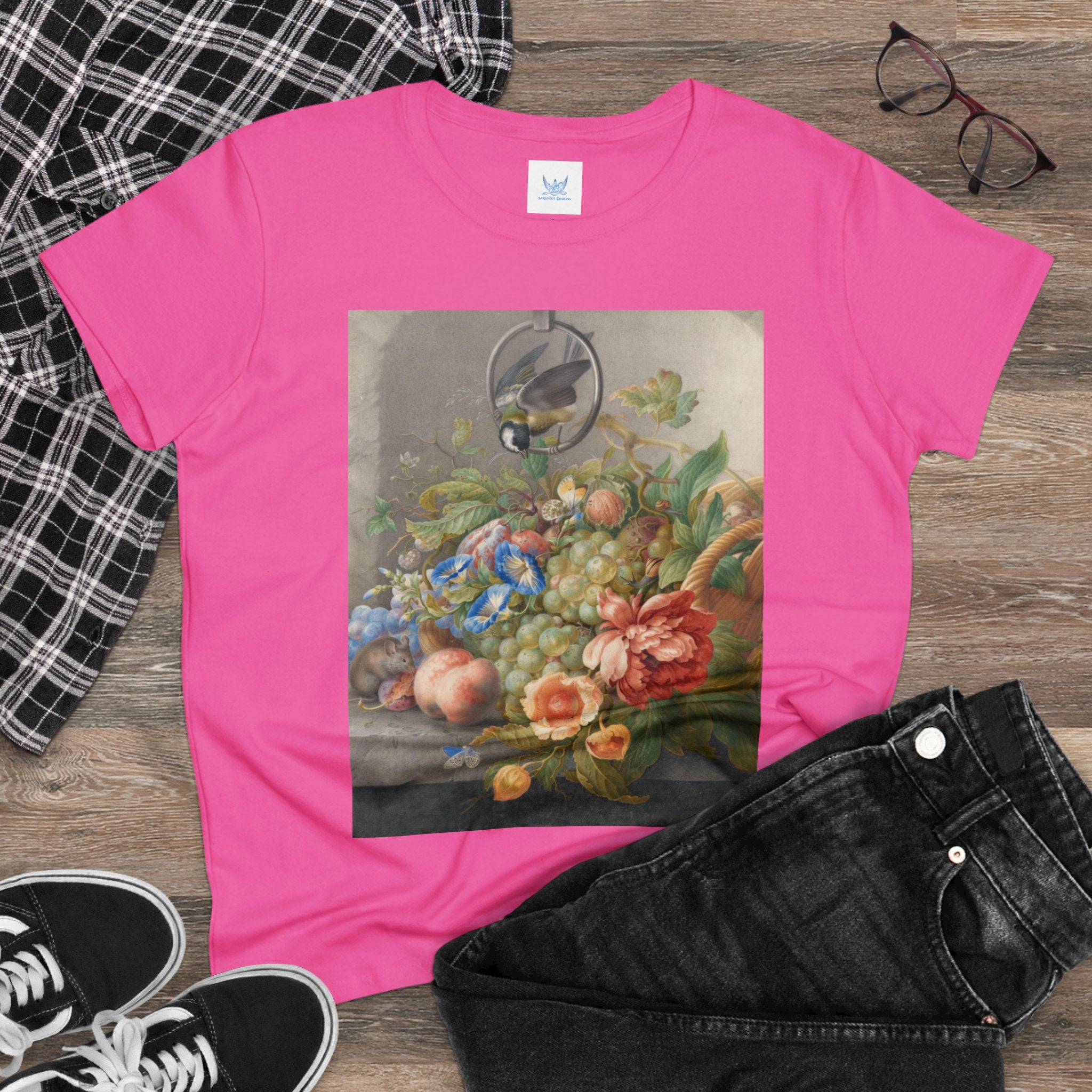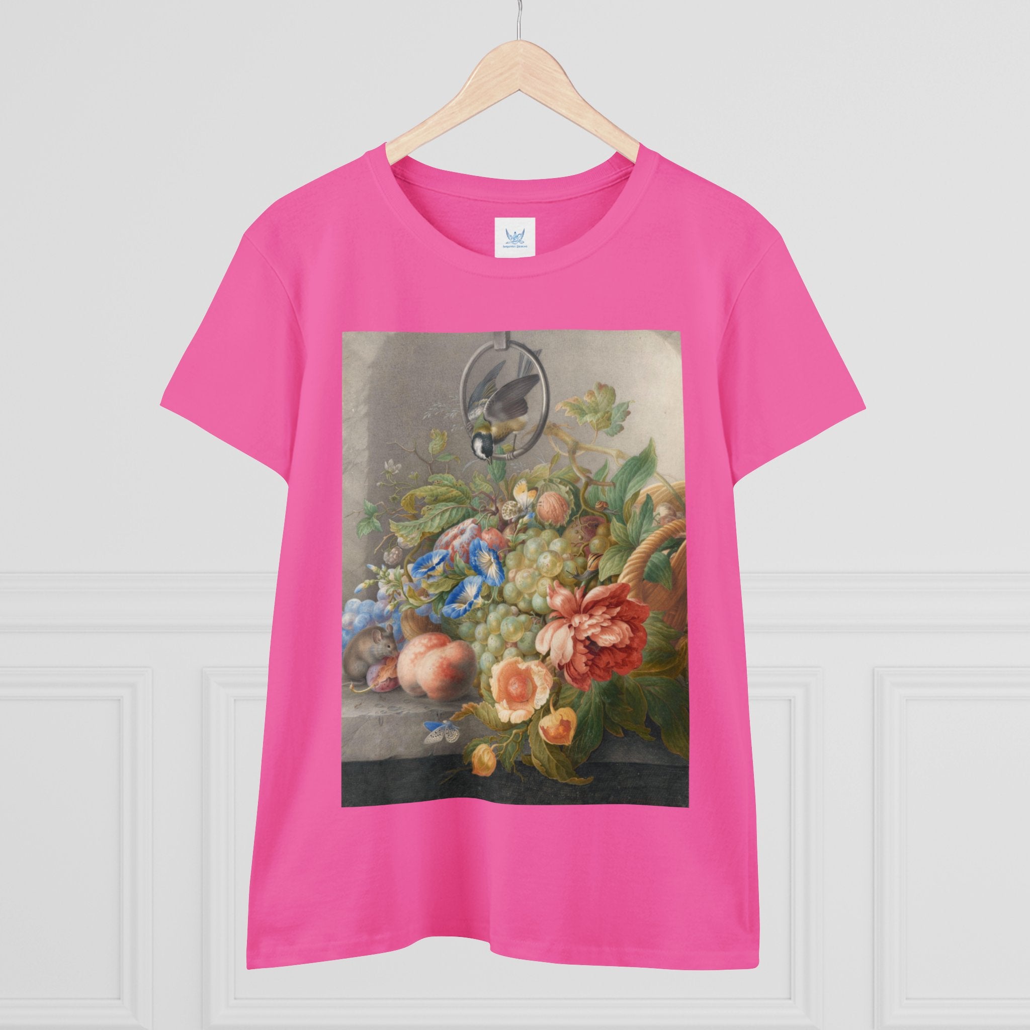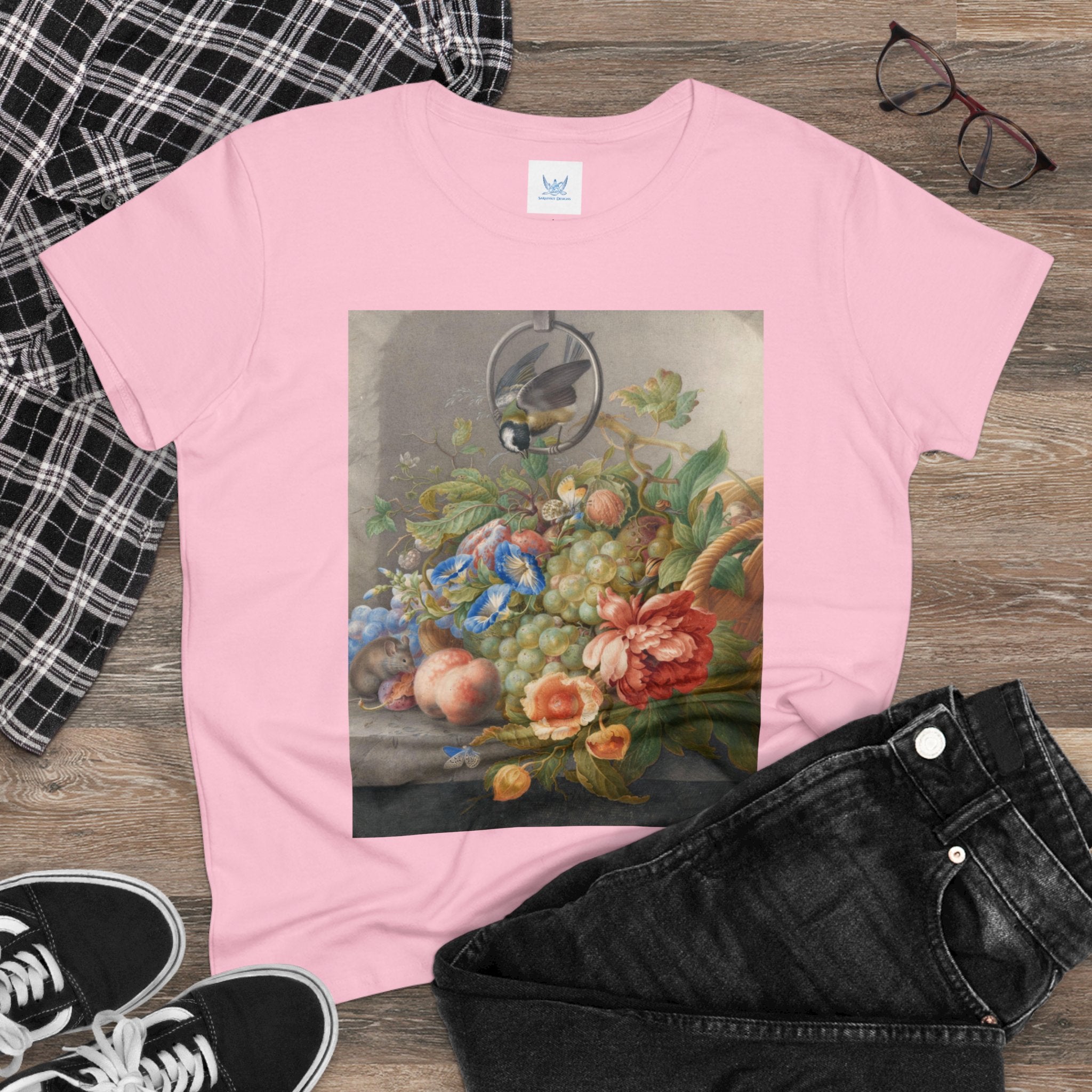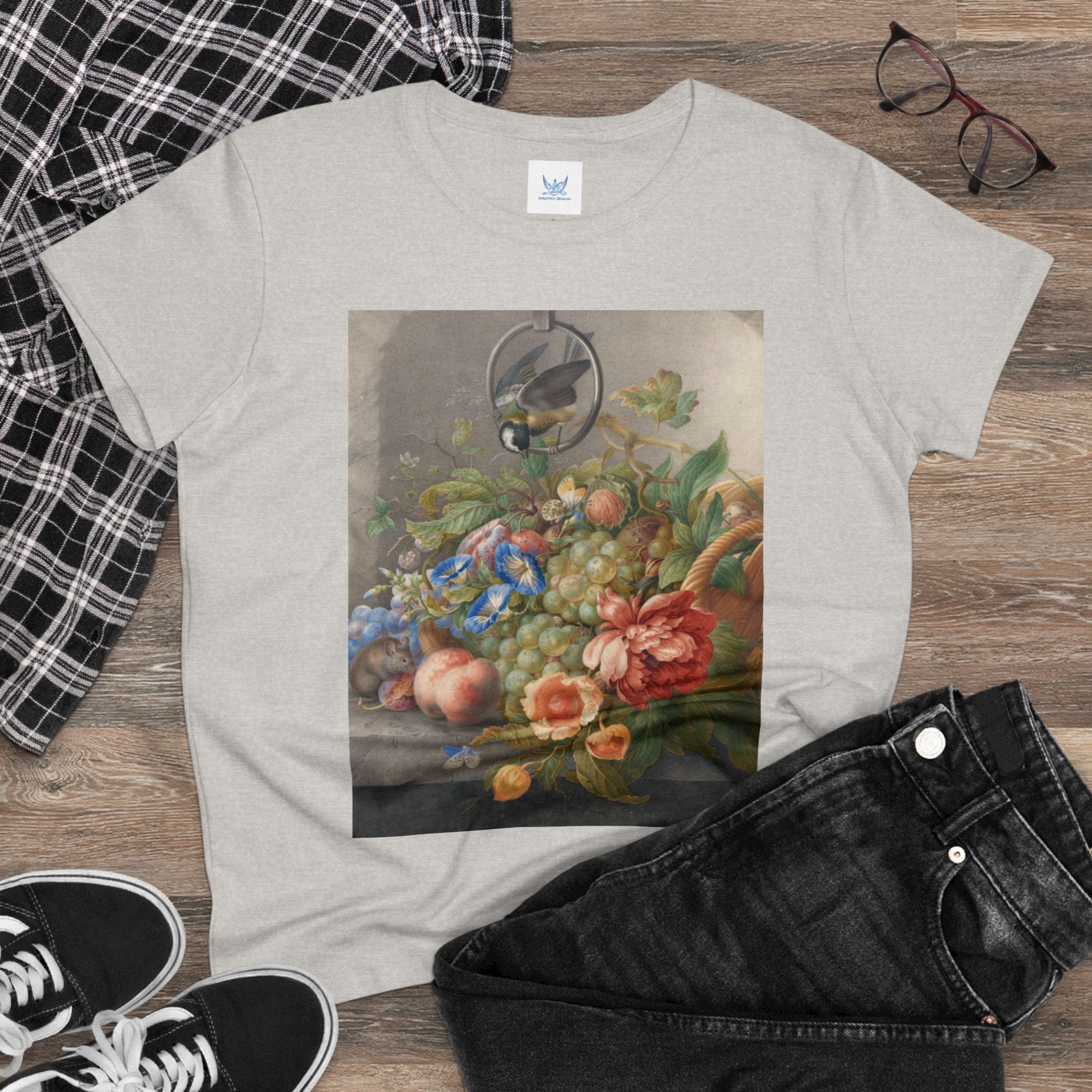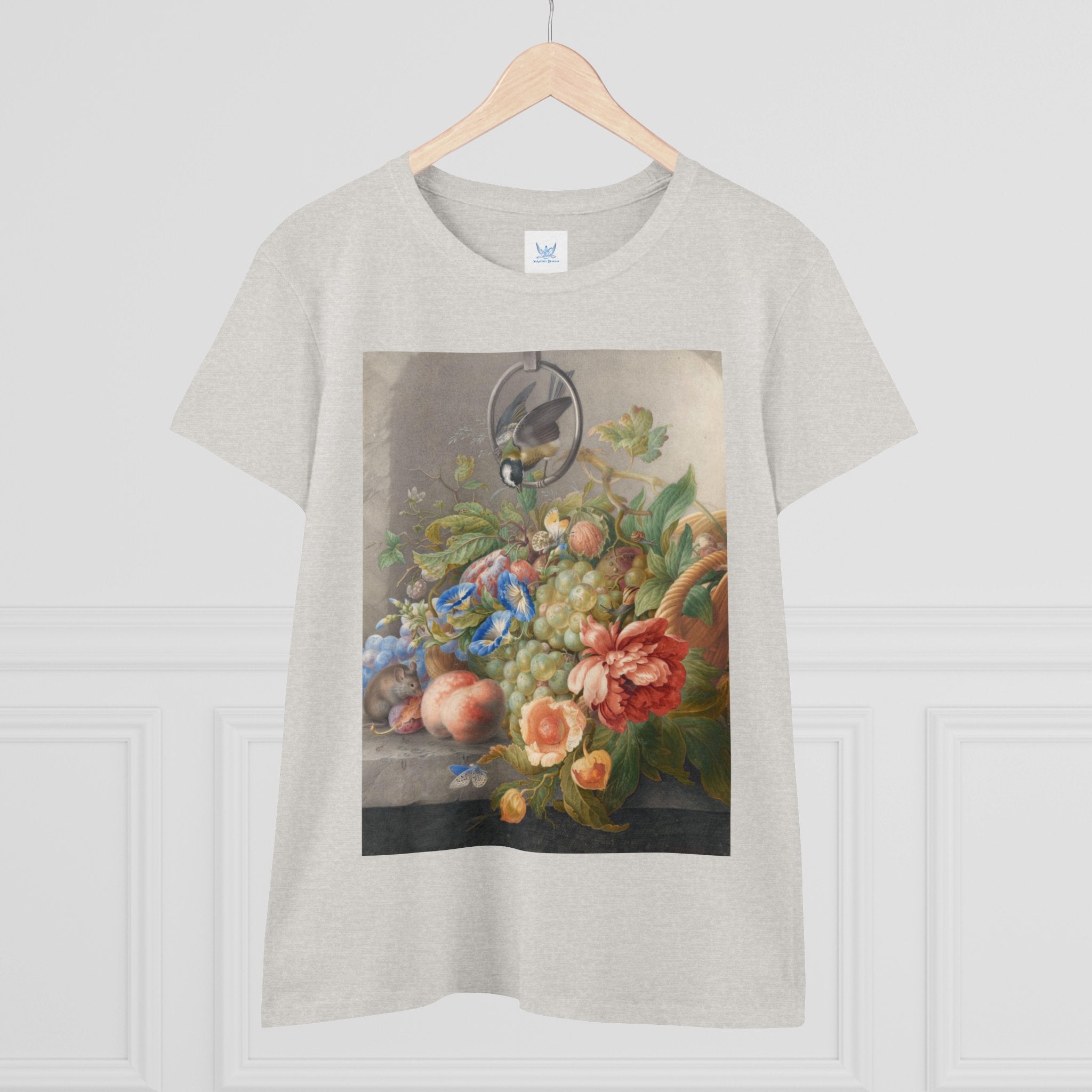 Artwork designed and digitally remastered by Sarasvati Designs. "Still Life With Flowers, Fruit, A Great Tit And A Mouse" by Herman Henstenburgh is a captivating and meticulously detailed artwork that brings together elements of nature in a harmonious composition. The painting features an assortment of vibrant flowers, ripe fruits, a great tit bird, and a curious mouse, all carefully arranged on a tabletop.