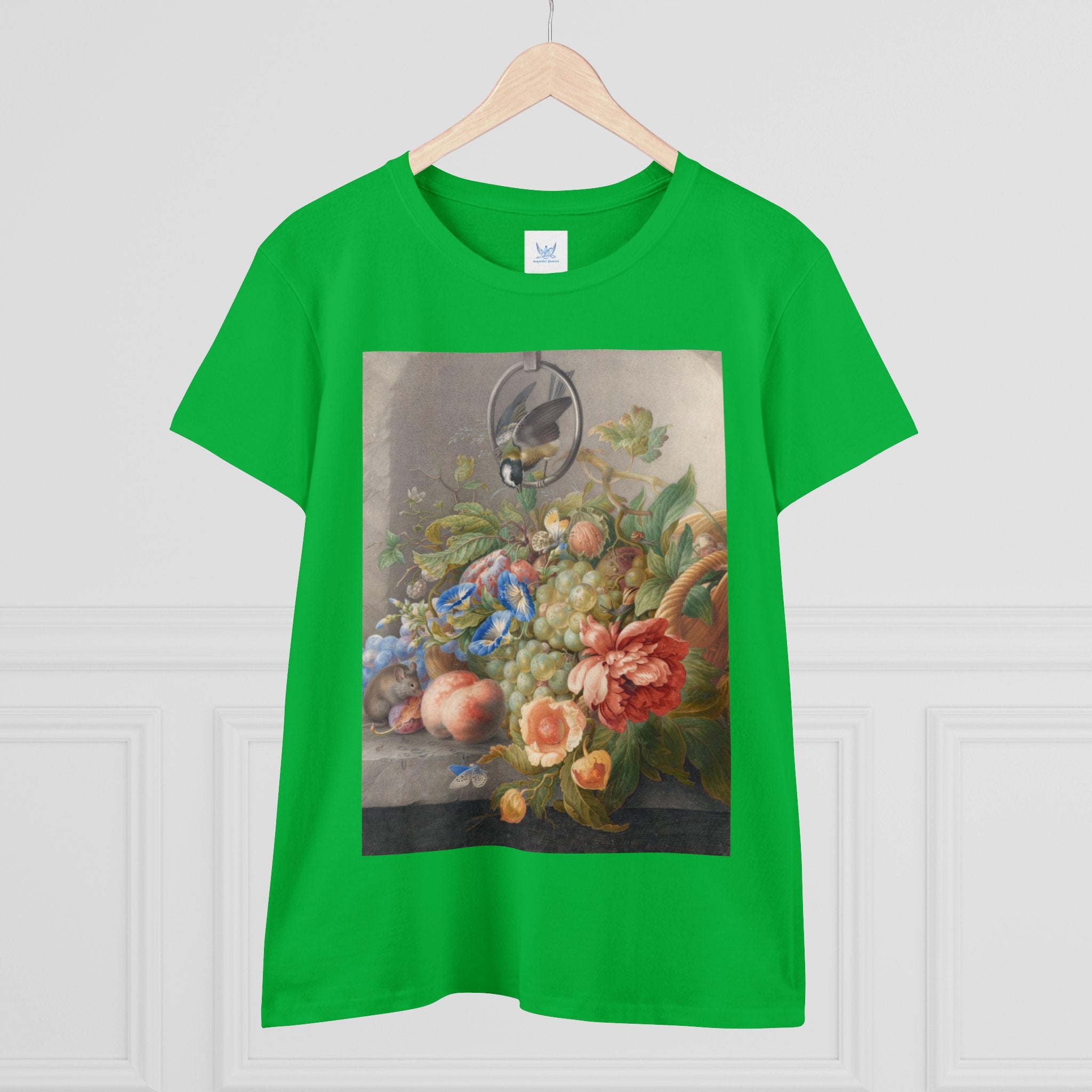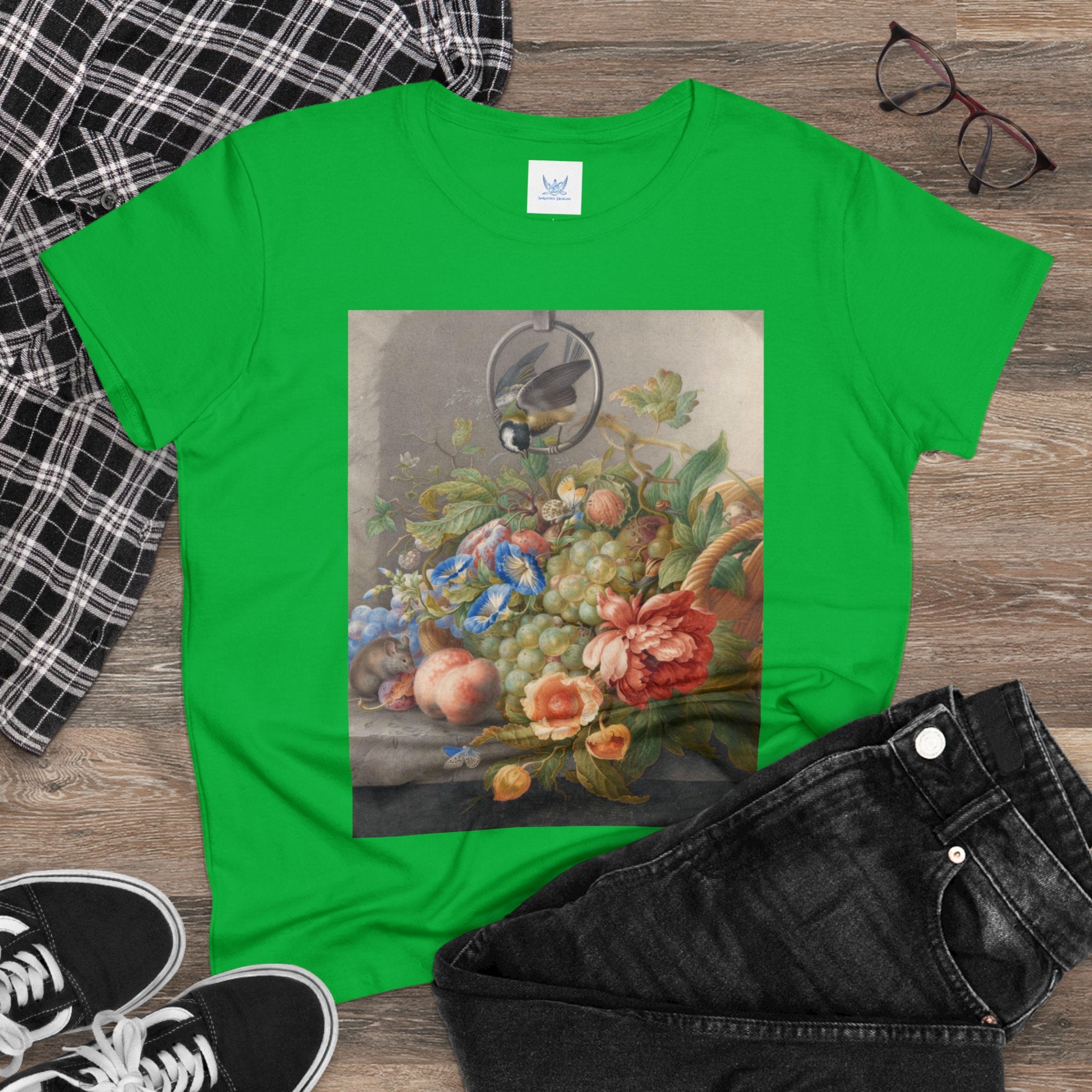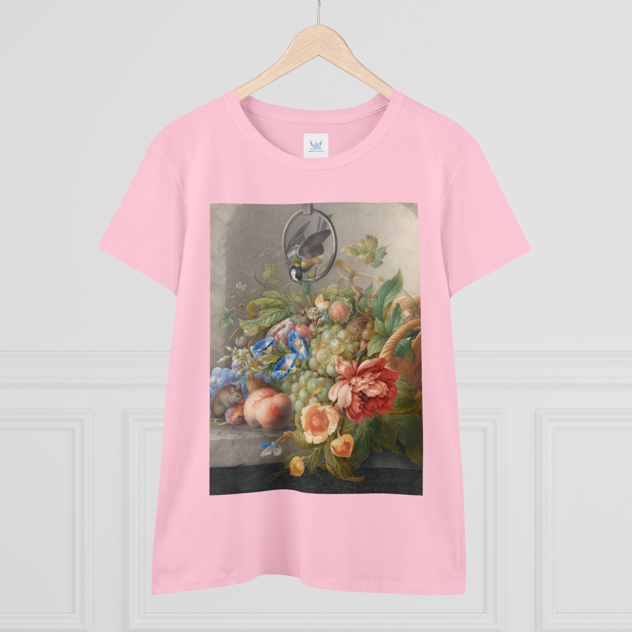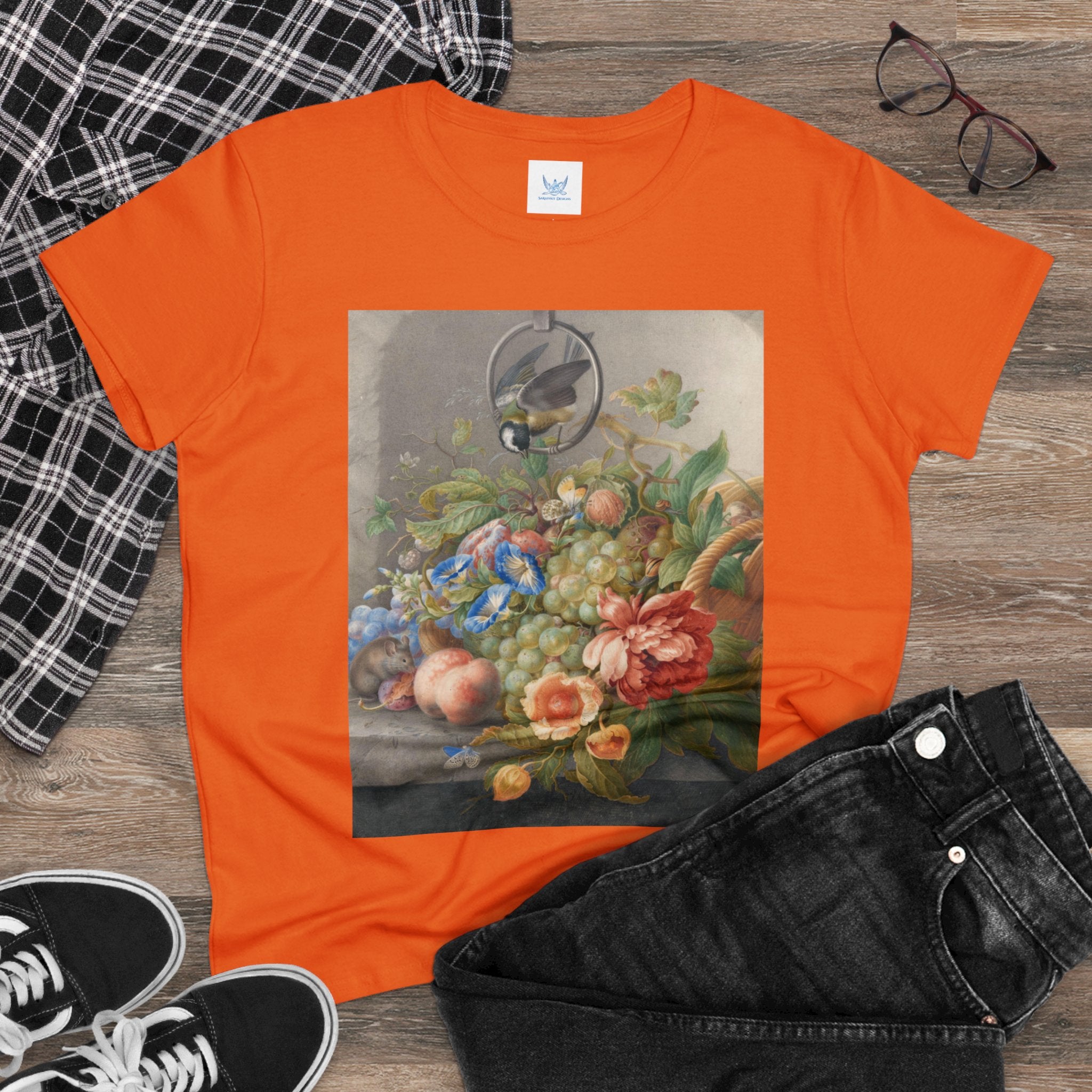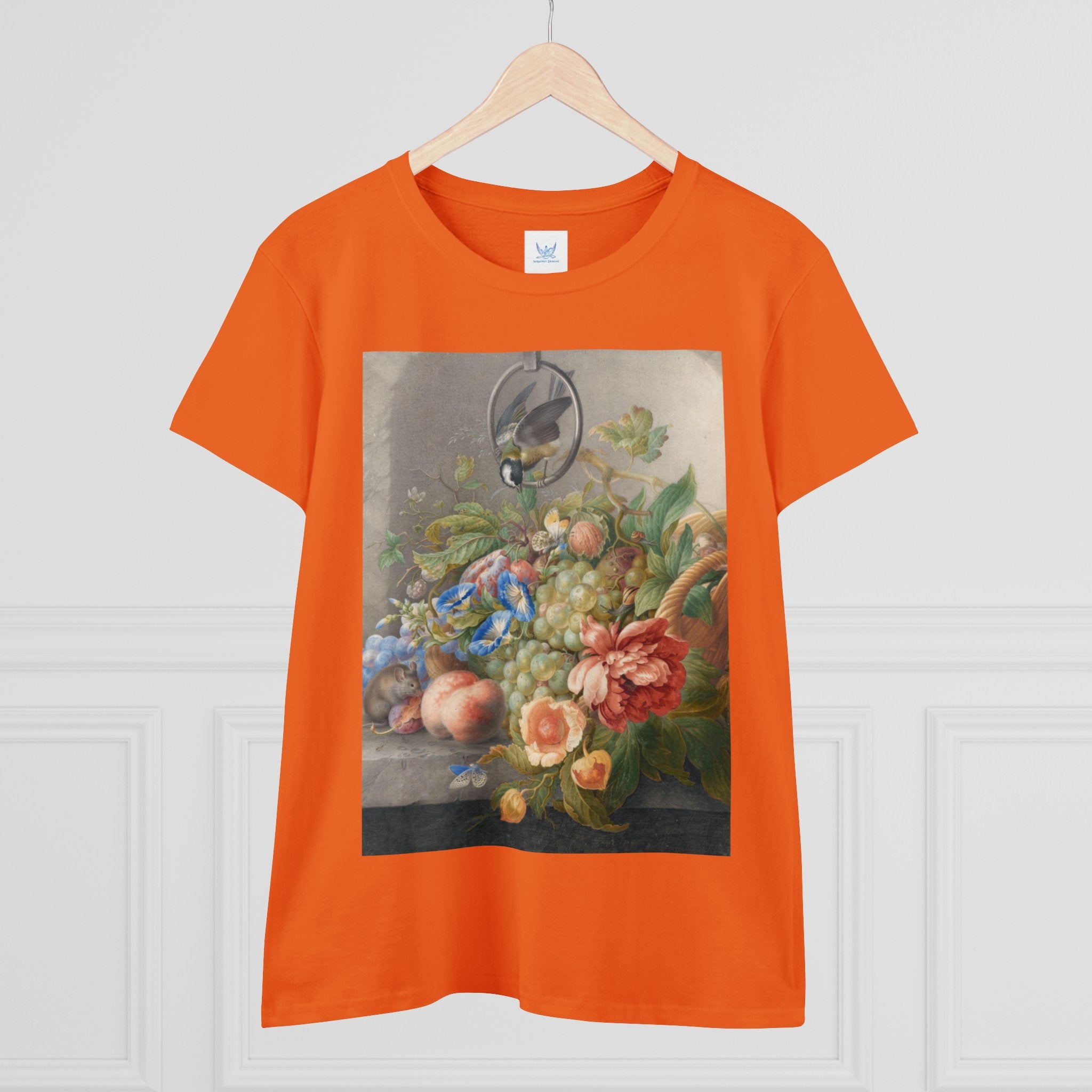 Artwork designed and digitally remastered by Sarasvati Designs. "Still Life With Flowers, Fruit, A Great Tit And A Mouse" by Herman Henstenburgh is a captivating and meticulously detailed artwork that brings together elements of nature in a harmonious composition. The painting features an assortment of vibrant flowers, ripe fruits, a great tit bird, and a curious mouse, all carefully arranged on a tabletop.