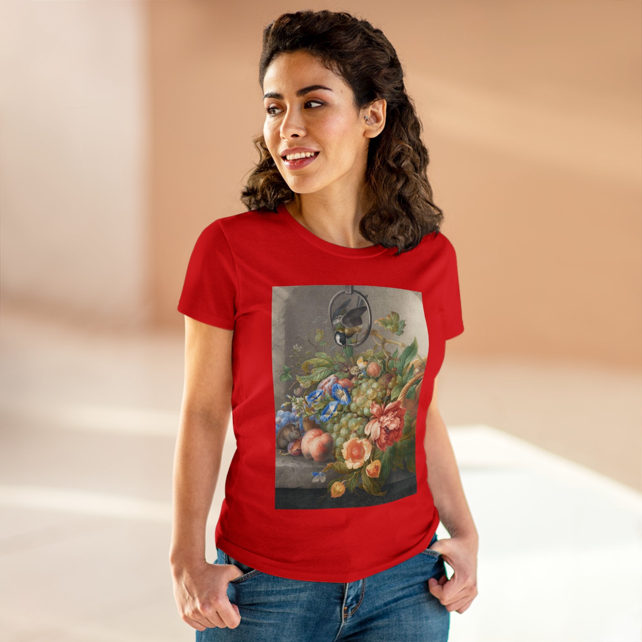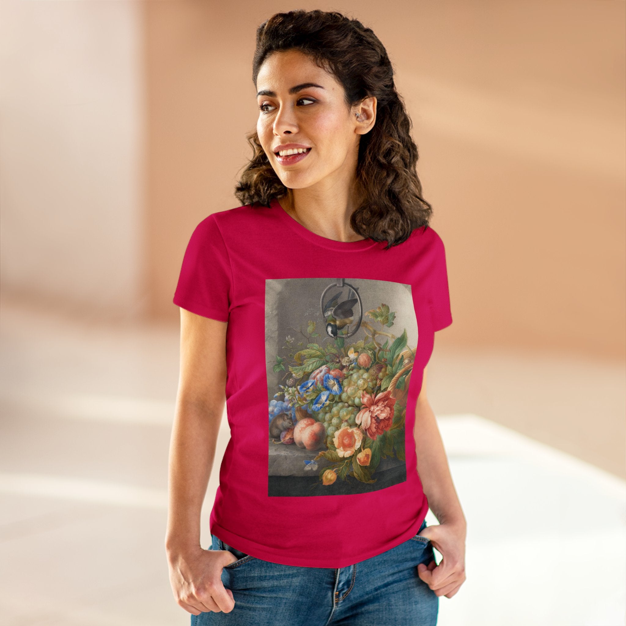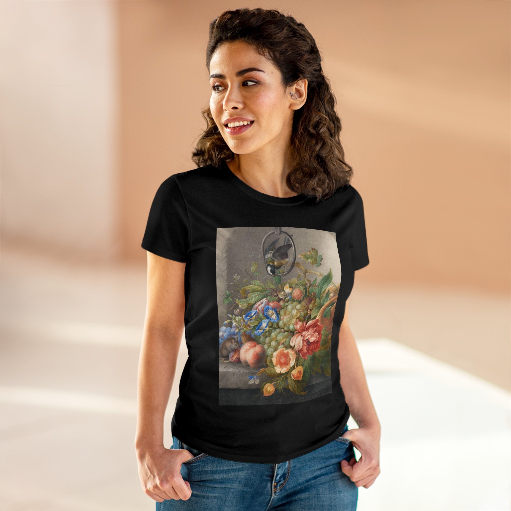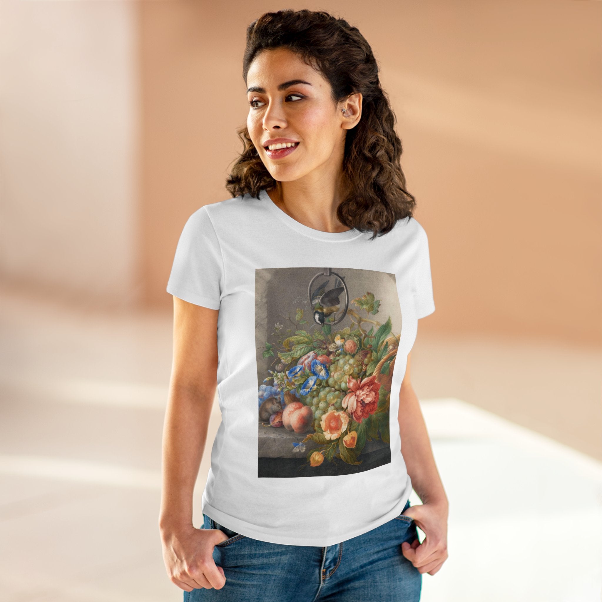 Artwork designed and digitally remastered by Sarasvati Designs. "Still Life With Flowers, Fruit, A Great Tit And A Mouse" by Herman Henstenburgh is a captivating and meticulously detailed artwork that brings together elements of nature in a harmonious composition. The painting features an assortment of vibrant flowers, ripe fruits, a great tit bird, and a curious mouse, all carefully arranged on a tabletop.