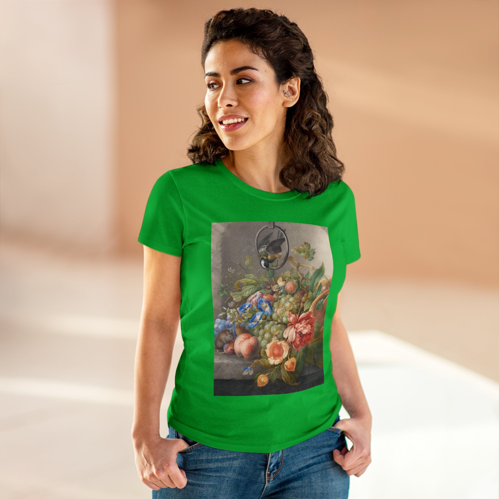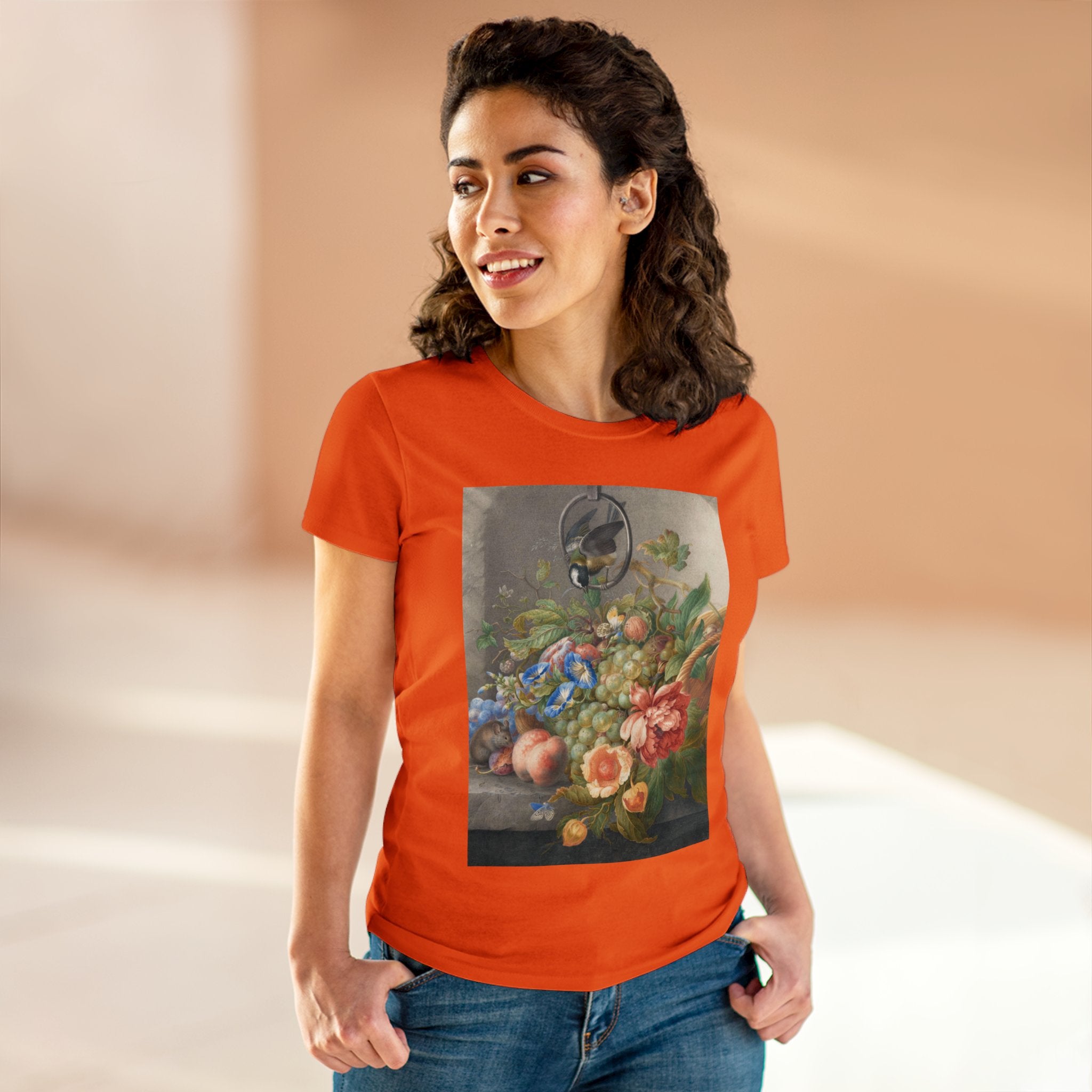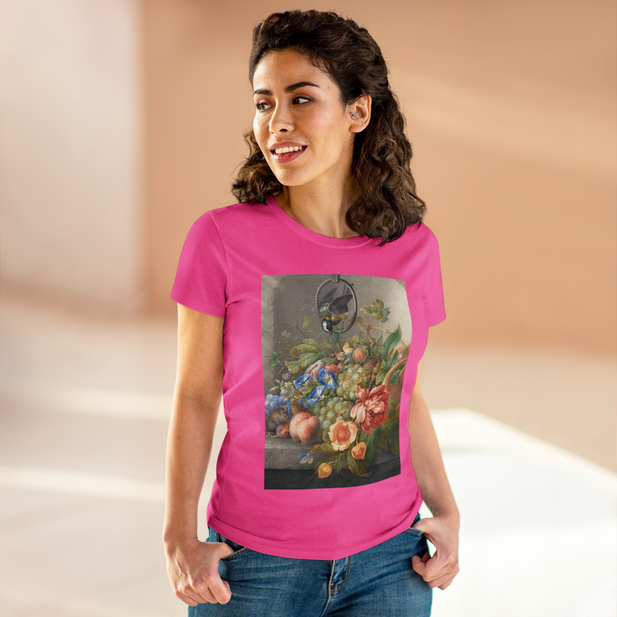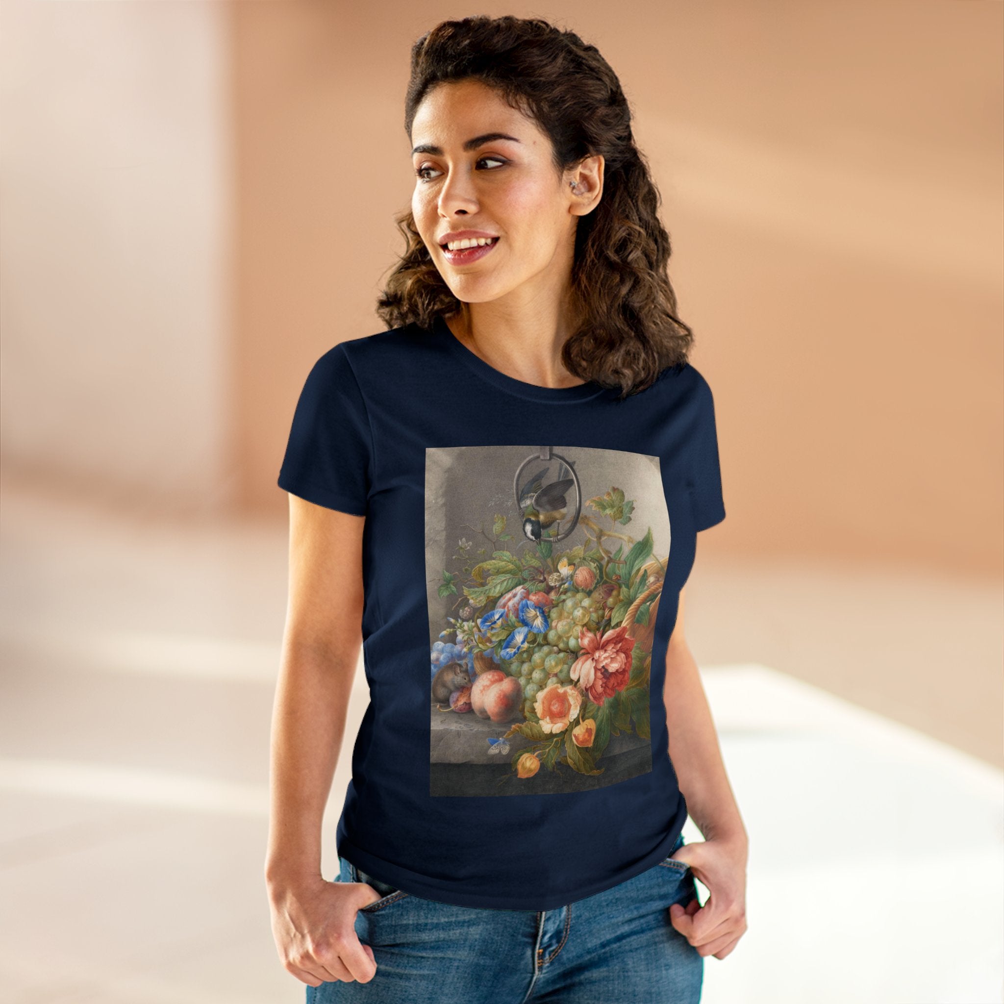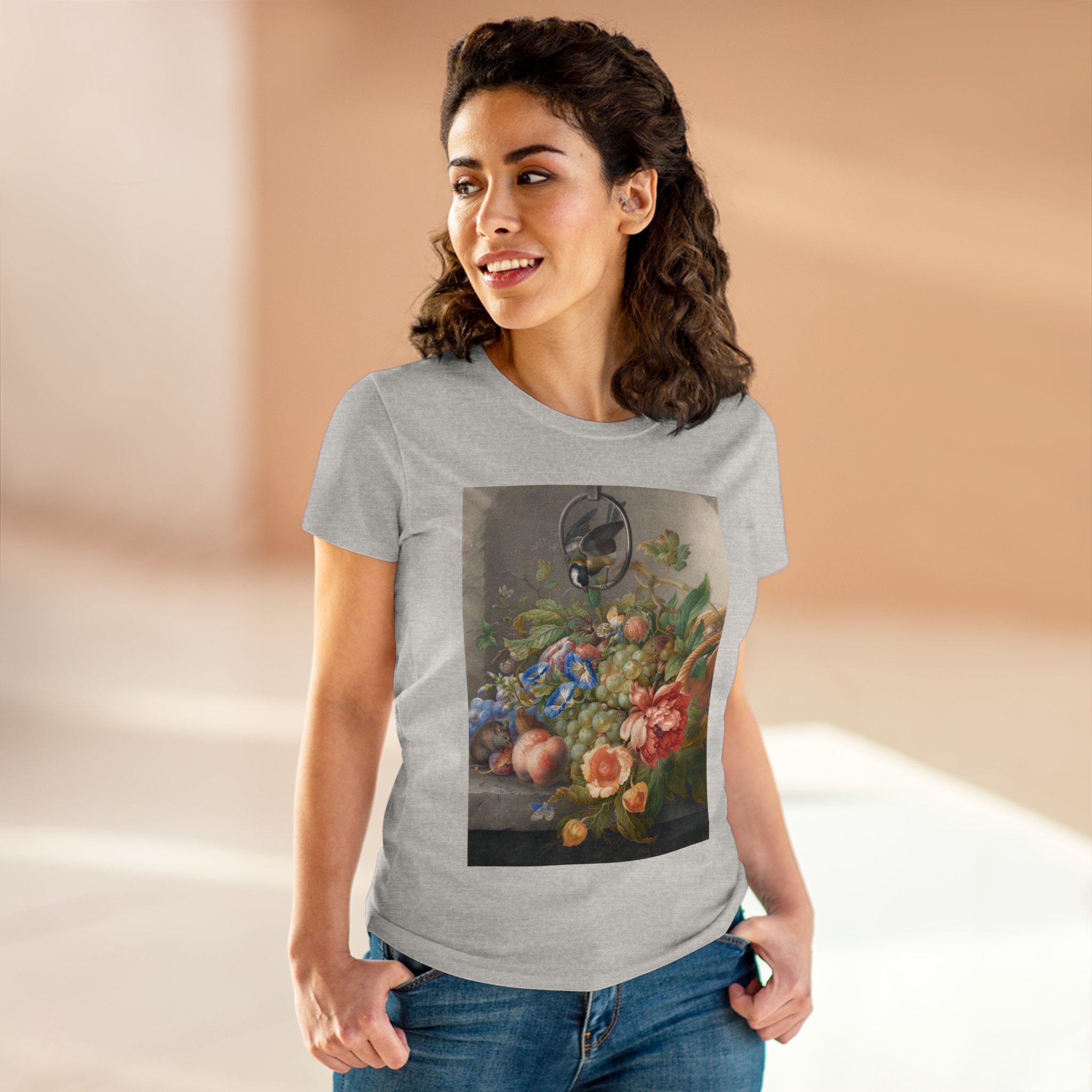 Artwork designed and digitally remastered by Sarasvati Designs. "Still Life With Flowers, Fruit, A Great Tit And A Mouse" by Herman Henstenburgh is a captivating and meticulously detailed artwork that brings together elements of nature in a harmonious composition. The painting features an assortment of vibrant flowers, ripe fruits, a great tit bird, and a curious mouse, all carefully arranged on a tabletop.