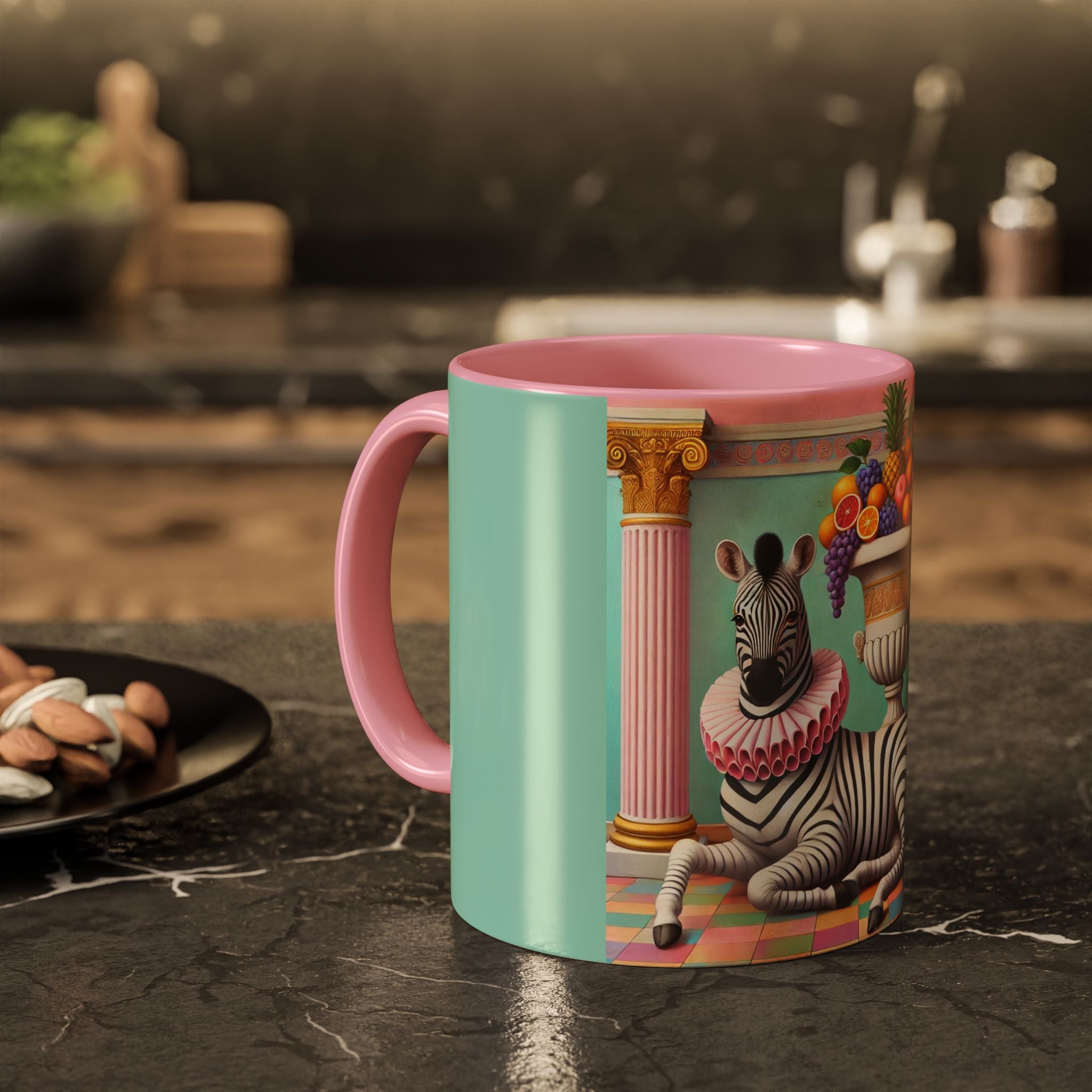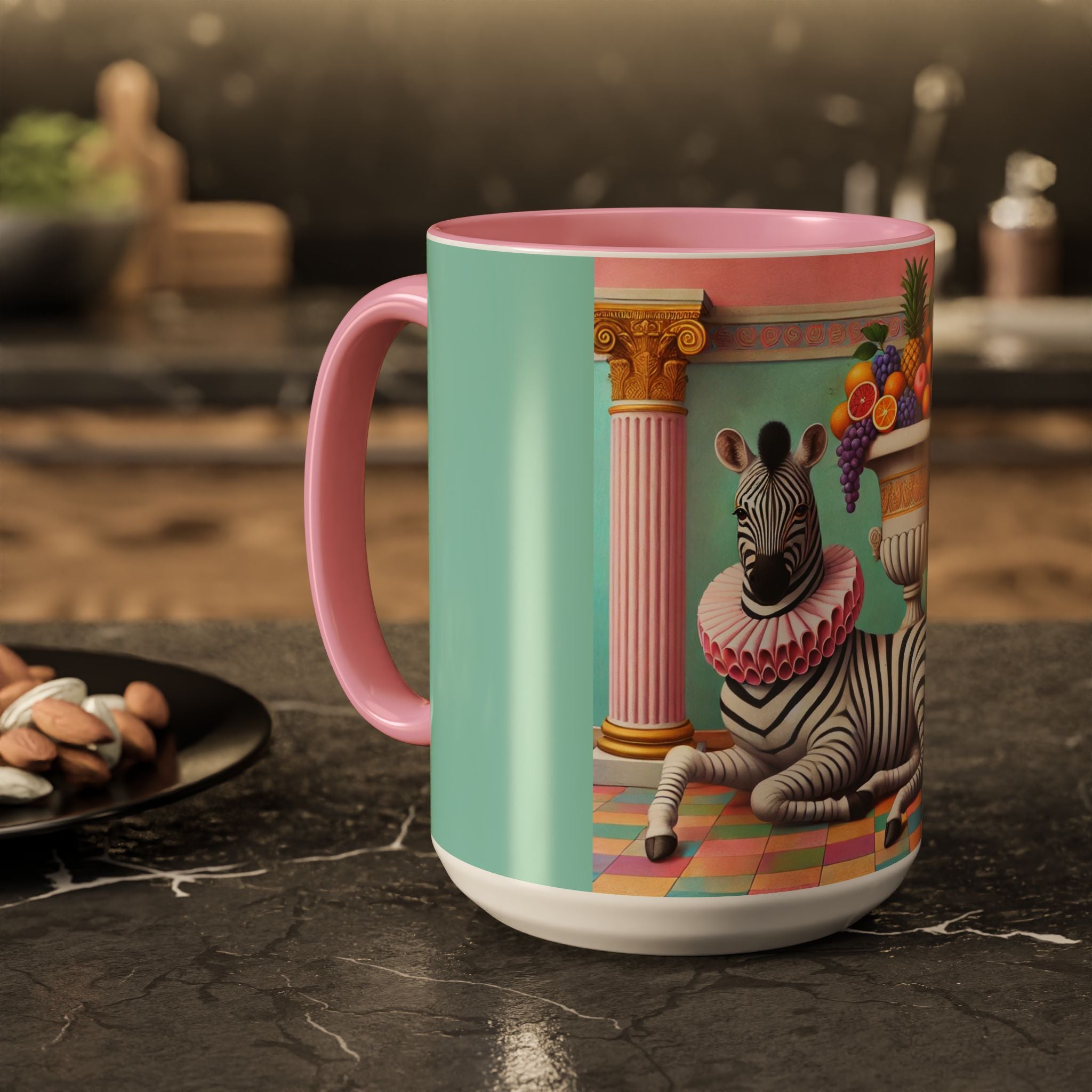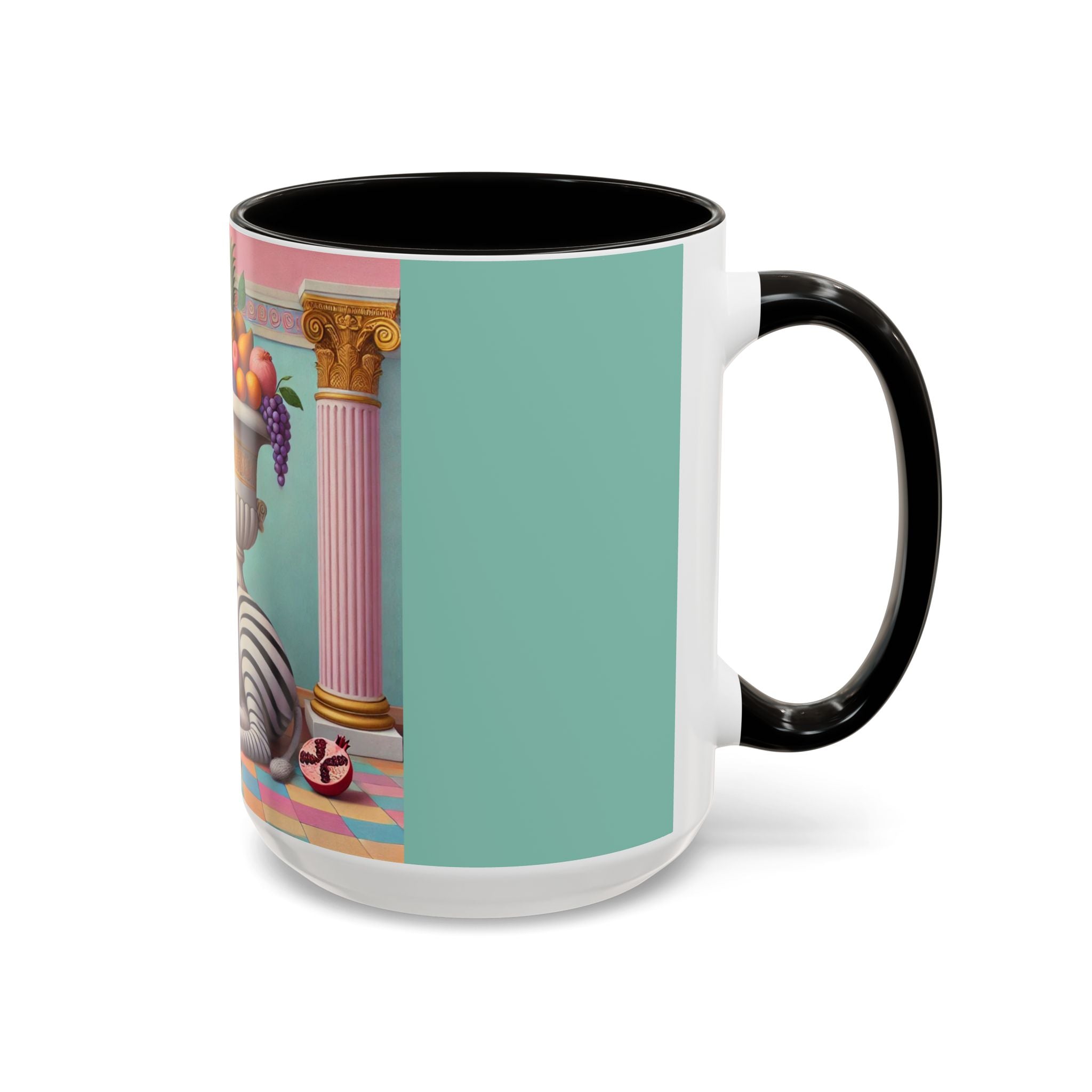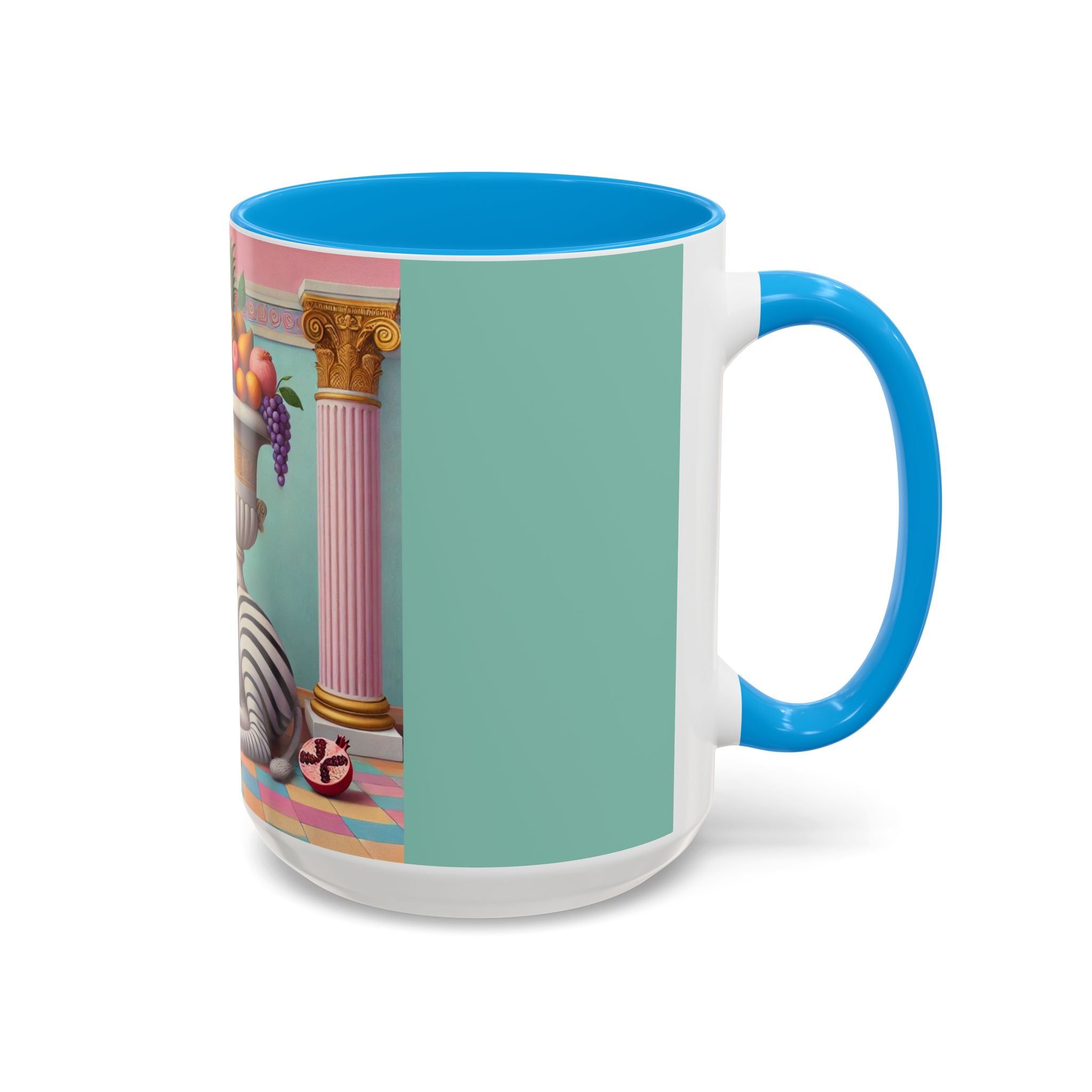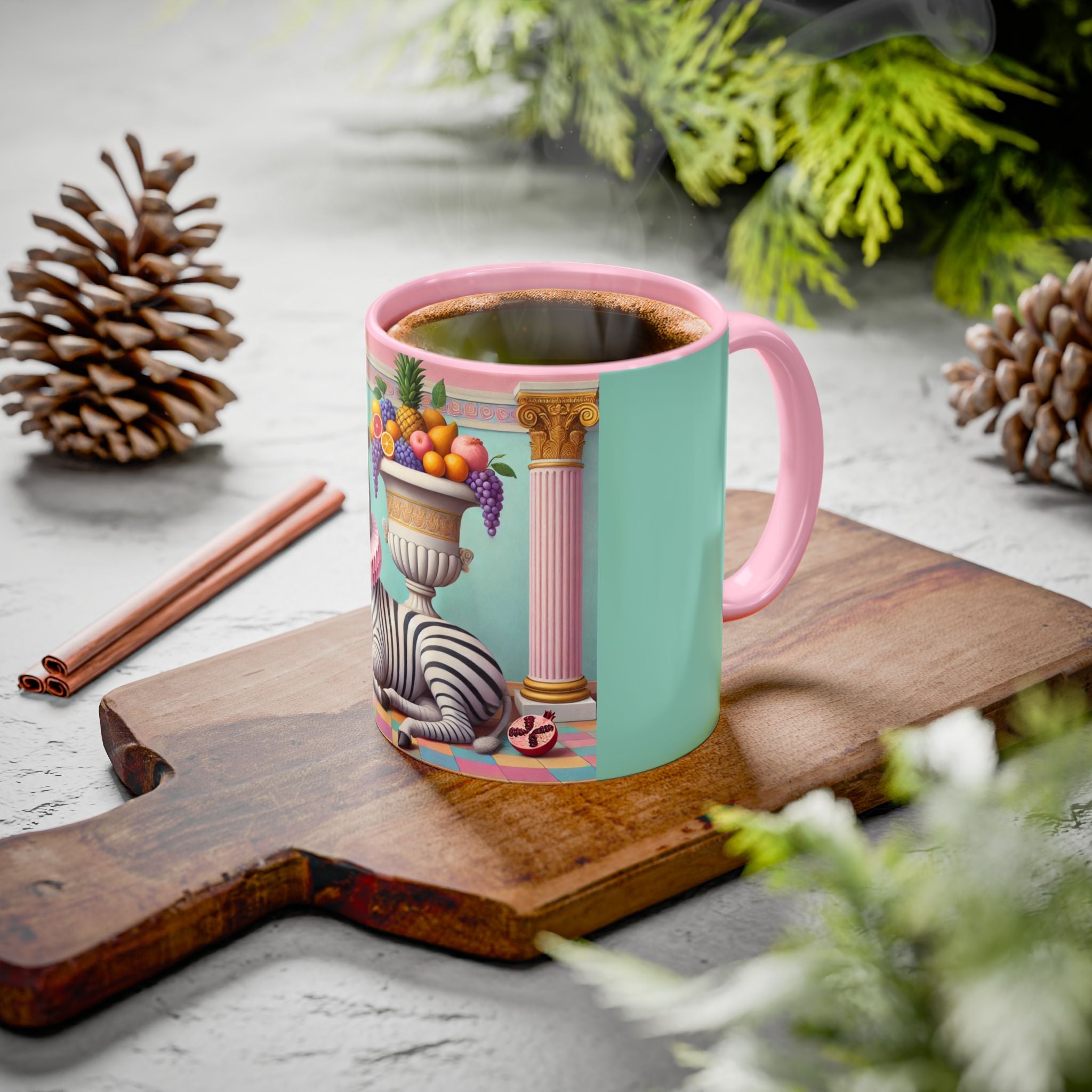 Still Life with Zebra, Fruit, and Pink Columns Colorful Mugs (11oz, 15oz) turn your daily sip into a playful, pastel-toned tableau, where a lounging zebra becomes the unlikely star beneath pink fluted columns and beside an overflowing amphora of fruit. Grapes cascade, citrus glows, and a pineapple crowns the arrangement, while a split pomegranate on the tiled floor adds a quiet note of abundance and symbolism. Dressed in a ruffled pink collar, the zebra blends elegance with absurdity—transforming Greco-Roman still life into something modern, whimsical, and surreal in soft mint, blush, gold, and ivory.