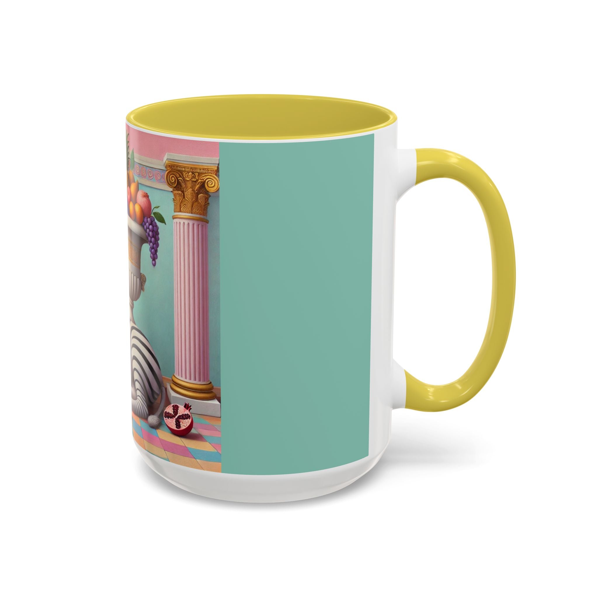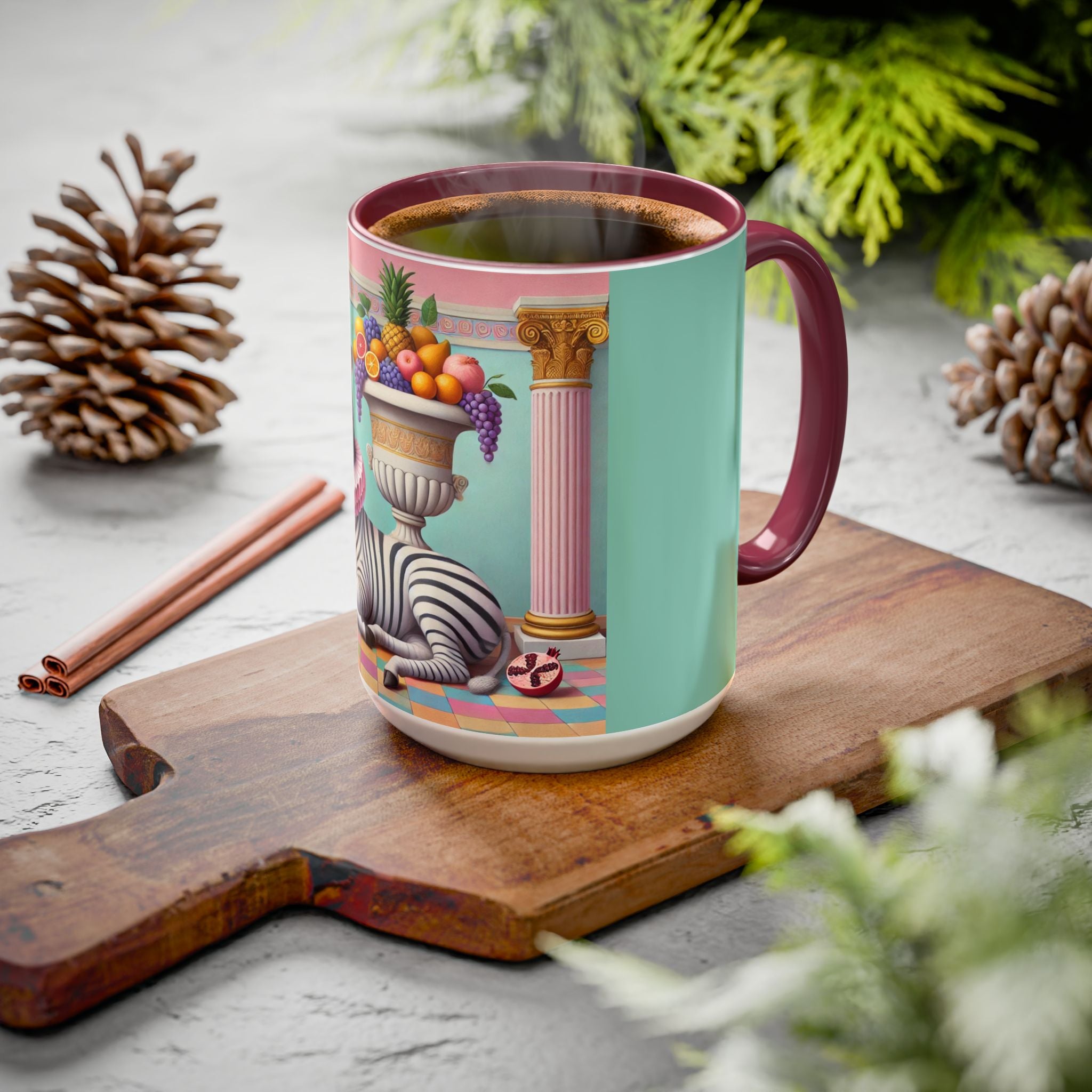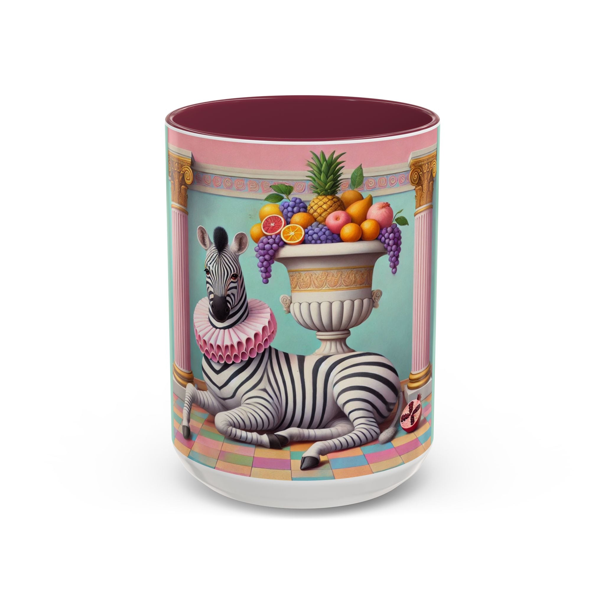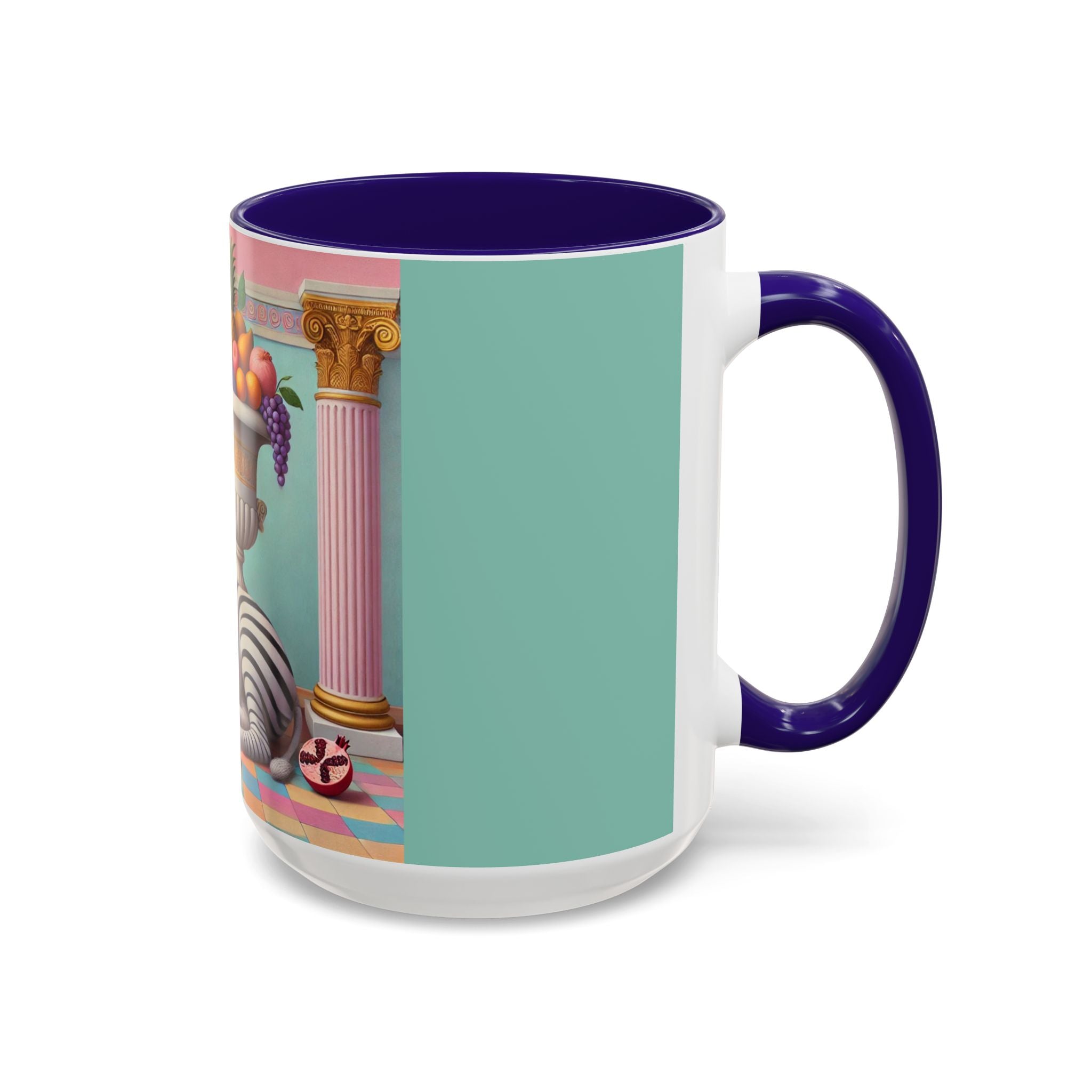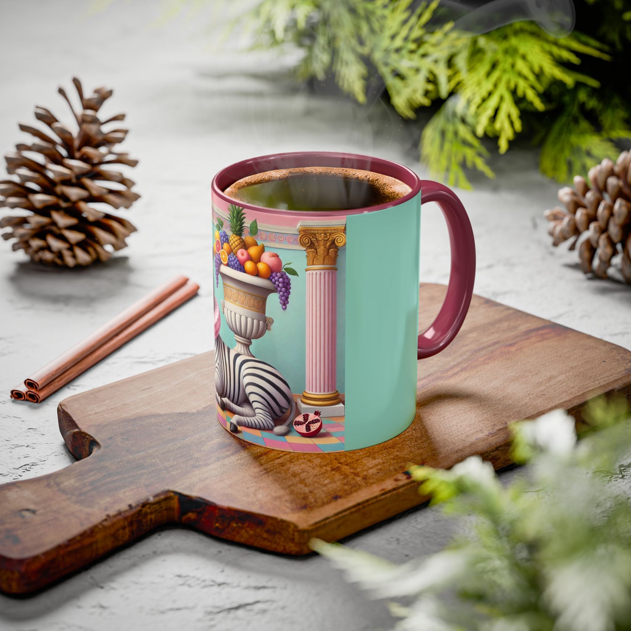 Still Life with Zebra, Fruit, and Pink Columns Colorful Mugs (11oz, 15oz) turn your daily sip into a playful, pastel-toned tableau, where a lounging zebra becomes the unlikely star beneath pink fluted columns and beside an overflowing amphora of fruit. Grapes cascade, citrus glows, and a pineapple crowns the arrangement, while a split pomegranate on the tiled floor adds a quiet note of abundance and symbolism. Dressed in a ruffled pink collar, the zebra blends elegance with absurdity—transforming Greco-Roman still life into something modern, whimsical, and surreal in soft mint, blush, gold, and ivory.