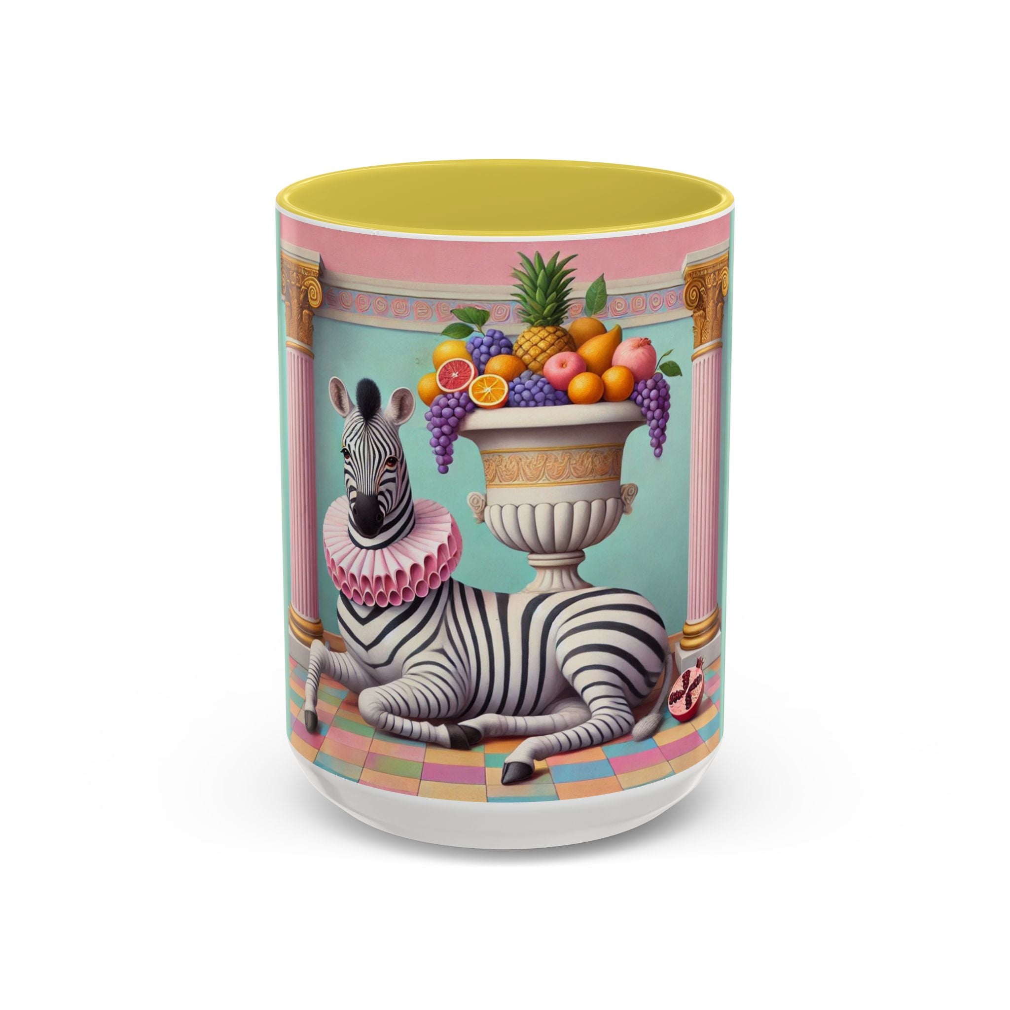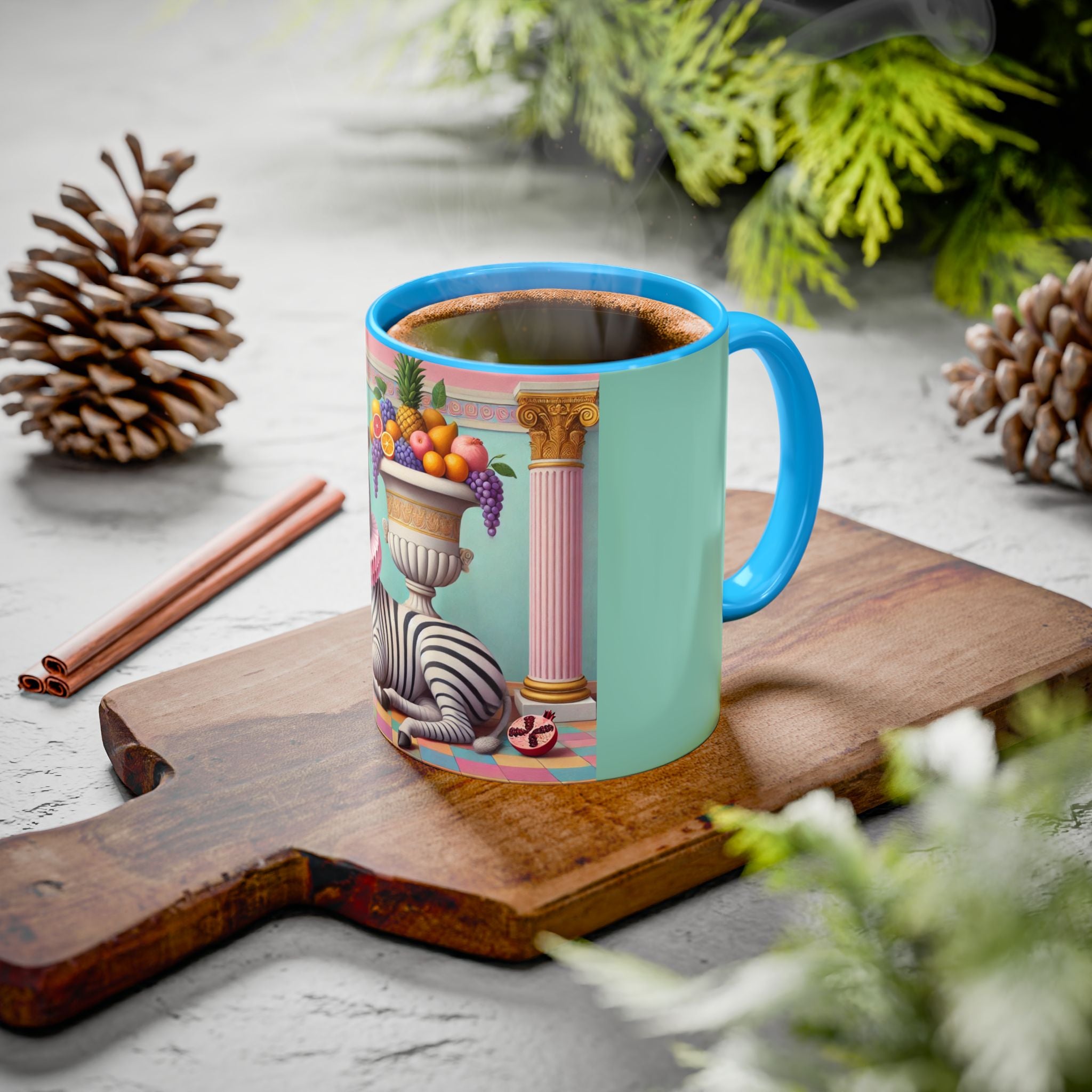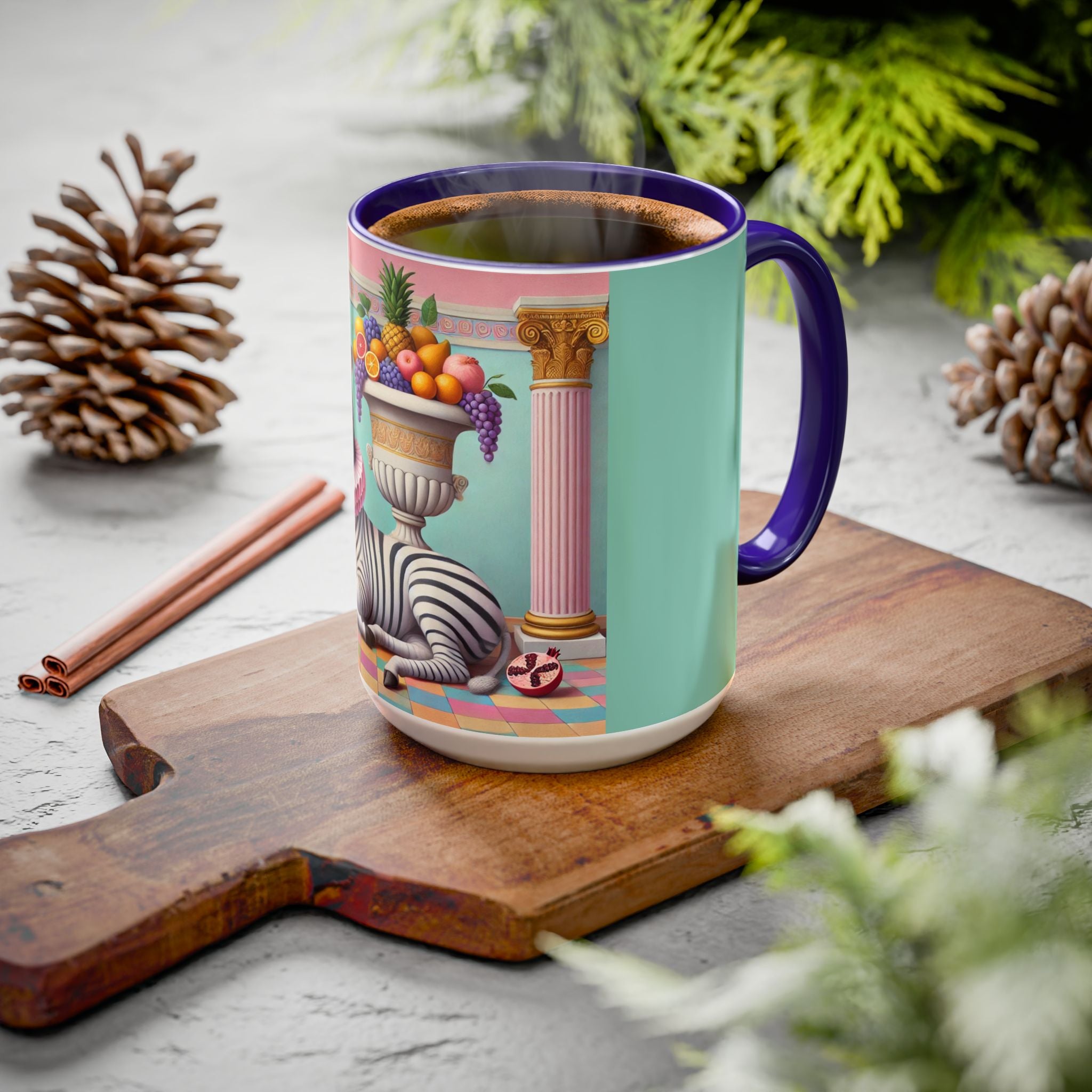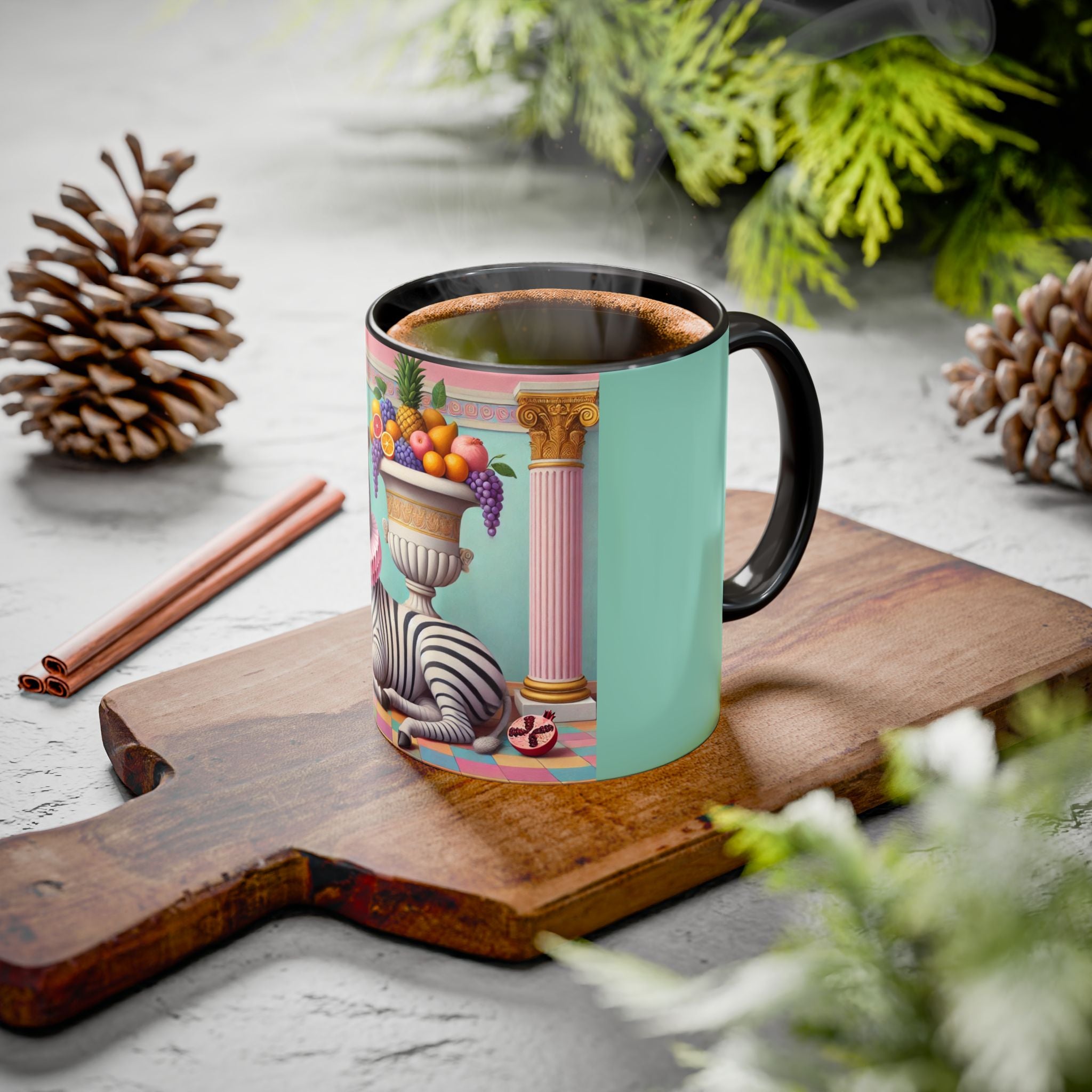 Still Life with Zebra, Fruit, and Pink Columns Colorful Mugs (11oz, 15oz) turn your daily sip into a playful, pastel-toned tableau, where a lounging zebra becomes the unlikely star beneath pink fluted columns and beside an overflowing amphora of fruit. Grapes cascade, citrus glows, and a pineapple crowns the arrangement, while a split pomegranate on the tiled floor adds a quiet note of abundance and symbolism. Dressed in a ruffled pink collar, the zebra blends elegance with absurdity—transforming Greco-Roman still life into something modern, whimsical, and surreal in soft mint, blush, gold, and ivory.