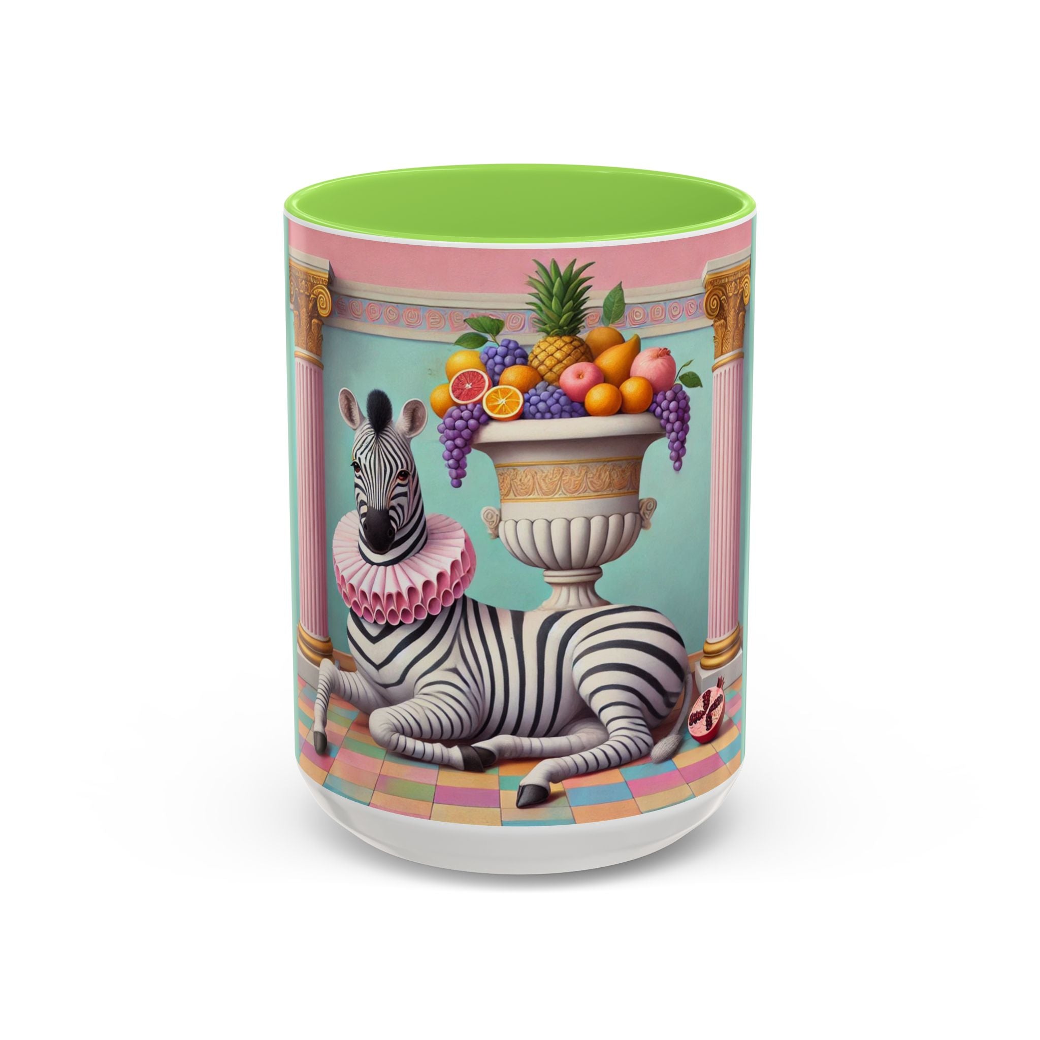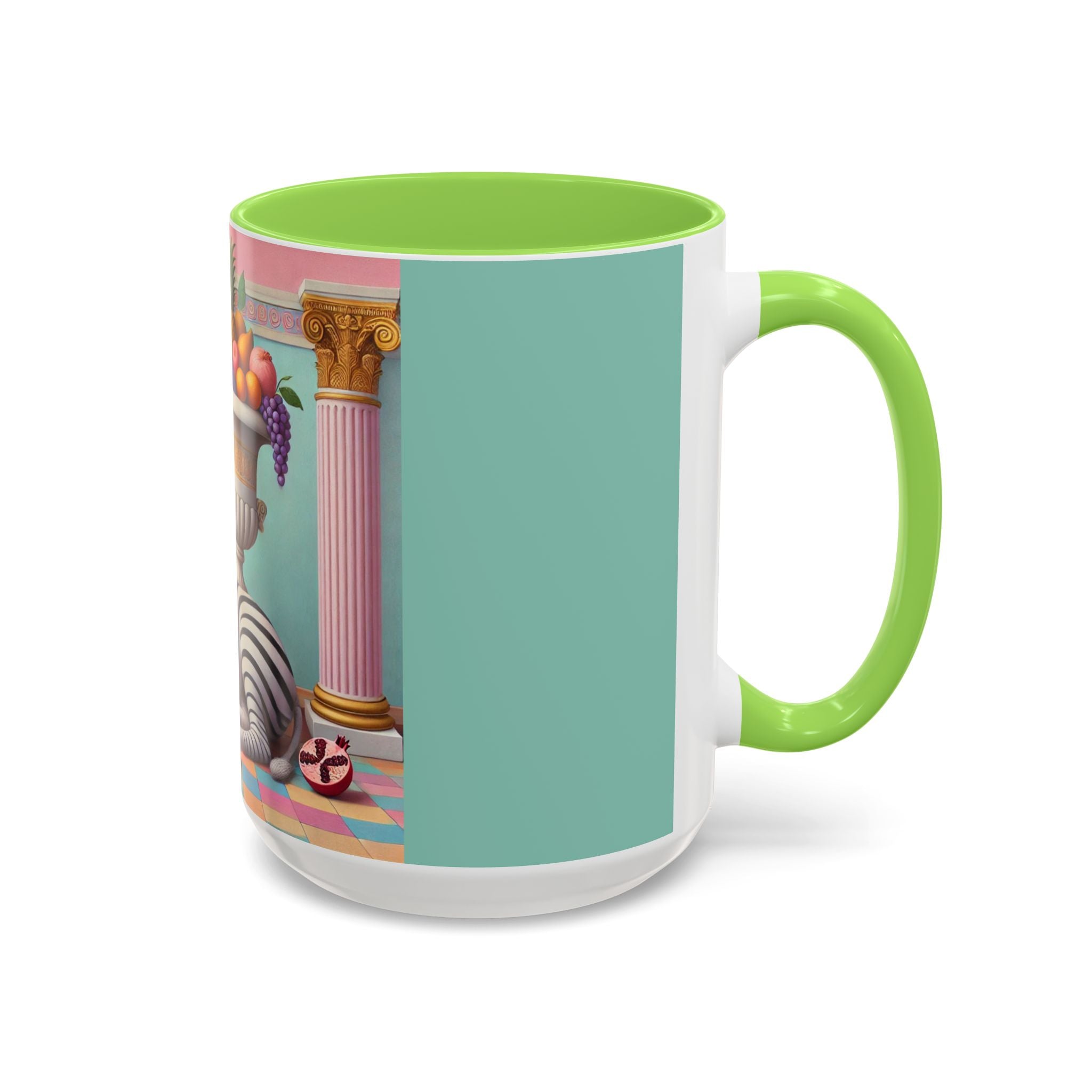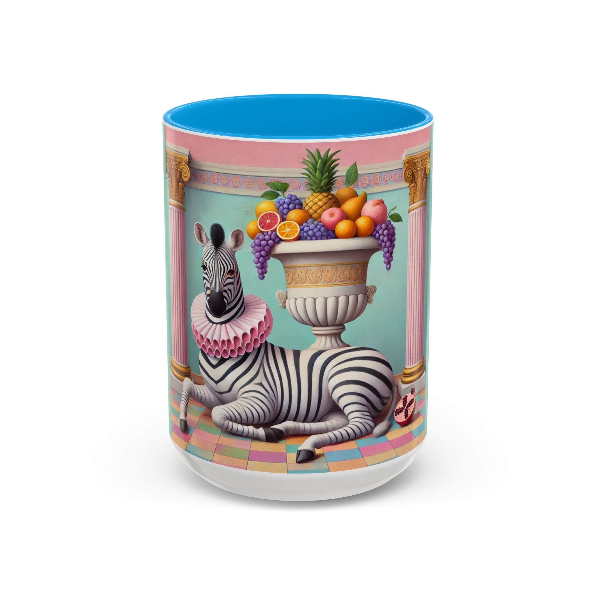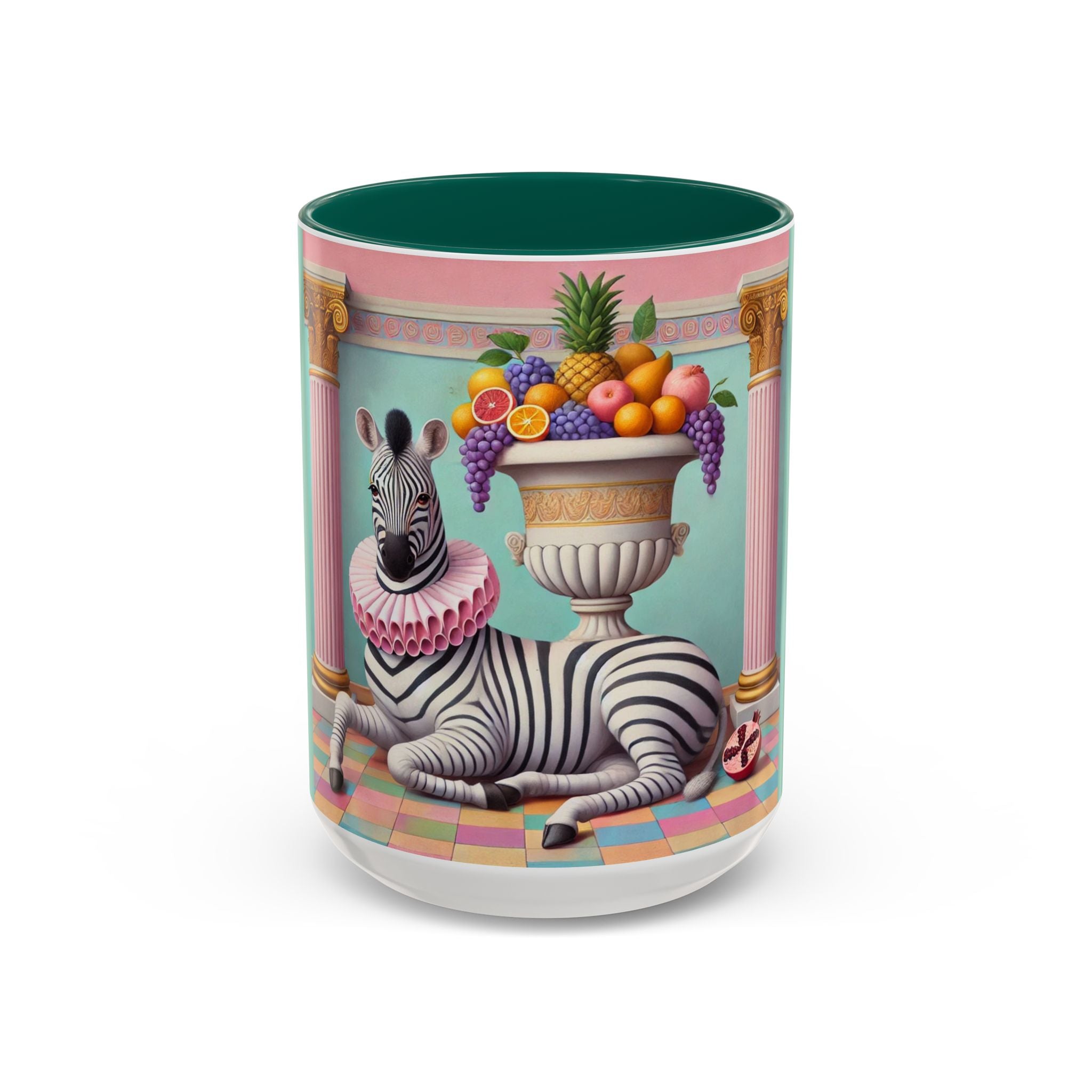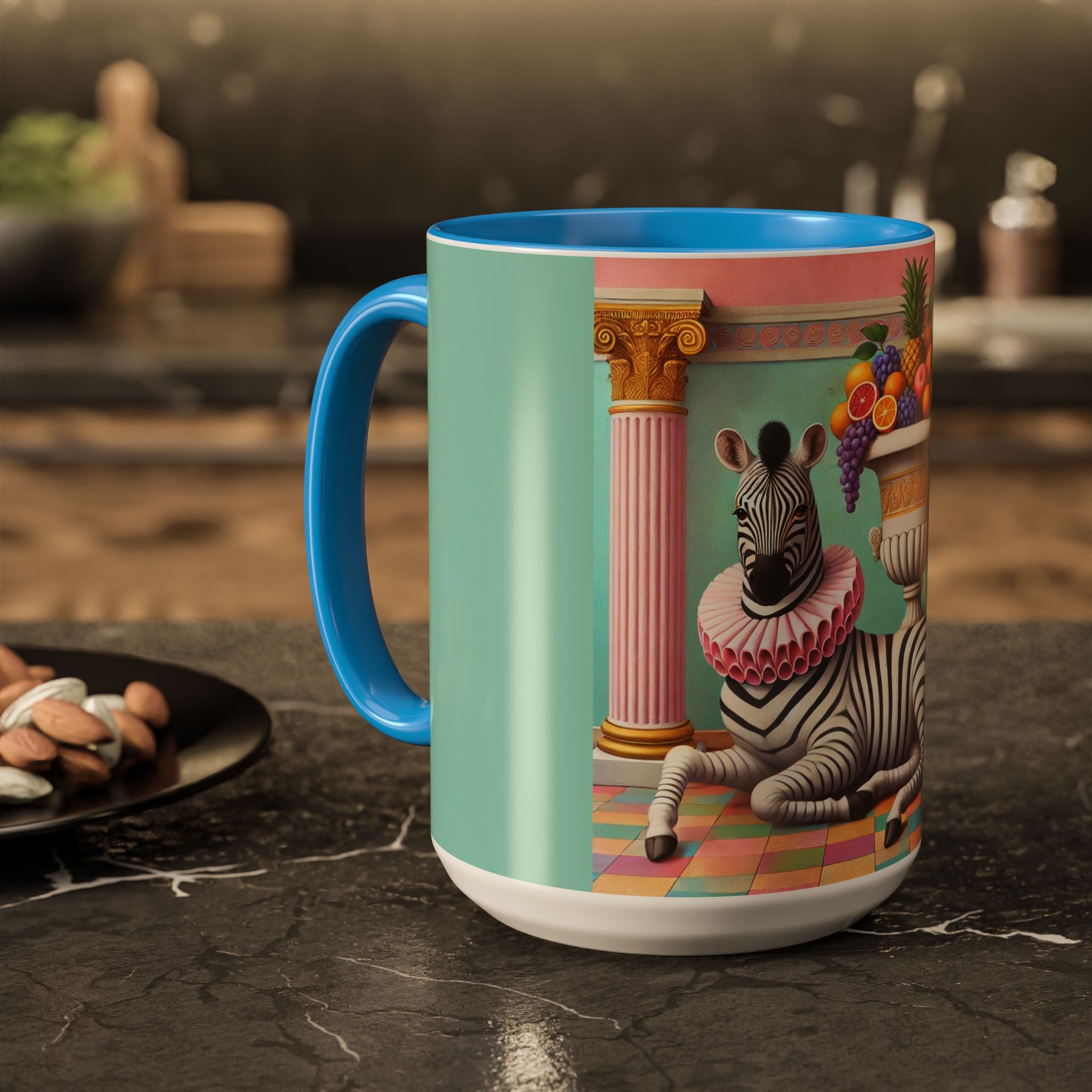 Still Life with Zebra, Fruit, and Pink Columns Colorful Mugs (11oz, 15oz) turn your daily sip into a playful, pastel-toned tableau, where a lounging zebra becomes the unlikely star beneath pink fluted columns and beside an overflowing amphora of fruit. Grapes cascade, citrus glows, and a pineapple crowns the arrangement, while a split pomegranate on the tiled floor adds a quiet note of abundance and symbolism. Dressed in a ruffled pink collar, the zebra blends elegance with absurdity—transforming Greco-Roman still life into something modern, whimsical, and surreal in soft mint, blush, gold, and ivory.