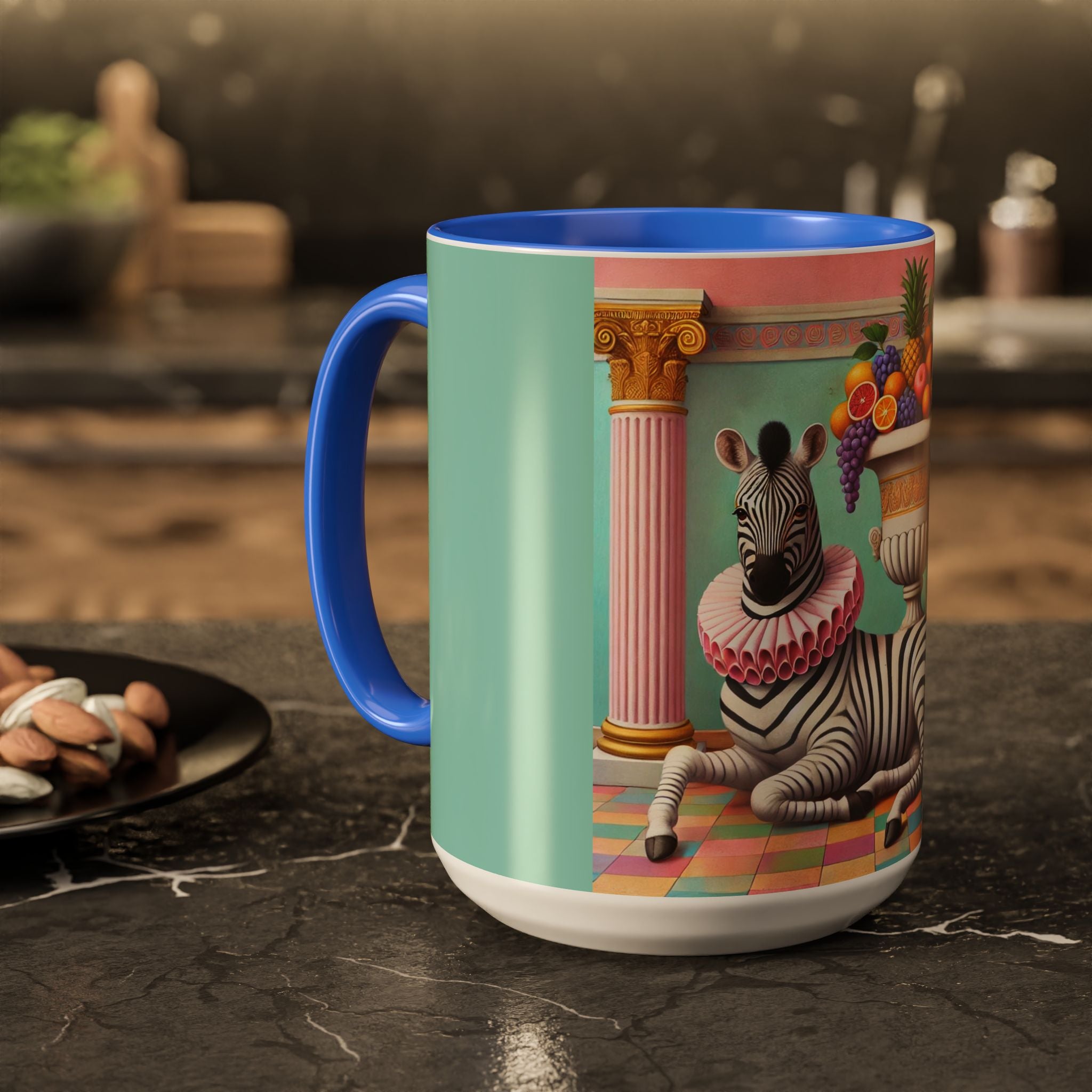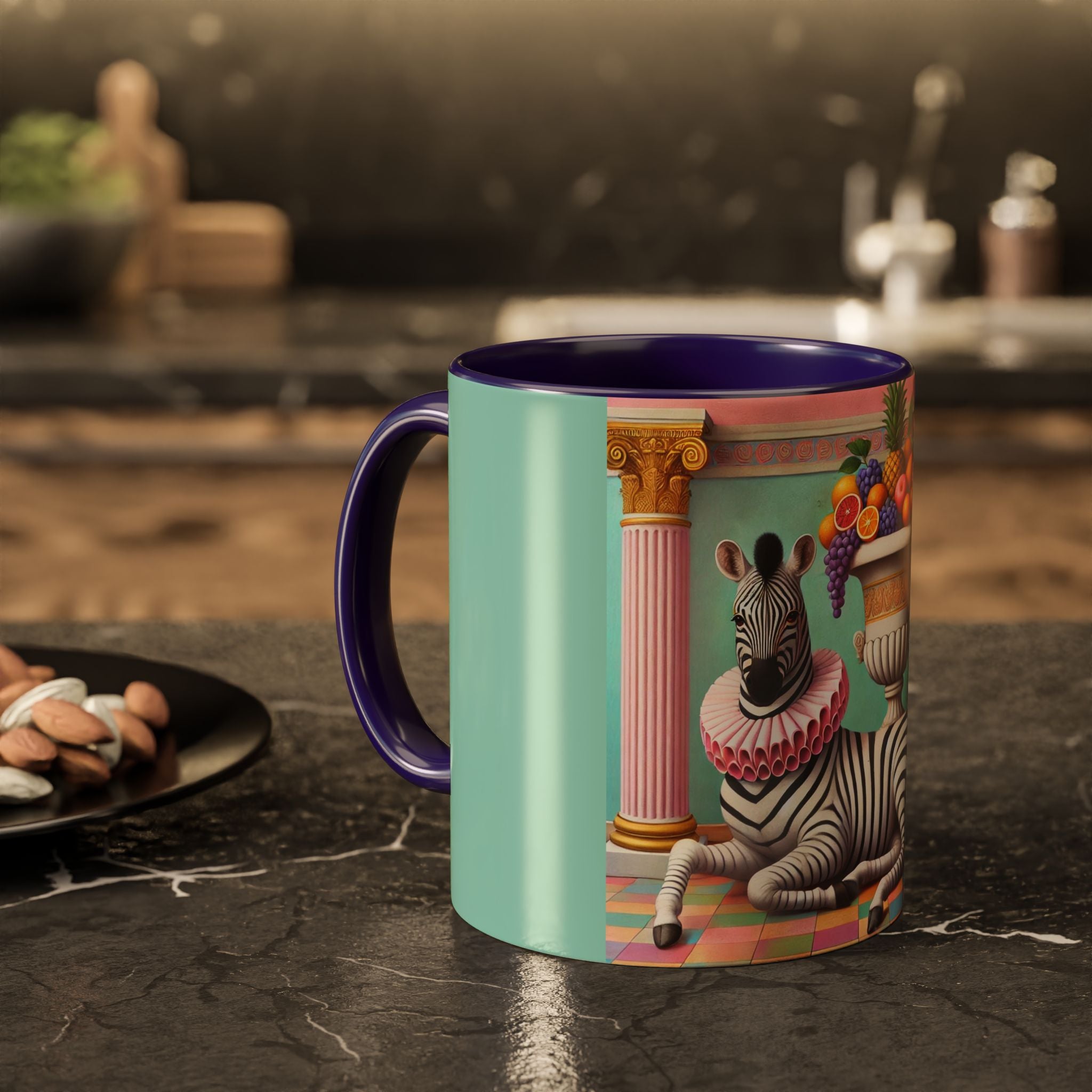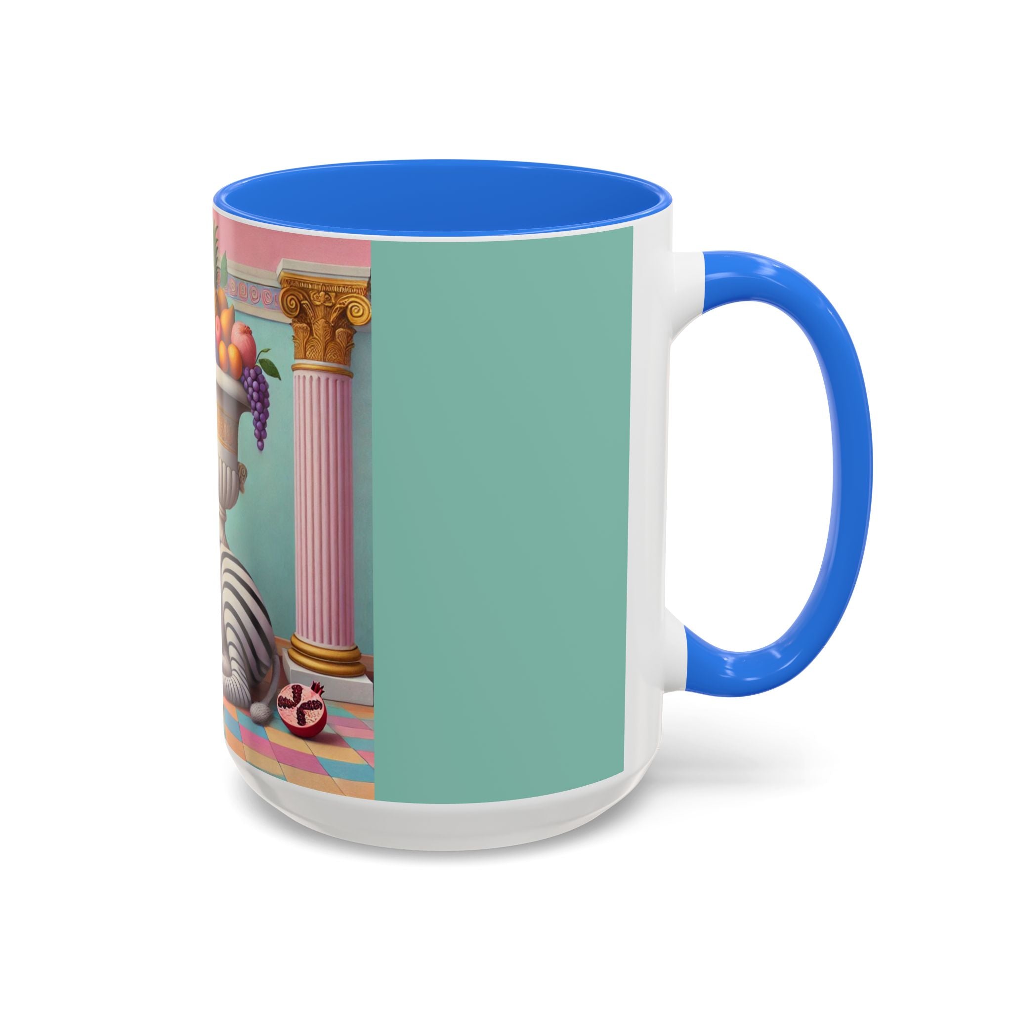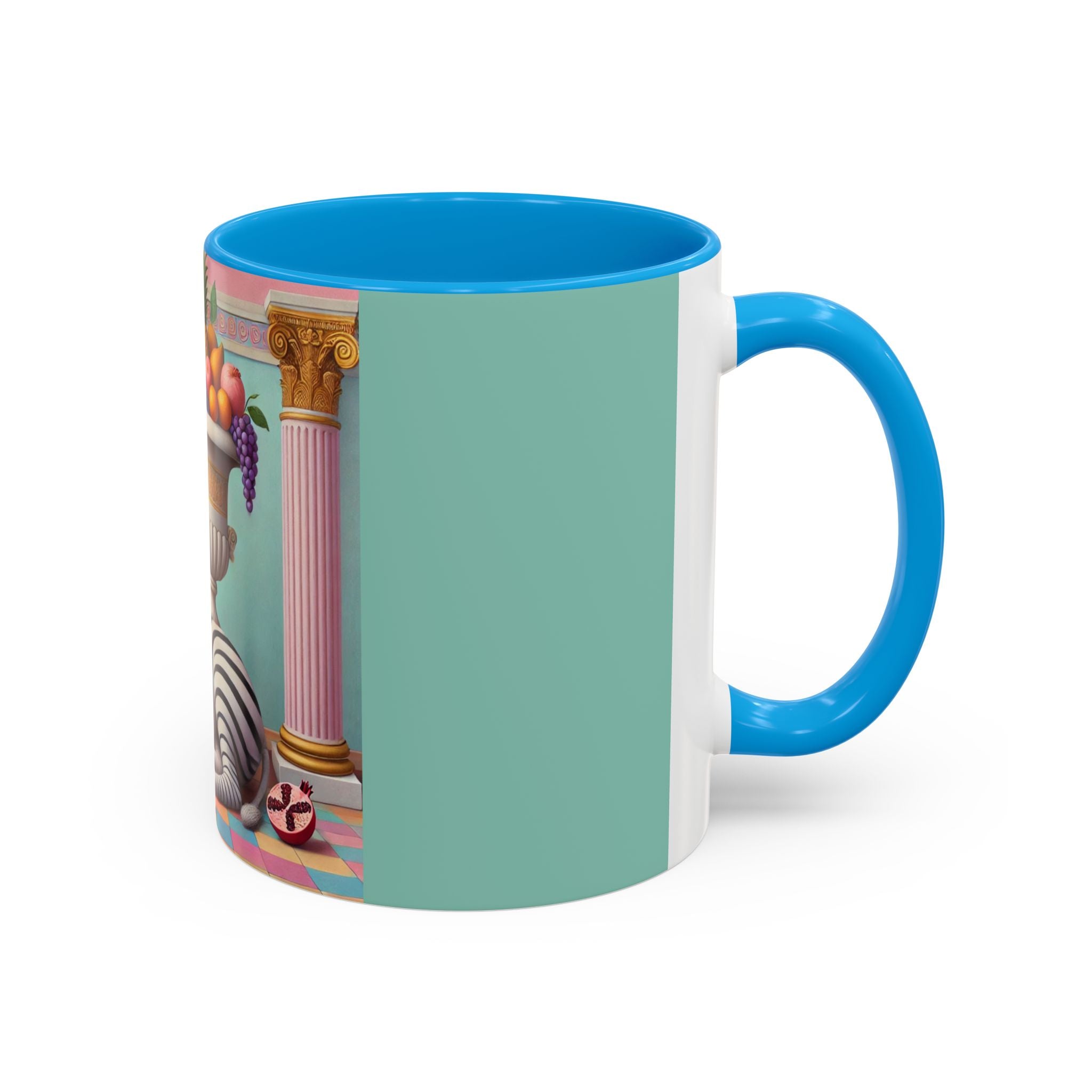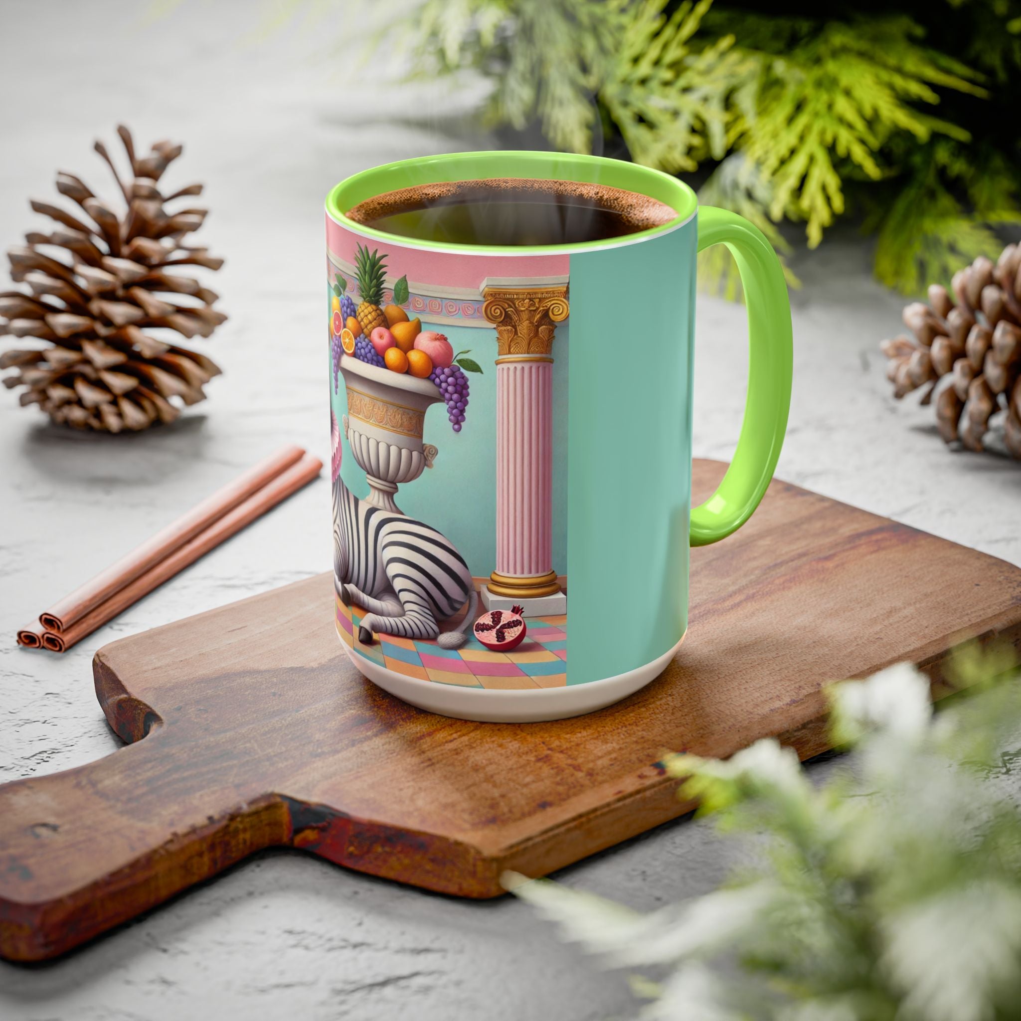 Still Life with Zebra, Fruit, and Pink Columns Colorful Mugs (11oz, 15oz) turn your daily sip into a playful, pastel-toned tableau, where a lounging zebra becomes the unlikely star beneath pink fluted columns and beside an overflowing amphora of fruit. Grapes cascade, citrus glows, and a pineapple crowns the arrangement, while a split pomegranate on the tiled floor adds a quiet note of abundance and symbolism. Dressed in a ruffled pink collar, the zebra blends elegance with absurdity—transforming Greco-Roman still life into something modern, whimsical, and surreal in soft mint, blush, gold, and ivory.