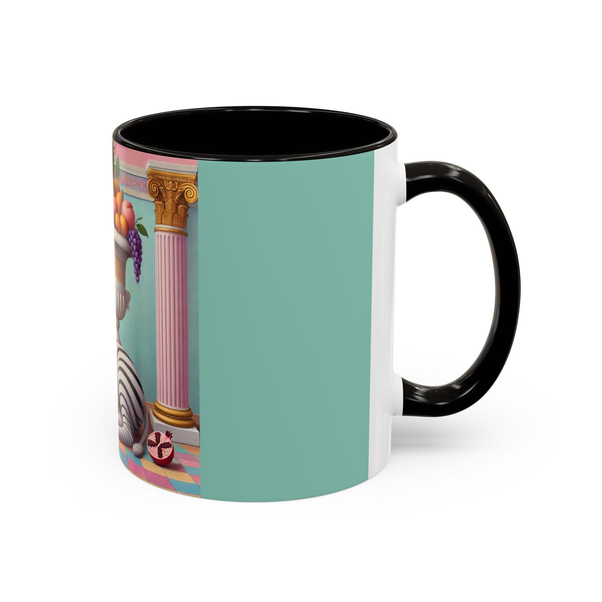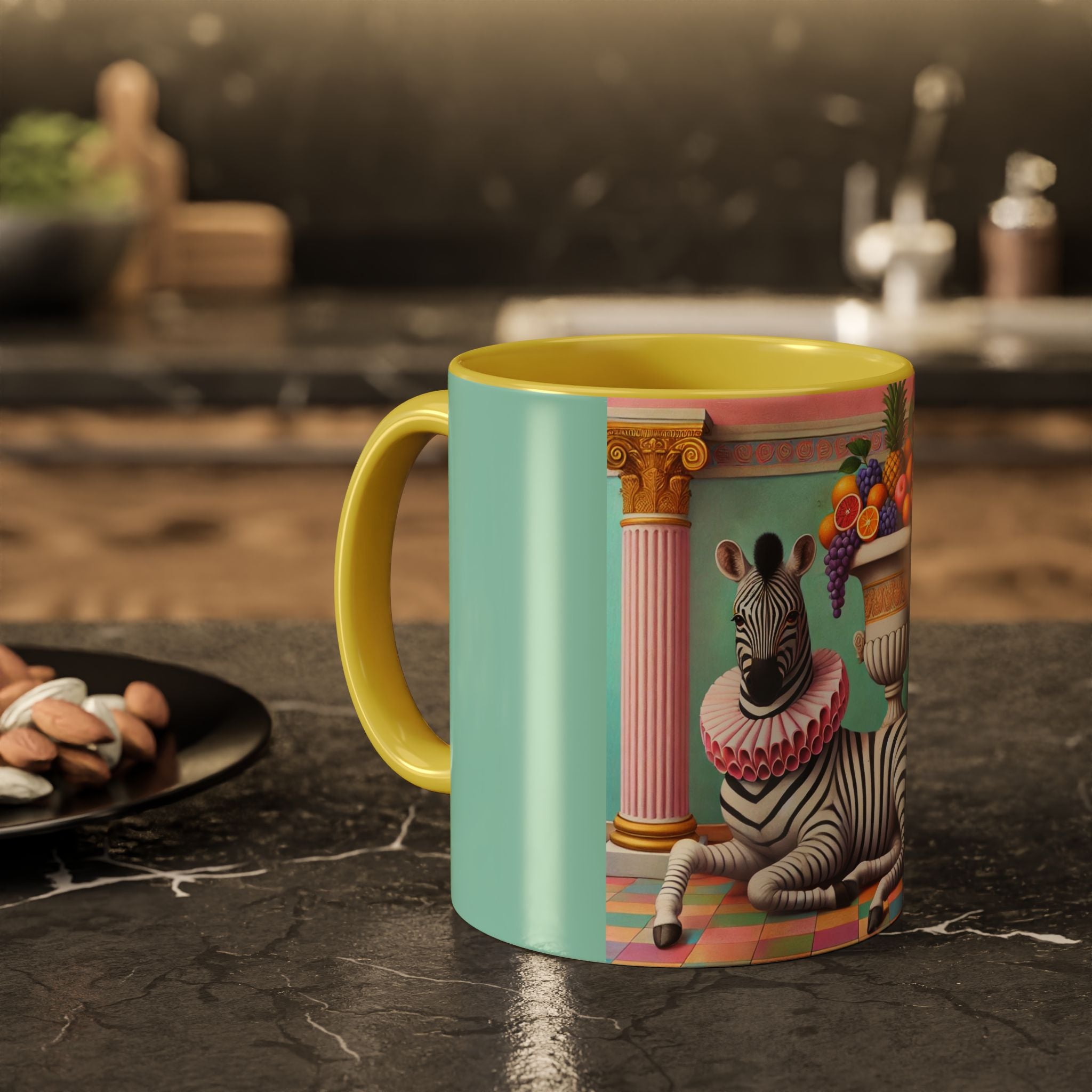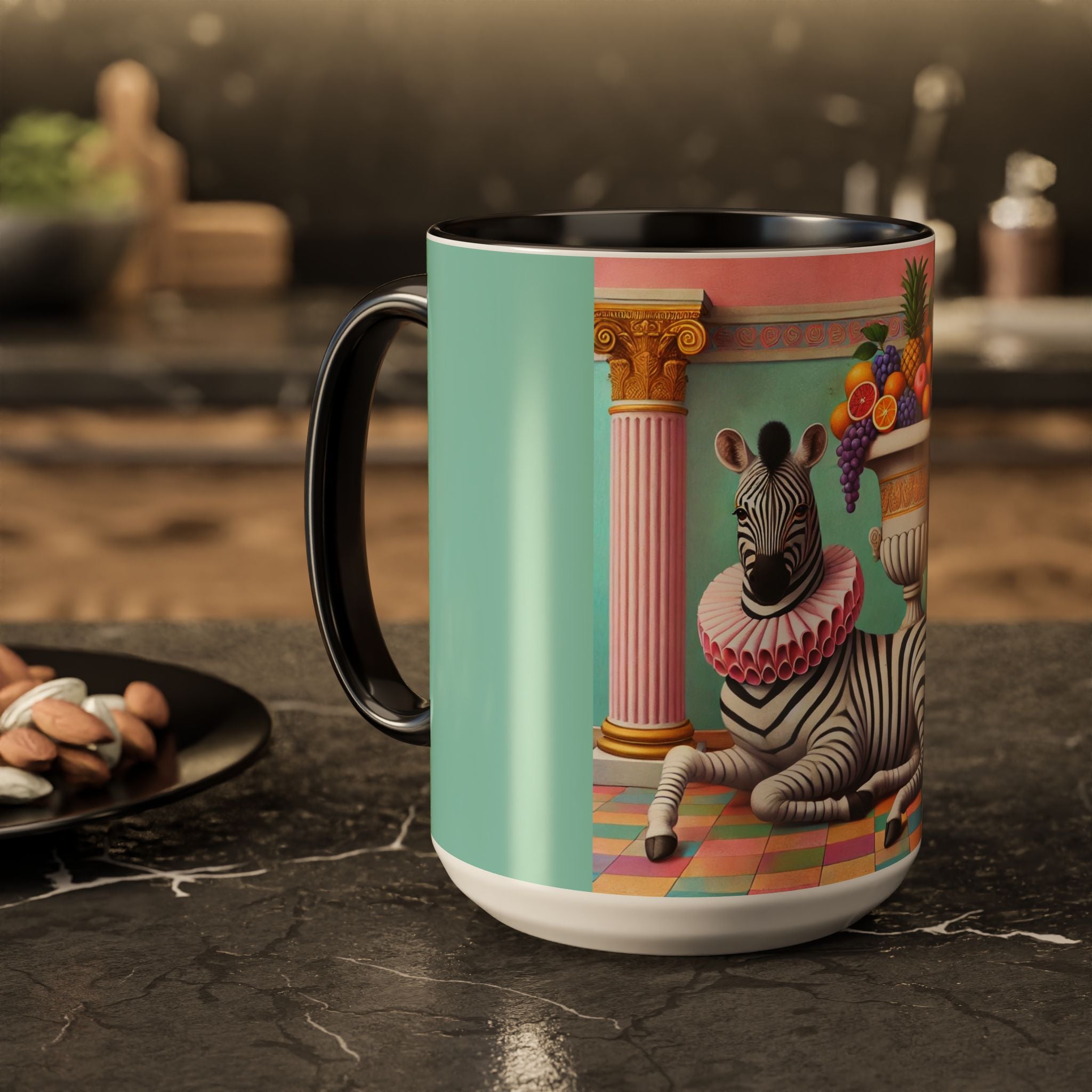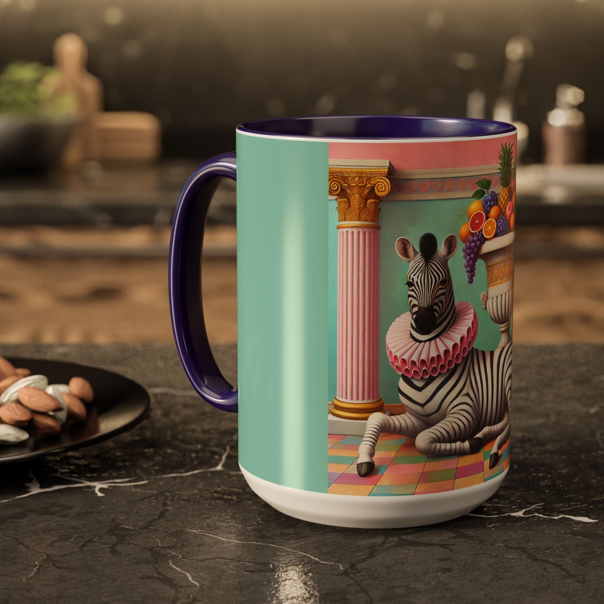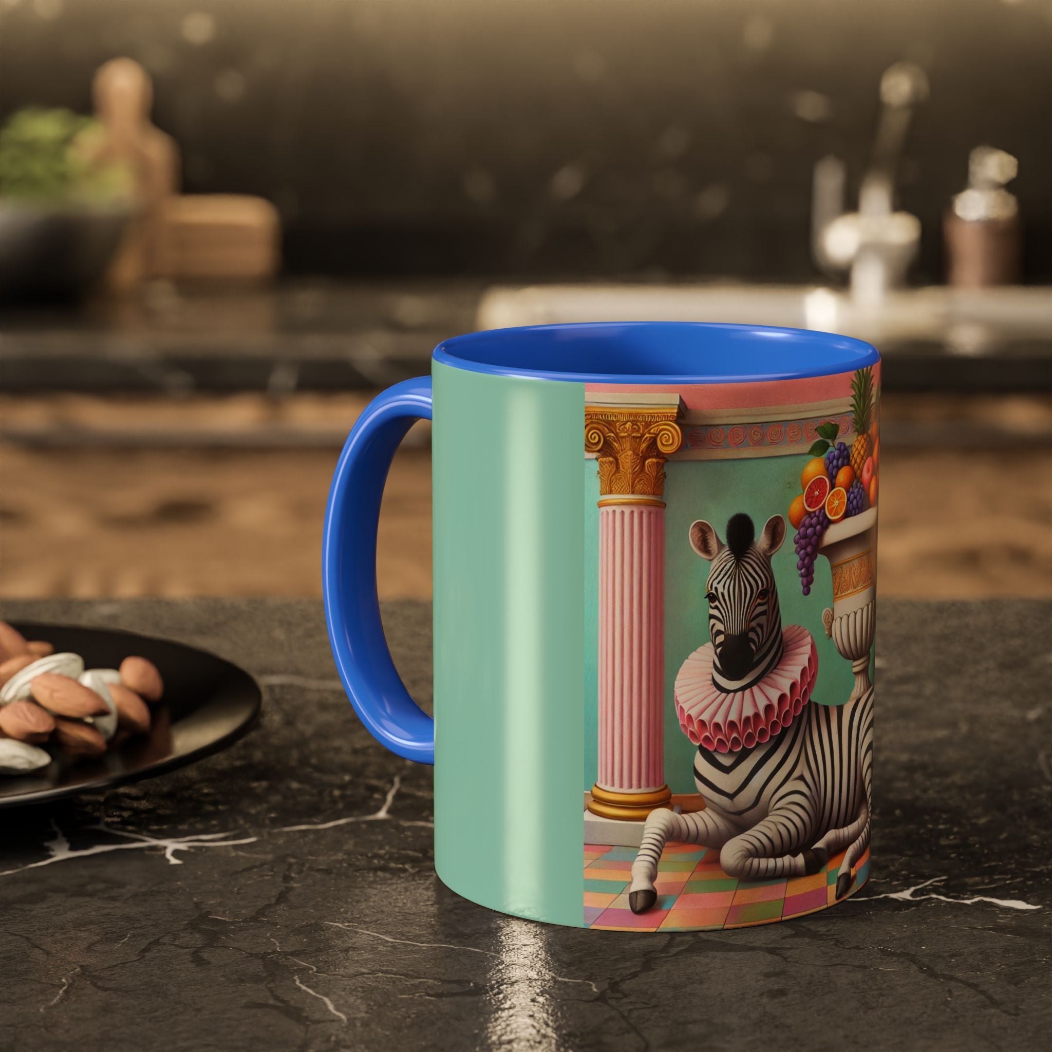 Still Life with Zebra, Fruit, and Pink Columns Colorful Mugs (11oz, 15oz) turn your daily sip into a playful, pastel-toned tableau, where a lounging zebra becomes the unlikely star beneath pink fluted columns and beside an overflowing amphora of fruit. Grapes cascade, citrus glows, and a pineapple crowns the arrangement, while a split pomegranate on the tiled floor adds a quiet note of abundance and symbolism. Dressed in a ruffled pink collar, the zebra blends elegance with absurdity—transforming Greco-Roman still life into something modern, whimsical, and surreal in soft mint, blush, gold, and ivory.