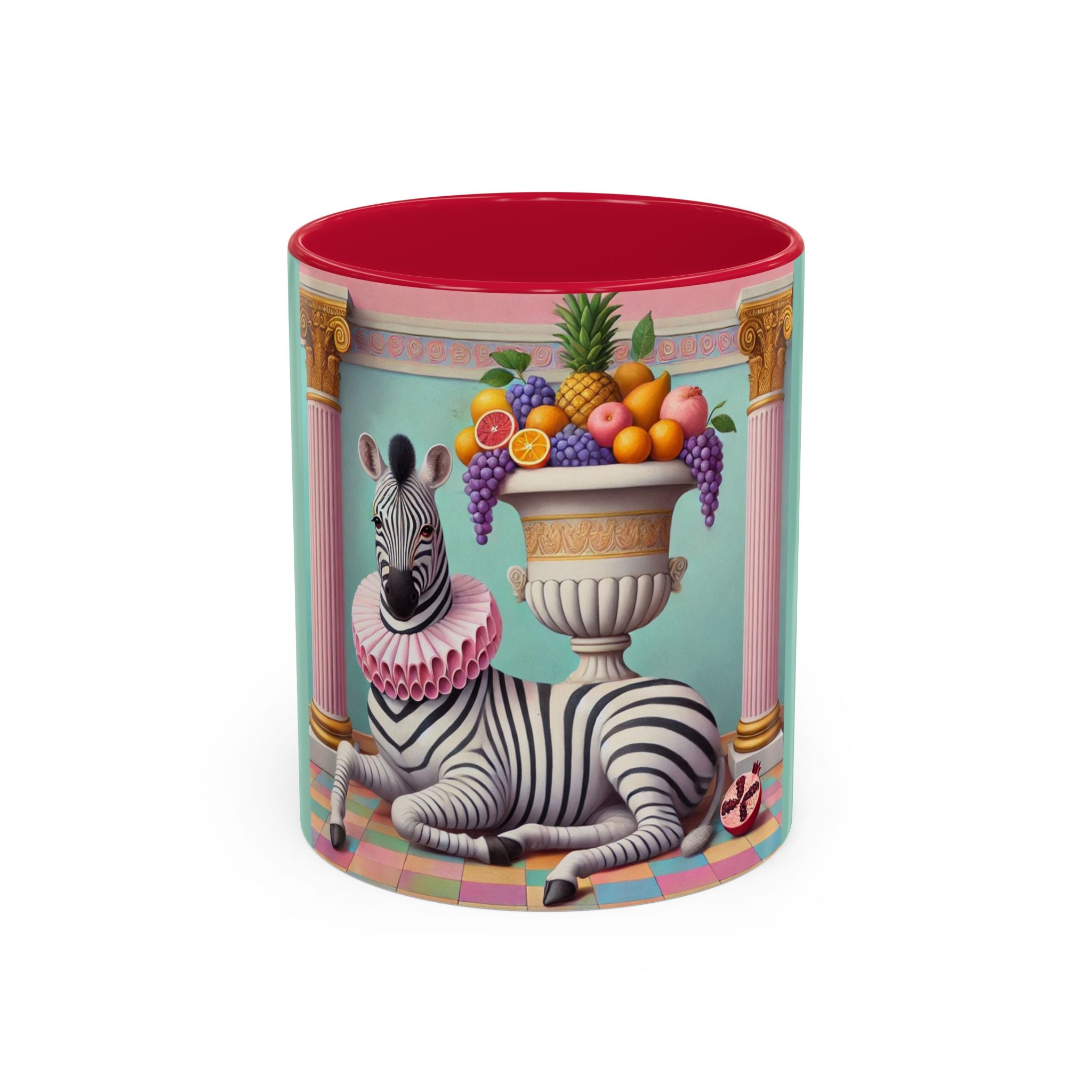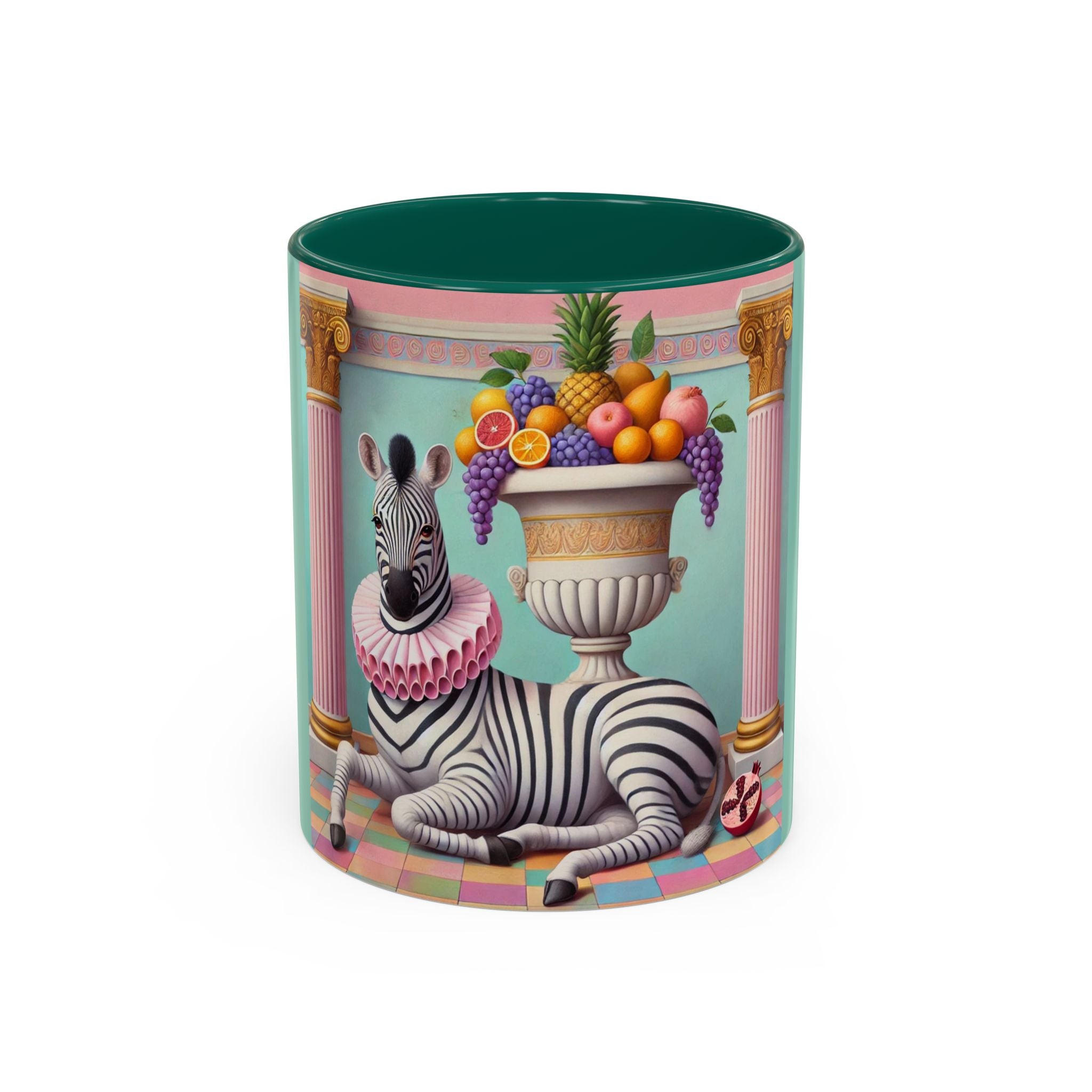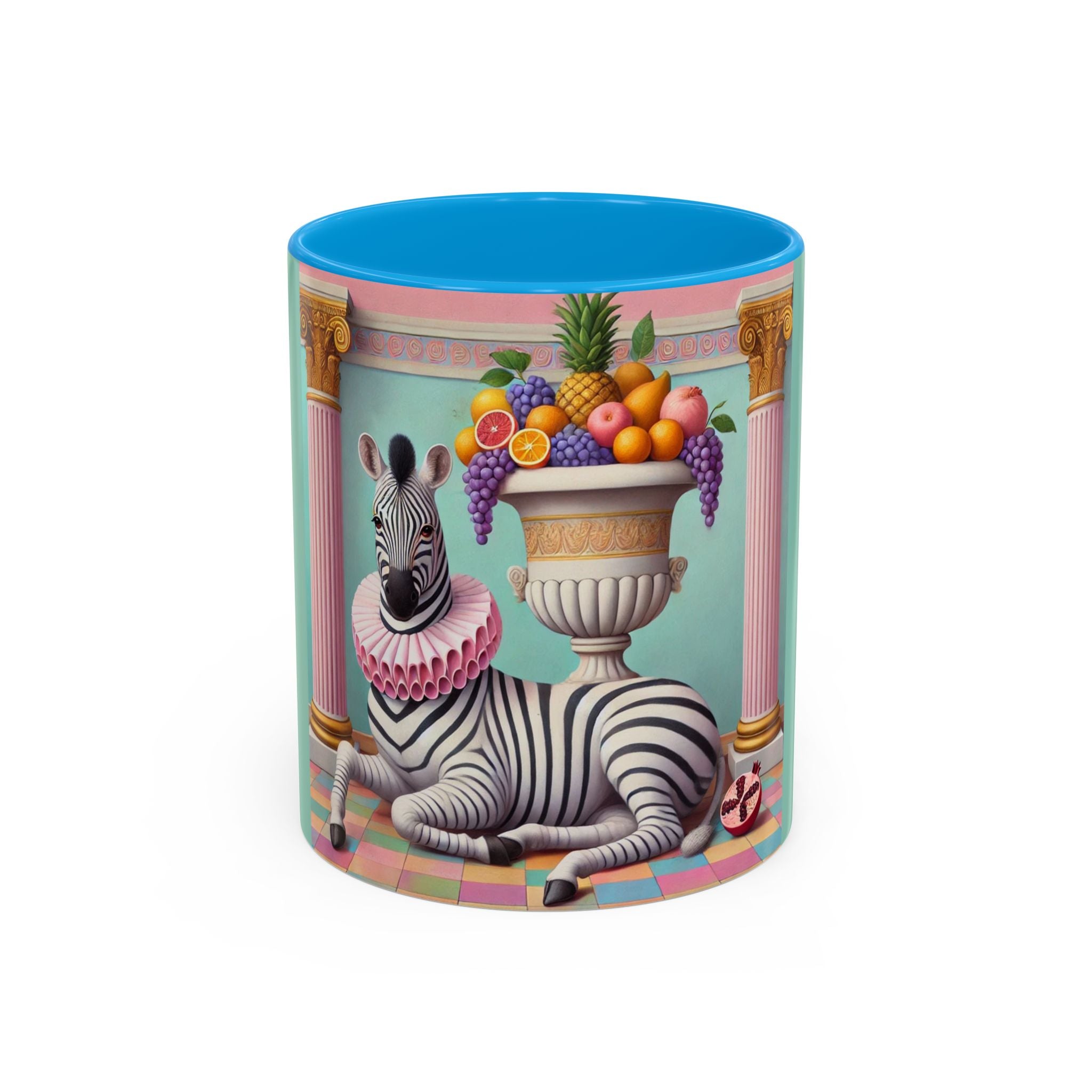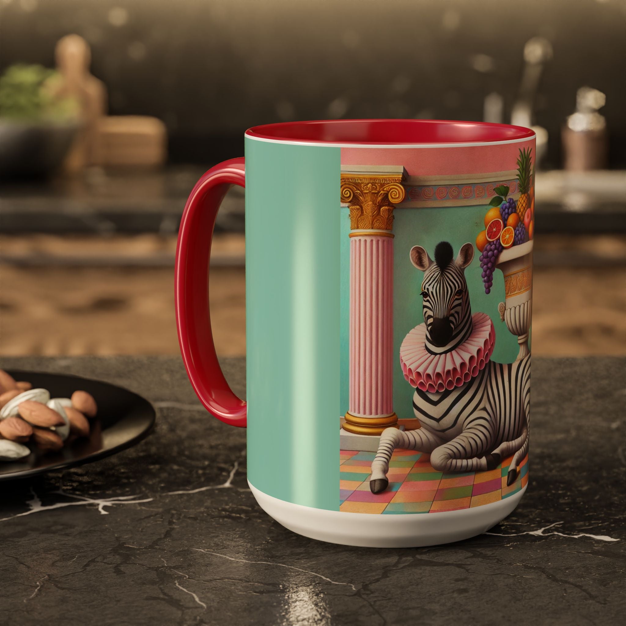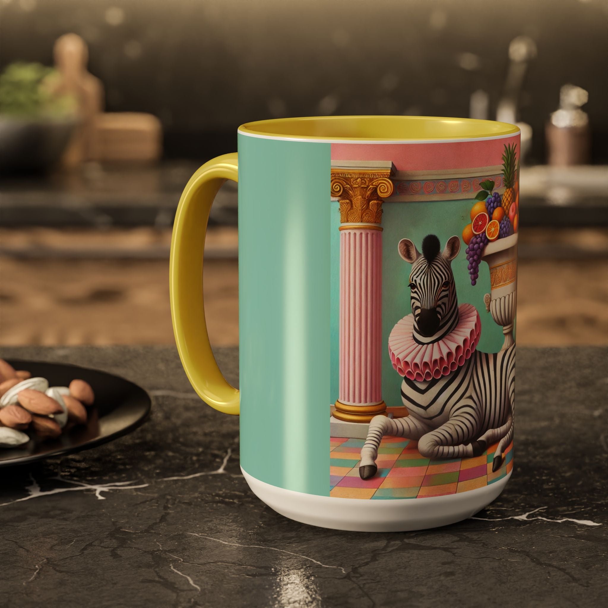 Still Life with Zebra, Fruit, and Pink Columns Colorful Mugs (11oz, 15oz) turn your daily sip into a playful, pastel-toned tableau, where a lounging zebra becomes the unlikely star beneath pink fluted columns and beside an overflowing amphora of fruit. Grapes cascade, citrus glows, and a pineapple crowns the arrangement, while a split pomegranate on the tiled floor adds a quiet note of abundance and symbolism. Dressed in a ruffled pink collar, the zebra blends elegance with absurdity—transforming Greco-Roman still life into something modern, whimsical, and surreal in soft mint, blush, gold, and ivory.