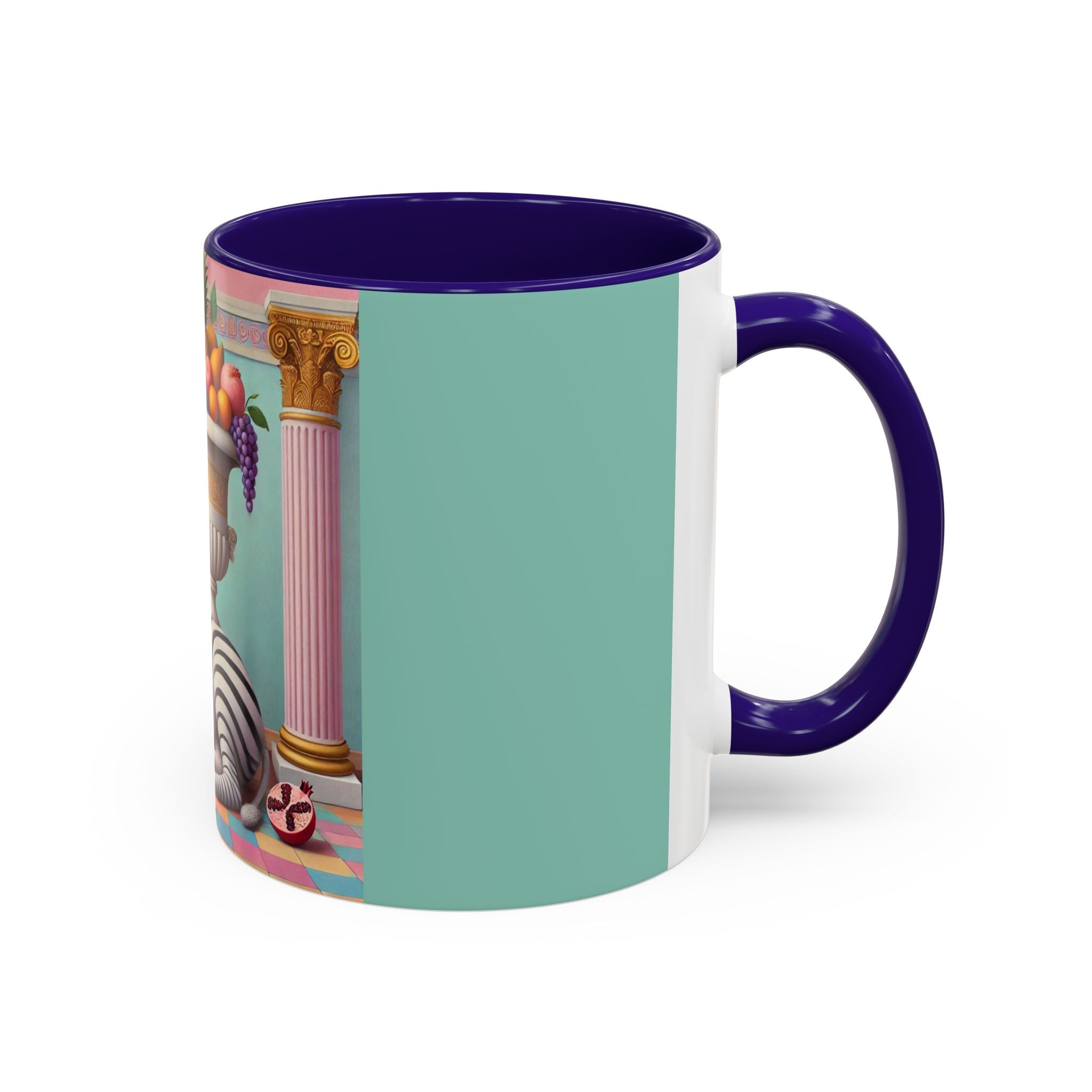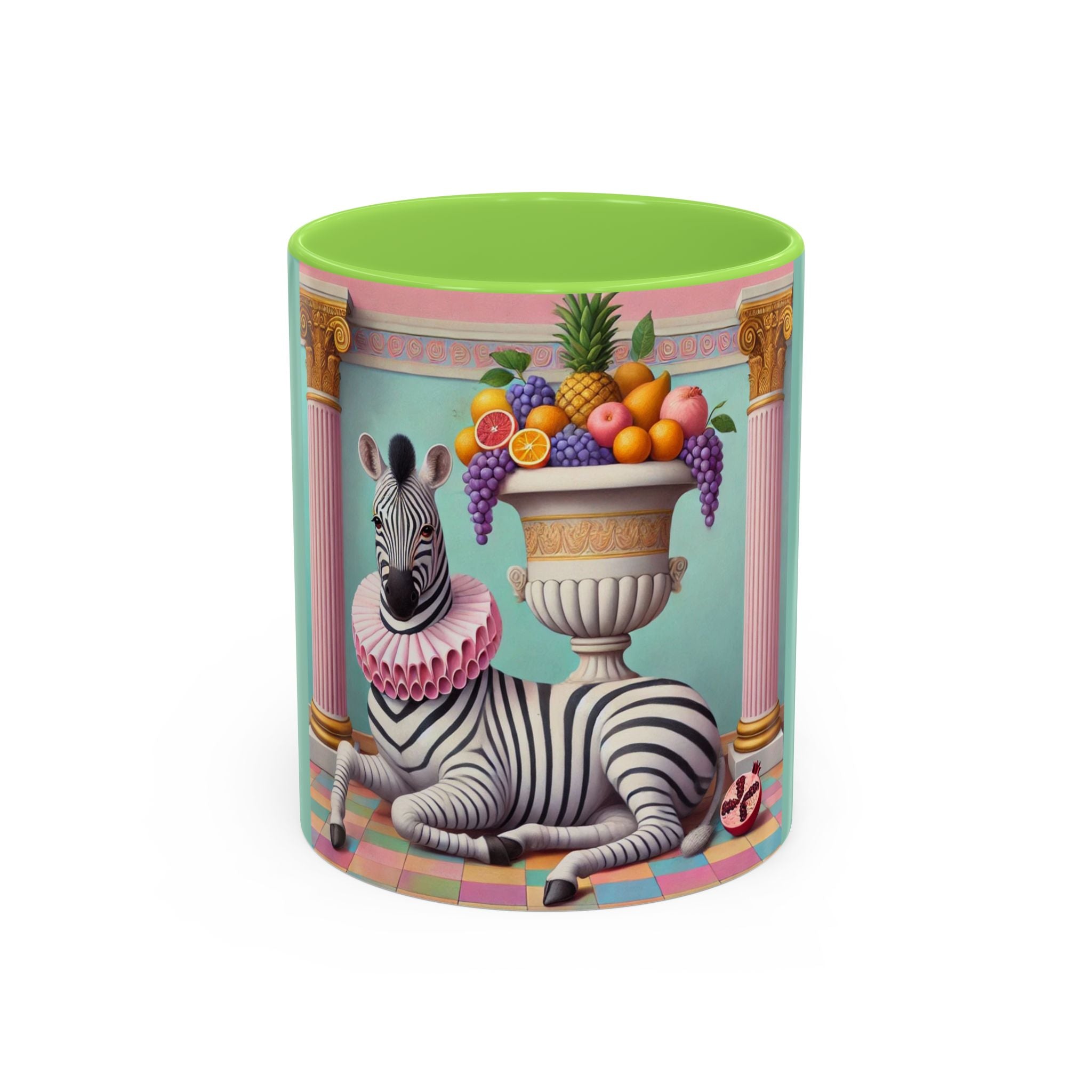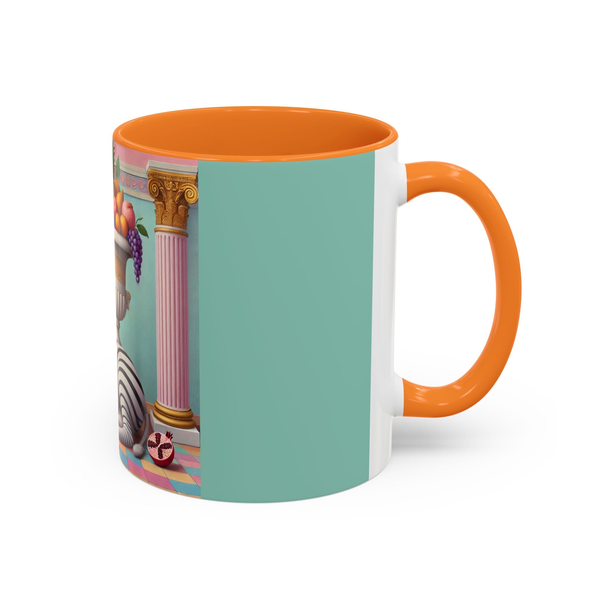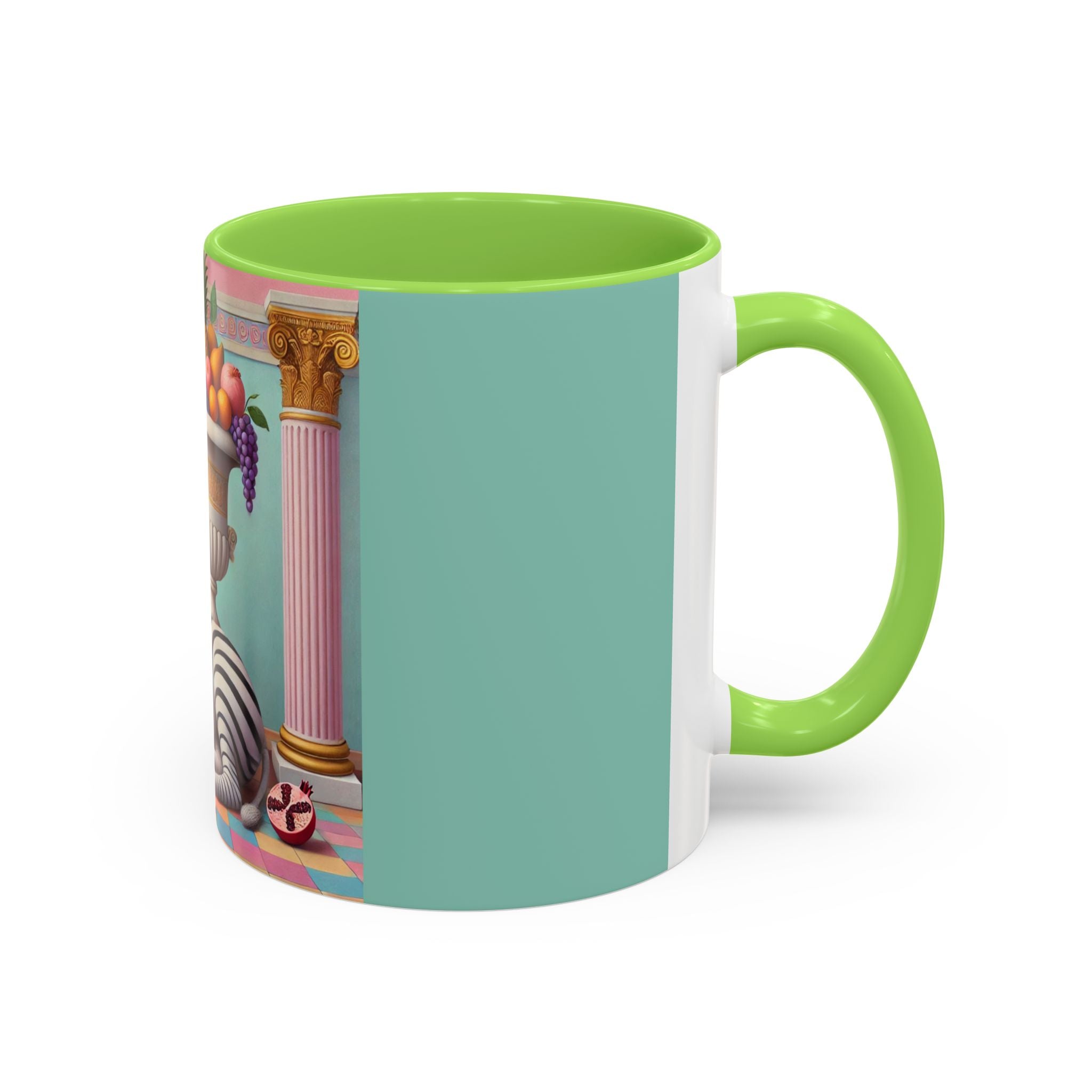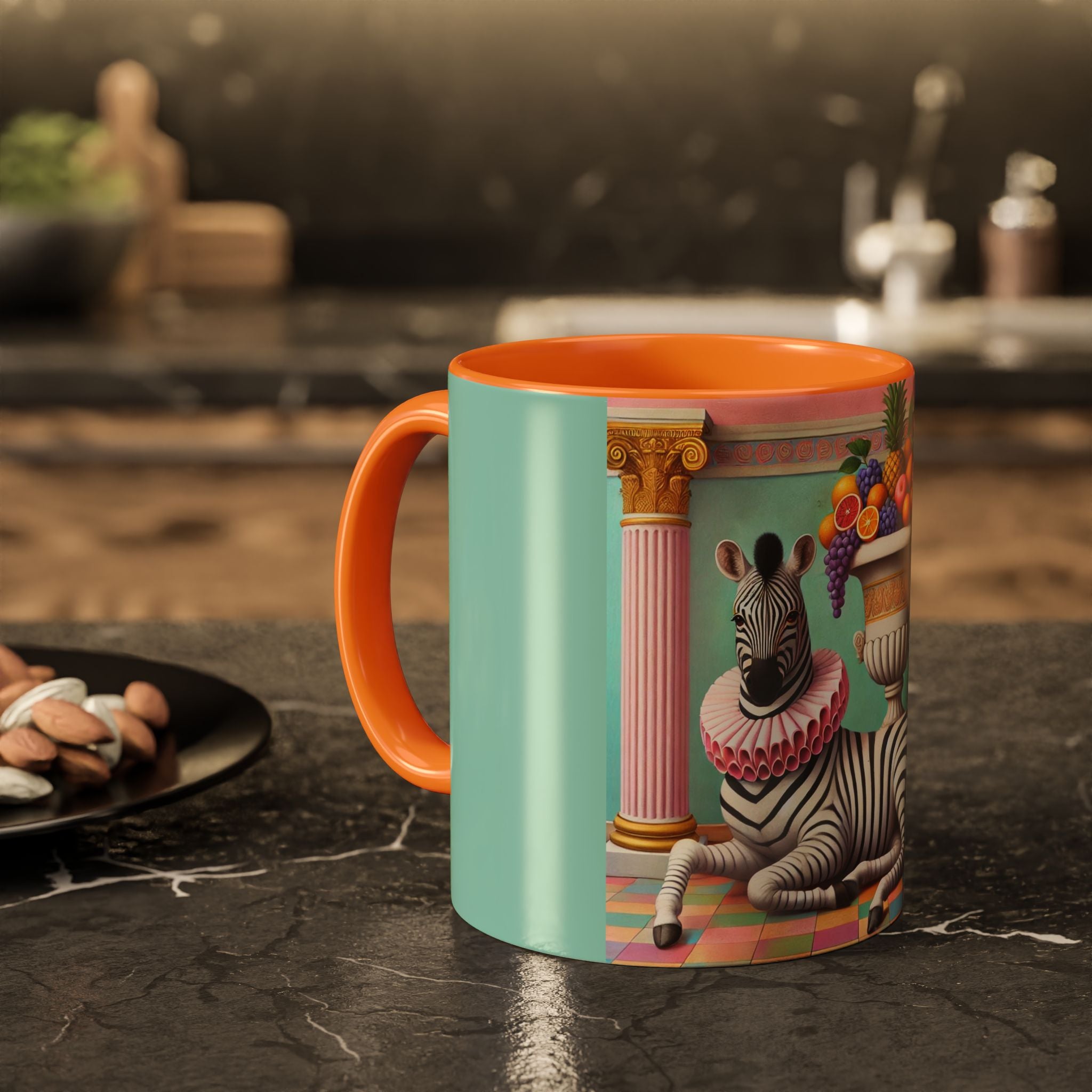 Still Life with Zebra, Fruit, and Pink Columns Colorful Mugs (11oz, 15oz) turn your daily sip into a playful, pastel-toned tableau, where a lounging zebra becomes the unlikely star beneath pink fluted columns and beside an overflowing amphora of fruit. Grapes cascade, citrus glows, and a pineapple crowns the arrangement, while a split pomegranate on the tiled floor adds a quiet note of abundance and symbolism. Dressed in a ruffled pink collar, the zebra blends elegance with absurdity—transforming Greco-Roman still life into something modern, whimsical, and surreal in soft mint, blush, gold, and ivory.