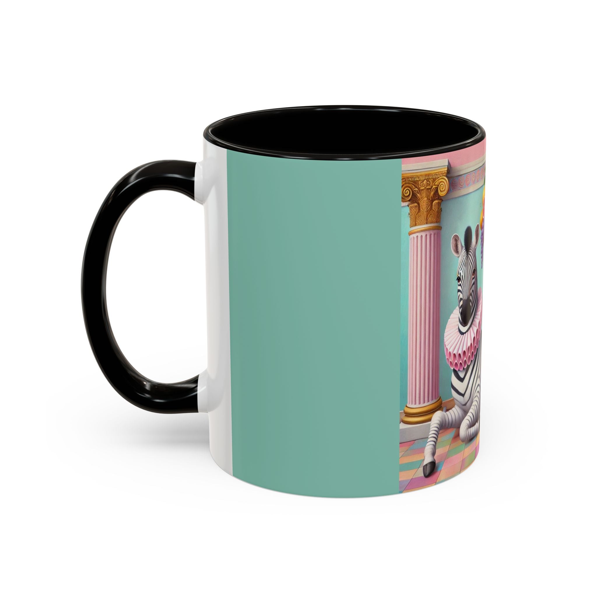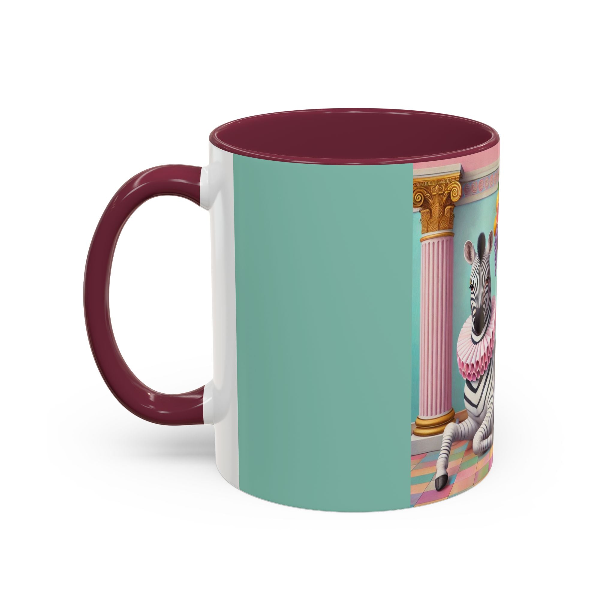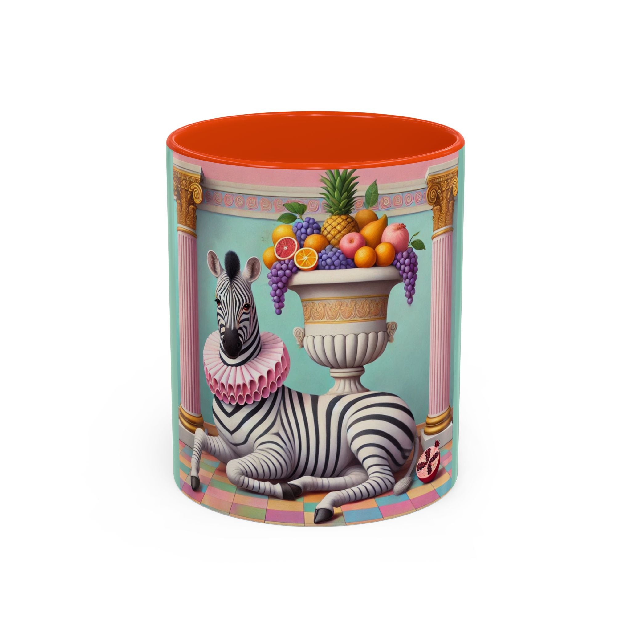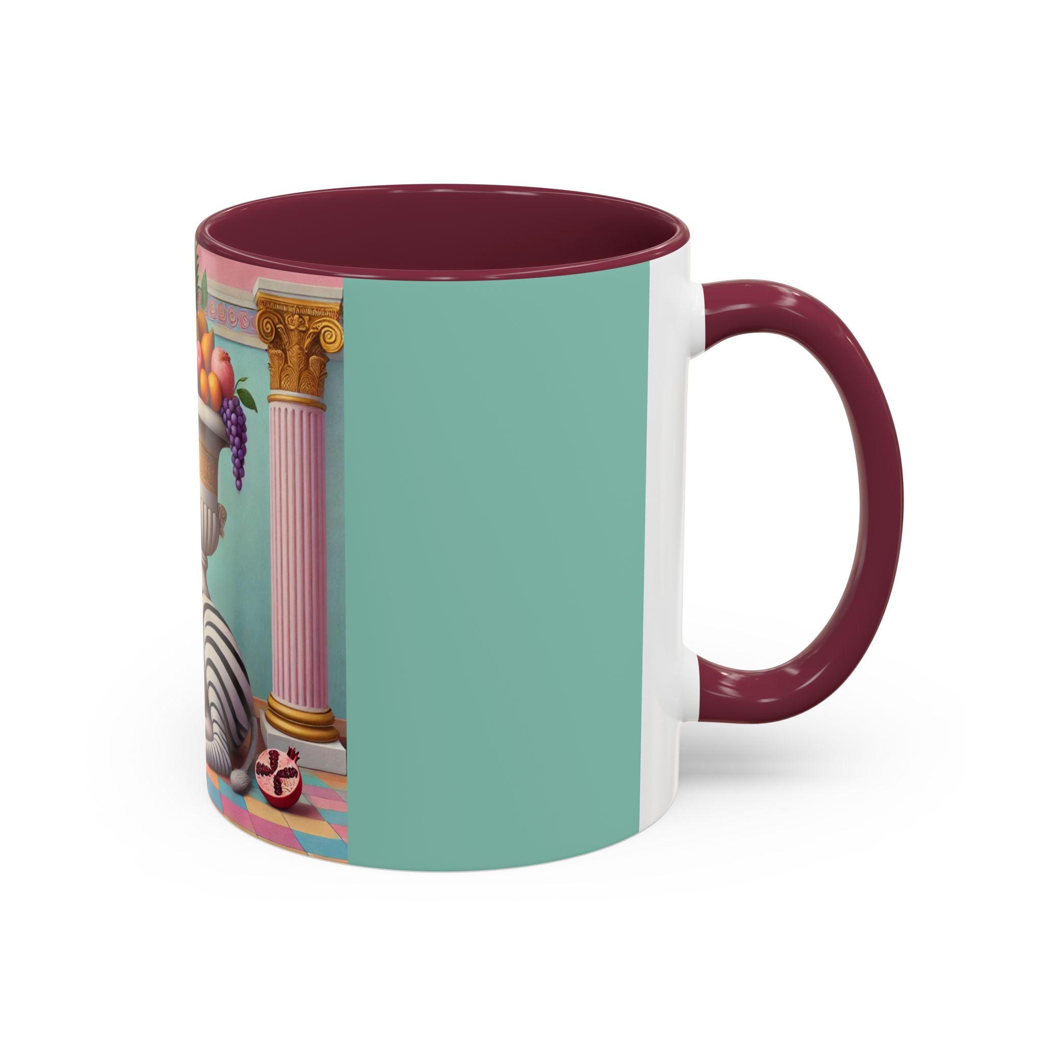Still Life with Zebra, Fruit, and Pink Columns Colorful Mugs (11oz, 15oz) turn your daily sip into a playful, pastel-toned tableau, where a lounging zebra becomes the unlikely star beneath pink fluted columns and beside an overflowing amphora of fruit. Grapes cascade, citrus glows, and a pineapple crowns the arrangement, while a split pomegranate on the tiled floor adds a quiet note of abundance and symbolism. Dressed in a ruffled pink collar, the zebra blends elegance with absurdity—transforming Greco-Roman still life into something modern, whimsical, and surreal in soft mint, blush, gold, and ivory.
