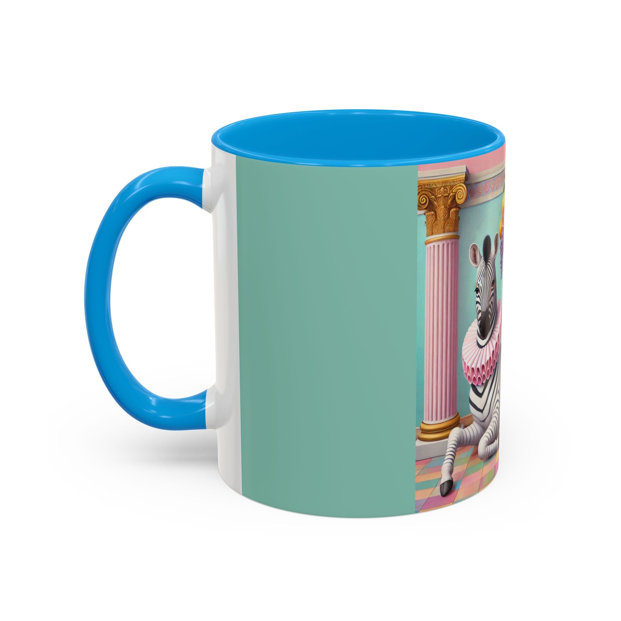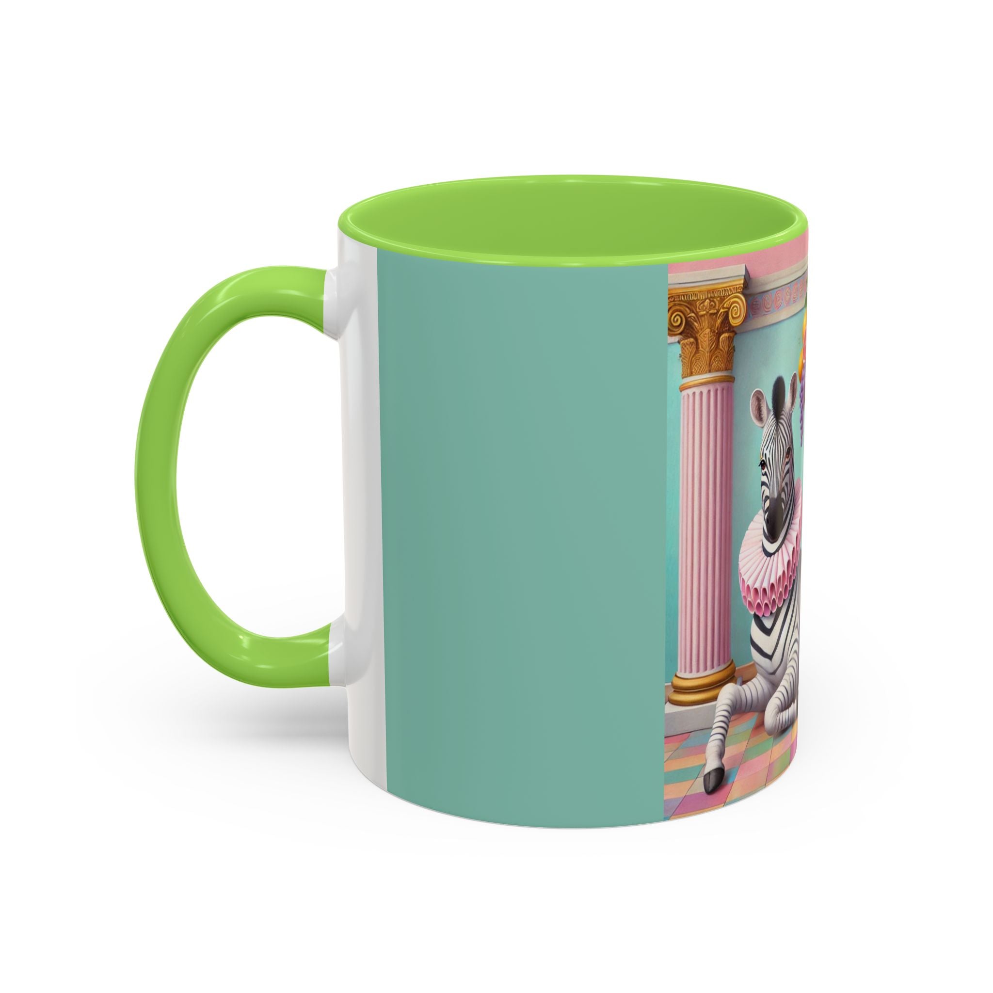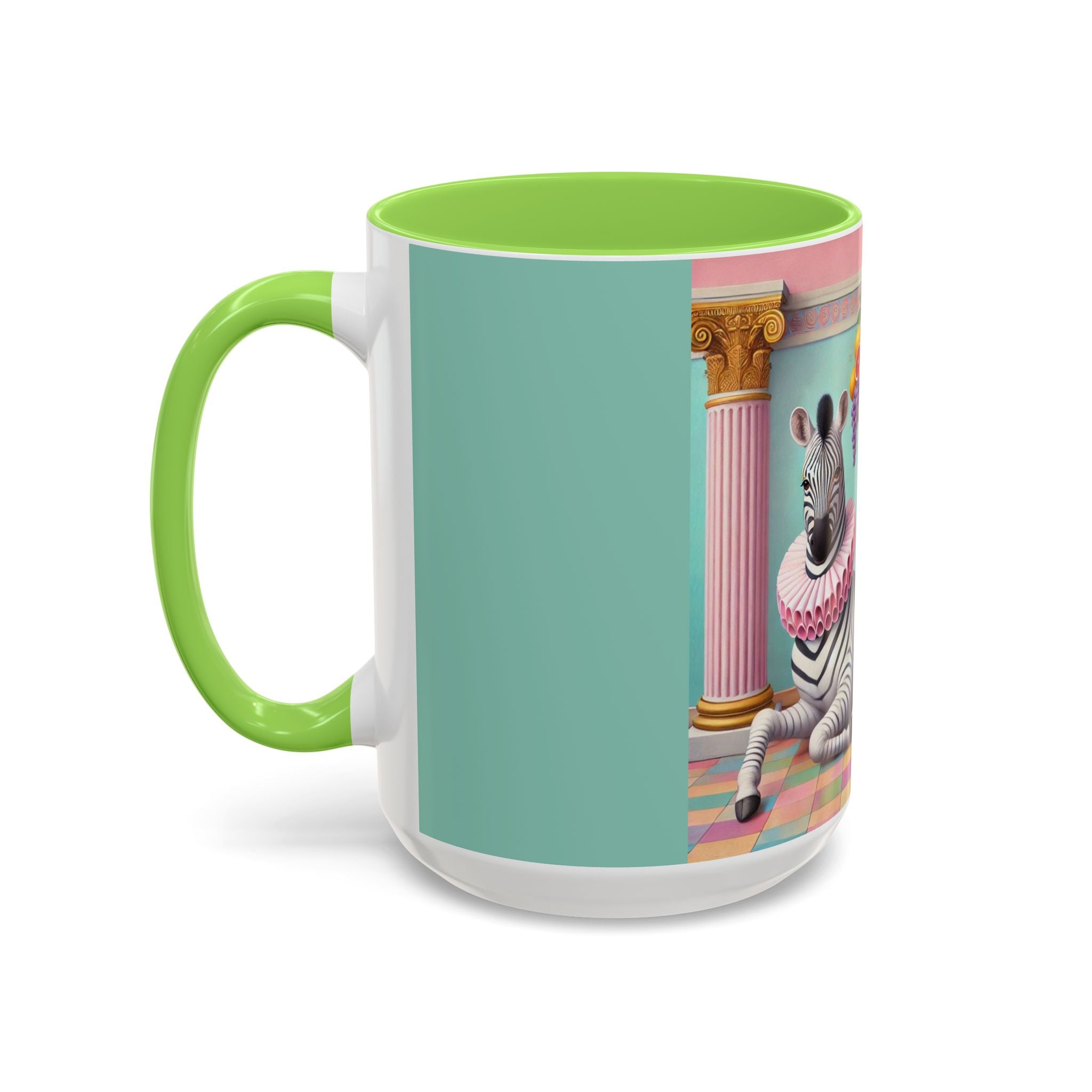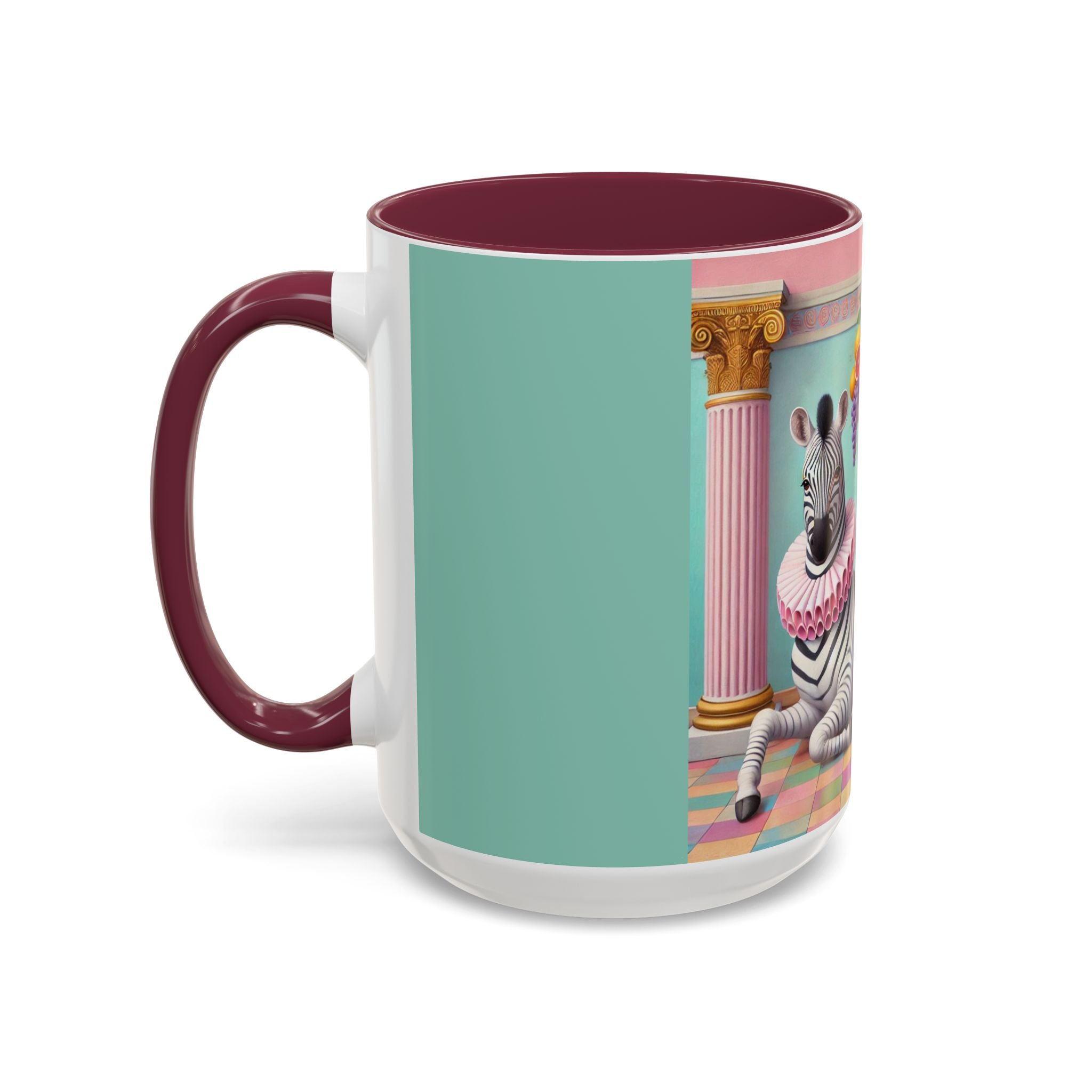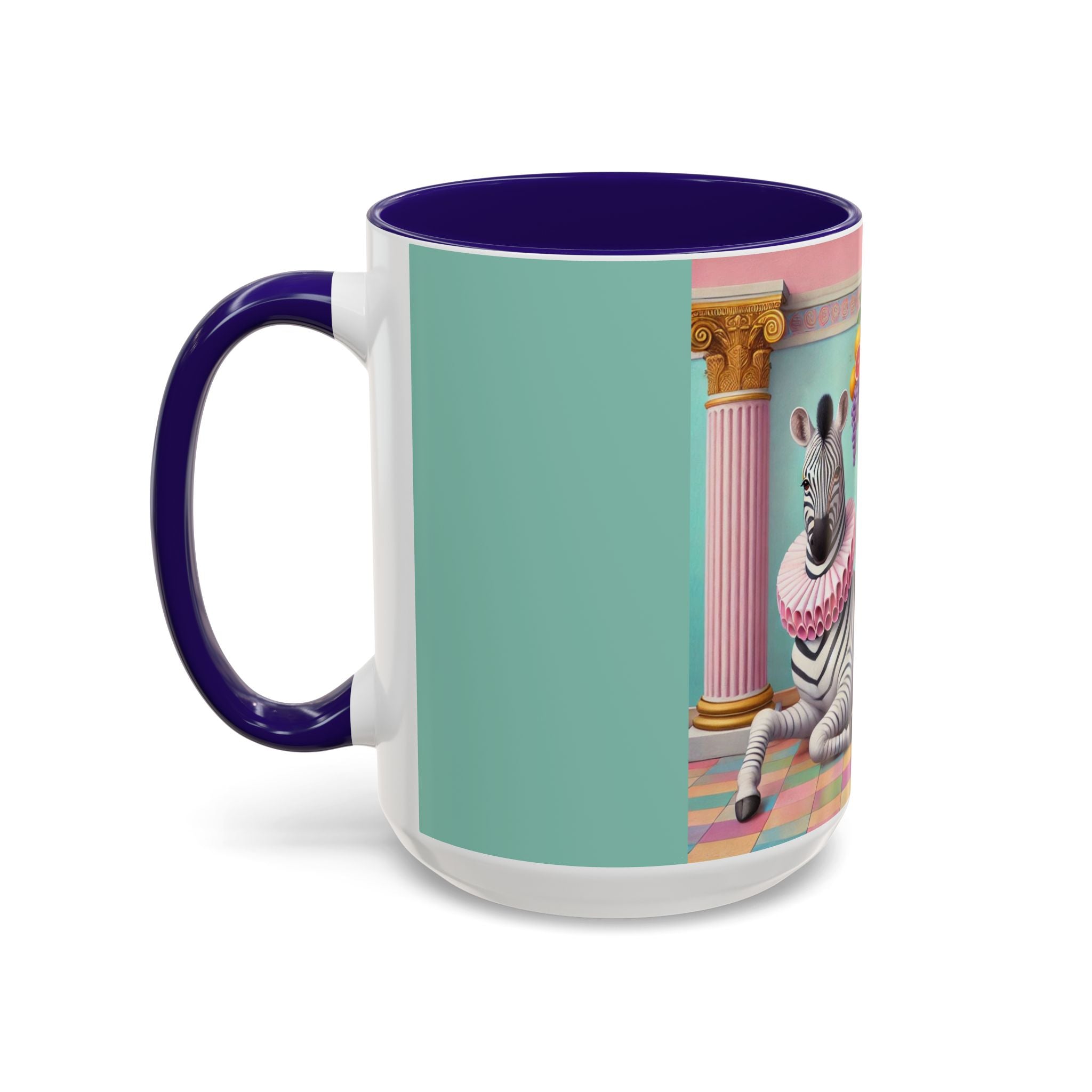 Still Life with Zebra, Fruit, and Pink Columns Colorful Mugs (11oz, 15oz) turn your daily sip into a playful, pastel-toned tableau, where a lounging zebra becomes the unlikely star beneath pink fluted columns and beside an overflowing amphora of fruit. Grapes cascade, citrus glows, and a pineapple crowns the arrangement, while a split pomegranate on the tiled floor adds a quiet note of abundance and symbolism. Dressed in a ruffled pink collar, the zebra blends elegance with absurdity—transforming Greco-Roman still life into something modern, whimsical, and surreal in soft mint, blush, gold, and ivory.