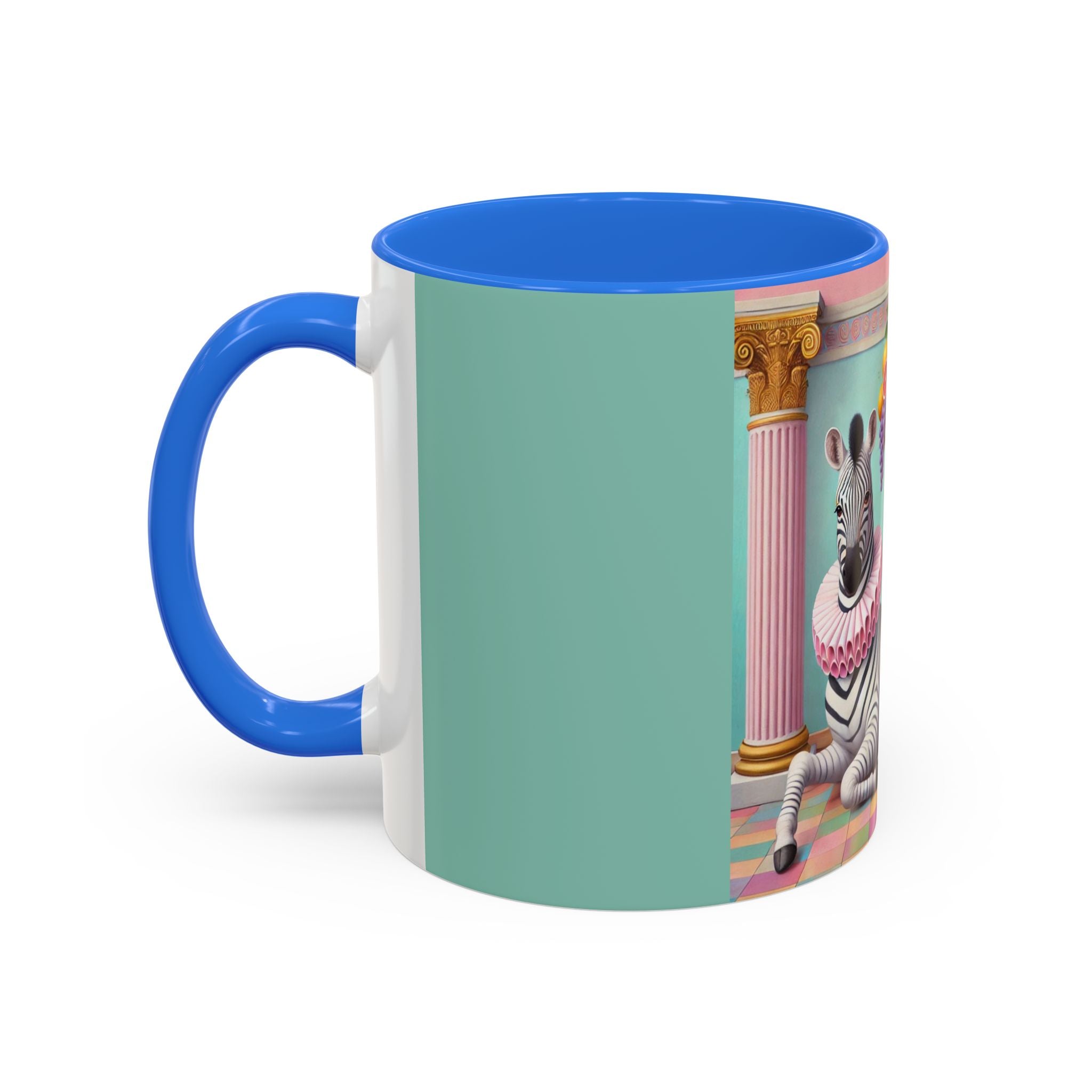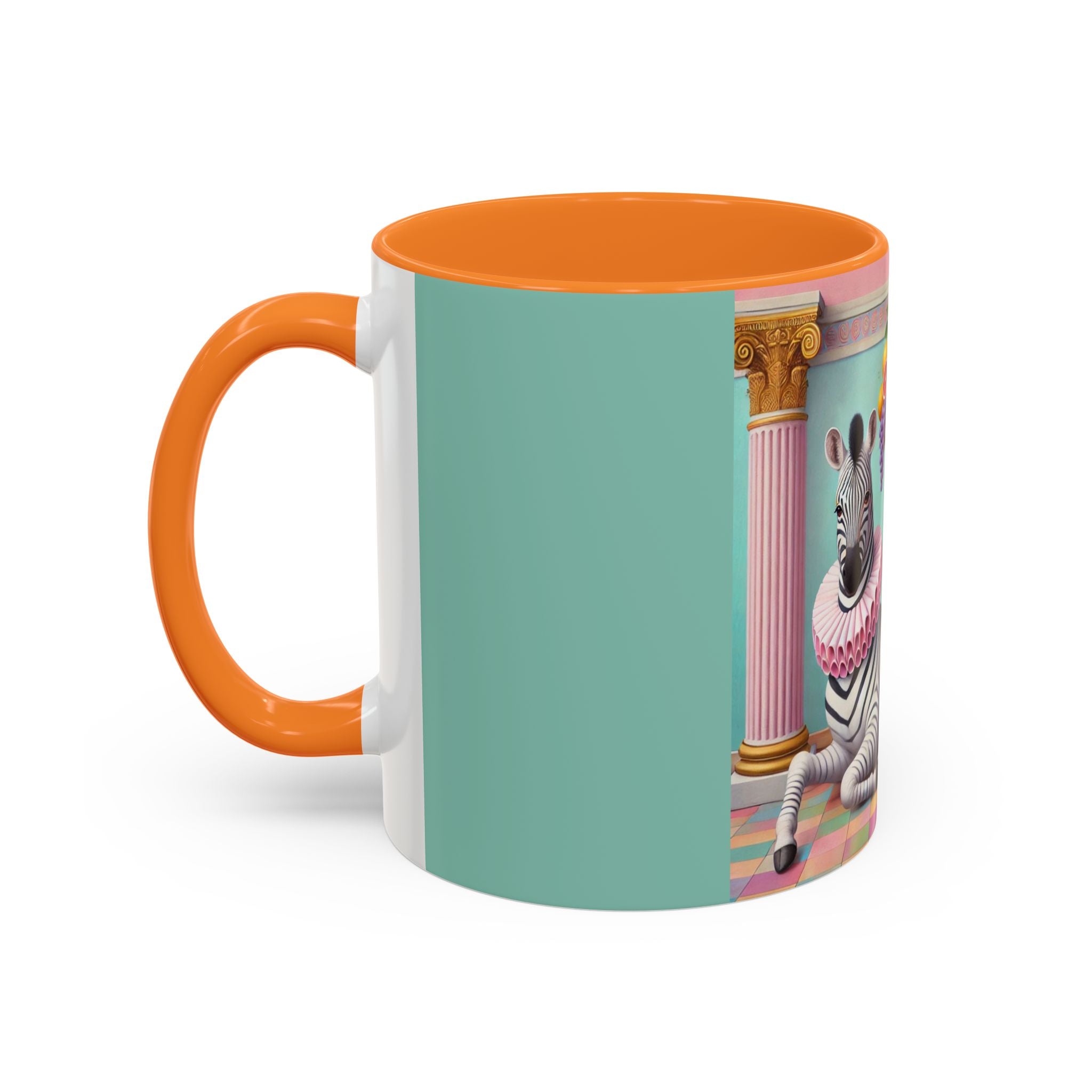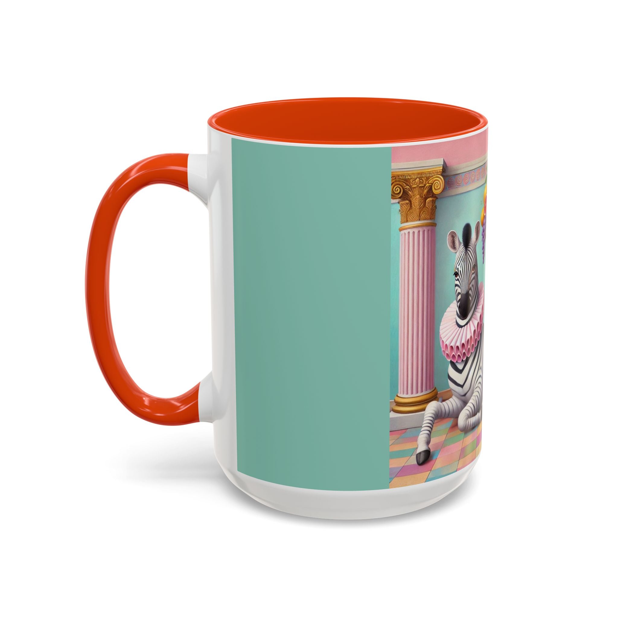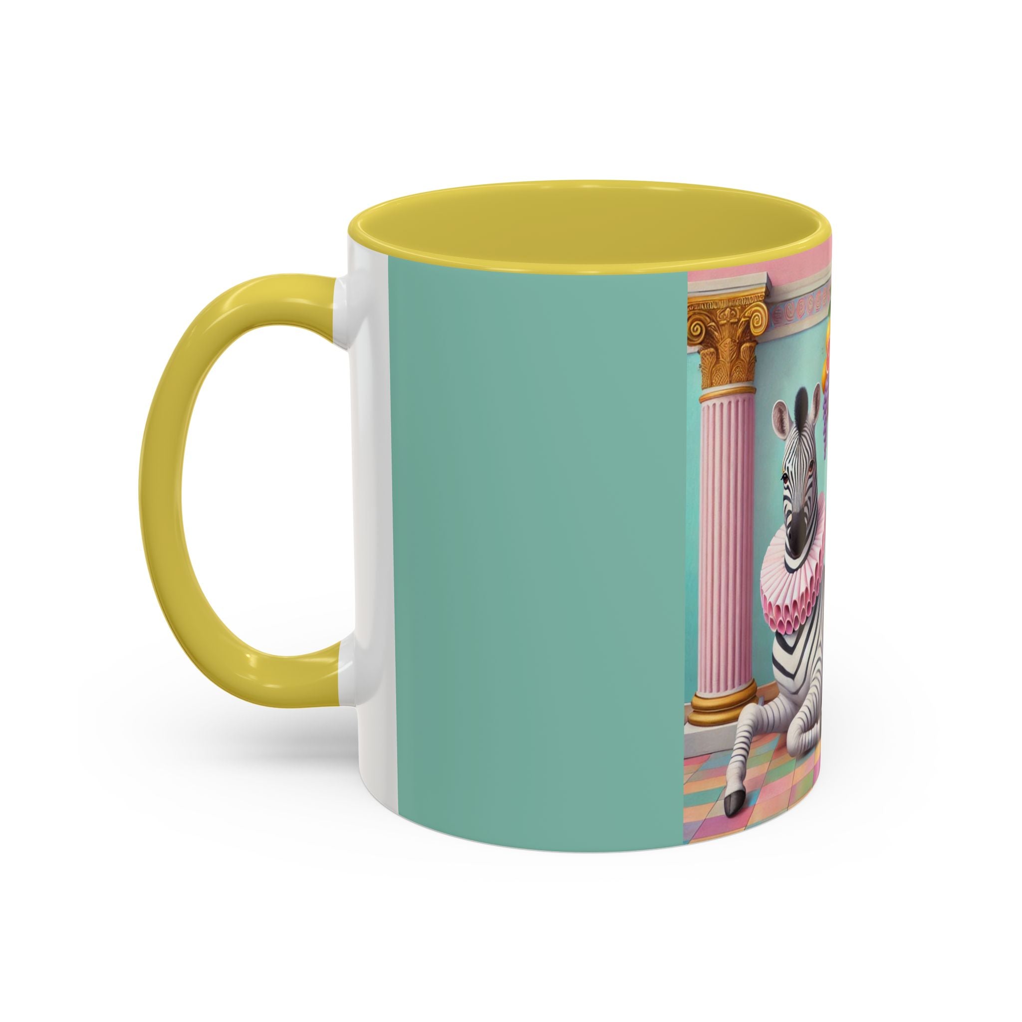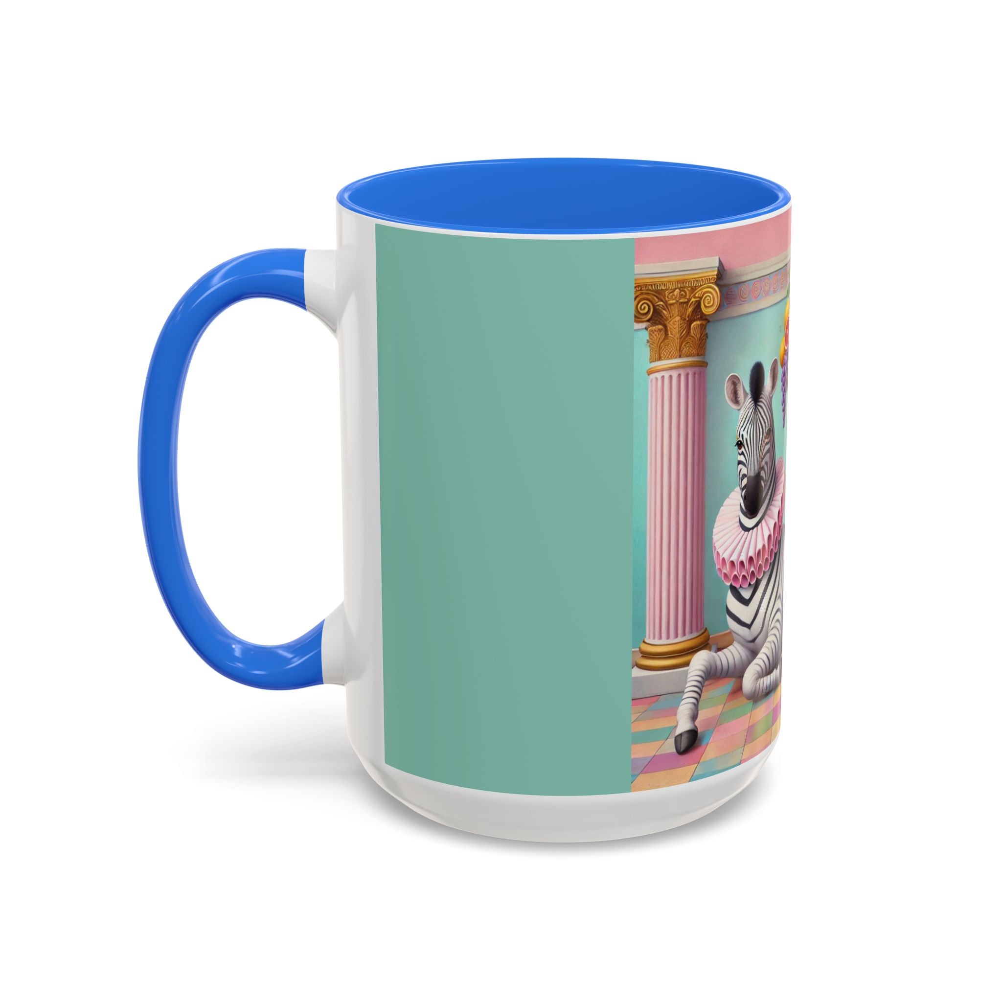 Still Life with Zebra, Fruit, and Pink Columns Colorful Mugs (11oz, 15oz) turn your daily sip into a playful, pastel-toned tableau, where a lounging zebra becomes the unlikely star beneath pink fluted columns and beside an overflowing amphora of fruit. Grapes cascade, citrus glows, and a pineapple crowns the arrangement, while a split pomegranate on the tiled floor adds a quiet note of abundance and symbolism. Dressed in a ruffled pink collar, the zebra blends elegance with absurdity—transforming Greco-Roman still life into something modern, whimsical, and surreal in soft mint, blush, gold, and ivory.