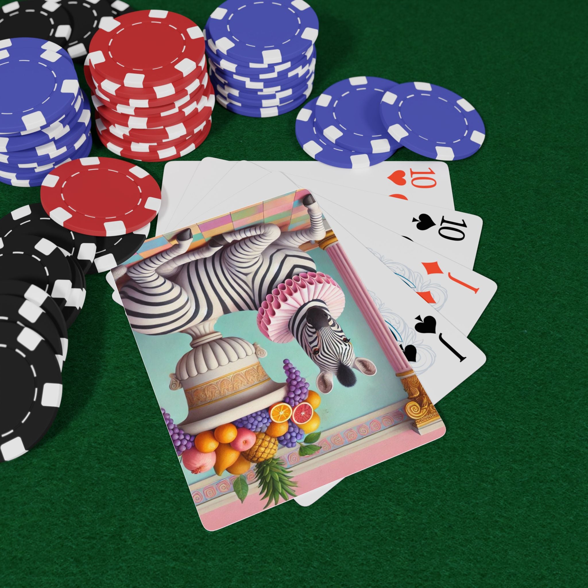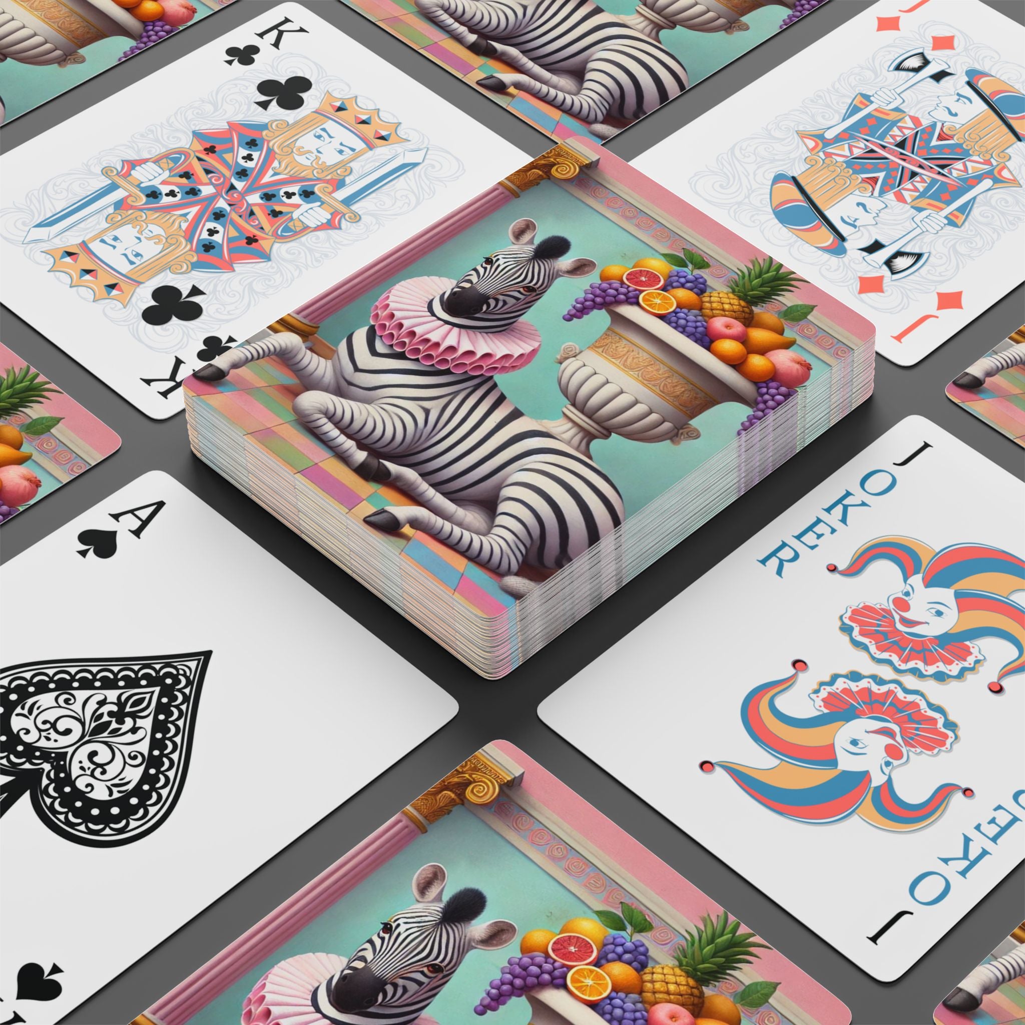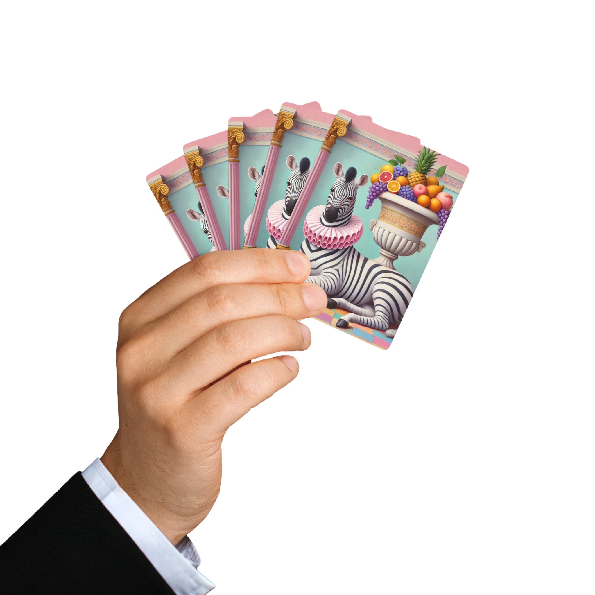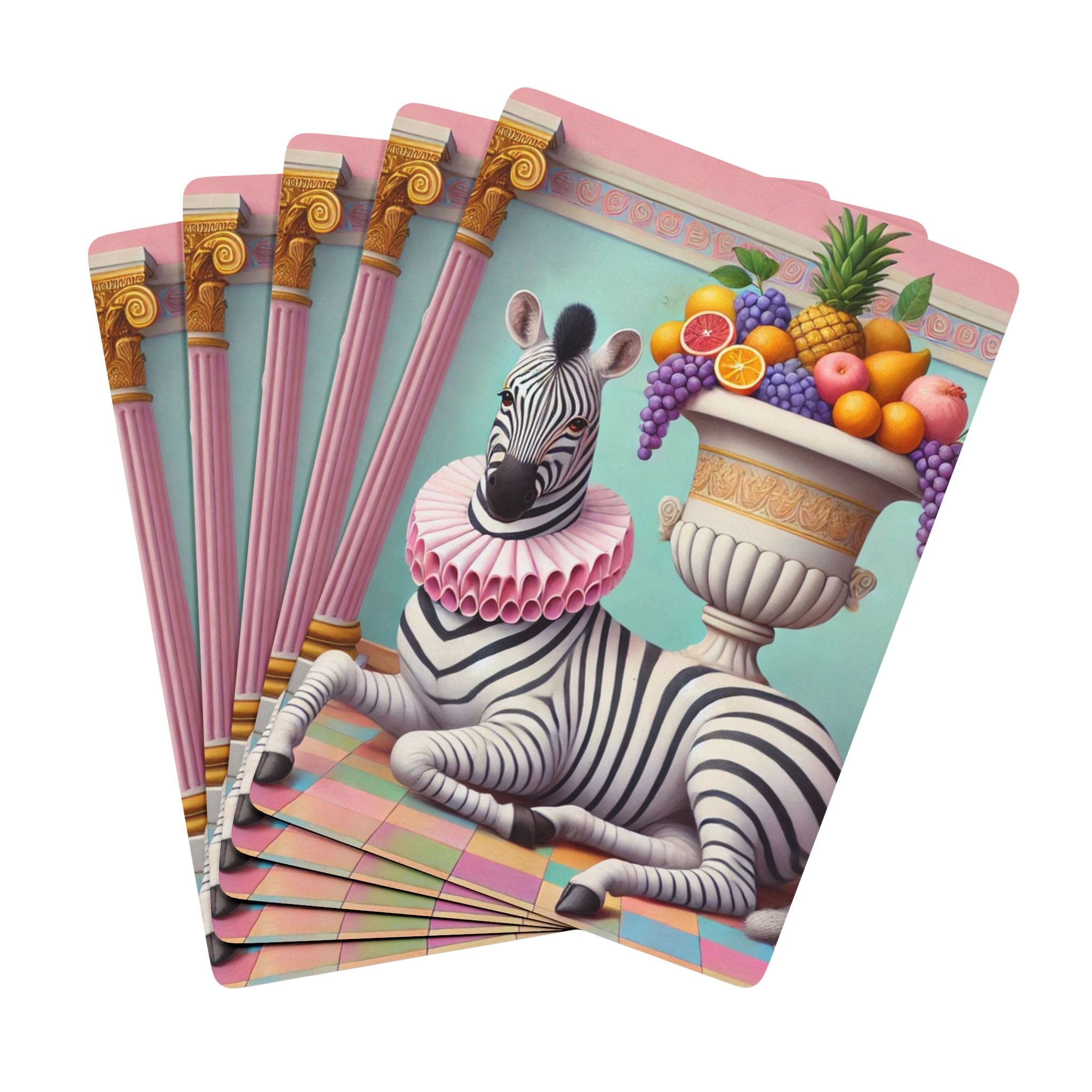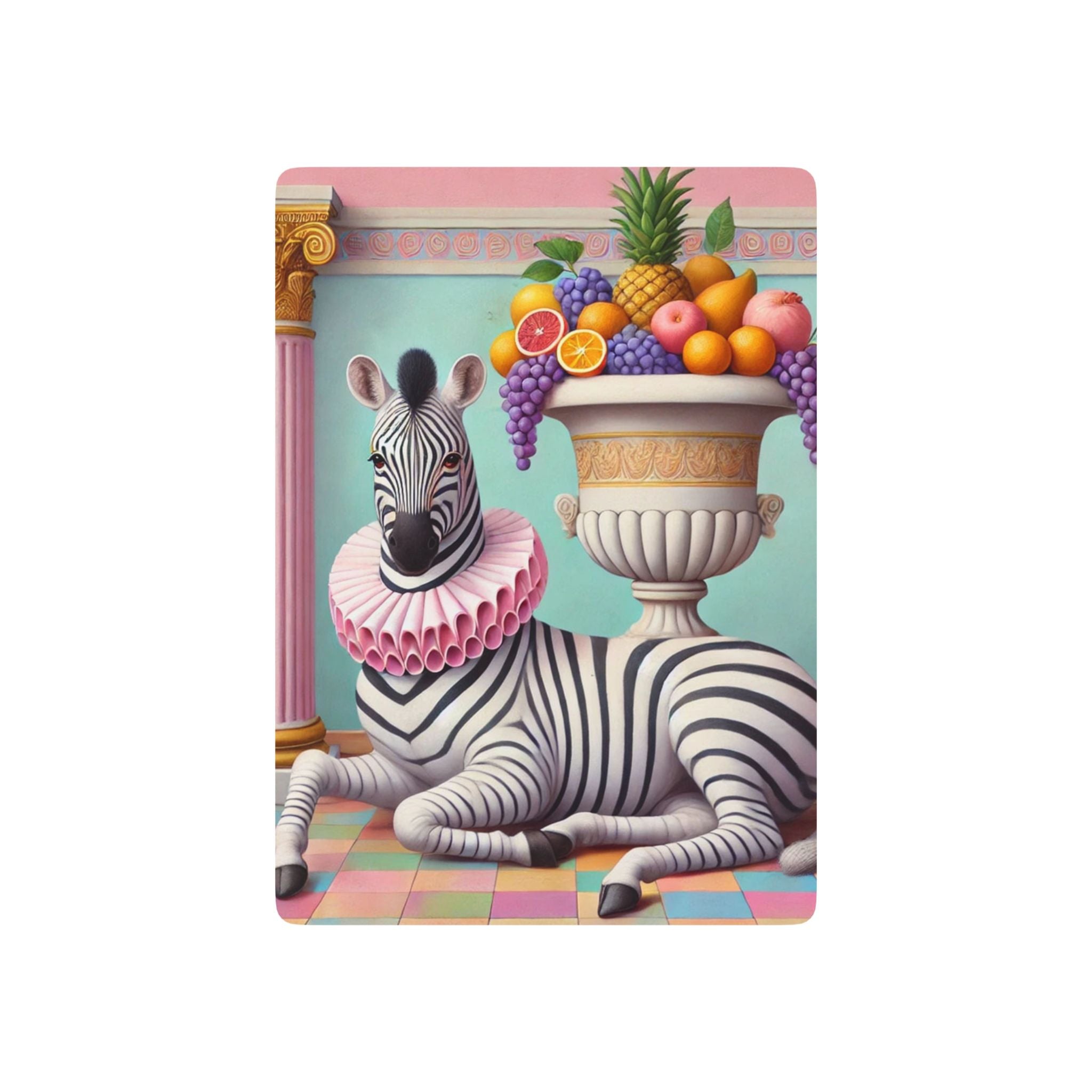 Still Life with Zebra, Fruit, and Pink Columns Playing Cards turn game night into a pastel-toned salon scene, where a lounging zebra becomes the unlikely star beneath pink fluted columns and beside an overflowing amphora of fruit. Grapes cascade, citrus glows, and a pineapple crowns the arrangement, while a split pomegranate on the tiled floor adds a quiet note of abundance and symbolism. Dressed in a ruffled pink collar, the zebra blends elegance with absurdity—transforming the traditions of Greco-Roman still life into something playful, modern, and surreal in soft mint, blush, gold, and ivory.