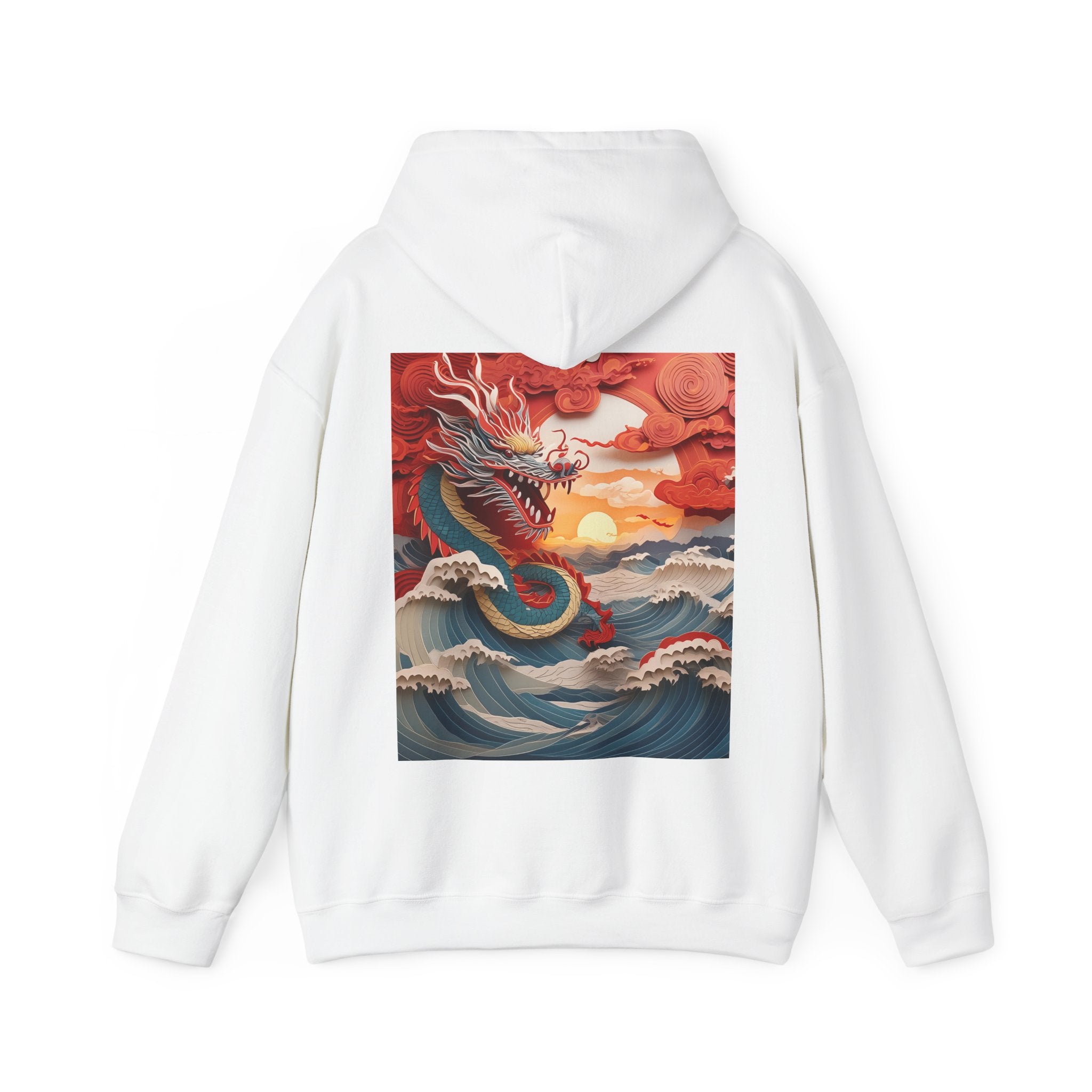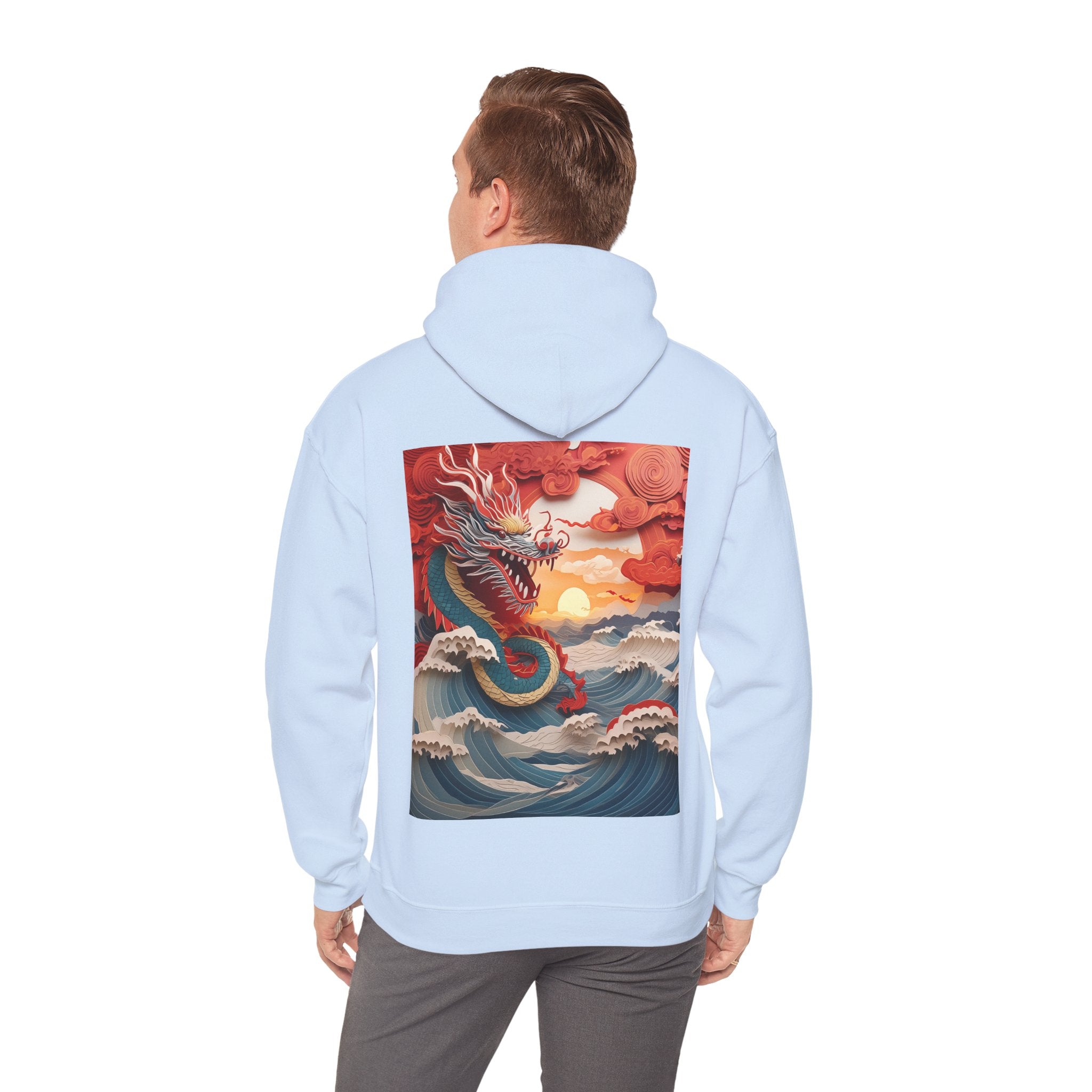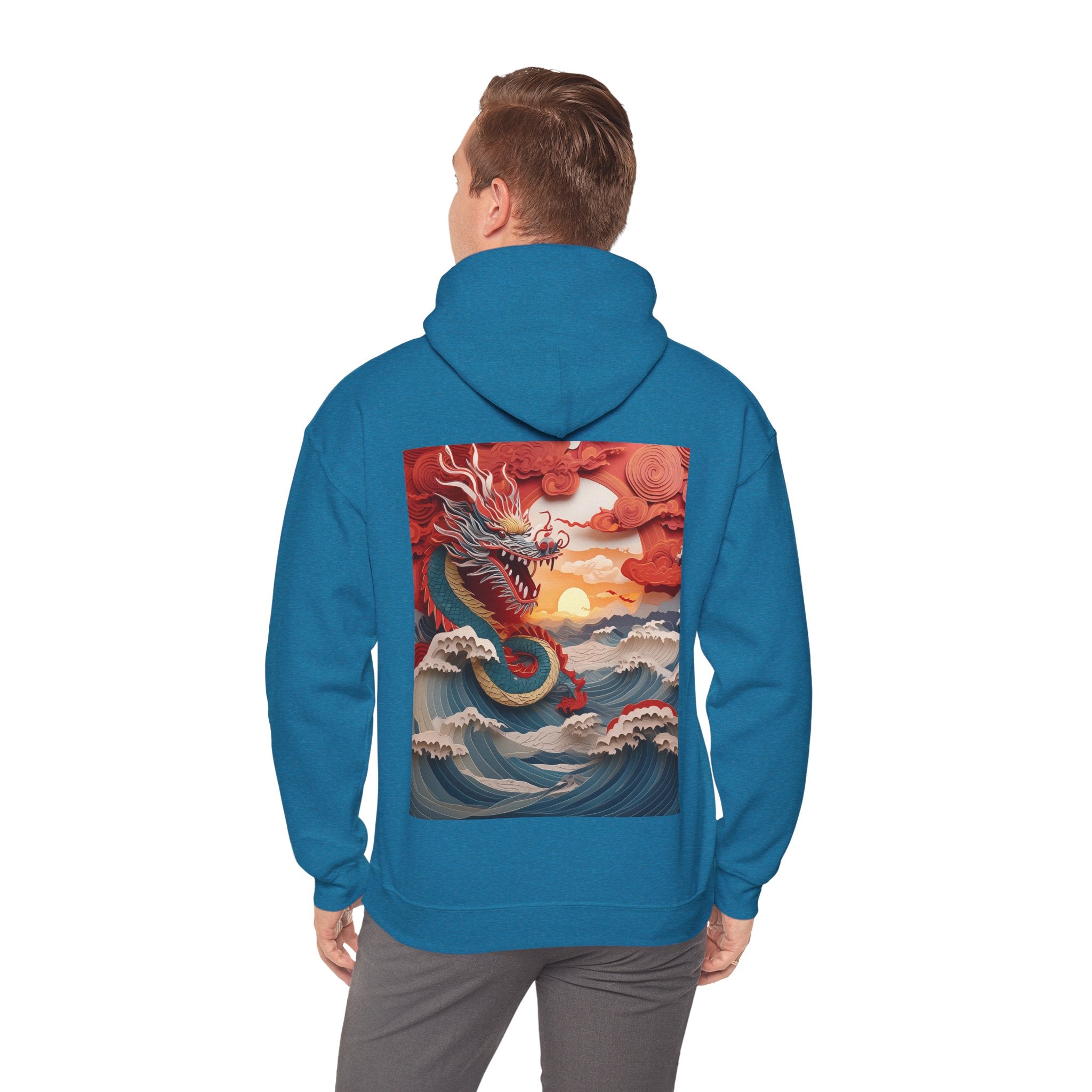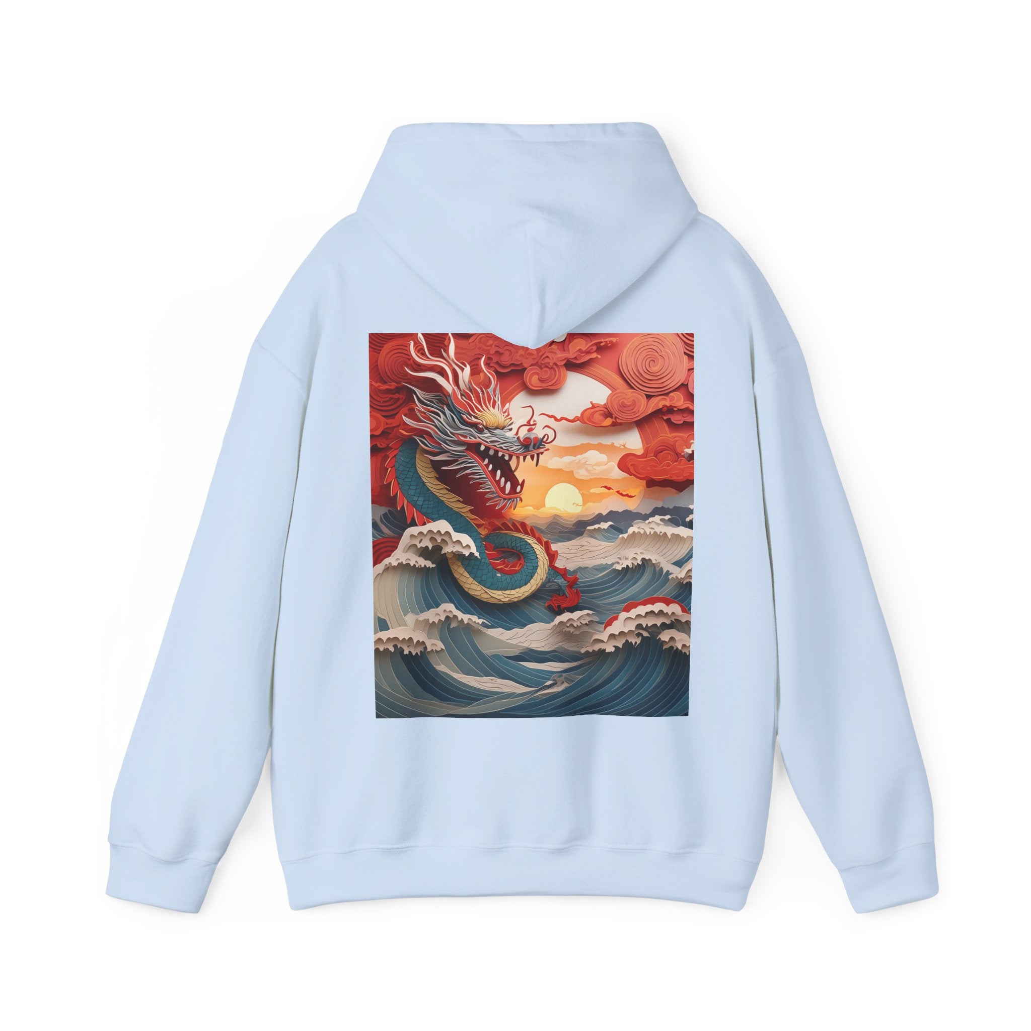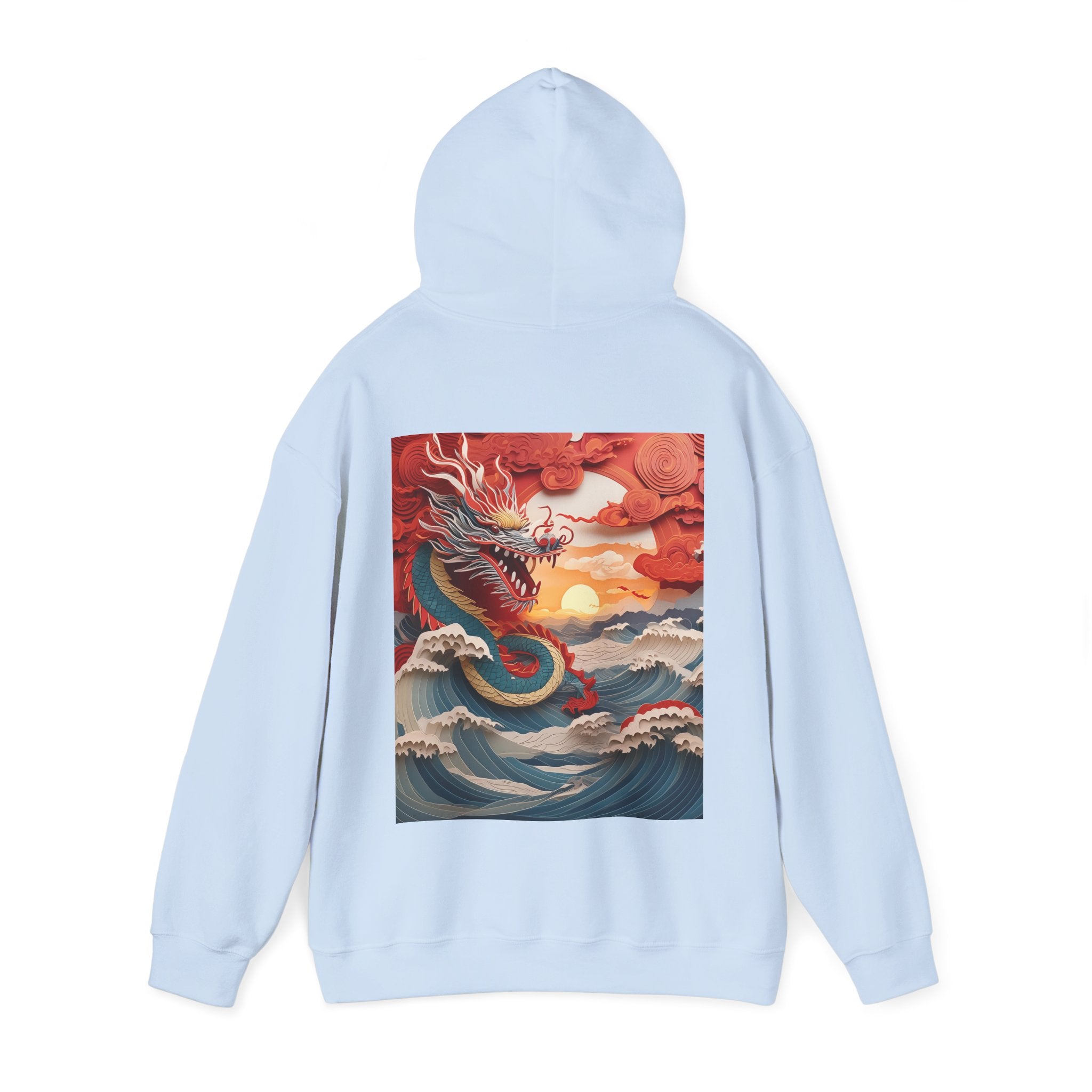 Stormbound Dragon – Heavy Blend™ Hooded Sweatshirt brings the fierce beauty of a storm to life in a bold, atmospheric design. The artwork follows a powerful dragon soaring through a turbulent sky, its form illuminated by flashes of light as it weaves between swirling clouds. Below, crashing waves rise to meet it, reflecting its strength and the raw majesty of nature. Even amid the chaos, a faint break of sunlight slips through the storm—hinting at resilience, balance, and the calm that follows power in motion.