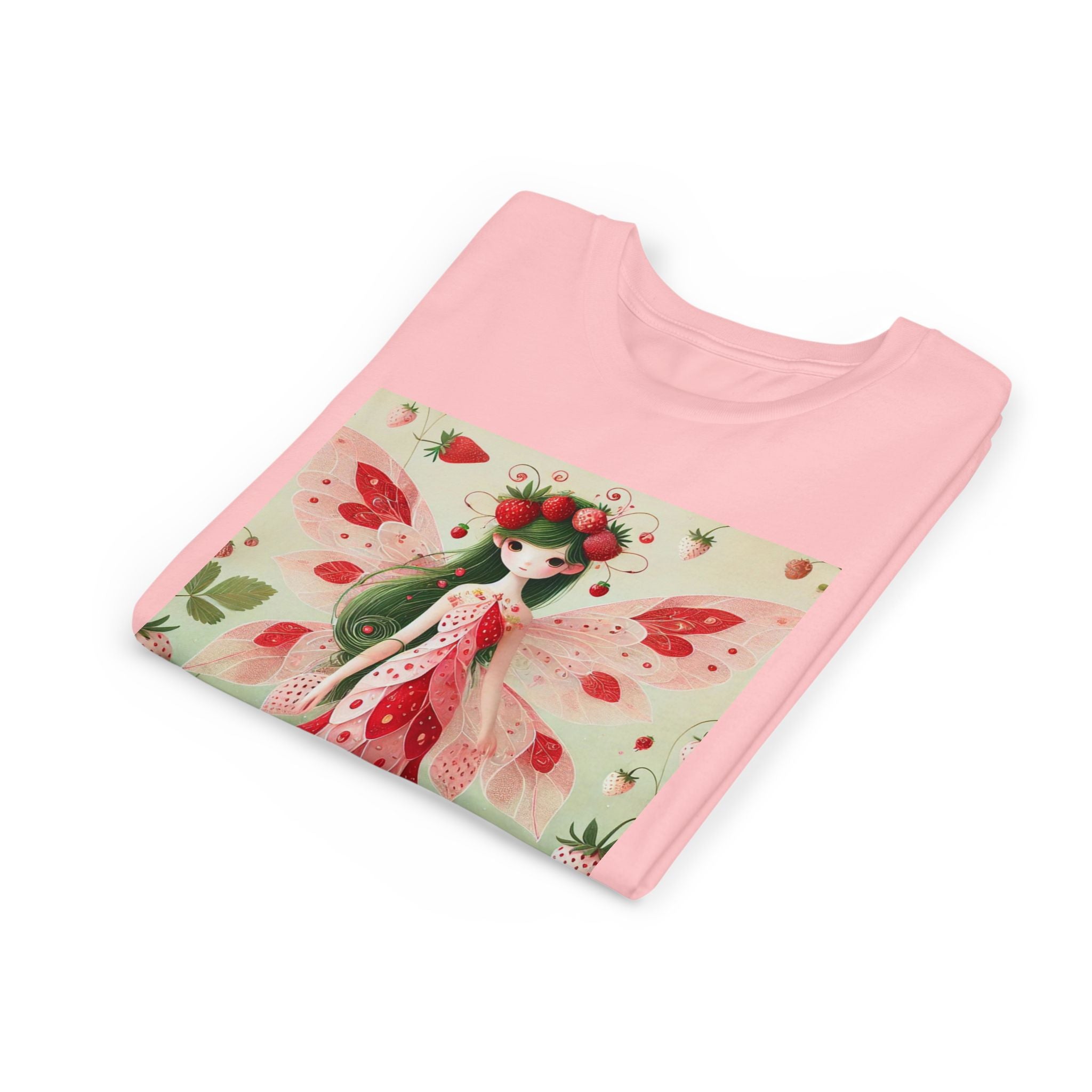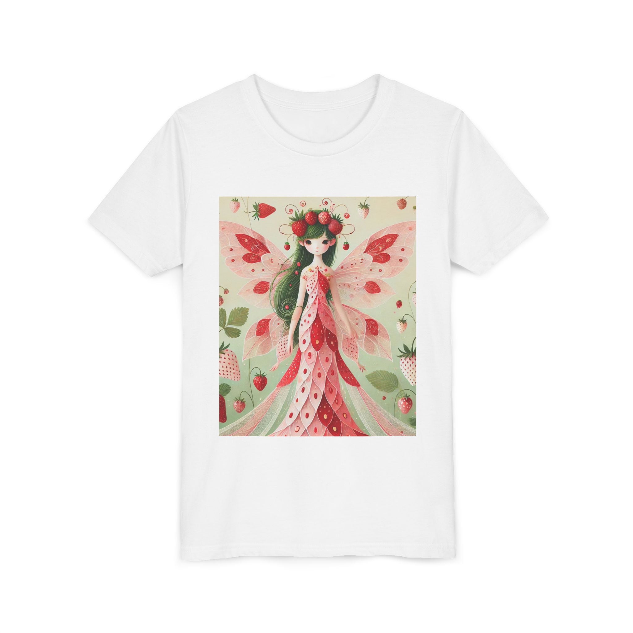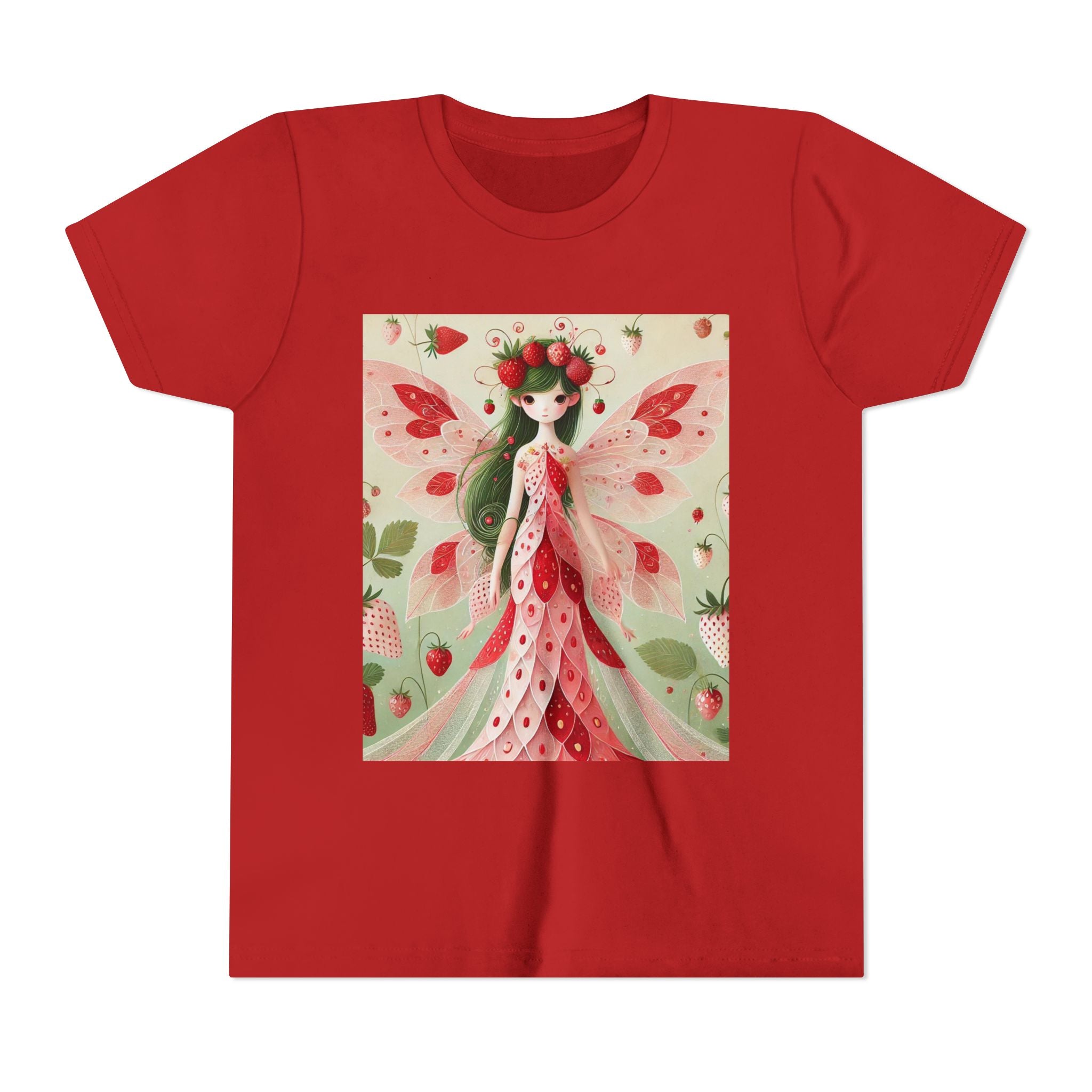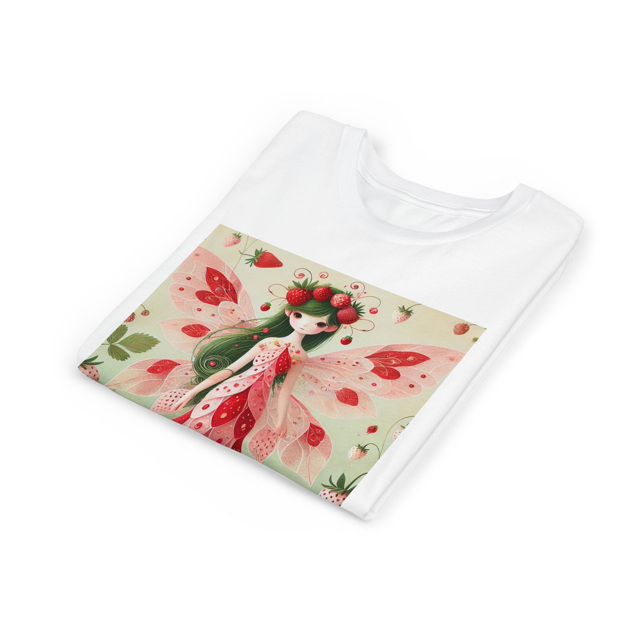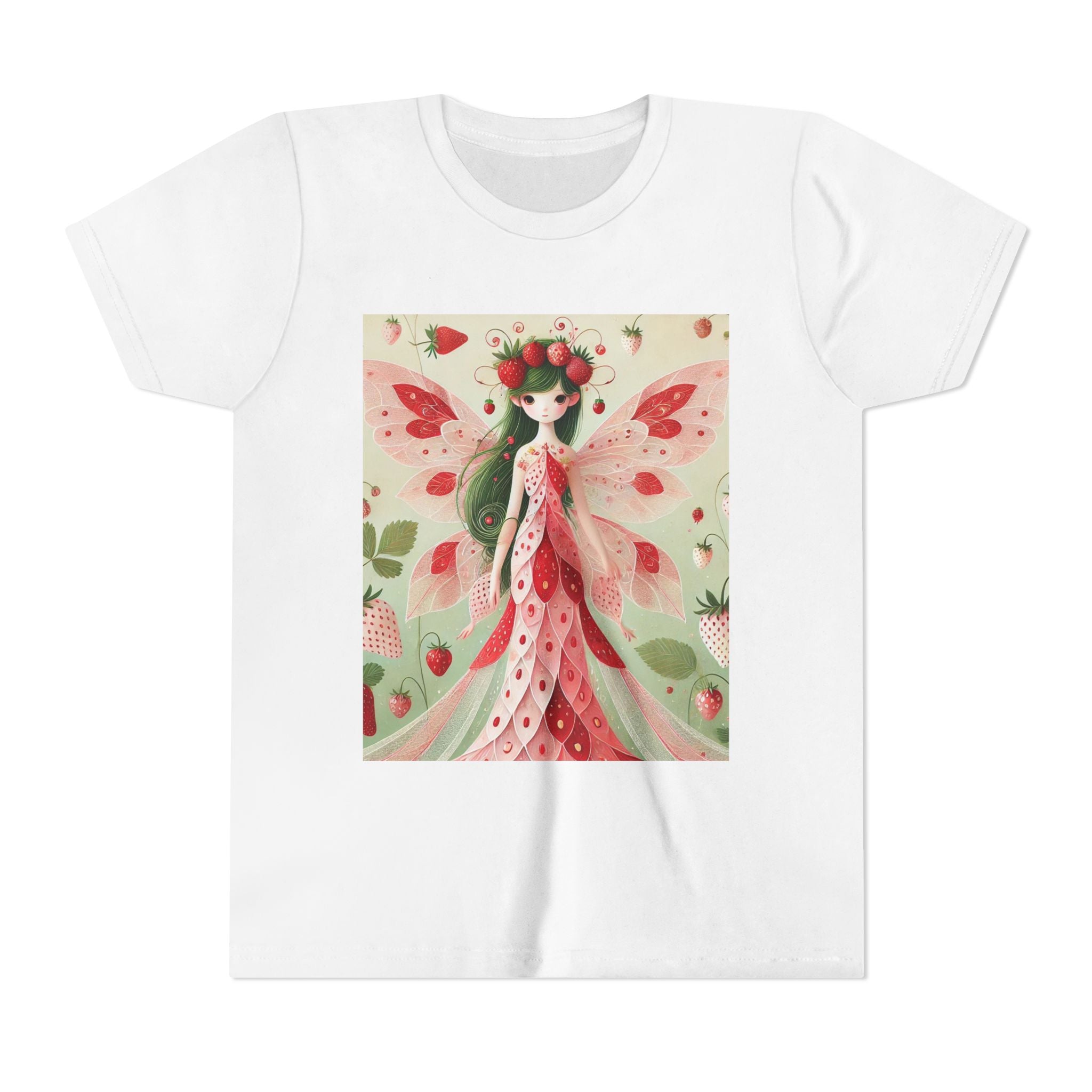 Let your child's imagination blossom with the Strawberry Fairy Delight Youth Short Sleeve Tee. This whimsical design features the enchanting Strawberry Fairy, adorned in a charming red and pink strawberry dress and a delicate crown of strawberries. Surrounded by wild strawberries and lush green leaves, she brings a magical touch of summer sweetness to every adventure. Perfect for little dreamers who love nature, fairytales, and fruity fun.