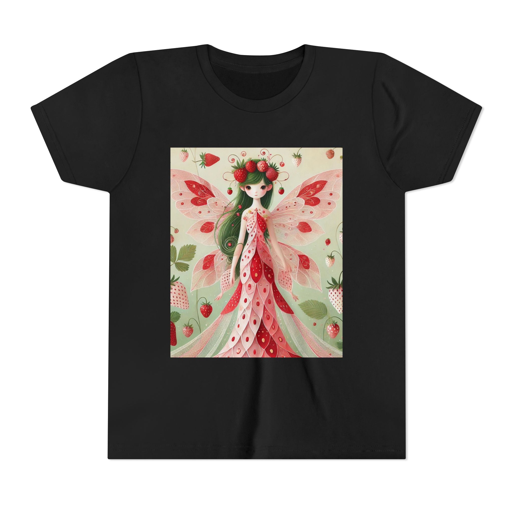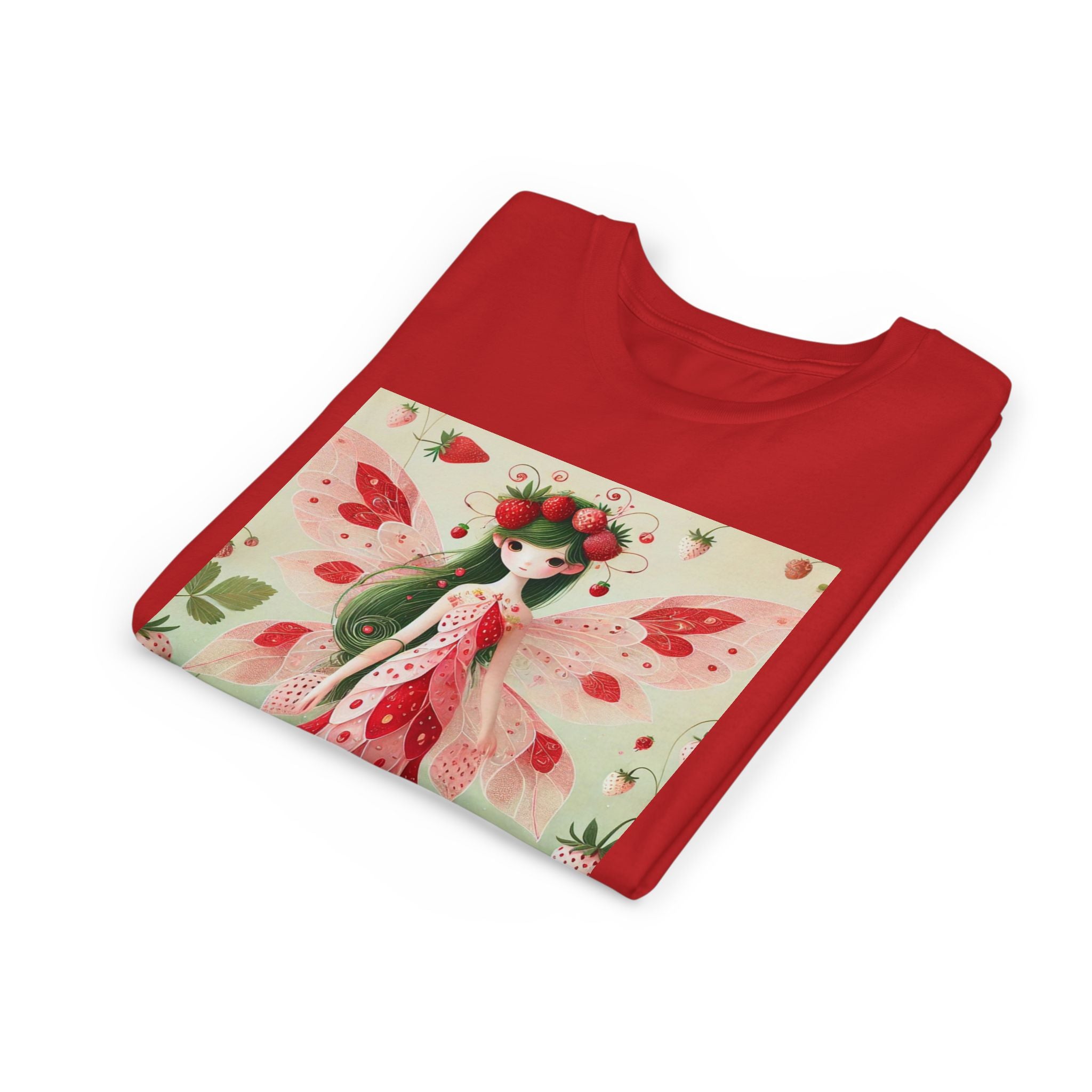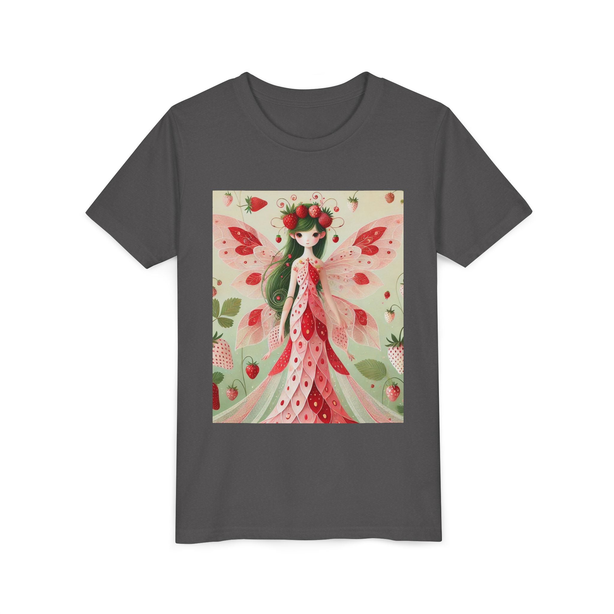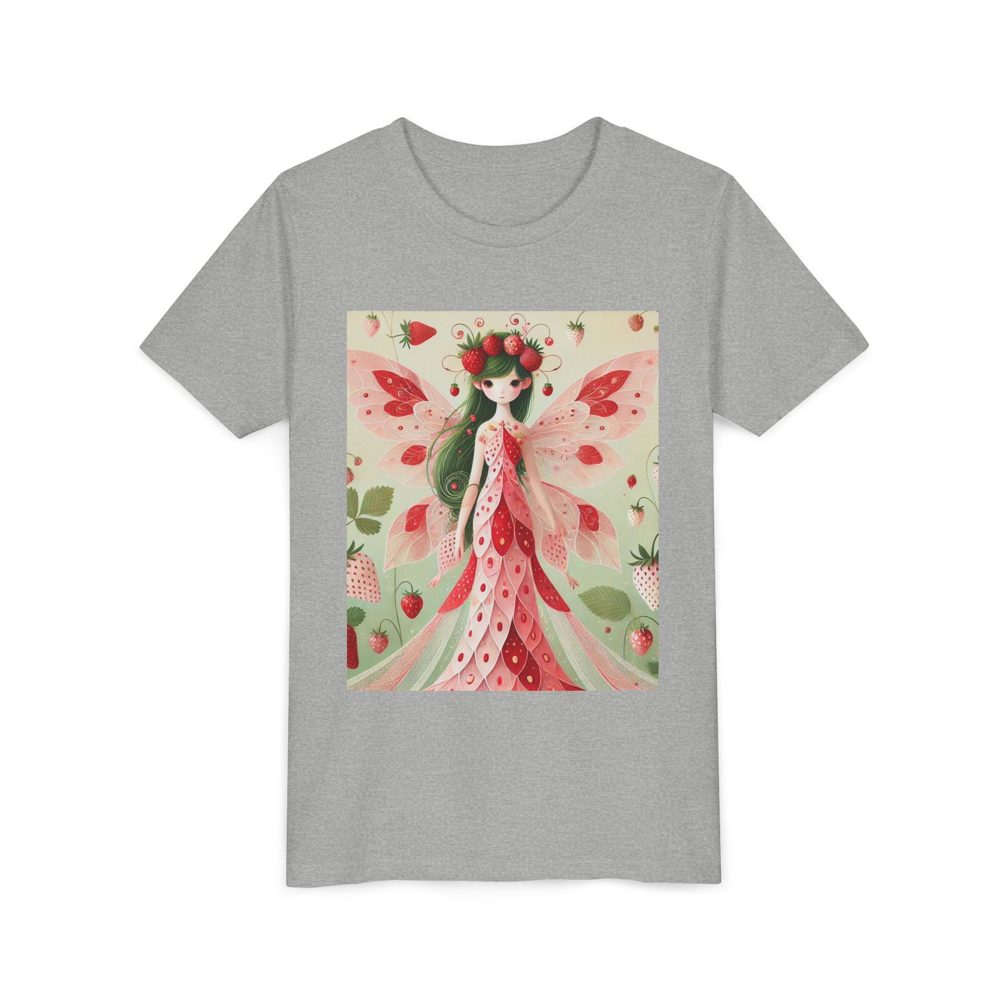 Let your child's imagination blossom with the Strawberry Fairy Delight Youth Short Sleeve Tee. This whimsical design features the enchanting Strawberry Fairy, adorned in a charming red and pink strawberry dress and a delicate crown of strawberries. Surrounded by wild strawberries and lush green leaves, she brings a magical touch of summer sweetness to every adventure. Perfect for little dreamers who love nature, fairytales, and fruity fun.