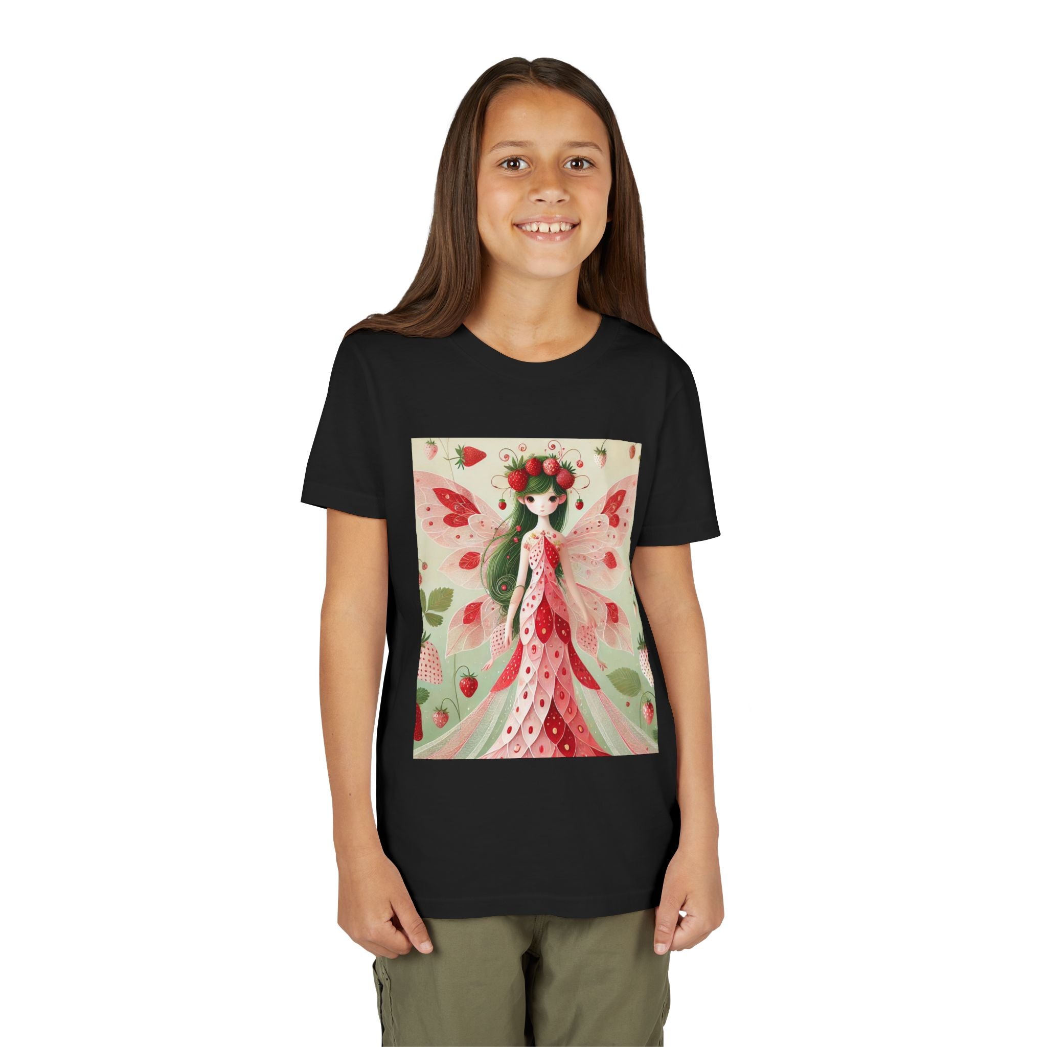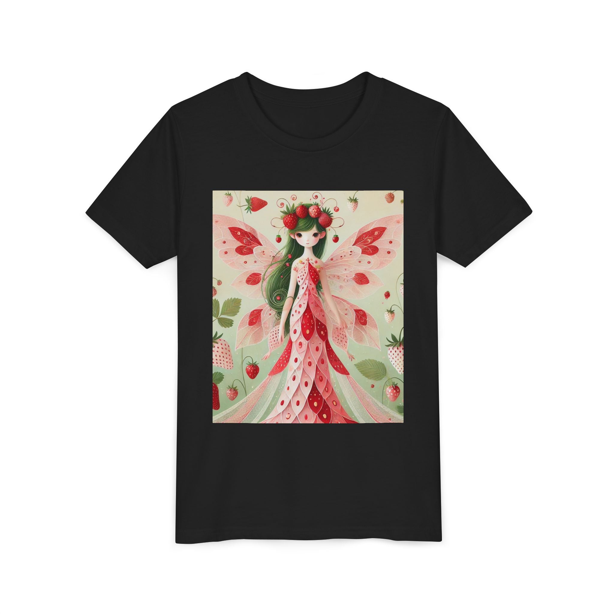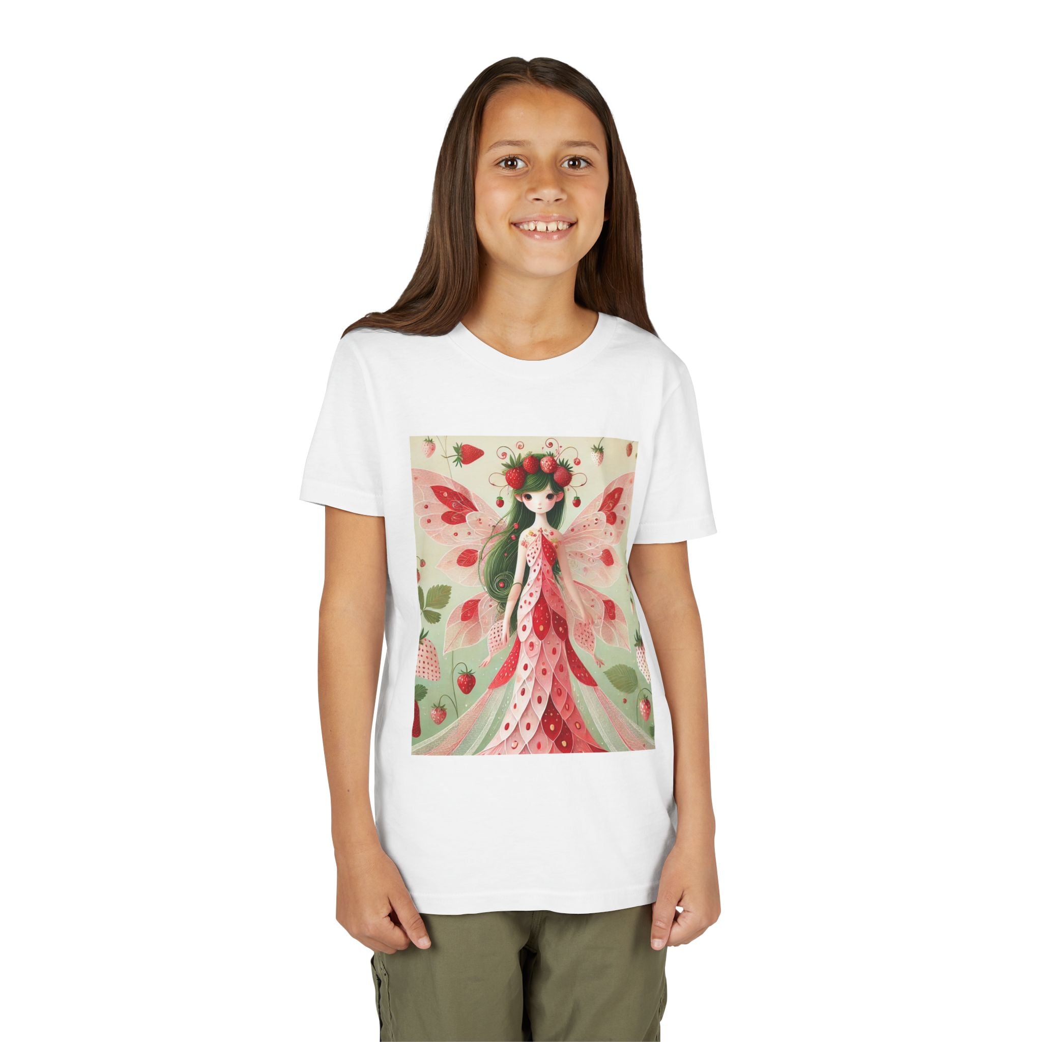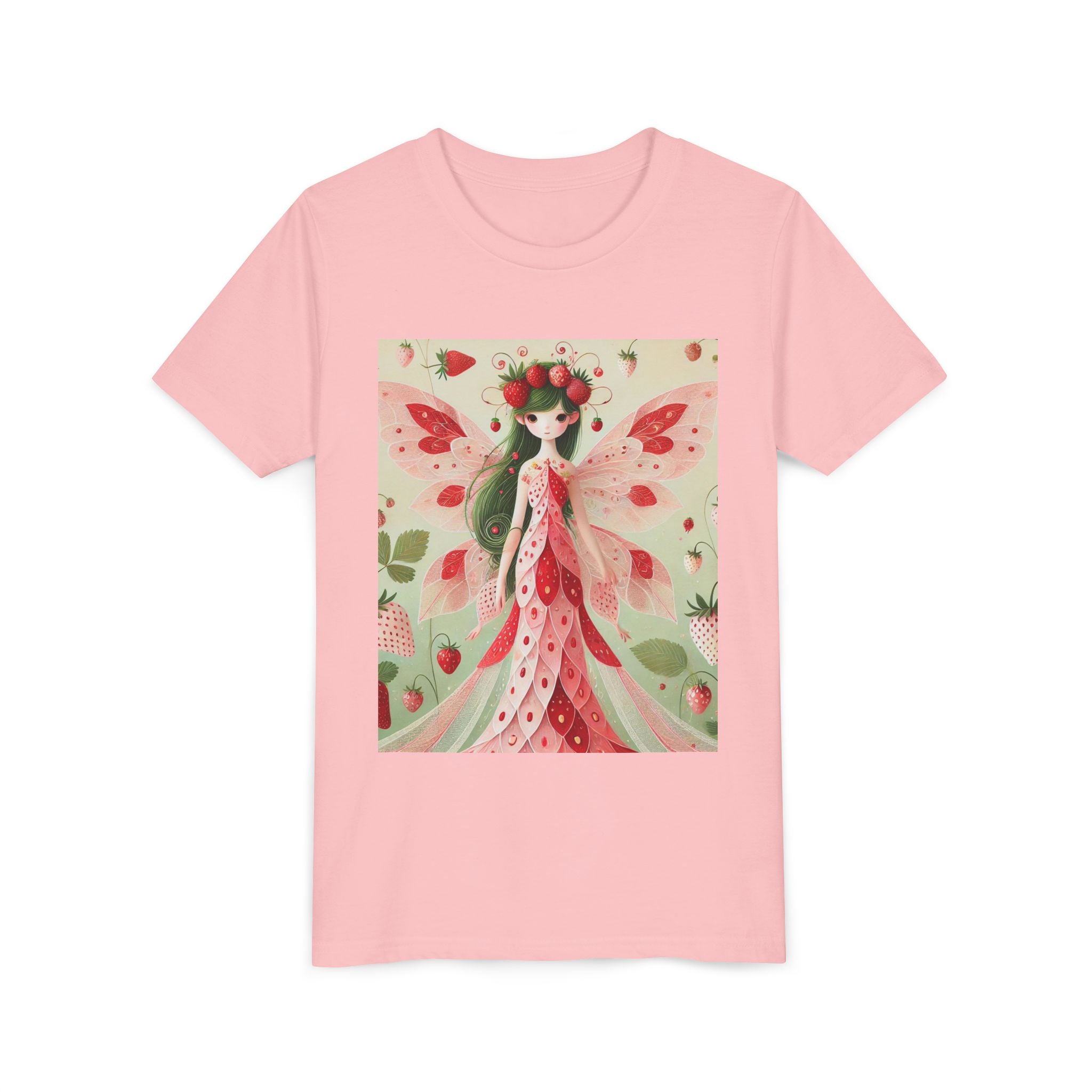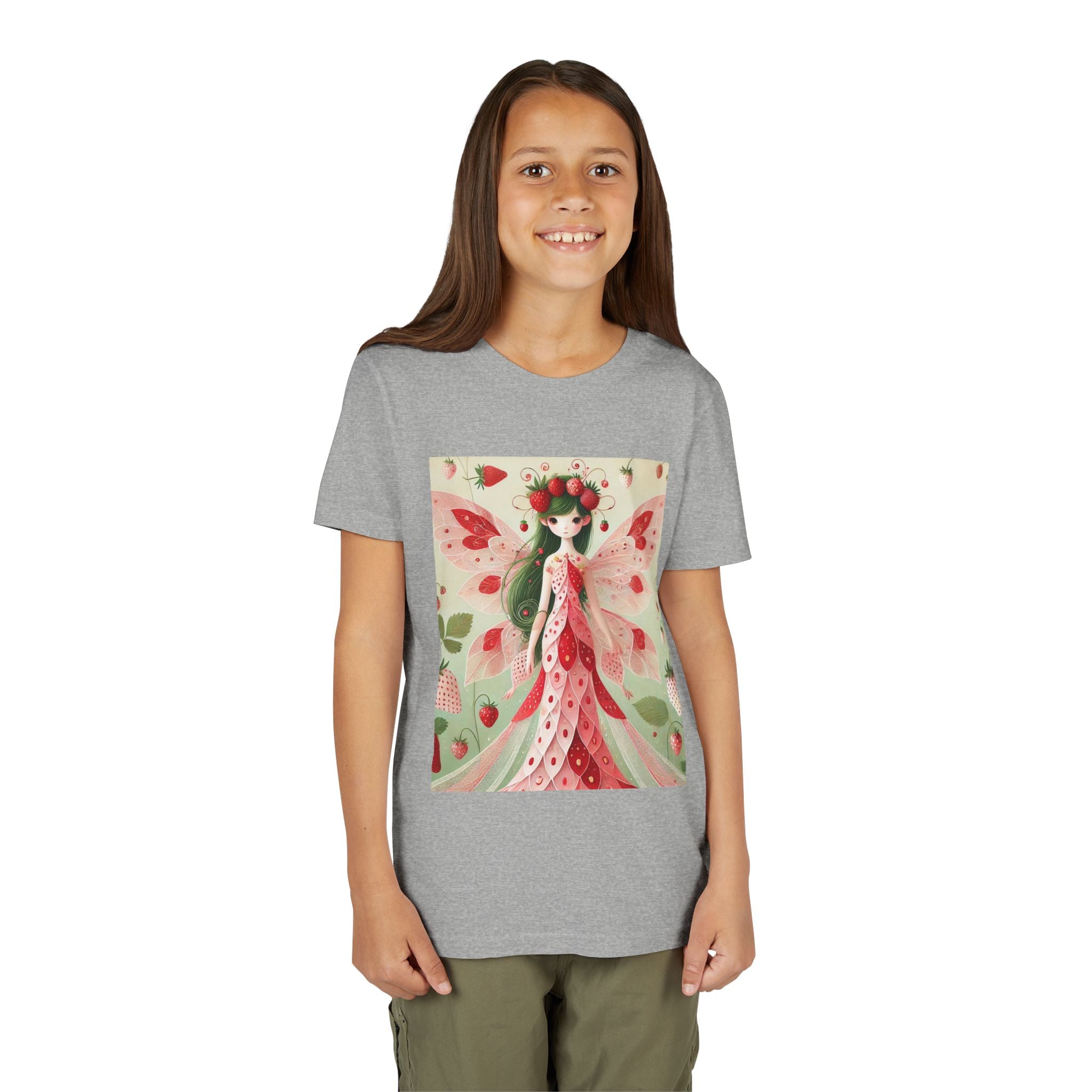 Let your child's imagination blossom with the Strawberry Fairy Delight Youth Short Sleeve Tee. This whimsical design features the enchanting Strawberry Fairy, adorned in a charming red and pink strawberry dress and a delicate crown of strawberries. Surrounded by wild strawberries and lush green leaves, she brings a magical touch of summer sweetness to every adventure. Perfect for little dreamers who love nature, fairytales, and fruity fun.