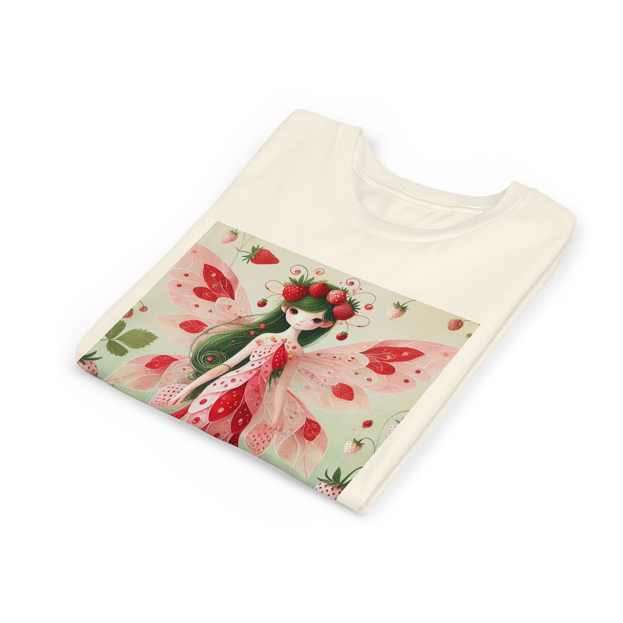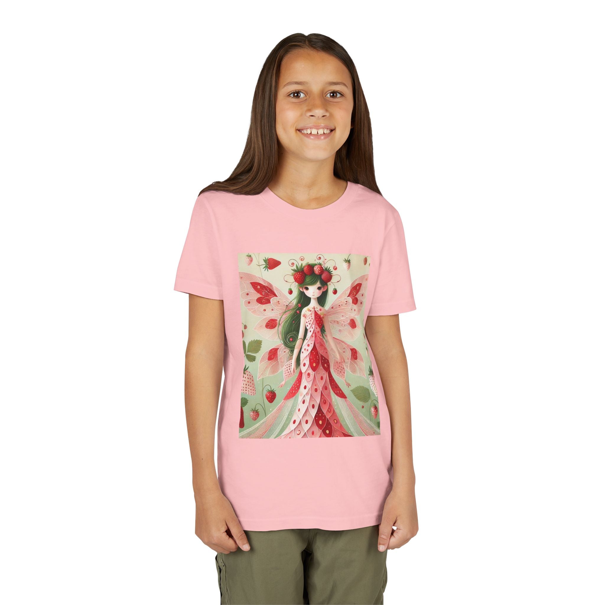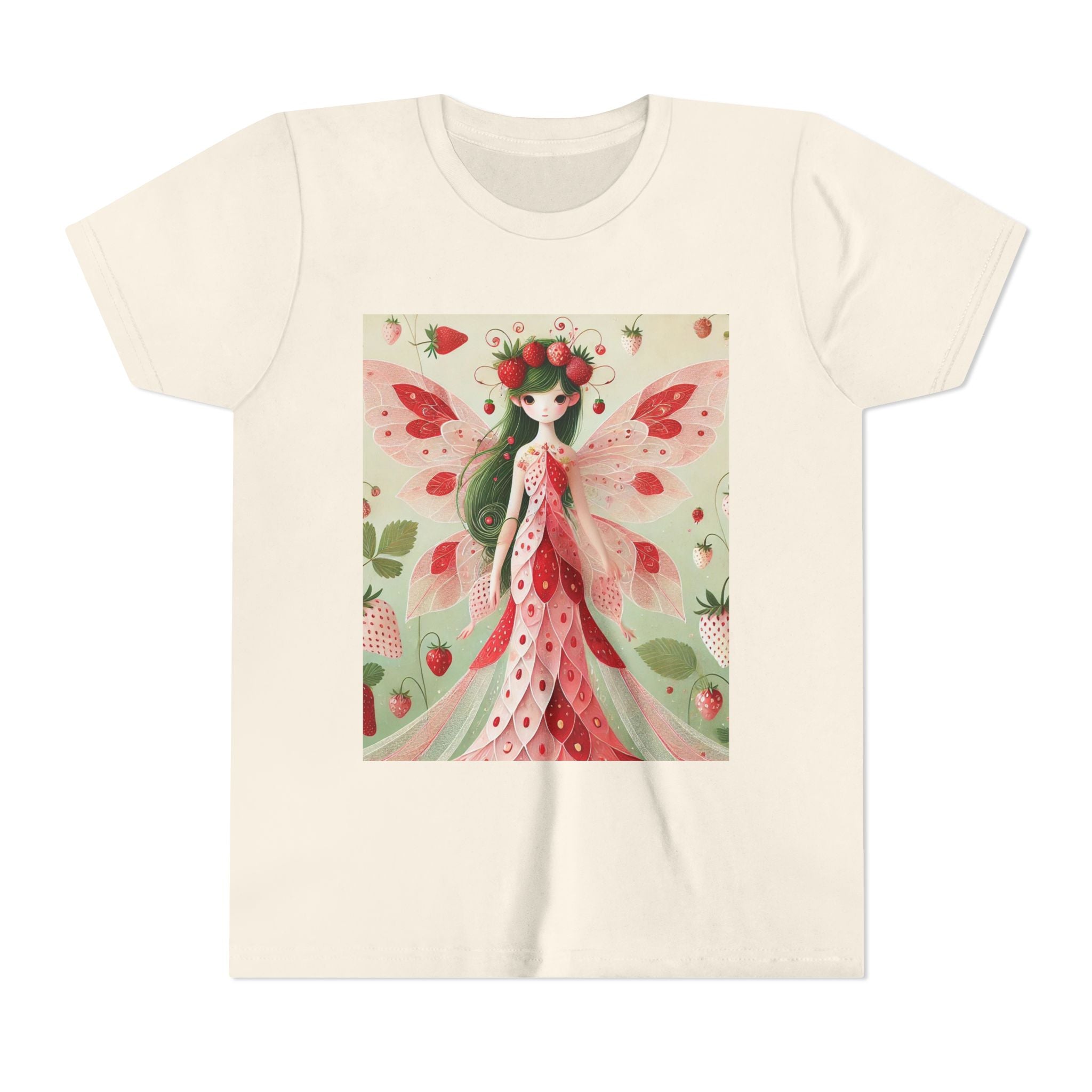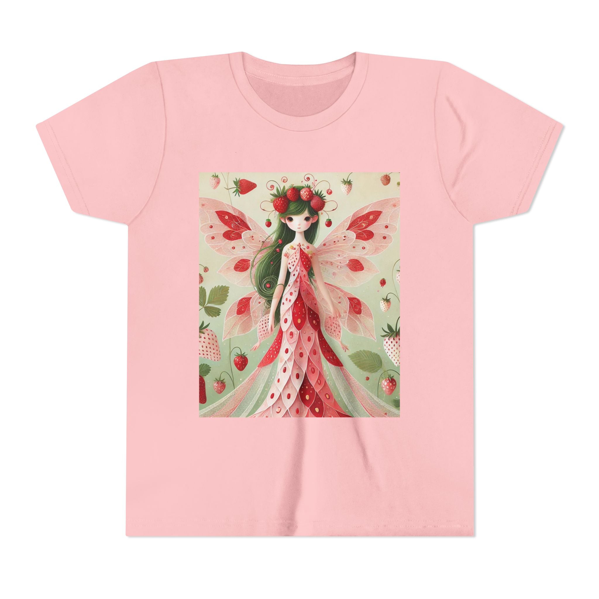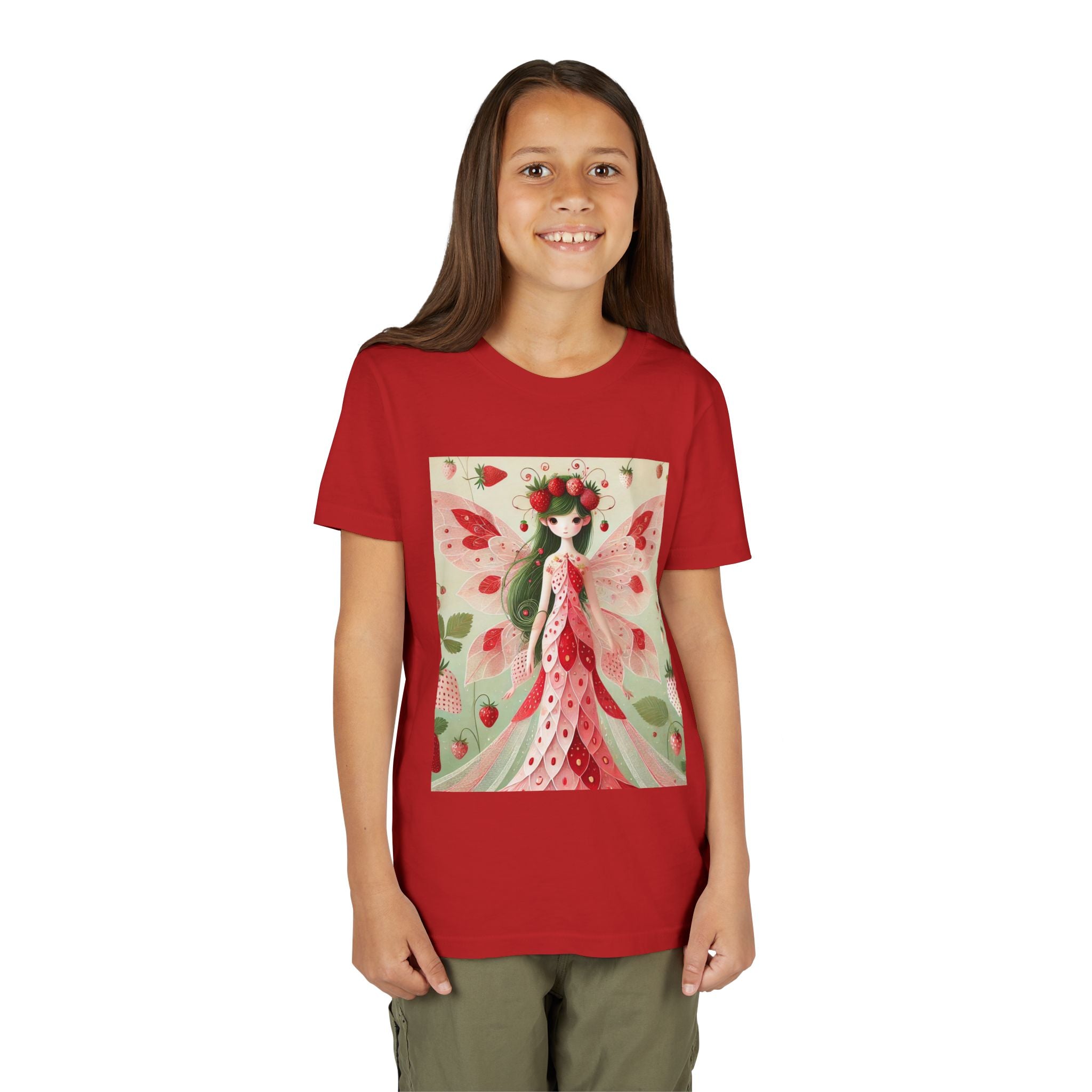 Let your child's imagination blossom with the Strawberry Fairy Delight Youth Short Sleeve Tee. This whimsical design features the enchanting Strawberry Fairy, adorned in a charming red and pink strawberry dress and a delicate crown of strawberries. Surrounded by wild strawberries and lush green leaves, she brings a magical touch of summer sweetness to every adventure. Perfect for little dreamers who love nature, fairytales, and fruity fun.