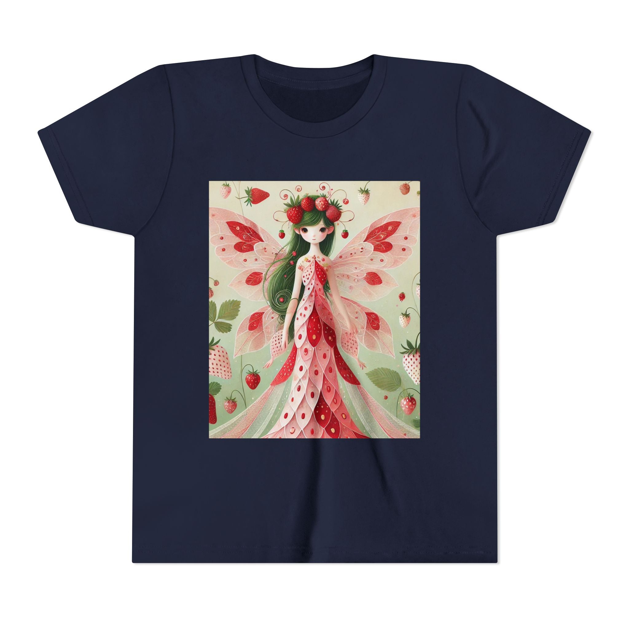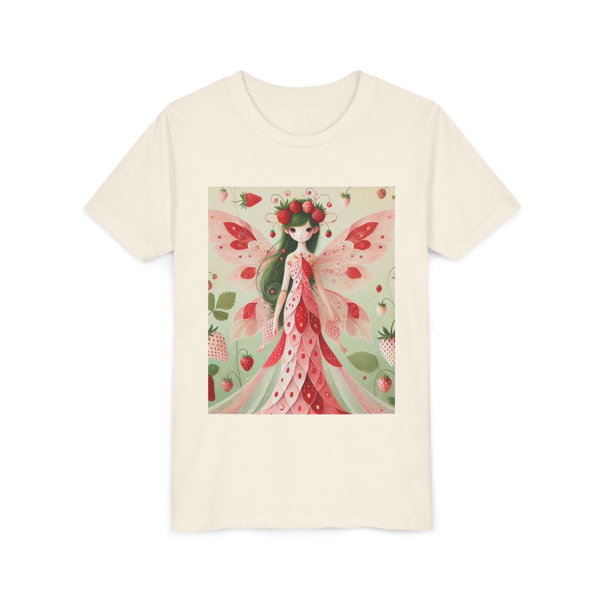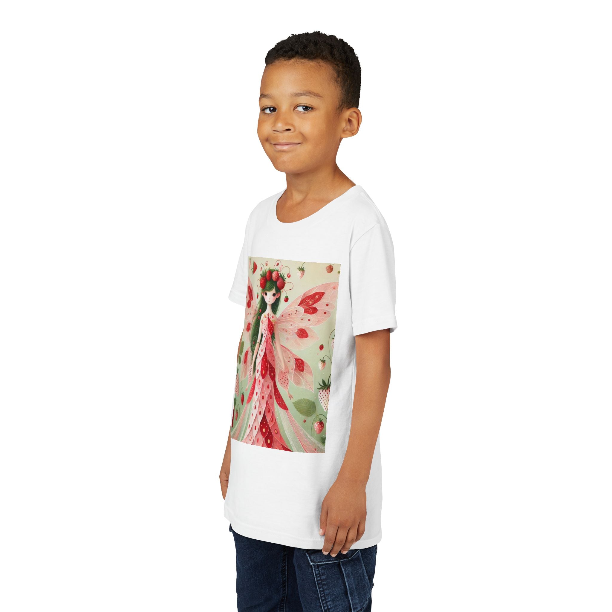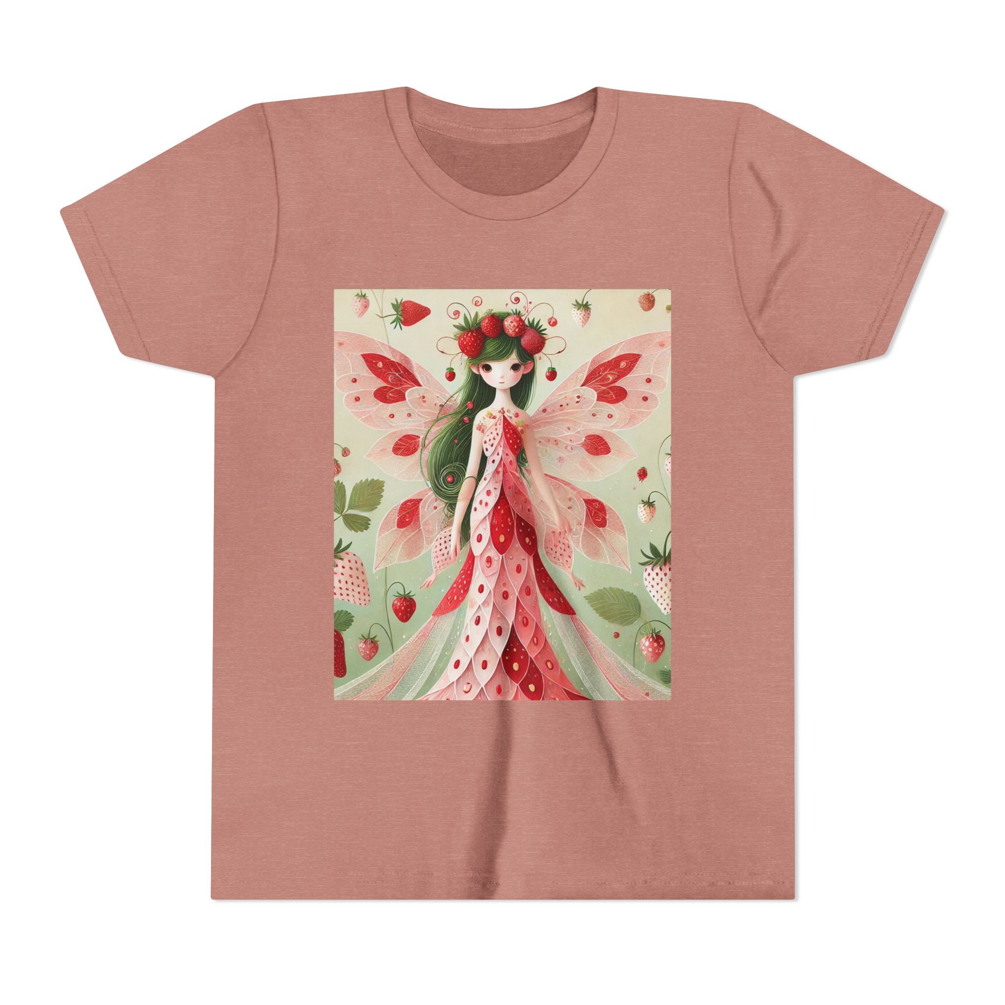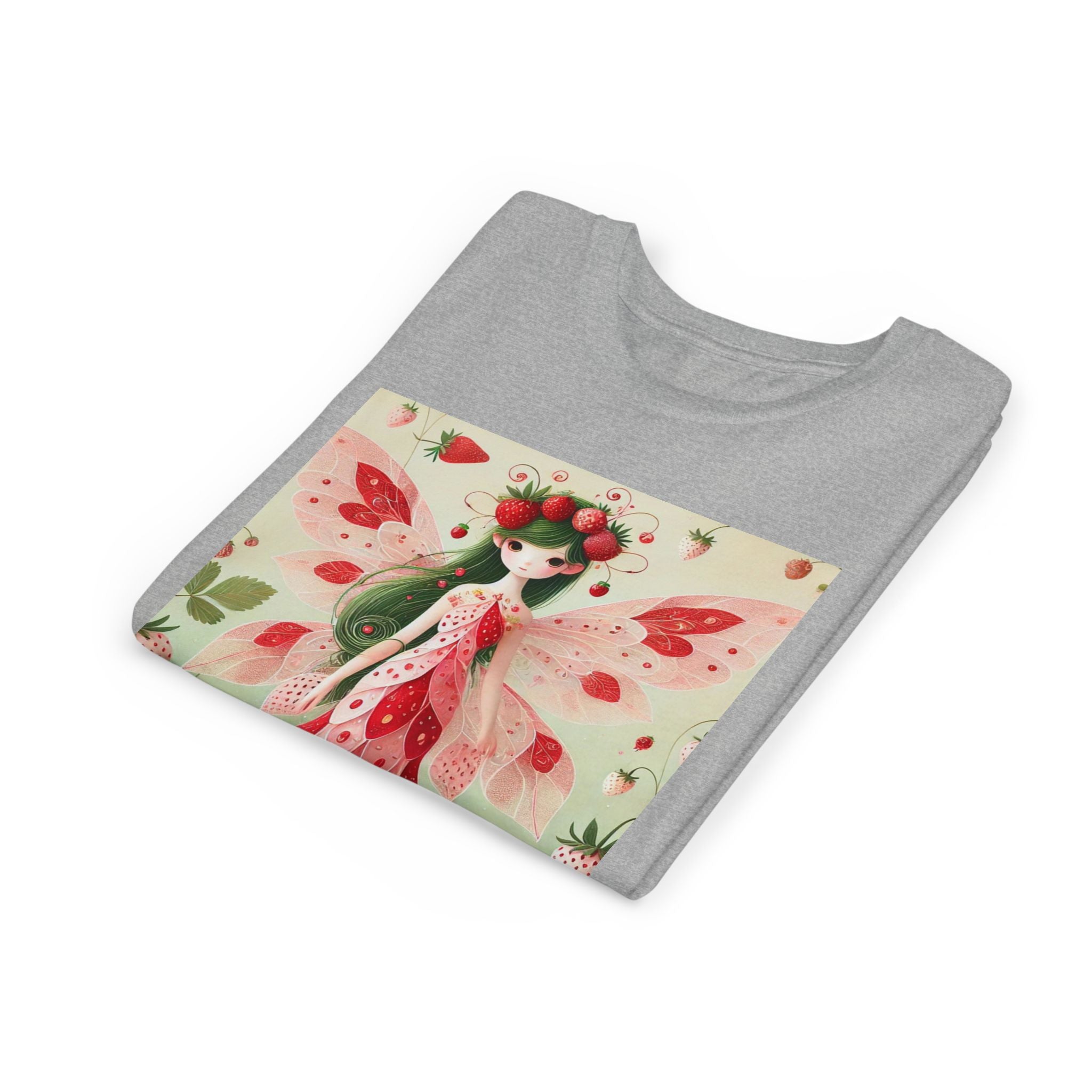 Let your child's imagination blossom with the Strawberry Fairy Delight Youth Short Sleeve Tee. This whimsical design features the enchanting Strawberry Fairy, adorned in a charming red and pink strawberry dress and a delicate crown of strawberries. Surrounded by wild strawberries and lush green leaves, she brings a magical touch of summer sweetness to every adventure. Perfect for little dreamers who love nature, fairytales, and fruity fun.