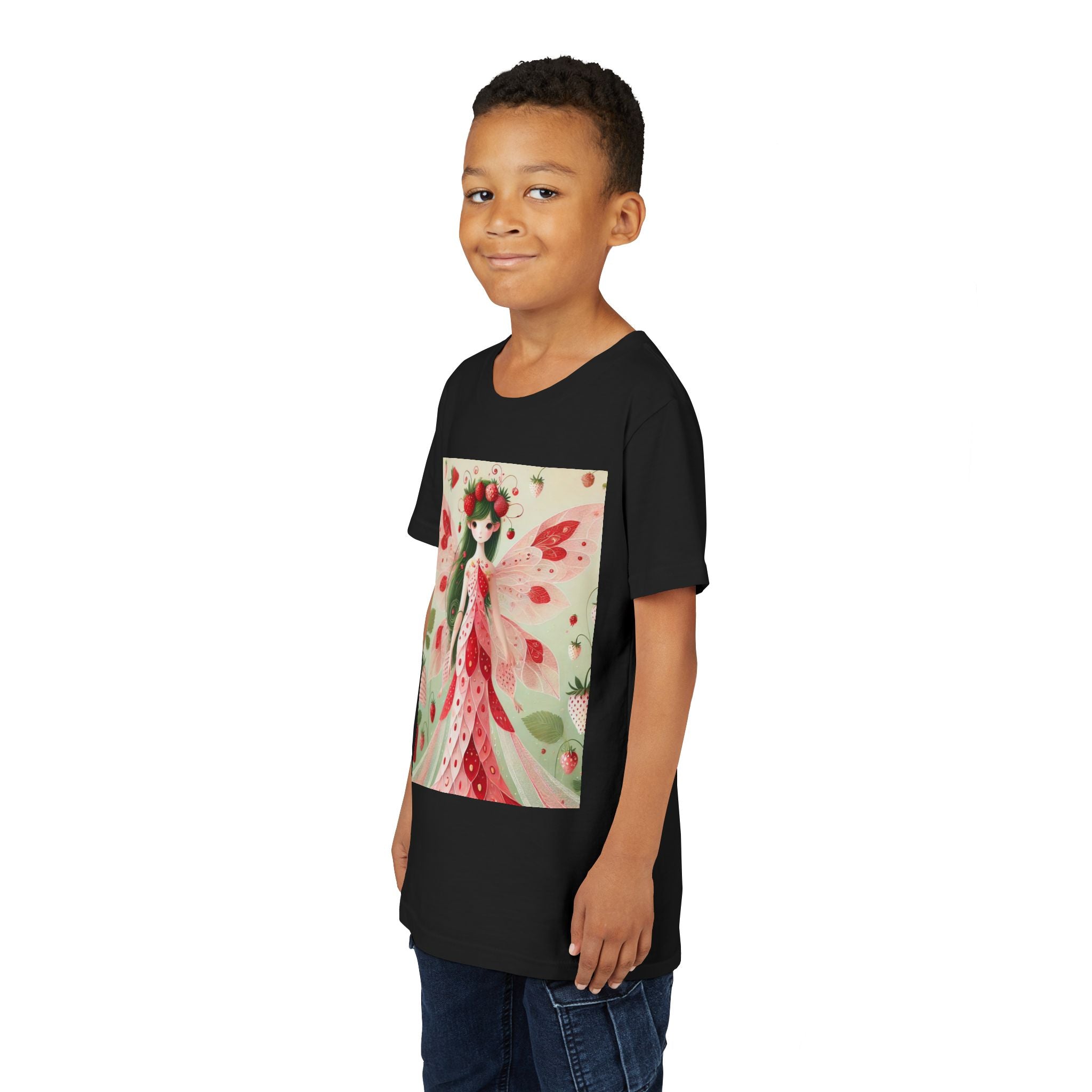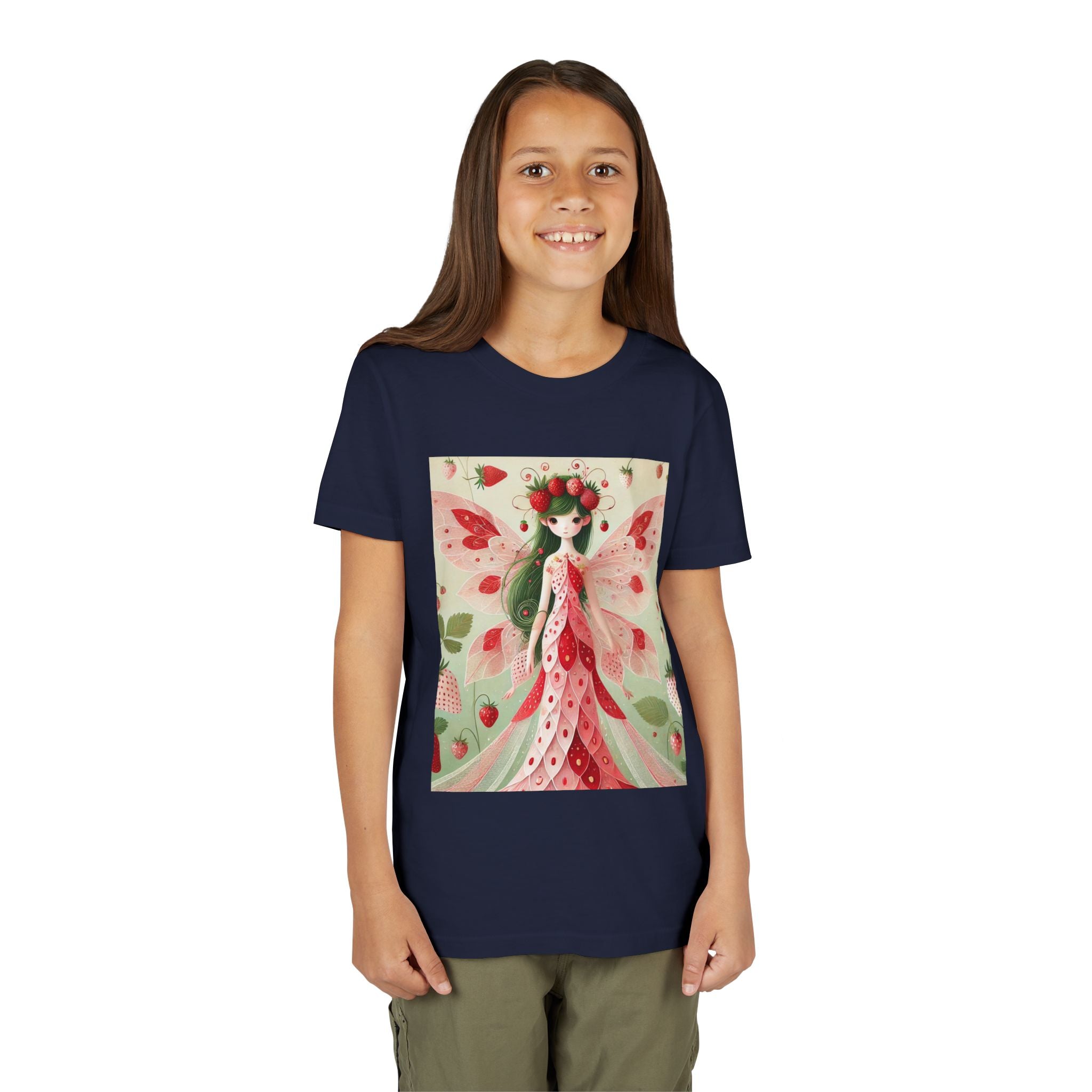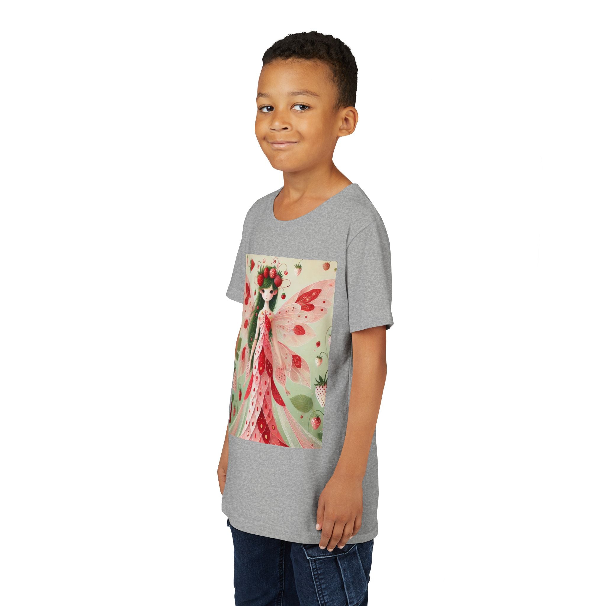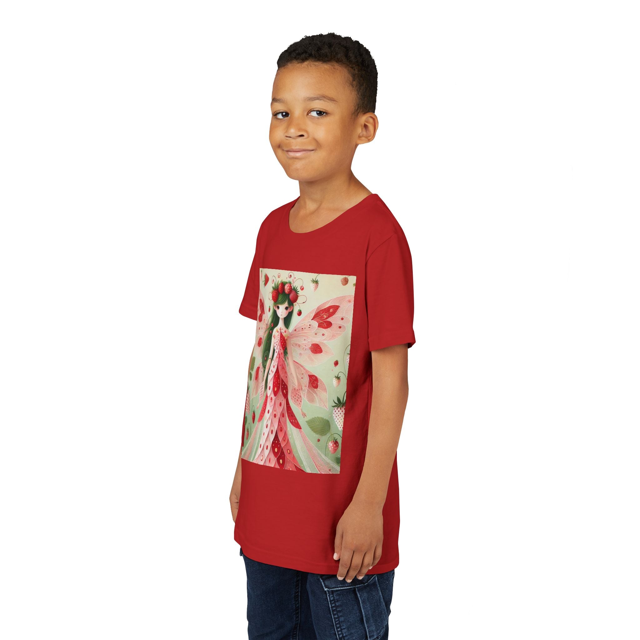 Let your child's imagination blossom with the Strawberry Fairy Delight Youth Short Sleeve Tee. This whimsical design features the enchanting Strawberry Fairy, adorned in a charming red and pink strawberry dress and a delicate crown of strawberries. Surrounded by wild strawberries and lush green leaves, she brings a magical touch of summer sweetness to every adventure. Perfect for little dreamers who love nature, fairytales, and fruity fun.