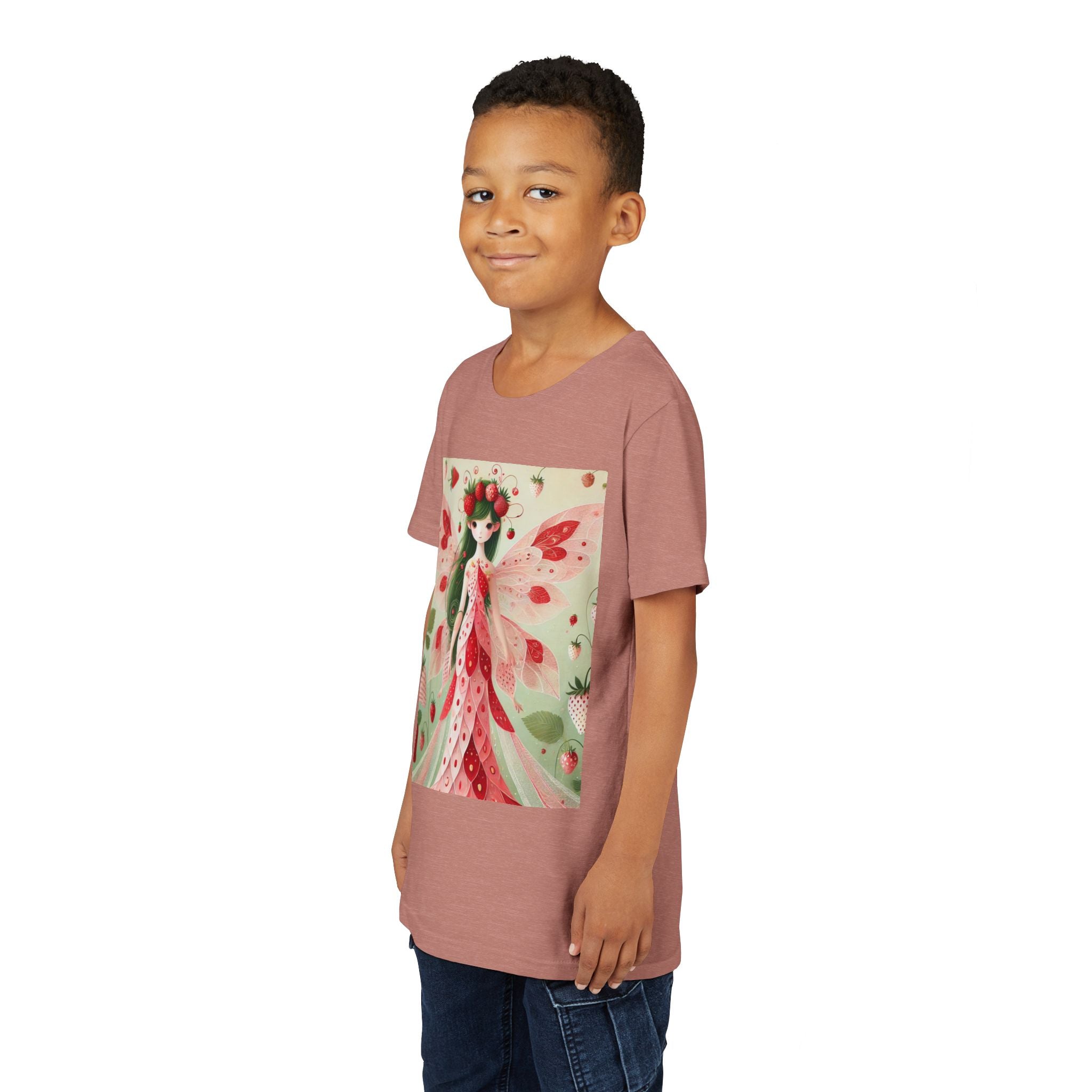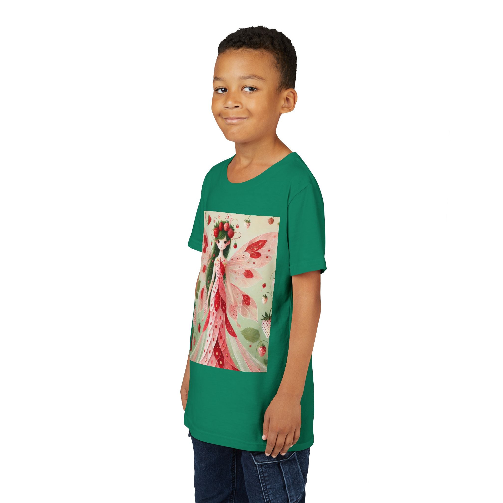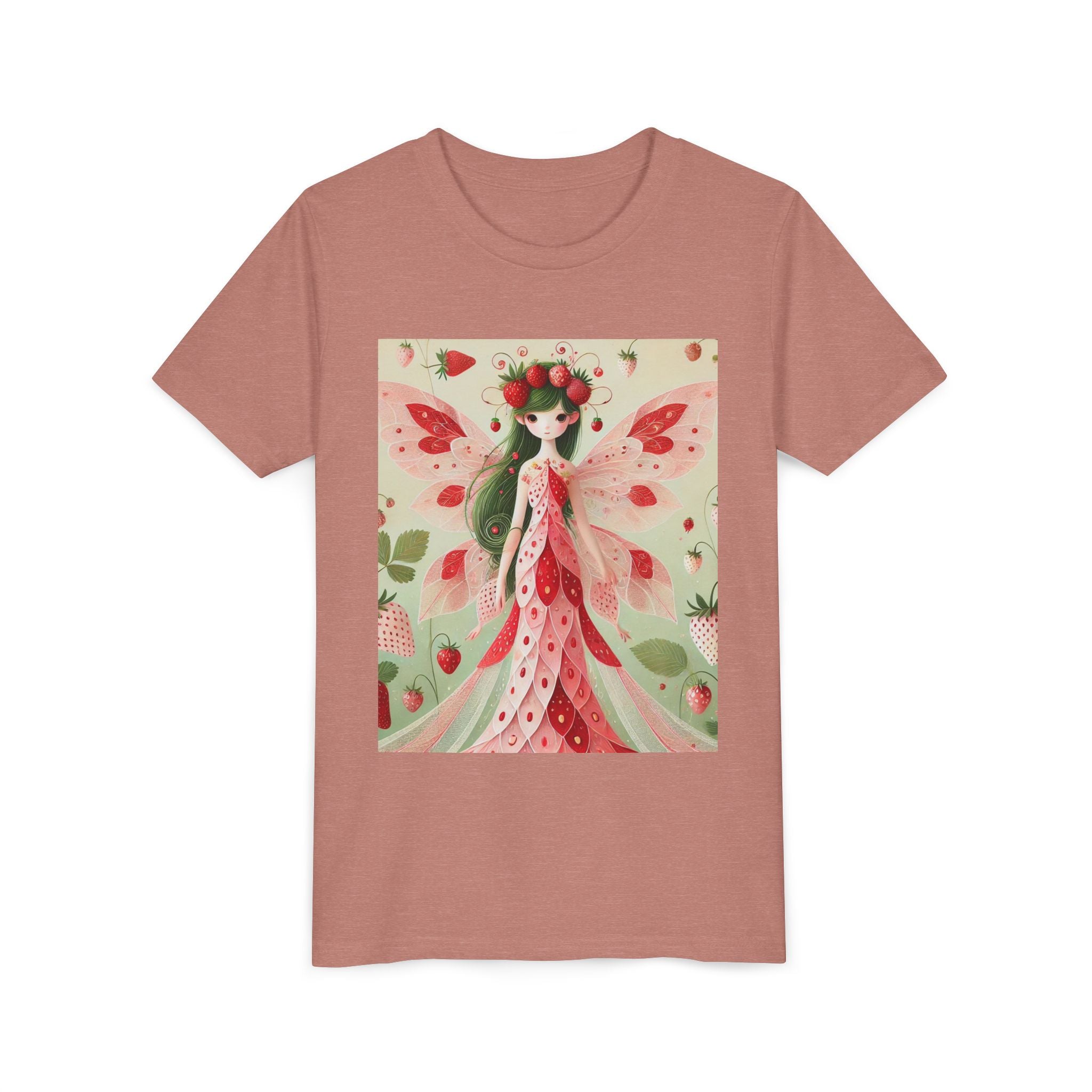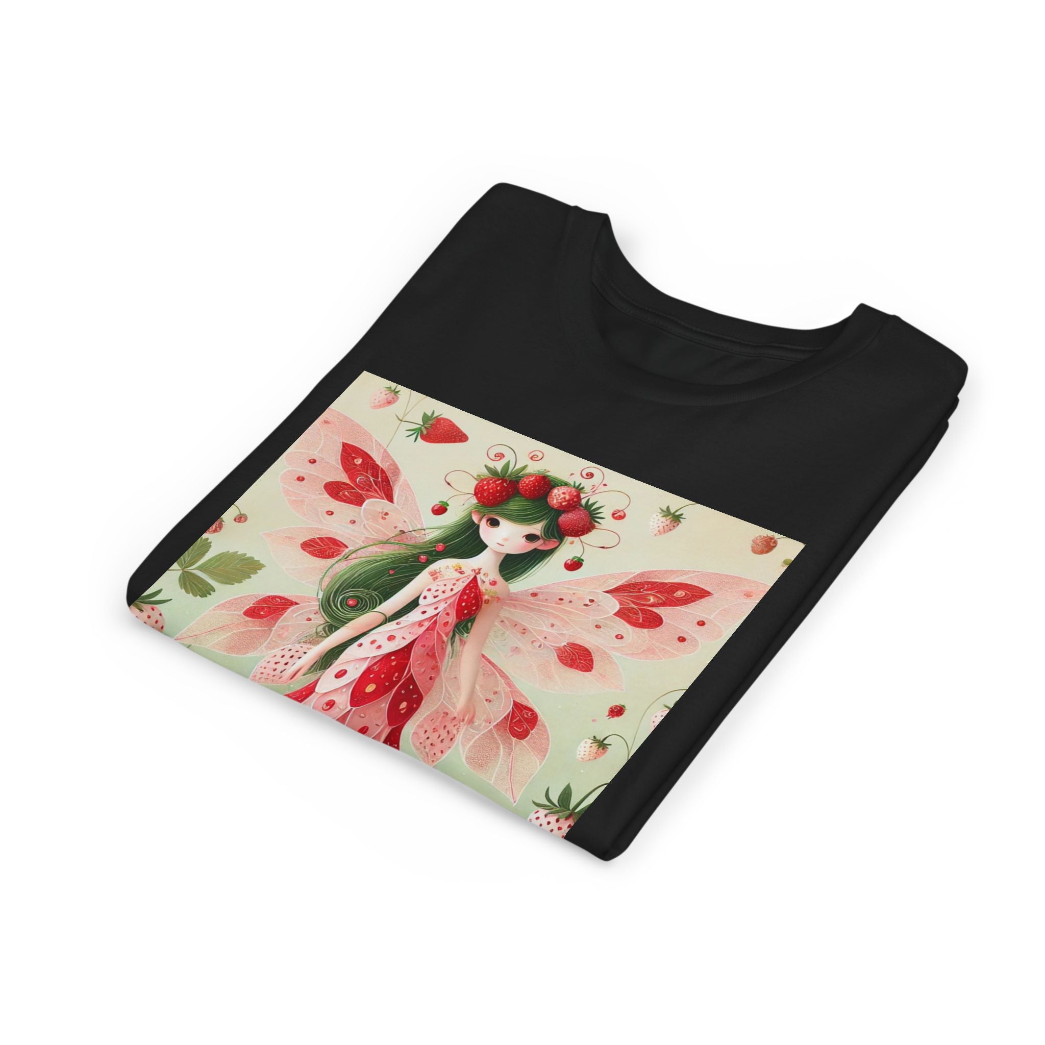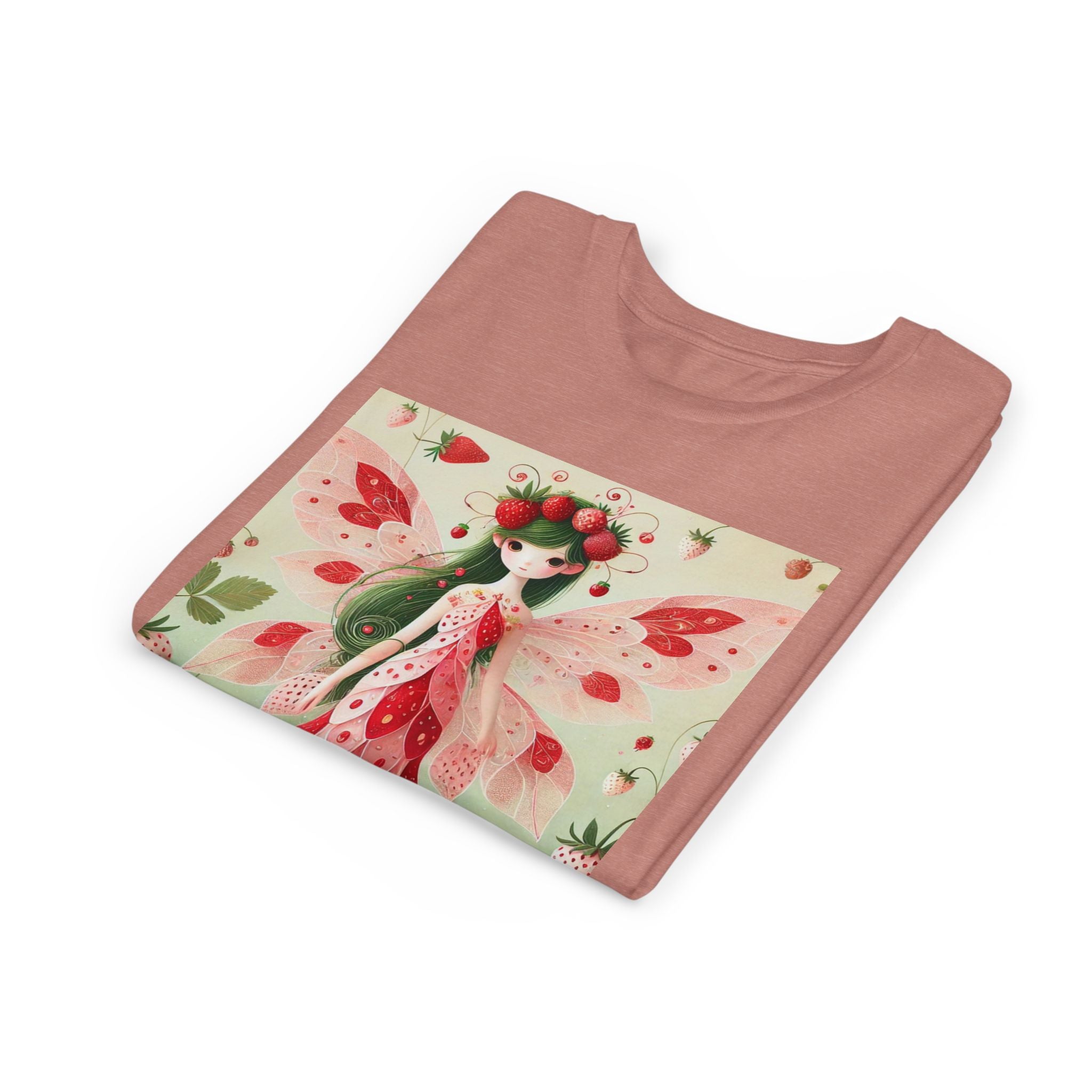 Let your child's imagination blossom with the Strawberry Fairy Delight Youth Short Sleeve Tee. This whimsical design features the enchanting Strawberry Fairy, adorned in a charming red and pink strawberry dress and a delicate crown of strawberries. Surrounded by wild strawberries and lush green leaves, she brings a magical touch of summer sweetness to every adventure. Perfect for little dreamers who love nature, fairytales, and fruity fun.