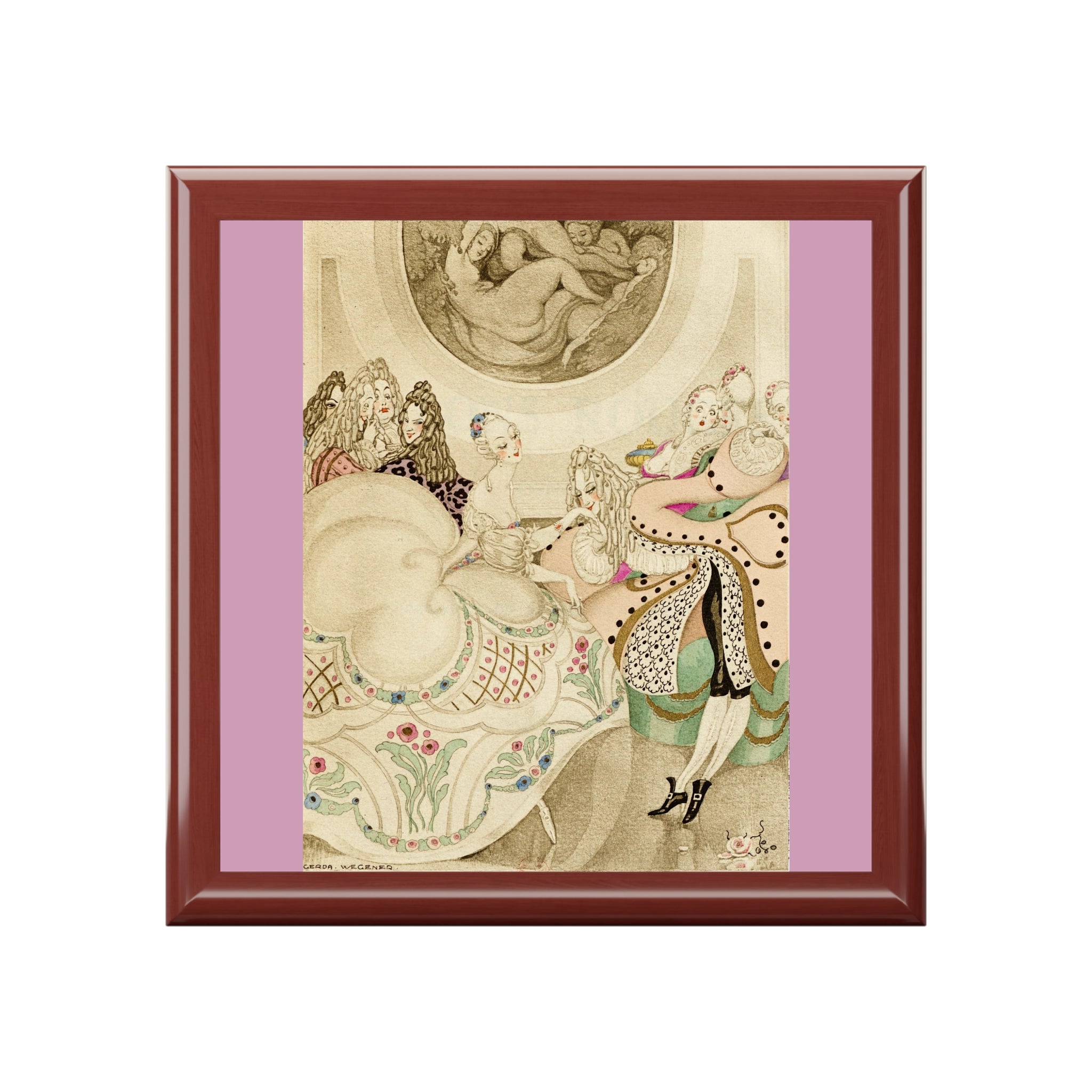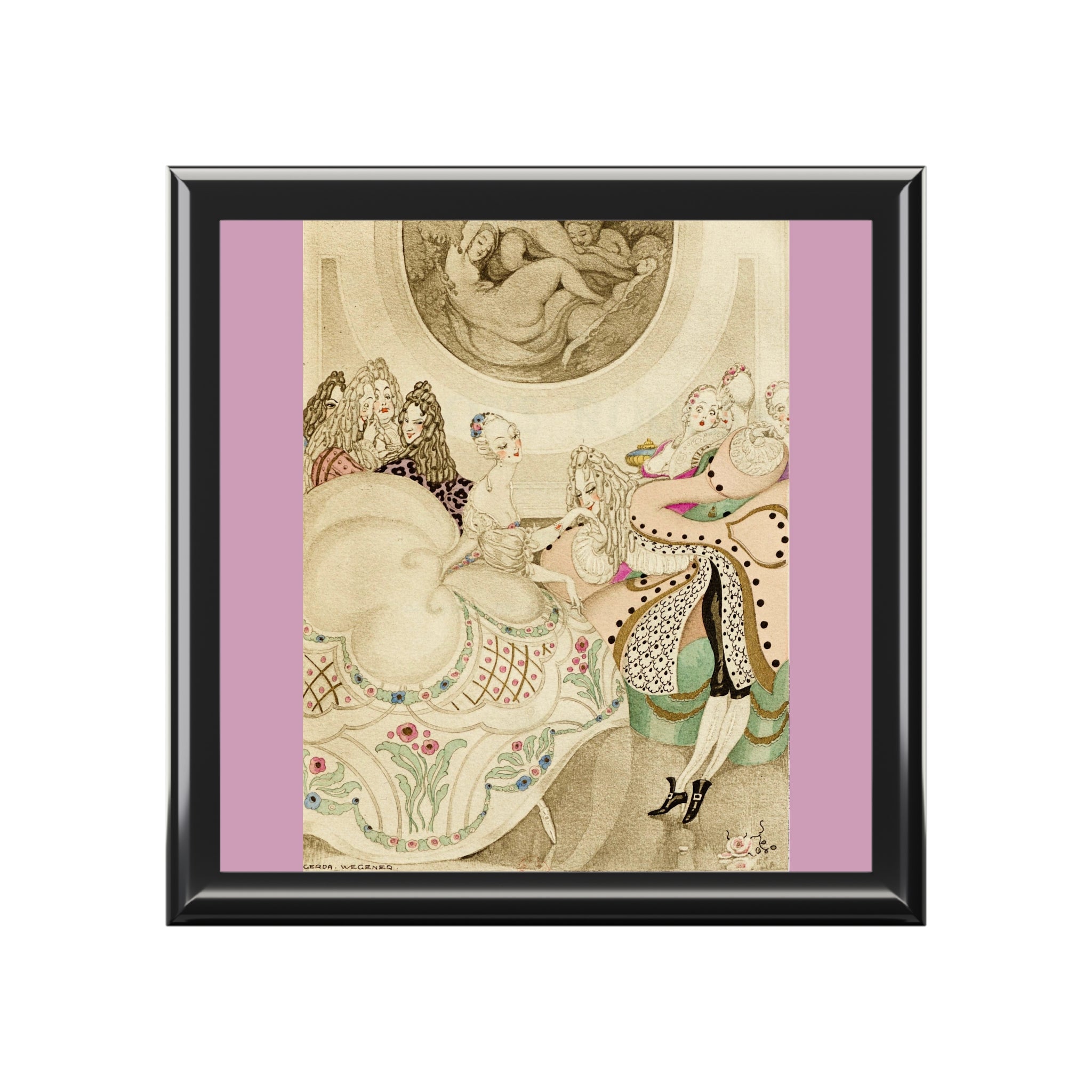 Artwork designed and digitally remastered by Sarasvati Designs. "Sur talons rouges pl 01" (“His Entrance was Sensational”) by Gerda Wegener is a captivating artwork that serves as one of the visual accompaniments to Éric Allatini's novel of the same name. The novel "Sur talons rouges" takes readers on a romantic journey set in eighteenth-century France. It cleverly exaggerates the language, fashion, and overall atmosphere of the time, playing with the French fascination for the “galante” style. It is within this context that Gerda Wegener's twelve illustrations shine, seamlessly blending her own artistic prowess with a pastiche of engravings from France's romantic past. Wegener's skillful technique recreates the flourishes and intricacies of traditional engravings, transporting viewers to a bygone era of opulence and romance.