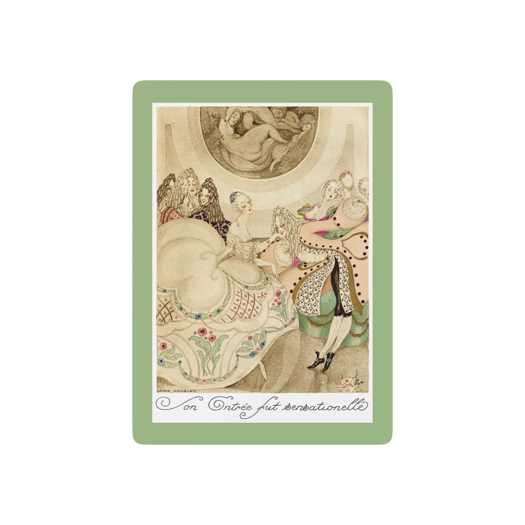 The featured artwork, Sur talons rouges pl 01 (“His Entrance was Sensational”) by Gerda Wegener, is a captivating piece that serves as one of the visual accompaniments to Éric Allatini's novel of the same name. Set in eighteenth-century France, the novel playfully exaggerates the fashion, language, and charm of the era. Wegener’s twelve illustrations, including this one, merge artistic elegance with a romantic pastiche of classic French engravings. Her refined technique evokes opulence and whimsy, drawing viewers into a world of vintage splendor and theatrical romance.
