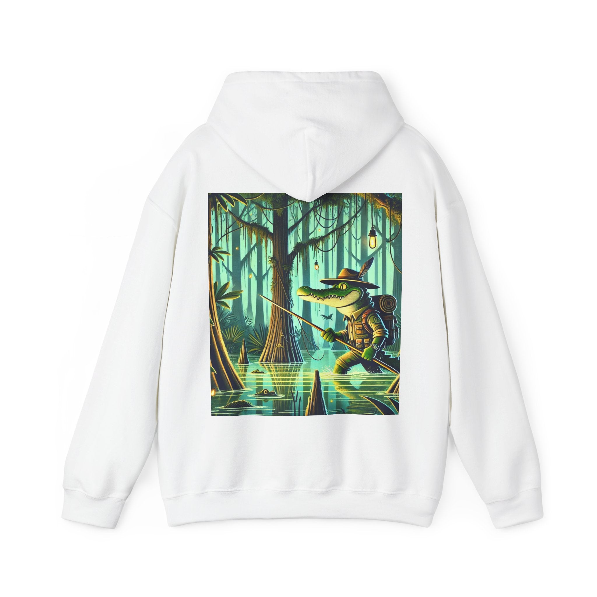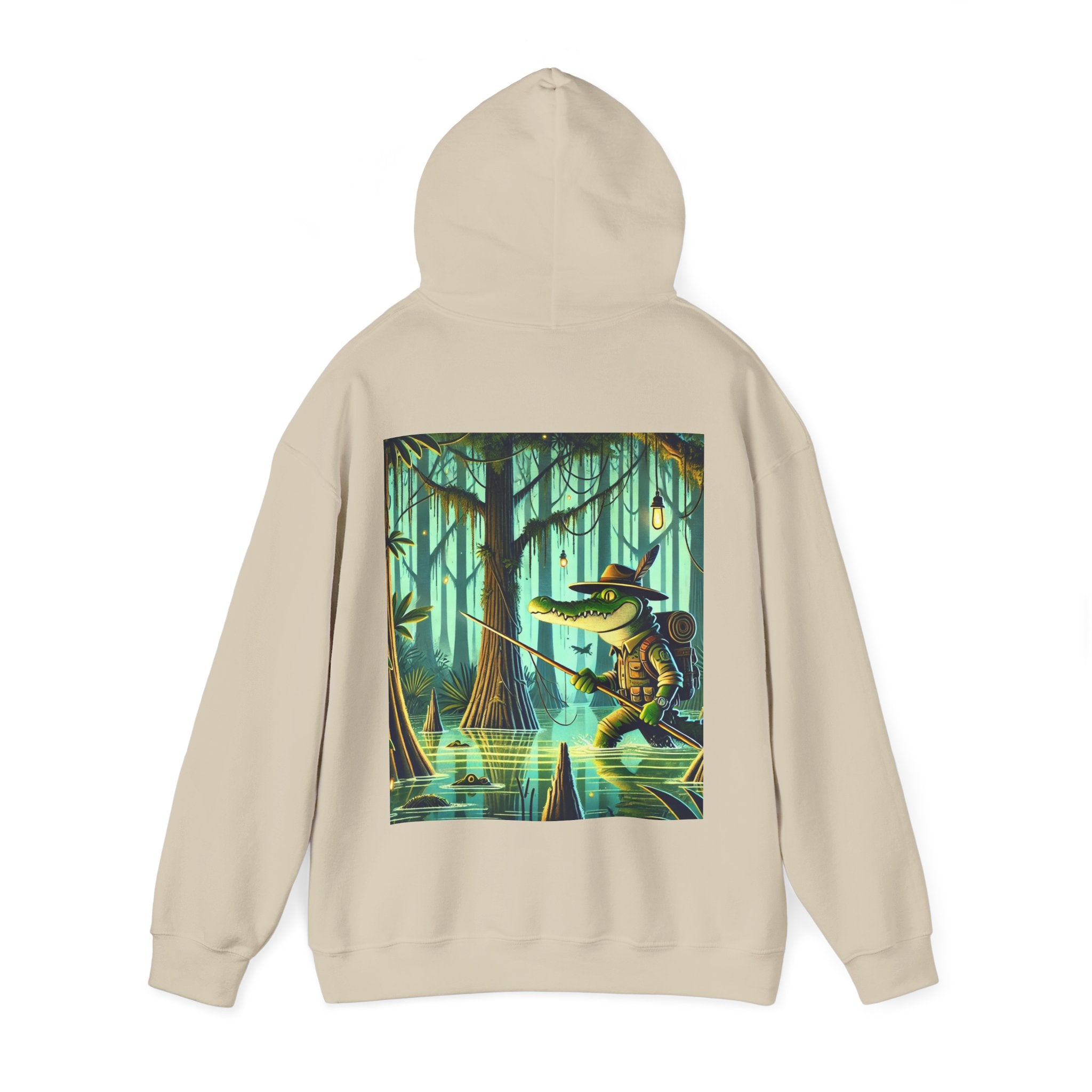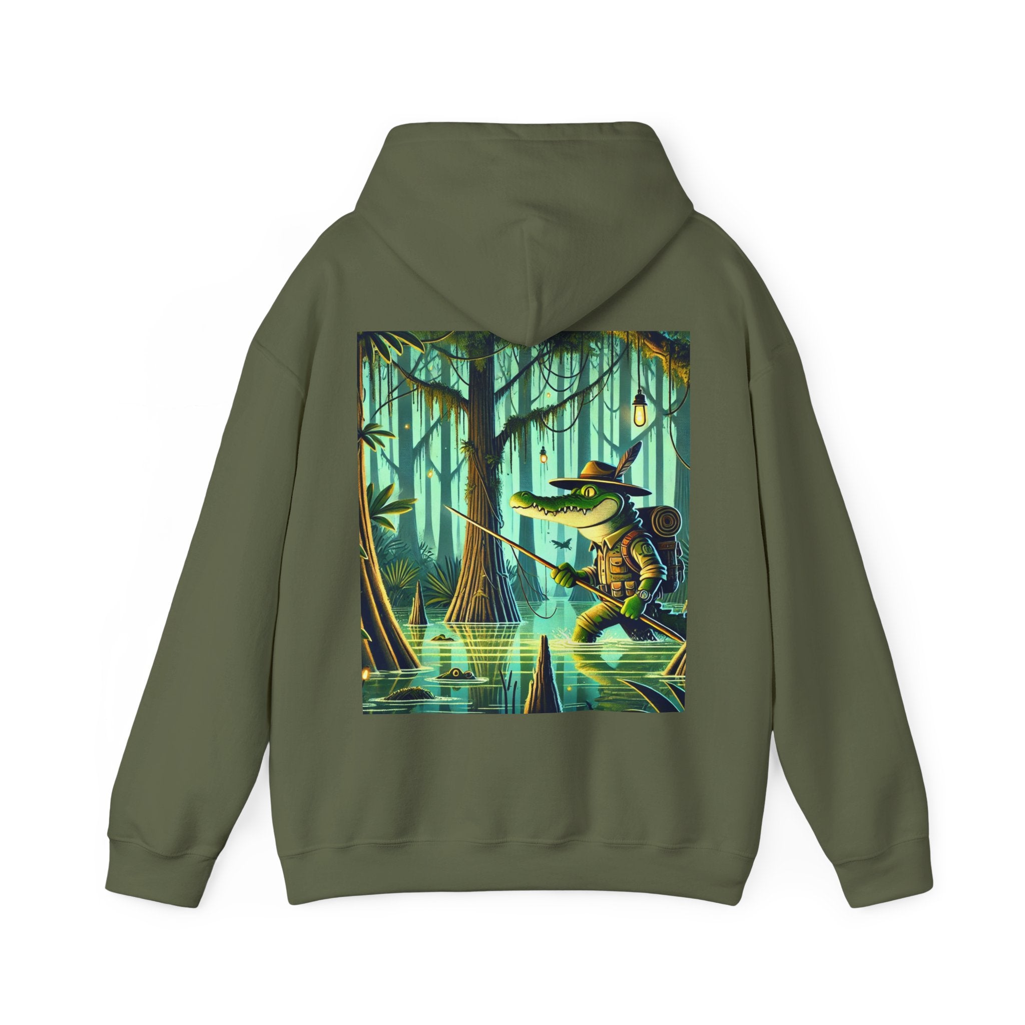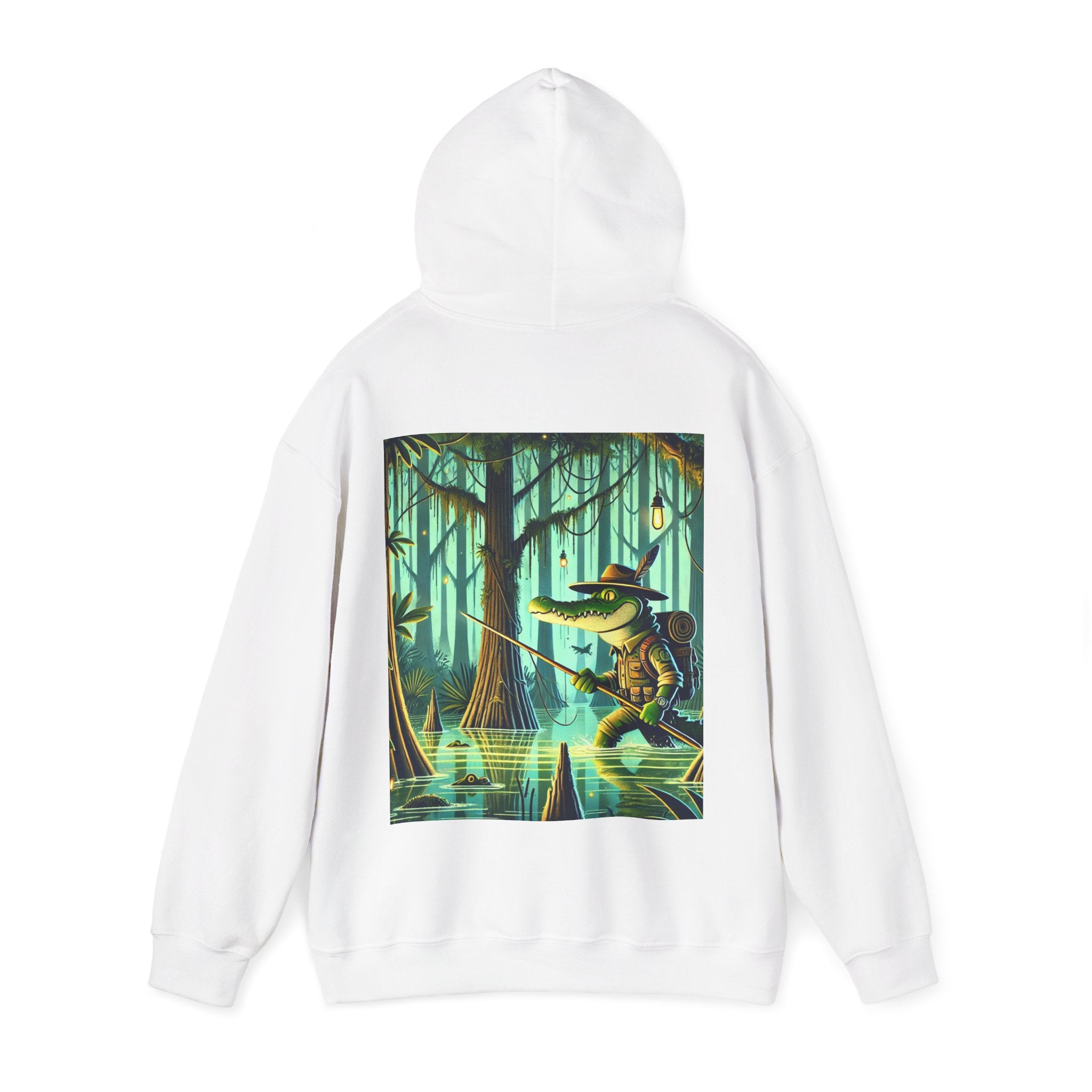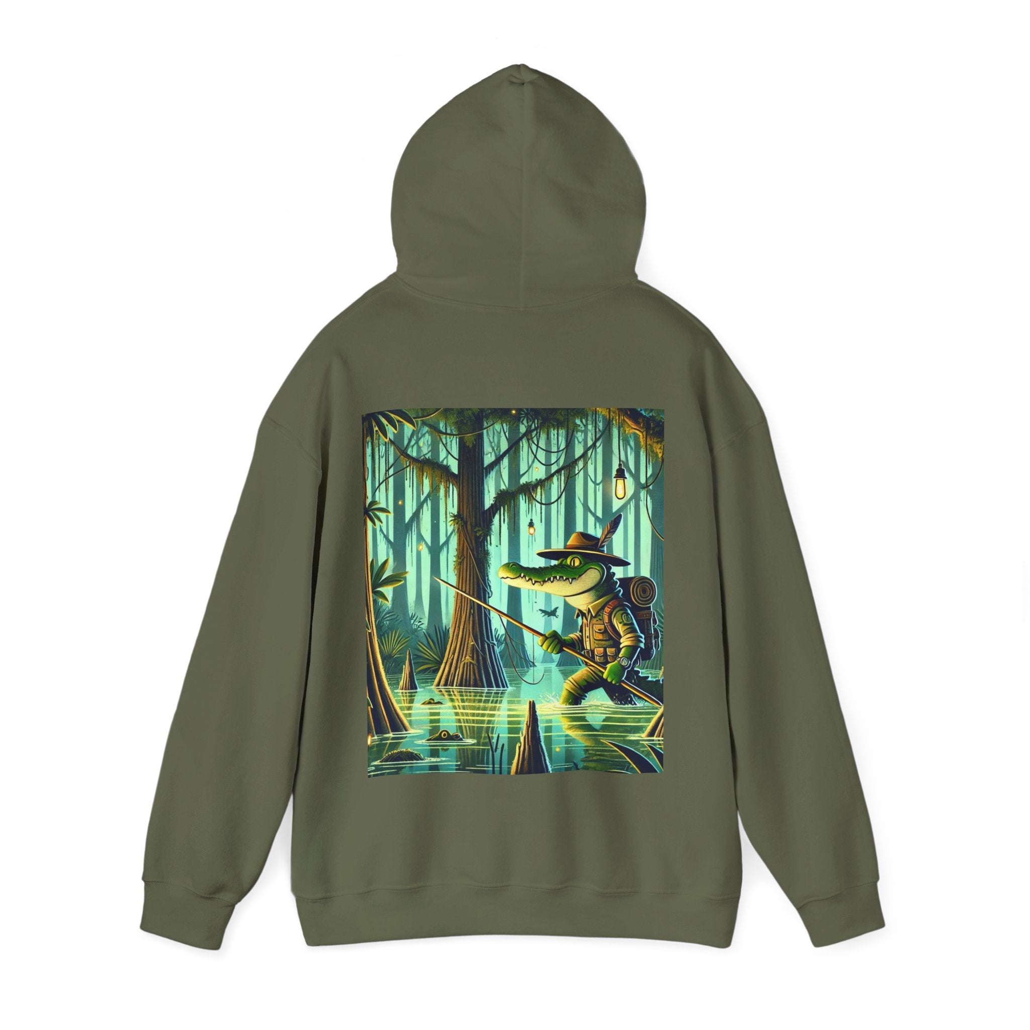Swamp Stalker – Heavy Blend™ Hooded Sweatshirt brings the atmosphere of a murky, untamed wilderness into a piece made for everyday wear. The artwork follows a fearless crocodile outfitted in rugged hunter’s gear as it slips along the misty riverbanks of a dense swamp. Shadows cling to its armor, reeds bend in its wake, and the heavy air hums with tension. Moving with the slow, deliberate precision of a master predator, the crocodile becomes part of the landscape itself—raw power, patience, and stealth woven into one striking moment. The scene radiates untamed energy, perfect for anyone drawn to bold imagery and the thrill of the wild.
