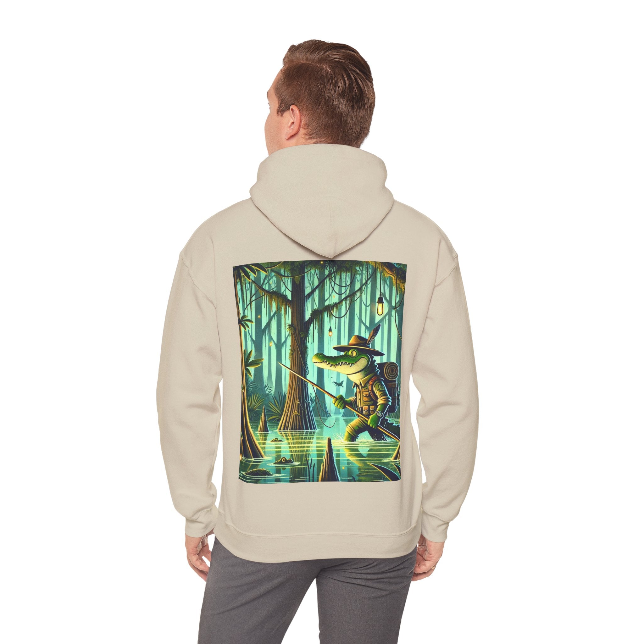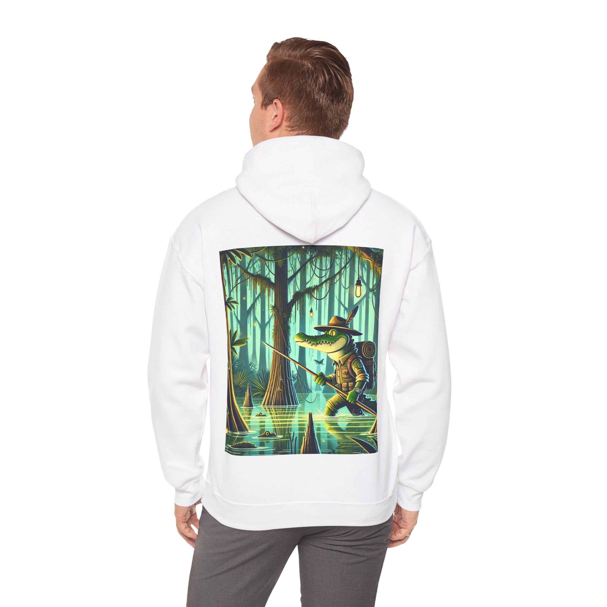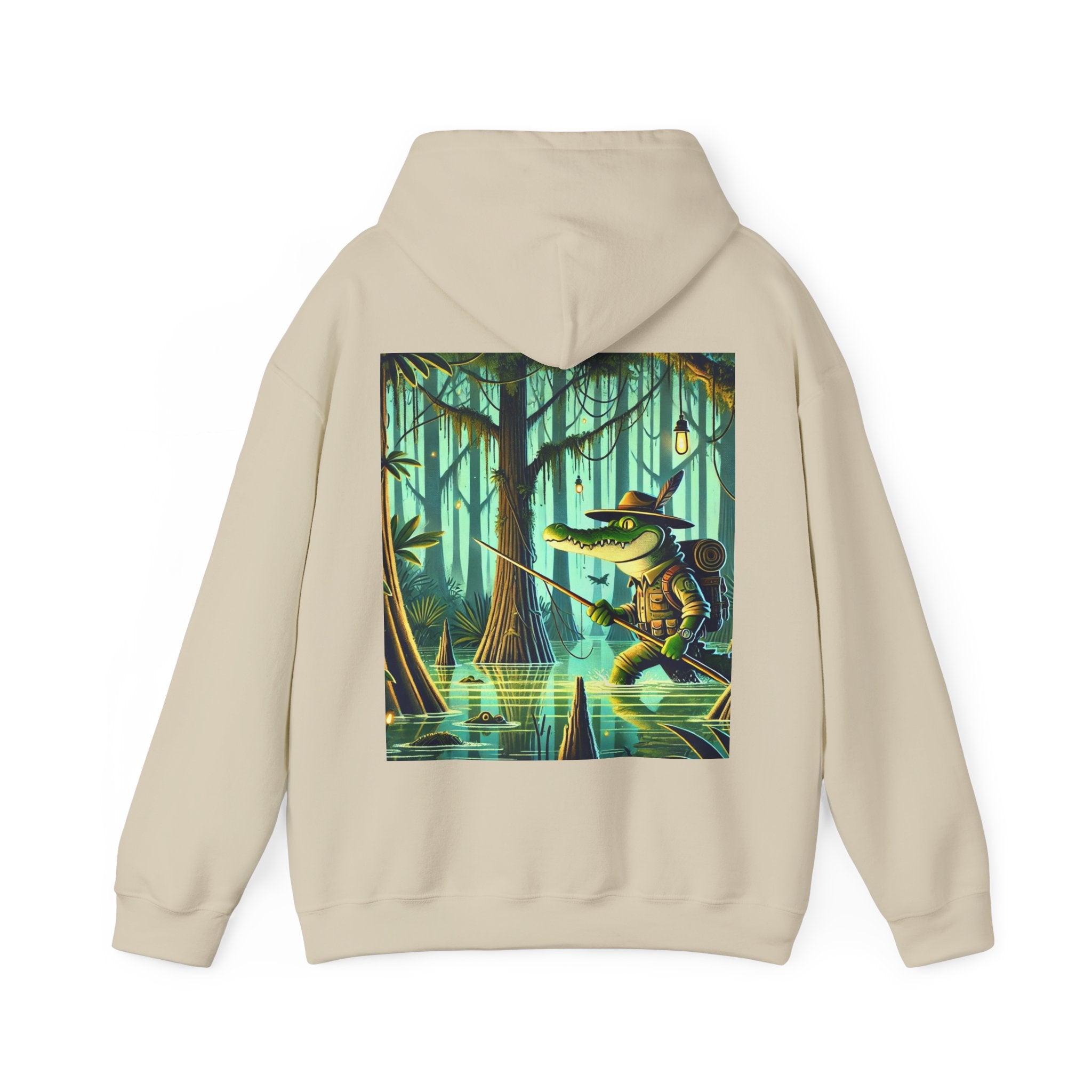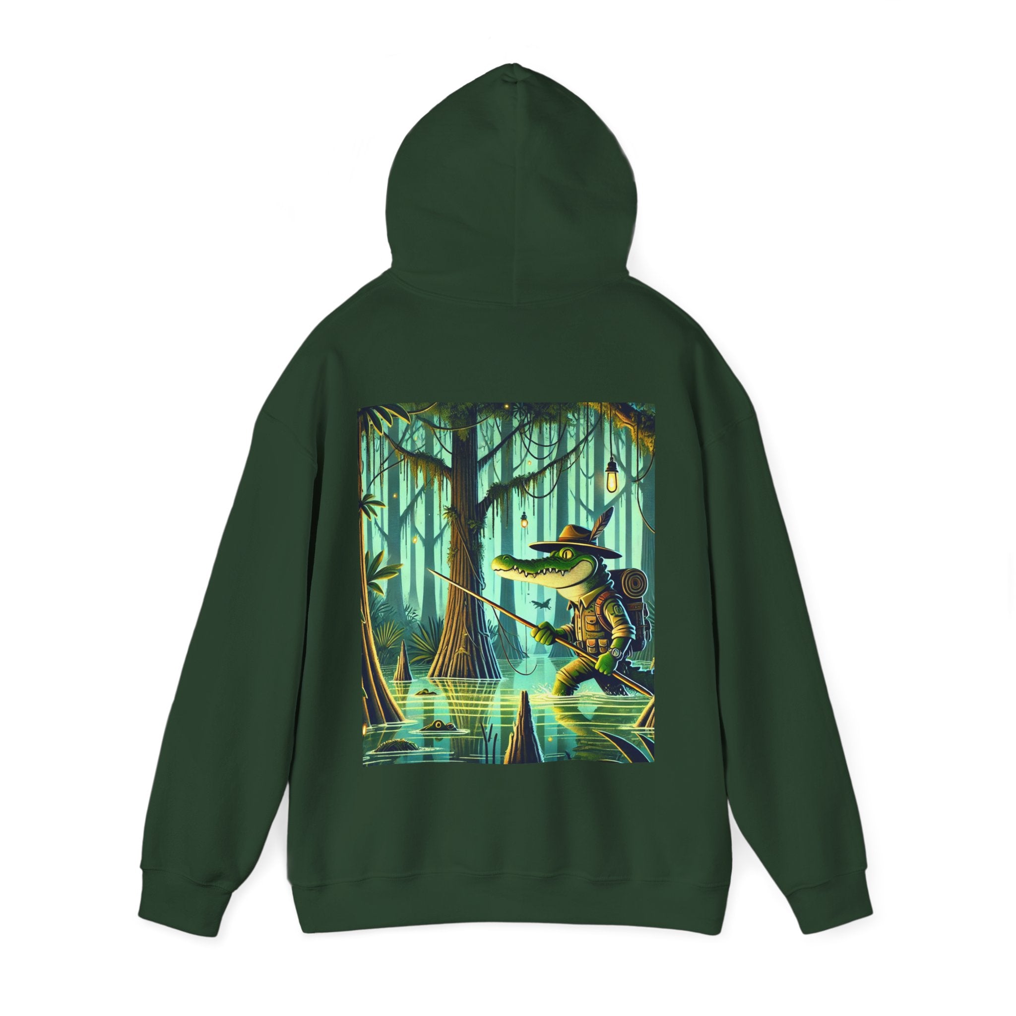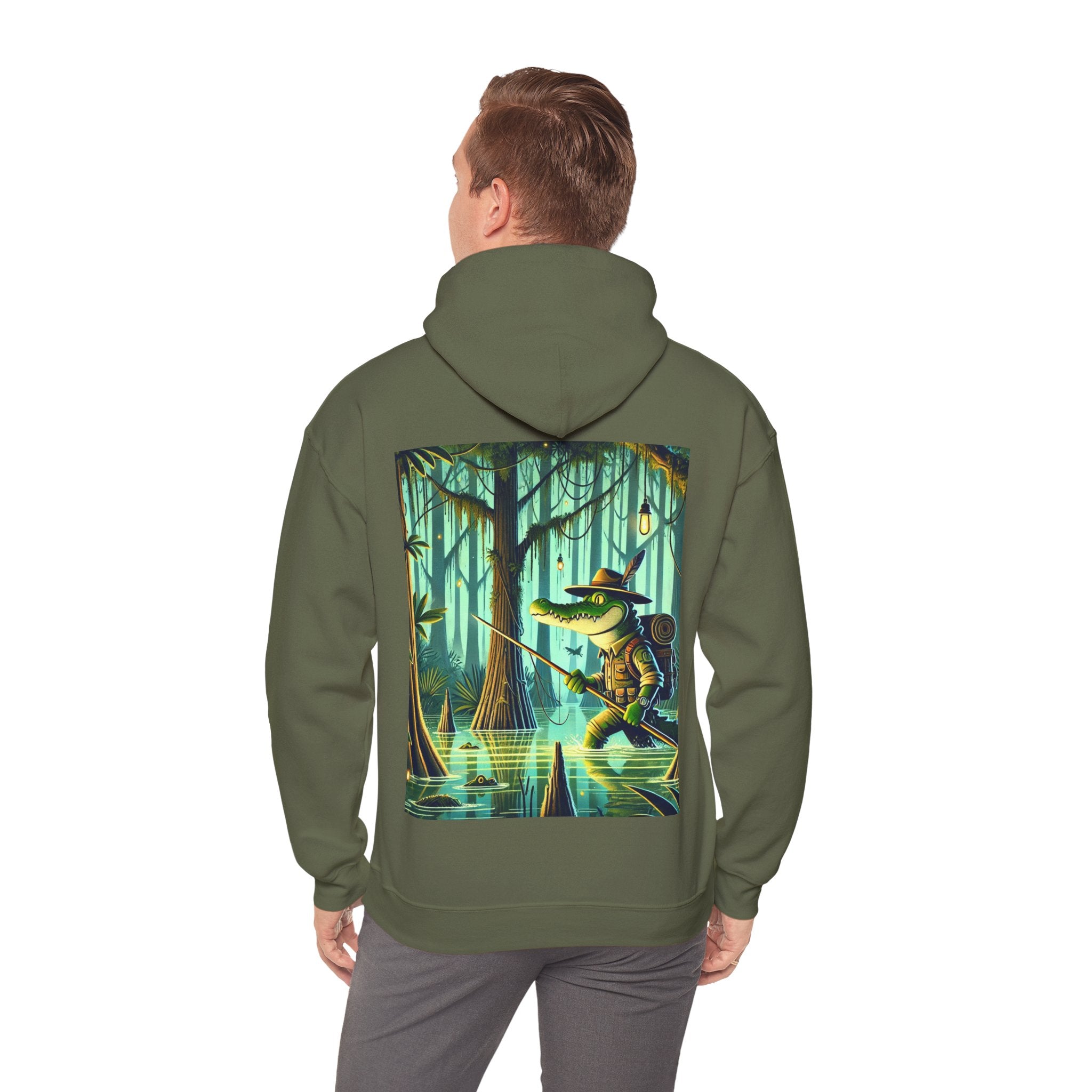 Swamp Stalker – Heavy Blend™ Hooded Sweatshirt brings the atmosphere of a murky, untamed wilderness into a piece made for everyday wear. The artwork follows a fearless crocodile outfitted in rugged hunter’s gear as it slips along the misty riverbanks of a dense swamp. Shadows cling to its armor, reeds bend in its wake, and the heavy air hums with tension. Moving with the slow, deliberate precision of a master predator, the crocodile becomes part of the landscape itself—raw power, patience, and stealth woven into one striking moment. The scene radiates untamed energy, perfect for anyone drawn to bold imagery and the thrill of the wild.