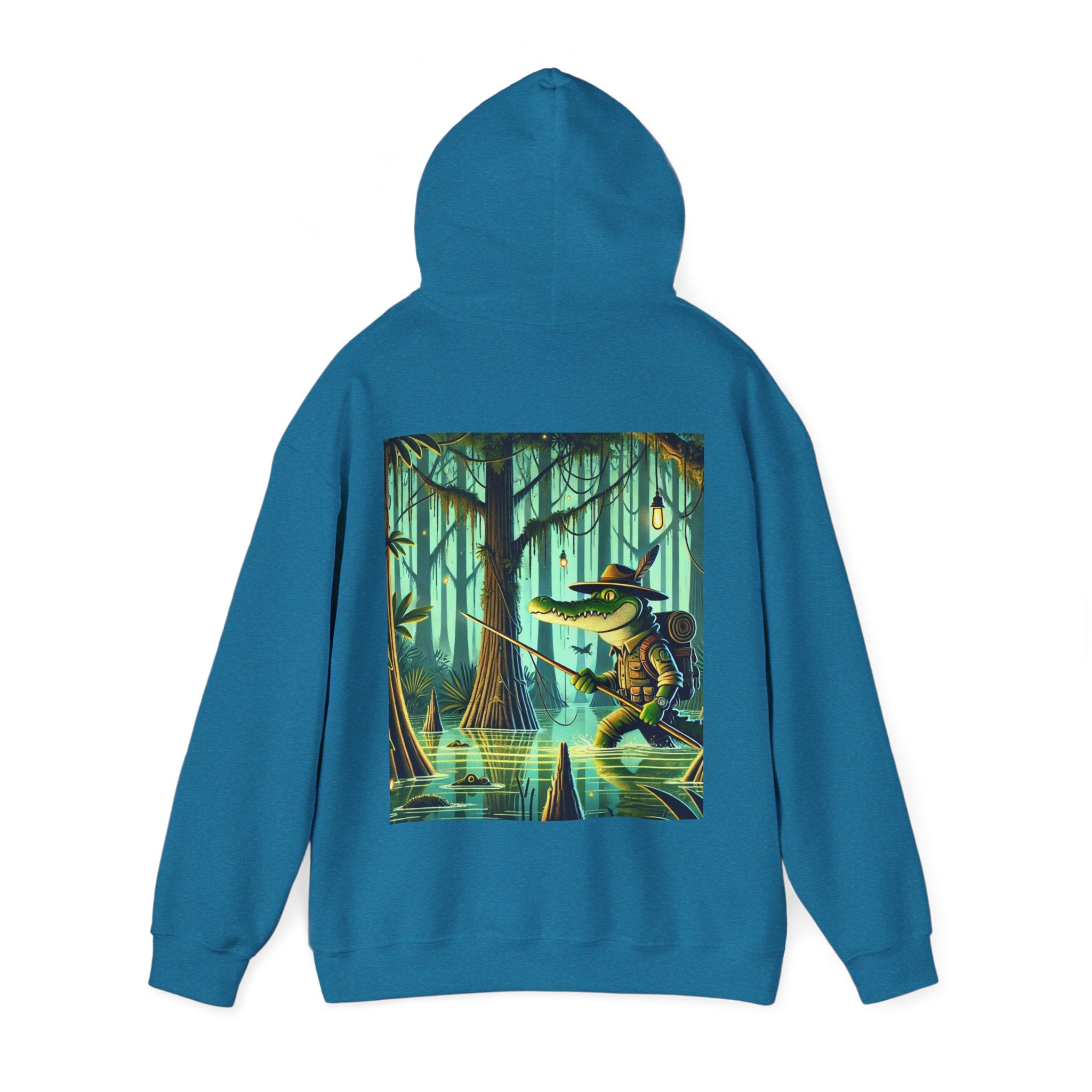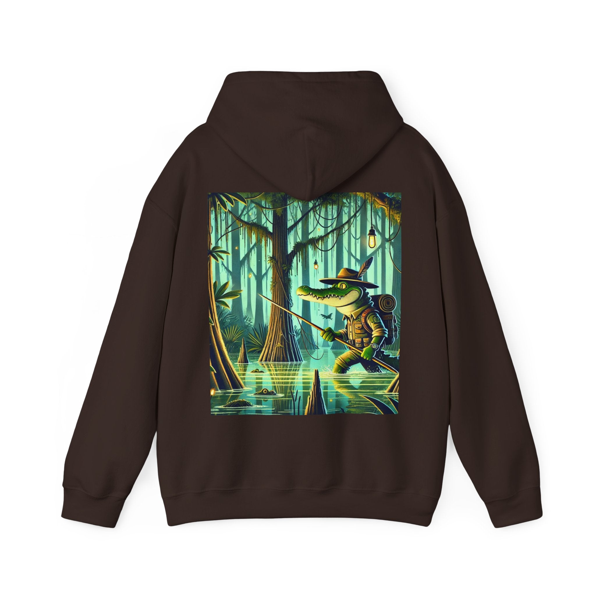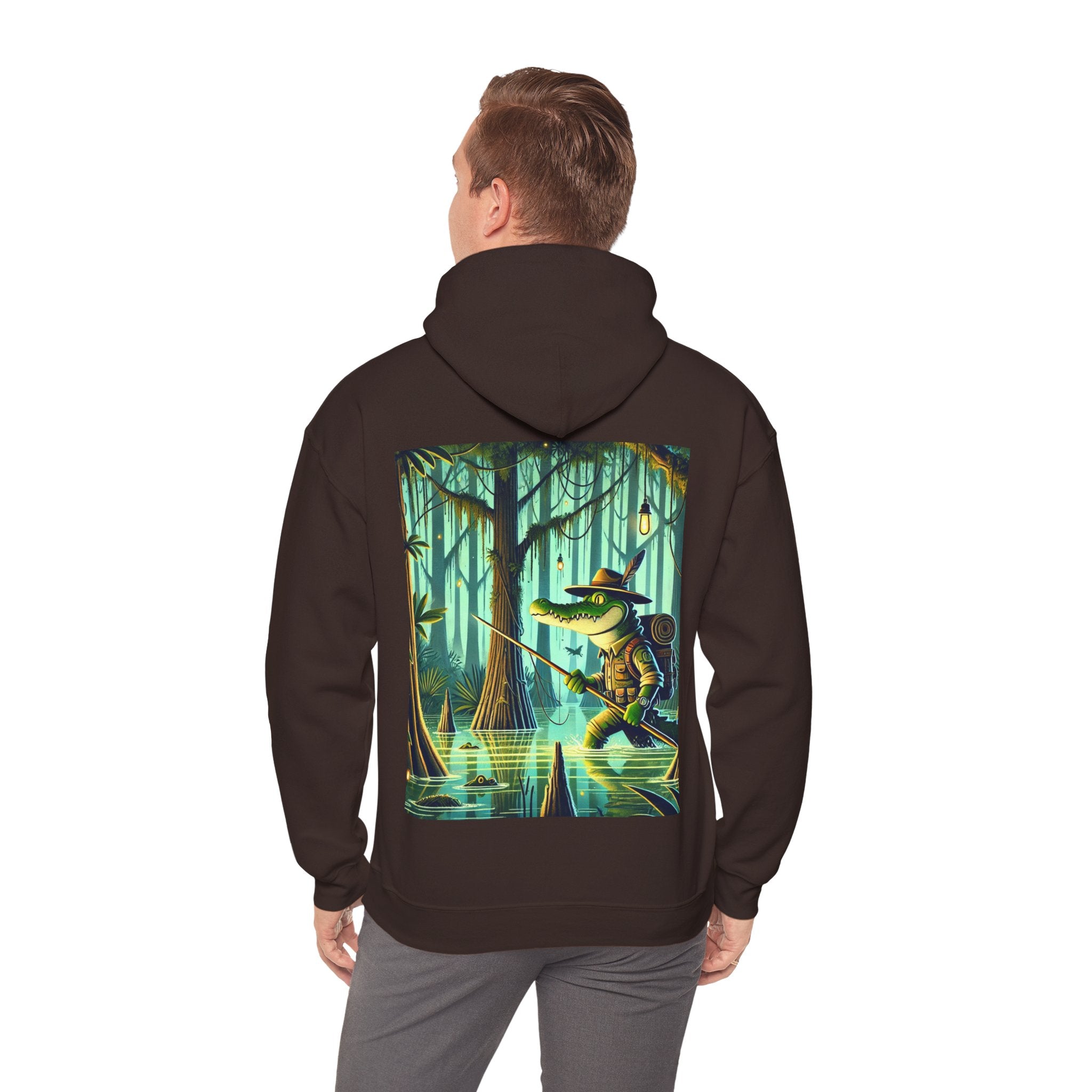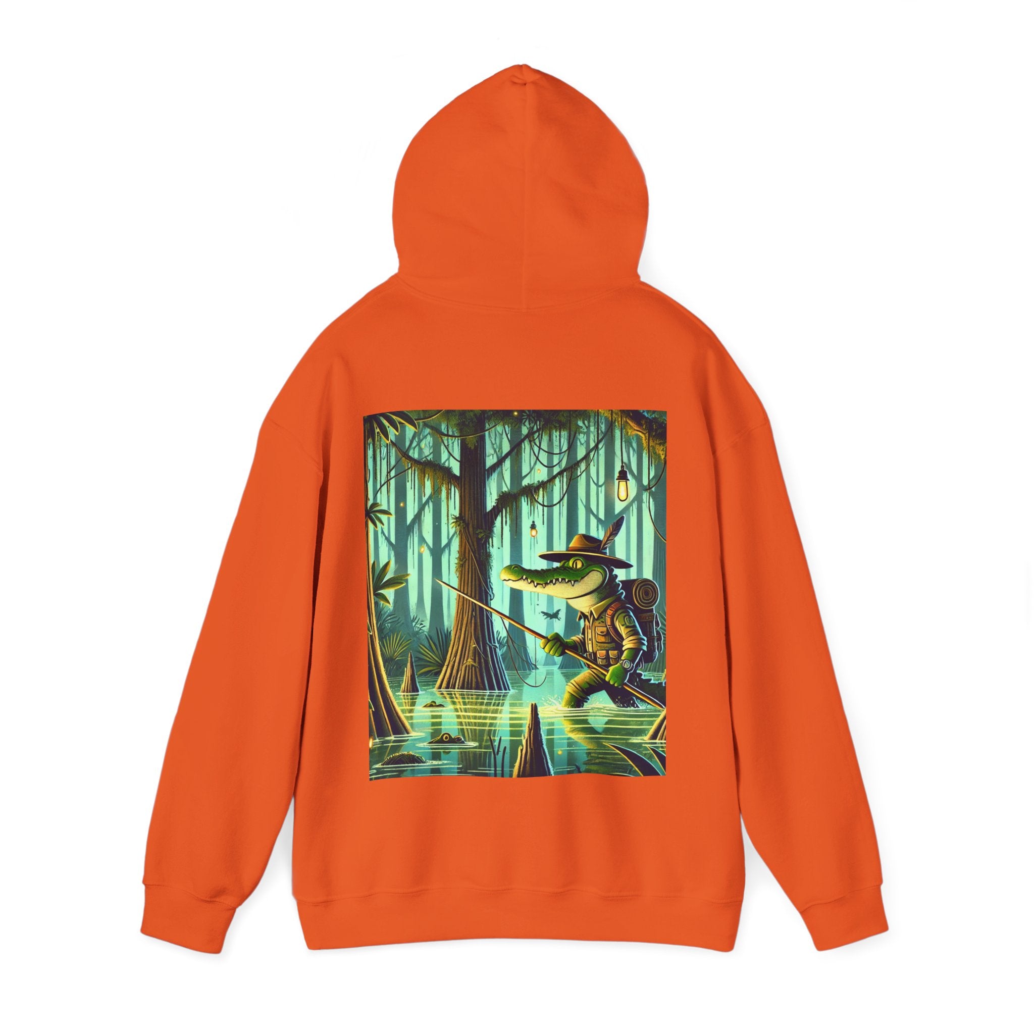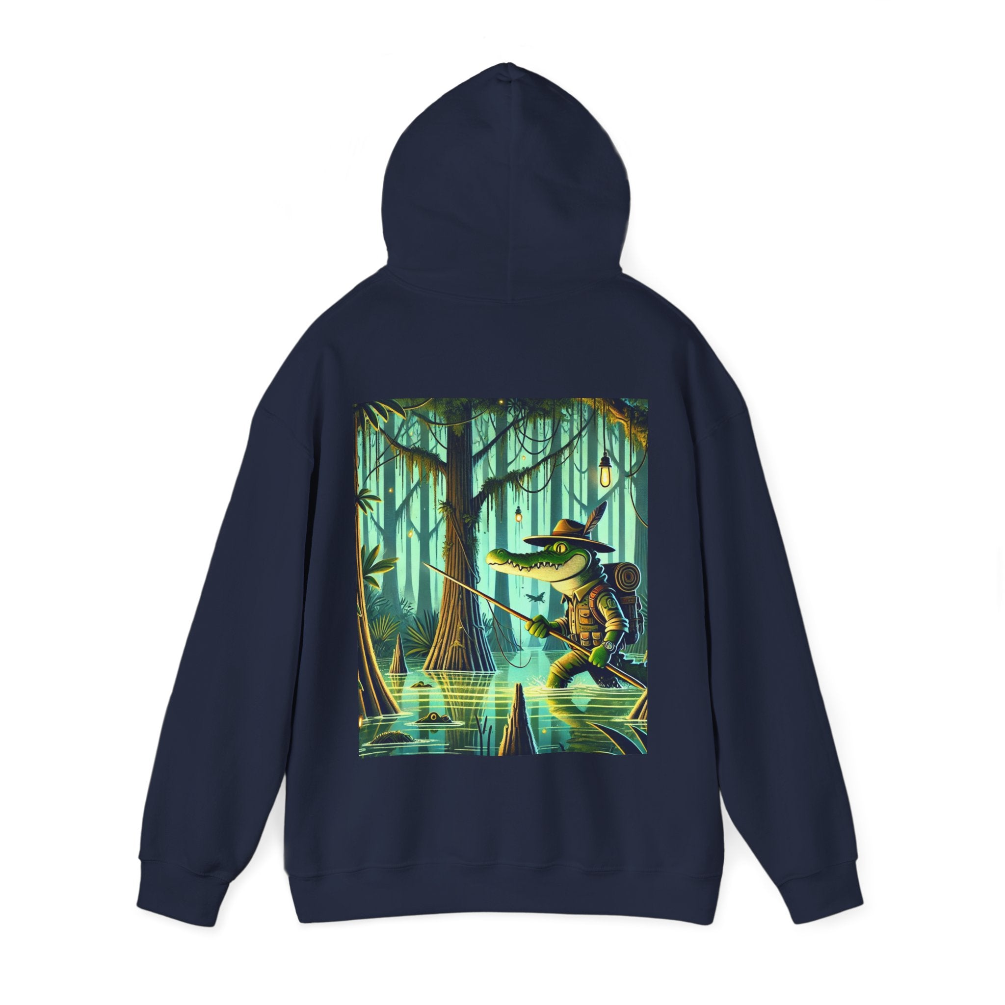 Swamp Stalker – Heavy Blend™ Hooded Sweatshirt brings the atmosphere of a murky, untamed wilderness into a piece made for everyday wear. The artwork follows a fearless crocodile outfitted in rugged hunter’s gear as it slips along the misty riverbanks of a dense swamp. Shadows cling to its armor, reeds bend in its wake, and the heavy air hums with tension. Moving with the slow, deliberate precision of a master predator, the crocodile becomes part of the landscape itself—raw power, patience, and stealth woven into one striking moment. The scene radiates untamed energy, perfect for anyone drawn to bold imagery and the thrill of the wild.