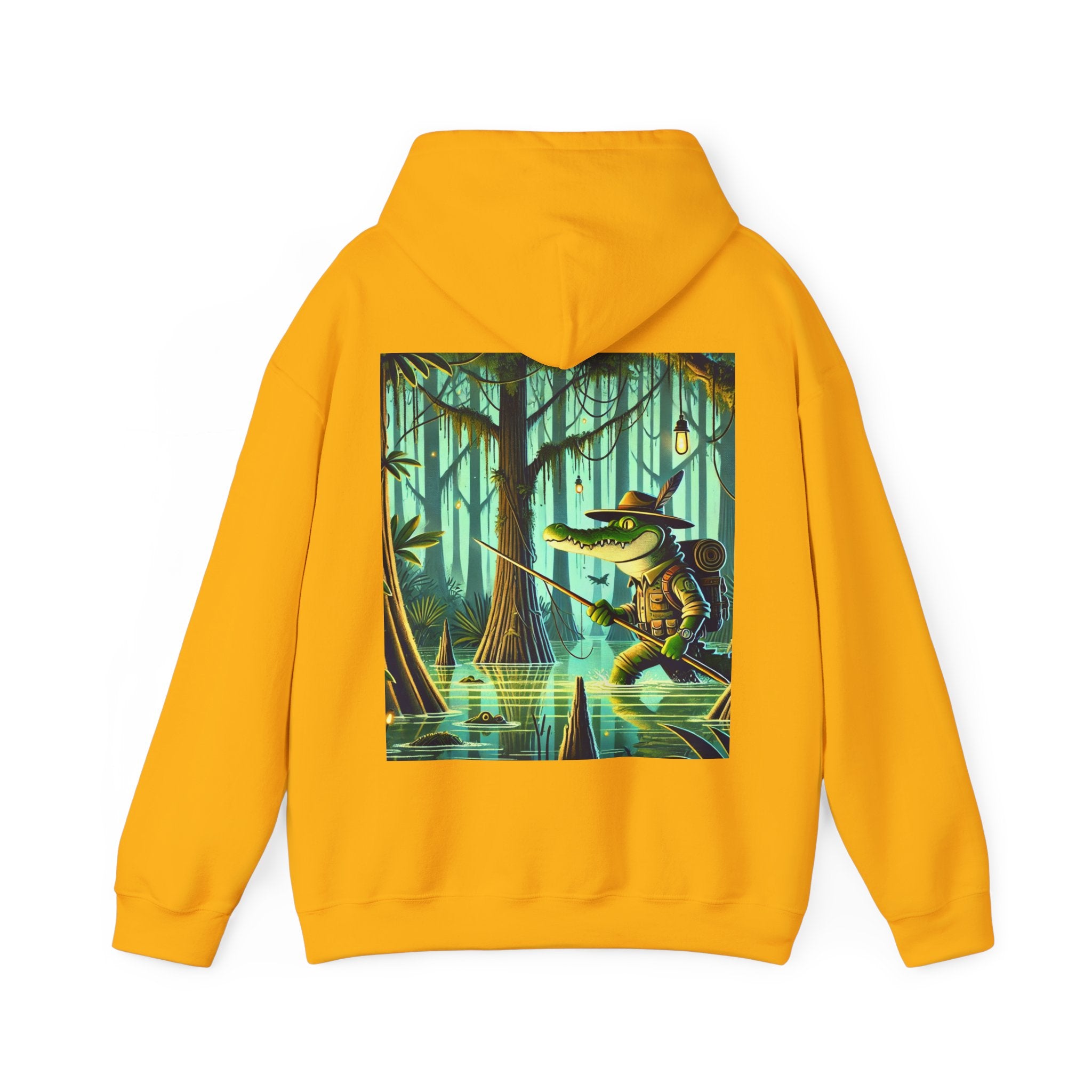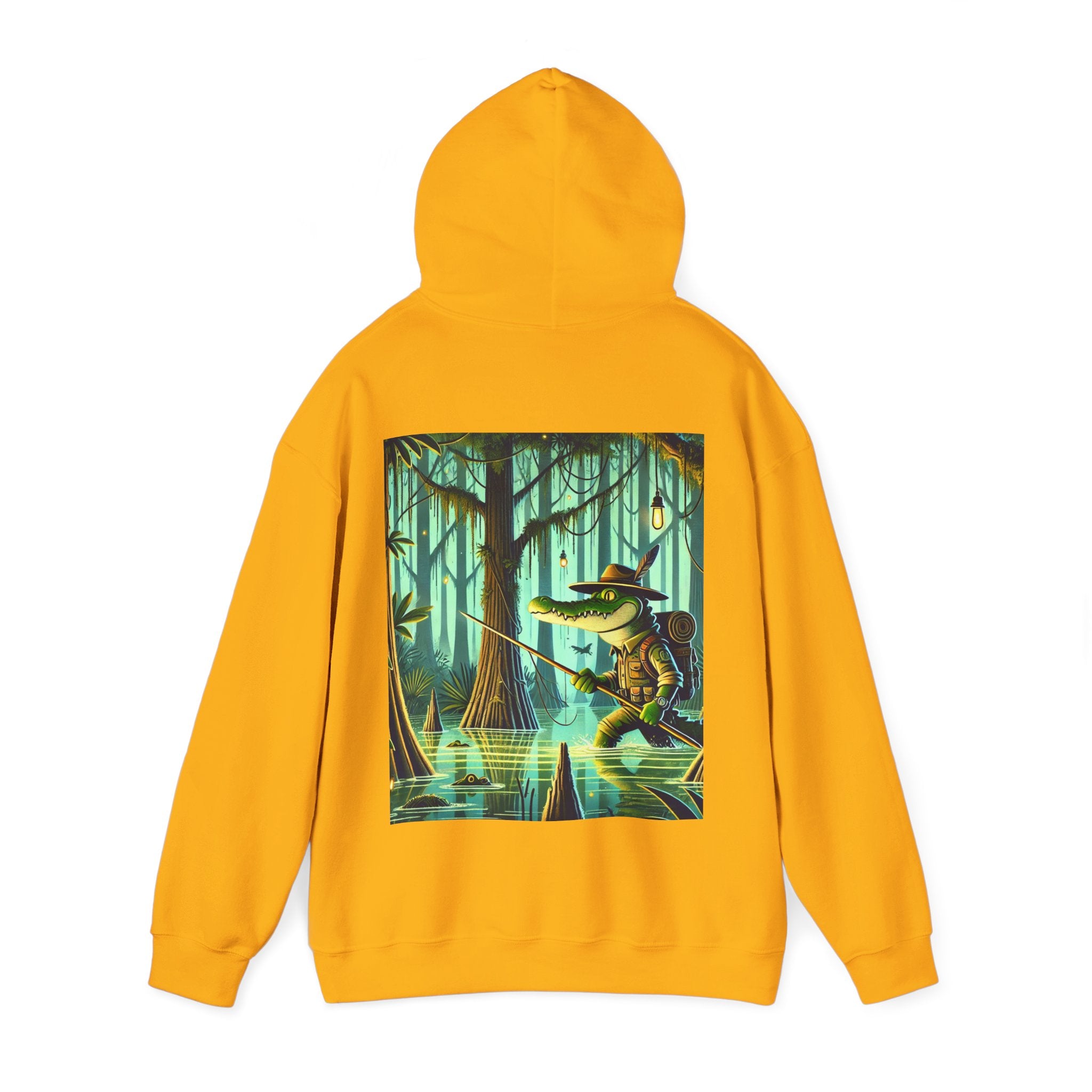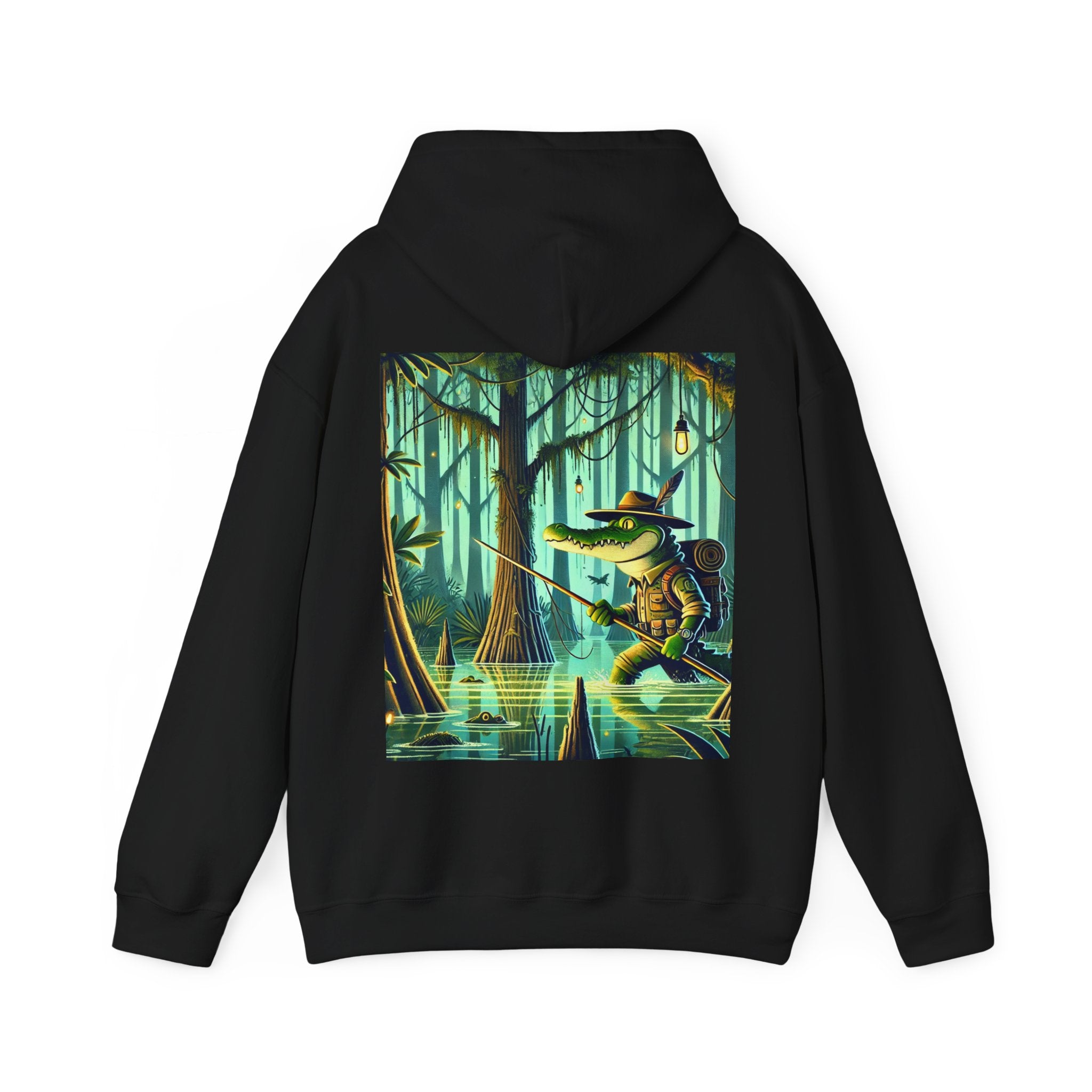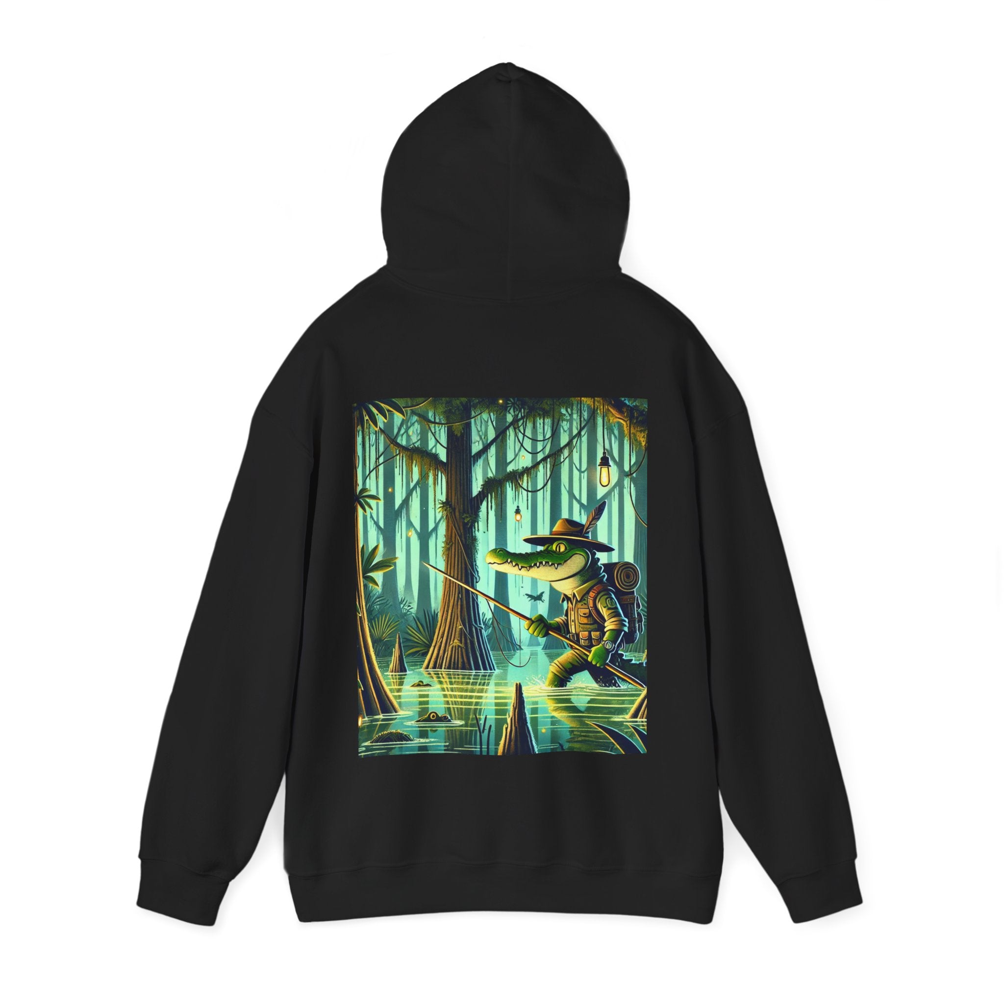 This dramatic design pairs seamlessly with the Gildan Heavy Blend™ Hooded Sweatshirt, crafted from a soft cotton-poly blend that brings dependable warmth and durability. Its unisex fit makes it versatile for everyday use, while ribbed cuffs and hem help maintain a clean shape through repeated wear. A large front pocket offers easy practicality, and the double-lined hood with matching drawcord adds a smooth, cohesive finish. Comfortable, reliable, and visually commanding, the hoodie turns the swamp’s silent tension into a wearable statement.
