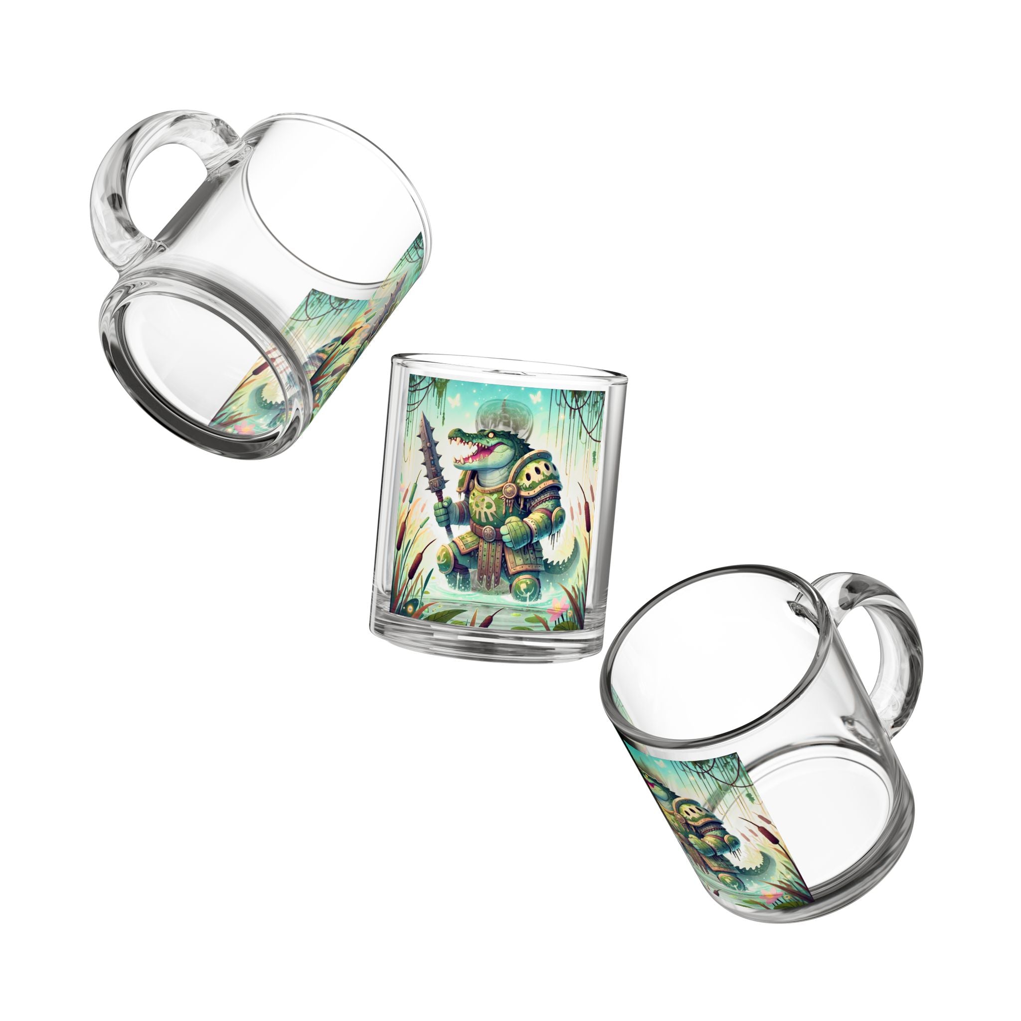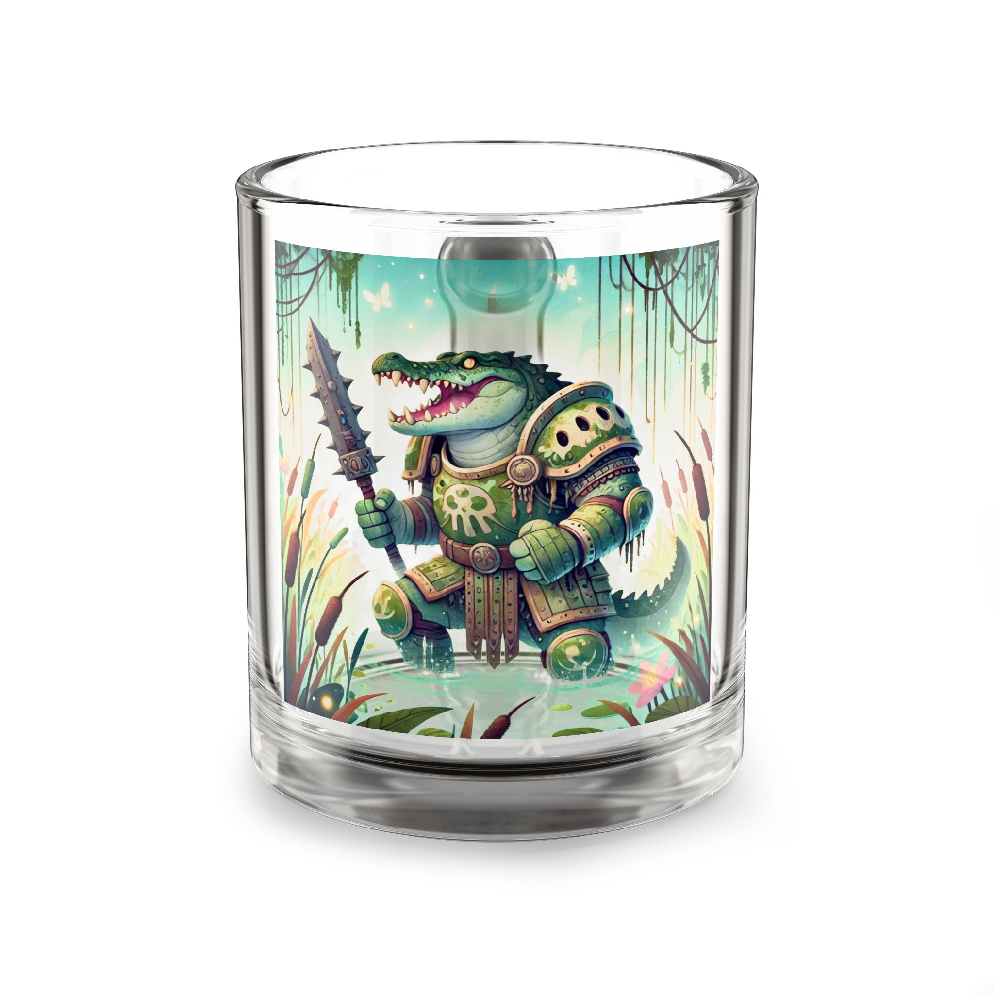 In this striking and whimsical illustration, a towering crocodile warlord emerges from a mist-laden bog, its massive frame clad in intricately designed swamp-camo armor. The creature’s piercing eyes glow with primal intensity, exuding dominance over its murky domain. It wields a jagged club. A sense of raw power and ancient legend surrounds this formidable reptilian warrior, blending fantasy and folklore into an unforgettable scene.