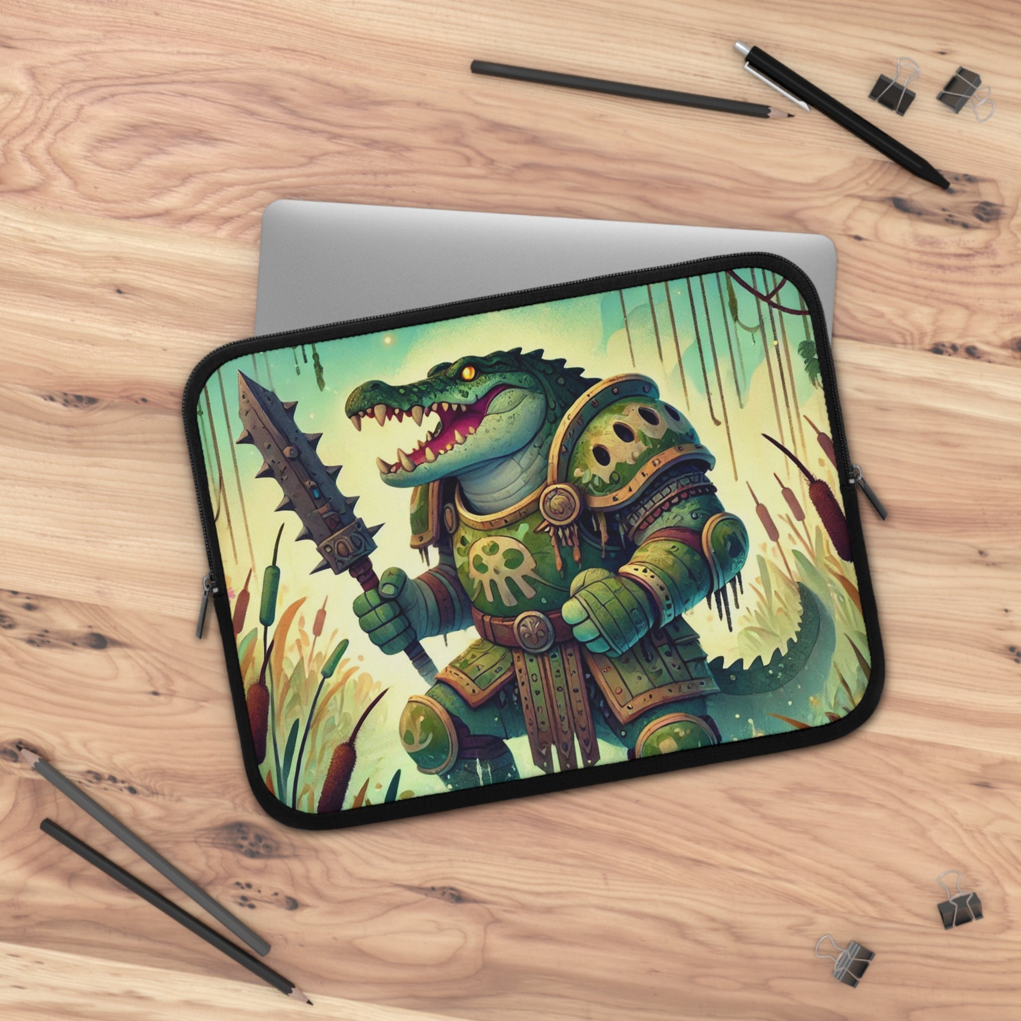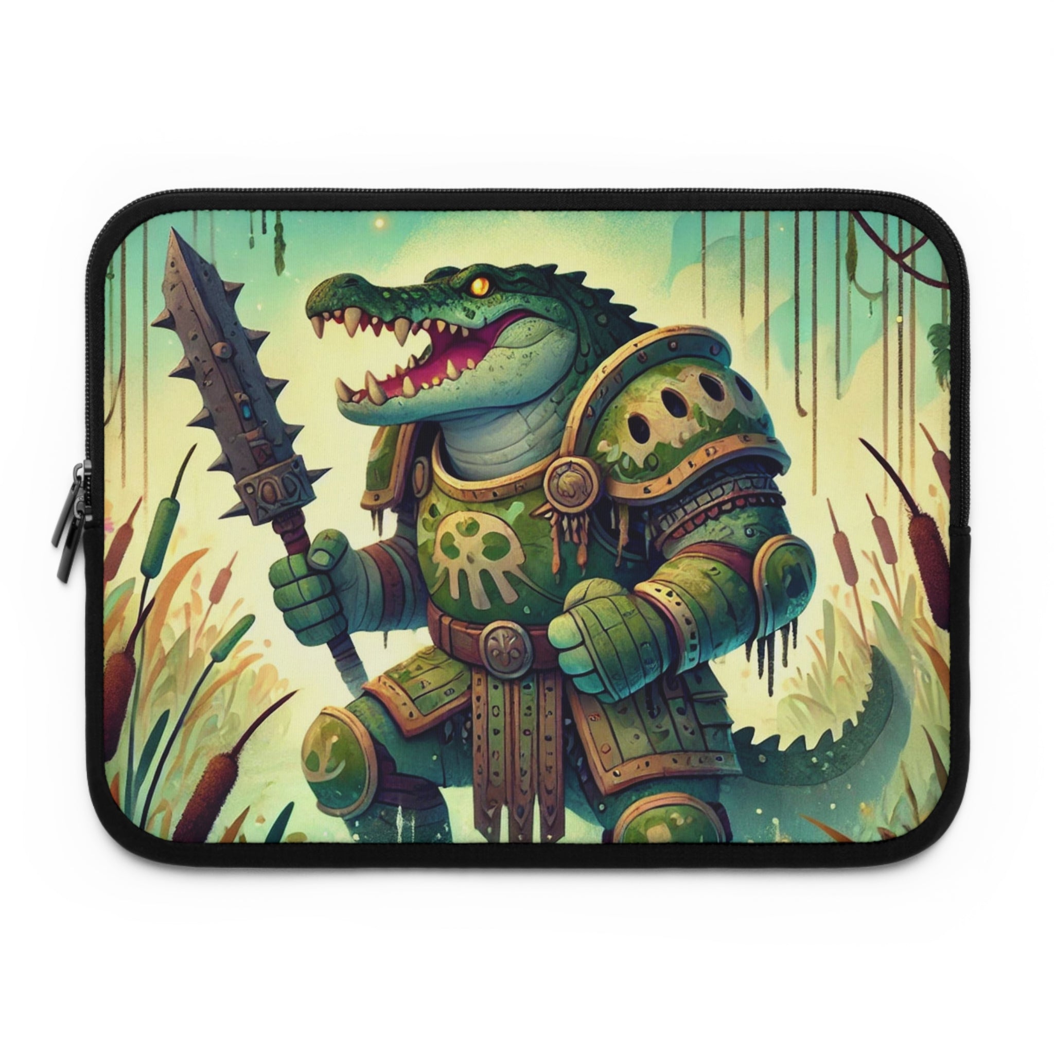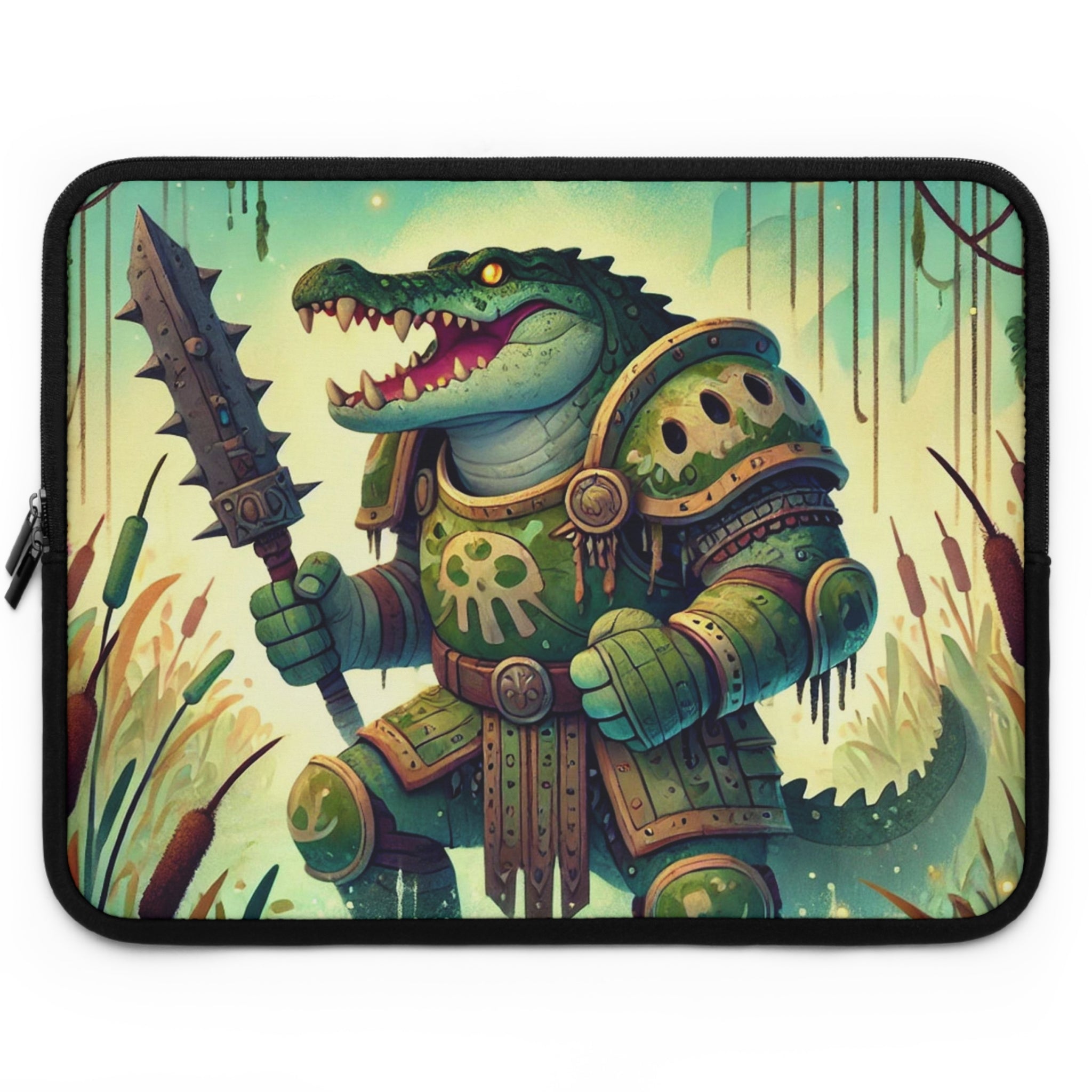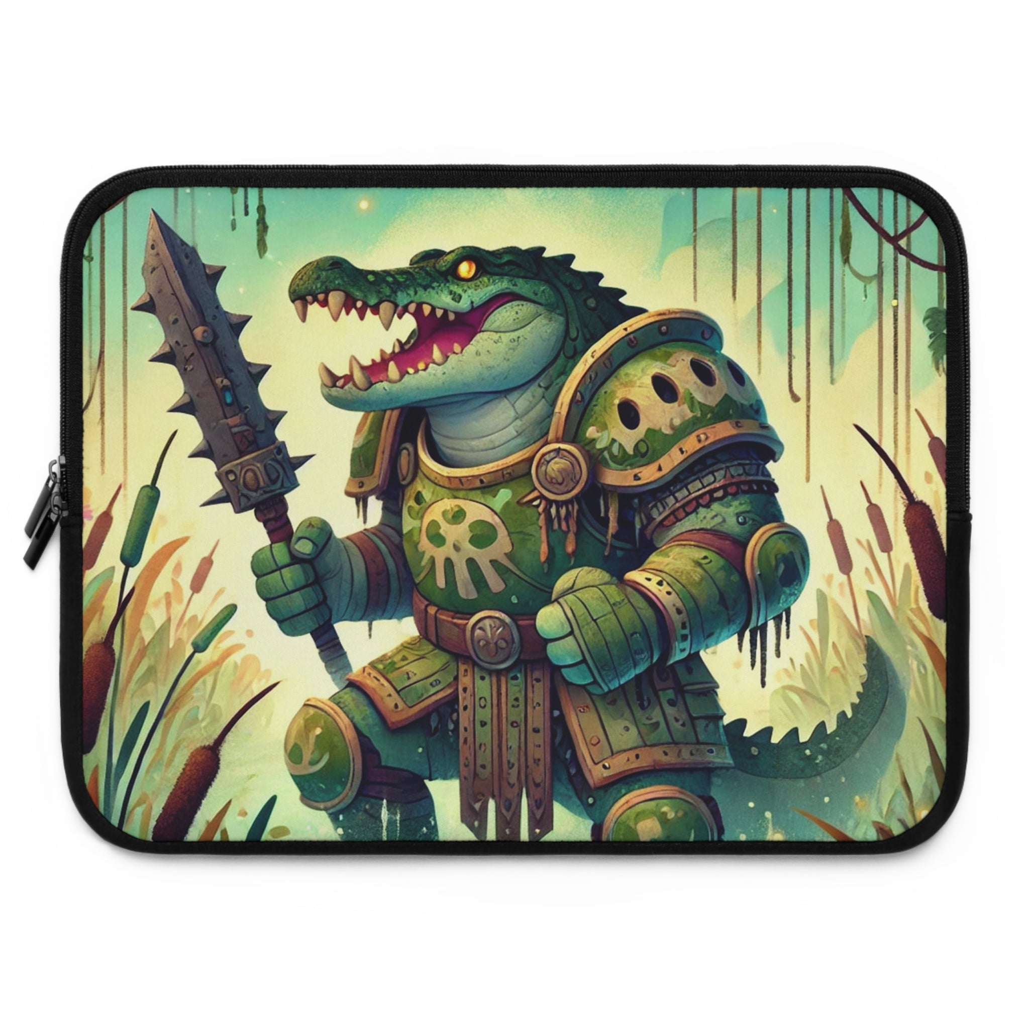 Command attention wherever you go with the Swamp Tyrant Laptop Sleeve, a fusion of fierce imagination and bold design. This captivating artwork portrays a towering crocodile warlord rising from a mist-laden bog, its colossal frame encased in intricately crafted swamp-camo armor that gleams beneath the shifting light. Piercing eyes blaze with primal intelligence, asserting dominion over the murky waters that ripple at its feet. In one clawed hand, the creature wields a jagged club — both weapon and symbol of ancient rule. The air vibrates with the echo of legend, as if the bog itself bows to its reptilian king. This scene masterfully merges the mythical and the monstrous, capturing the timeless essence of power born from the depths.
