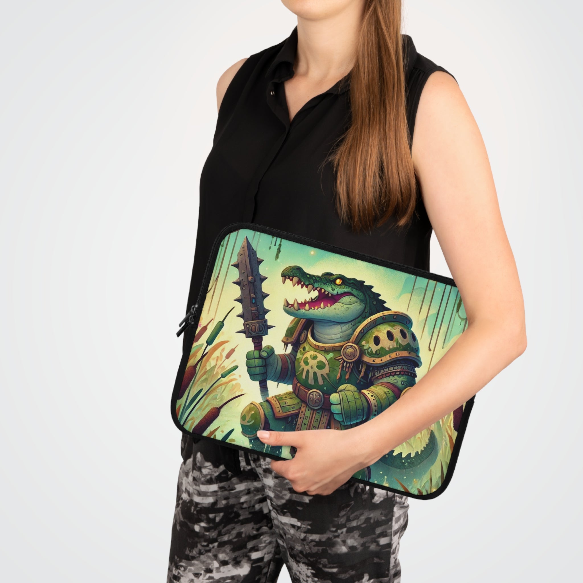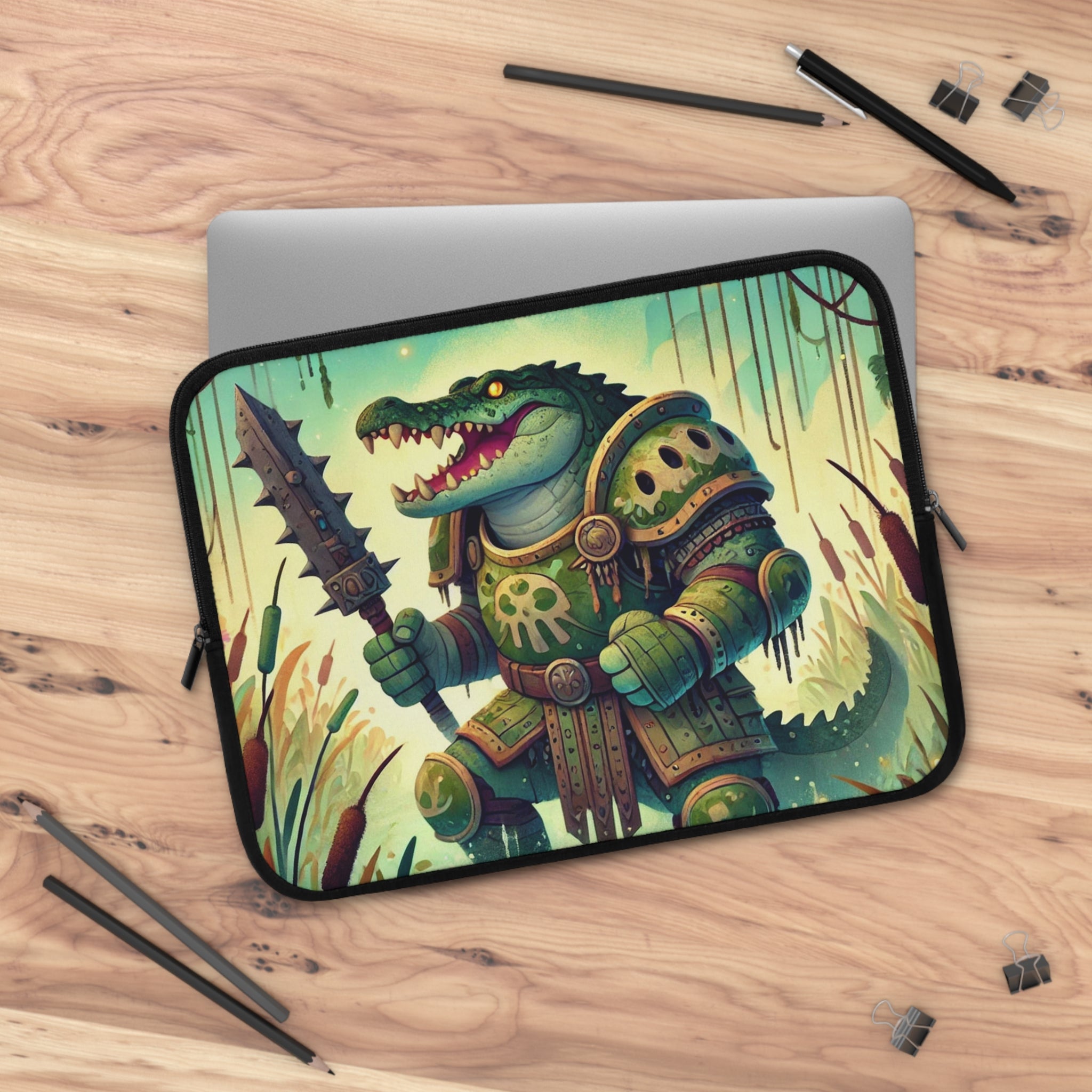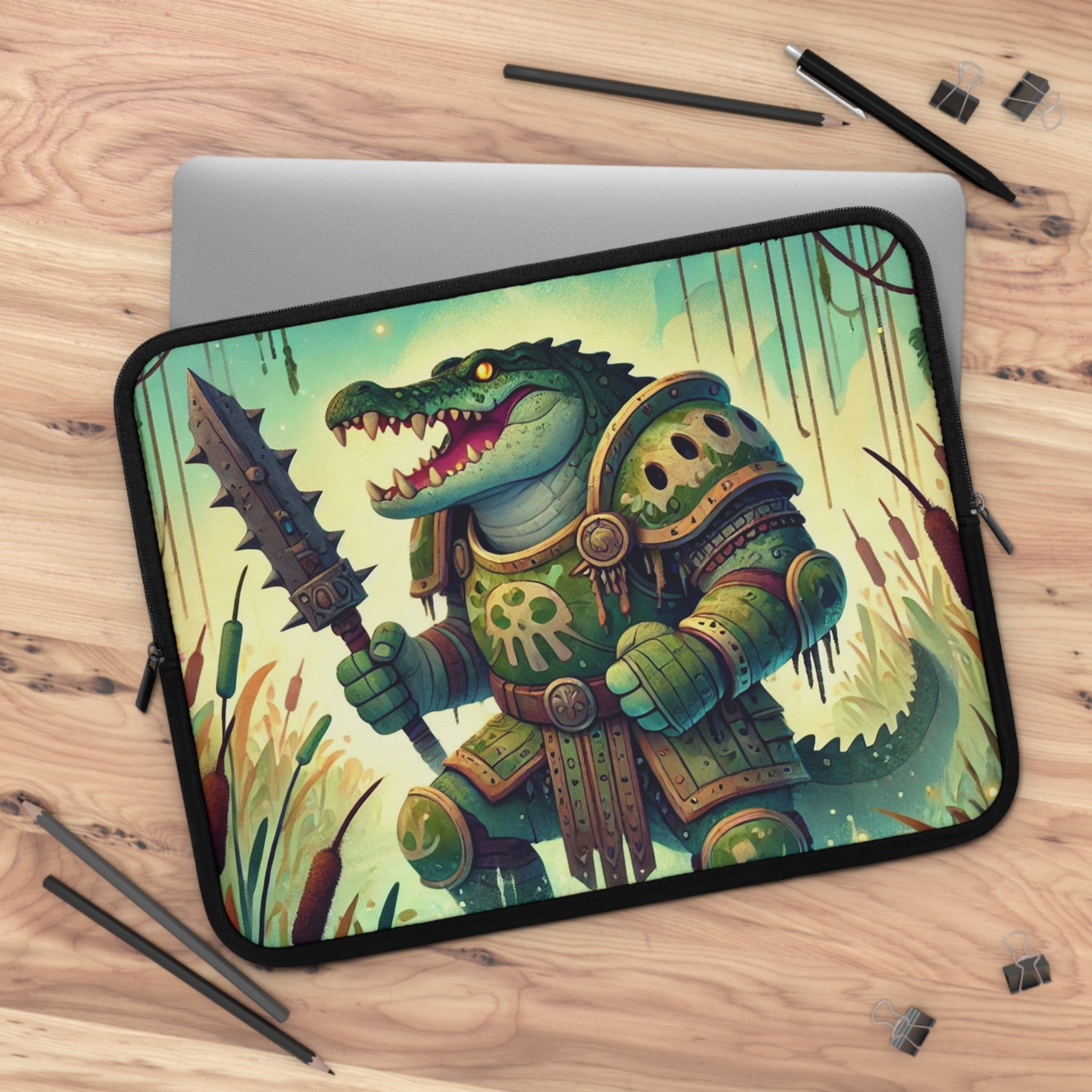 Command attention wherever you go with the Swamp Tyrant Laptop Sleeve, a fusion of fierce imagination and bold design. This captivating artwork portrays a towering crocodile warlord rising from a mist-laden bog, its colossal frame encased in intricately crafted swamp-camo armor that gleams beneath the shifting light. Piercing eyes blaze with primal intelligence, asserting dominion over the murky waters that ripple at its feet. In one clawed hand, the creature wields a jagged club — both weapon and symbol of ancient rule. The air vibrates with the echo of legend, as if the bog itself bows to its reptilian king. This scene masterfully merges the mythical and the monstrous, capturing the timeless essence of power born from the depths.