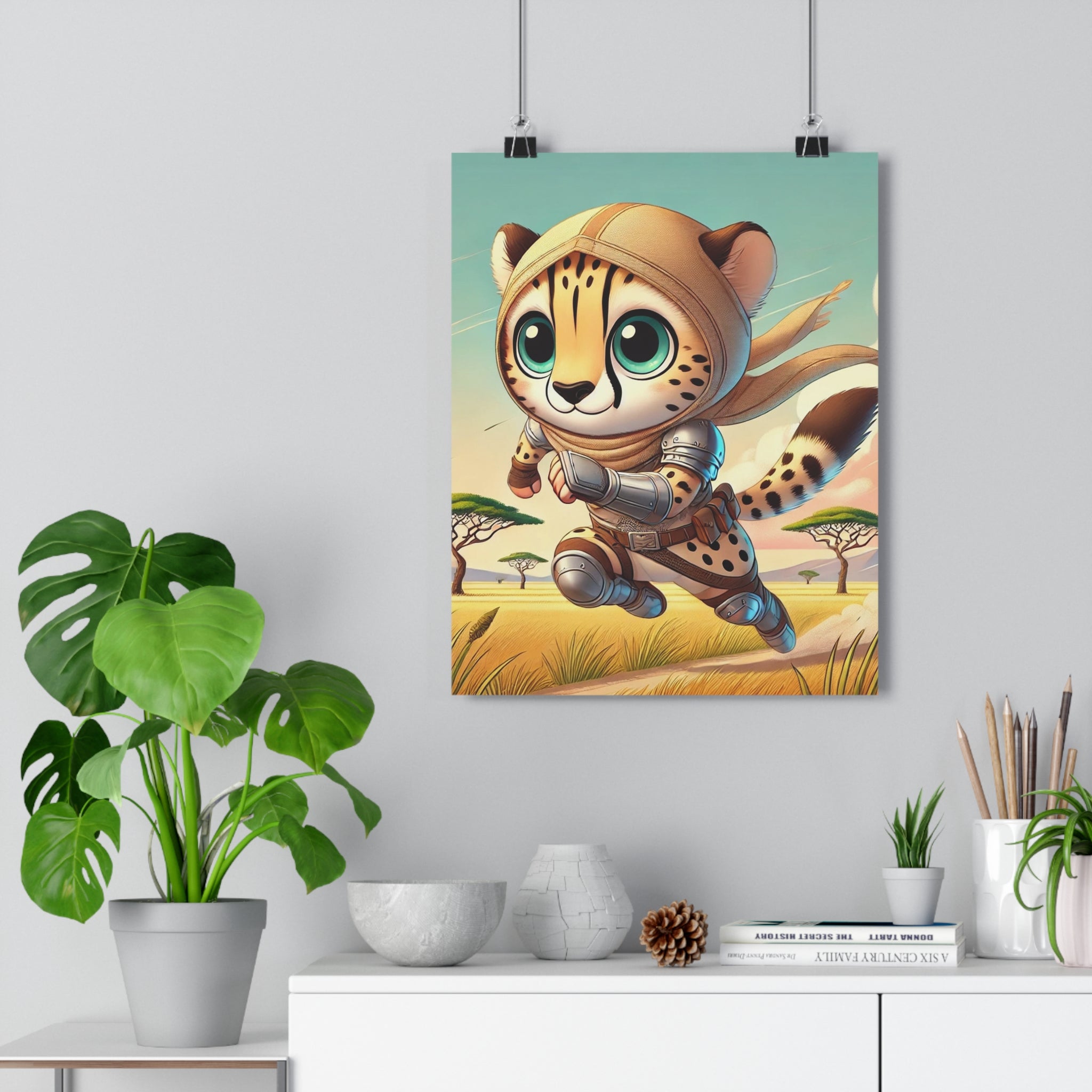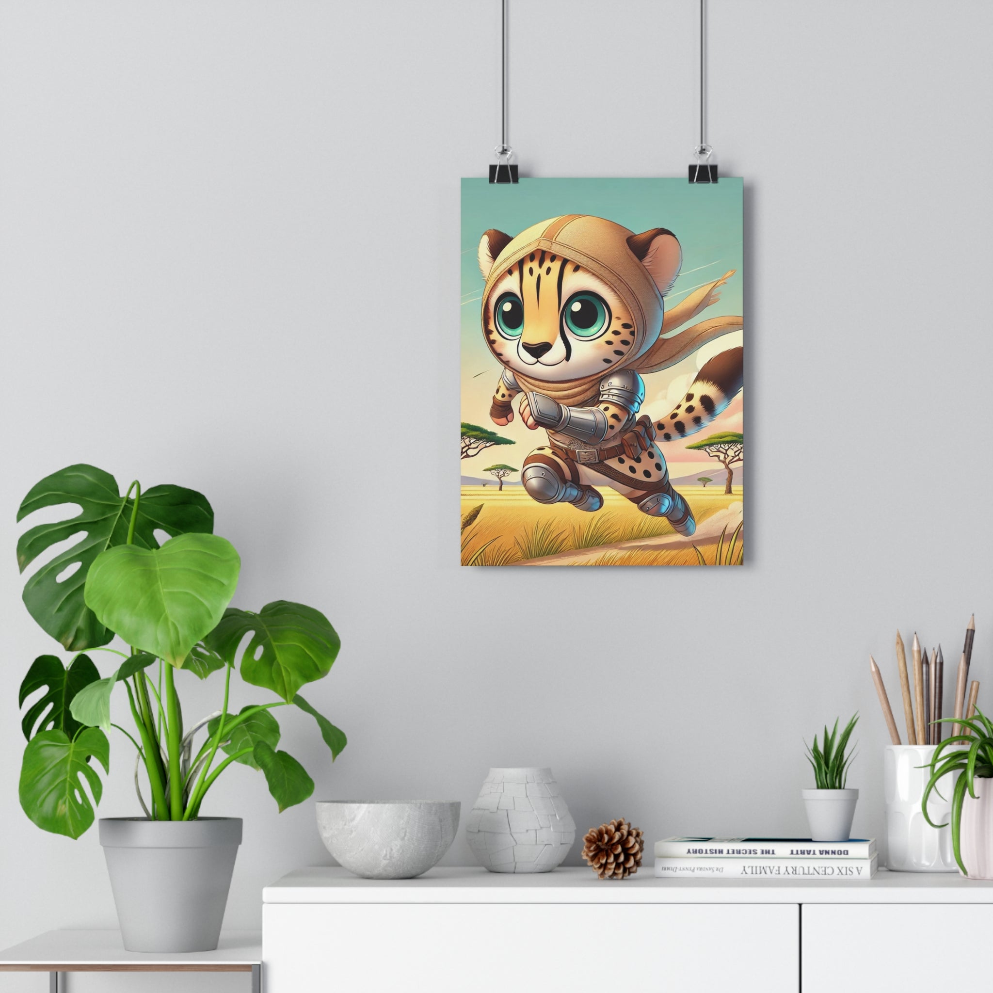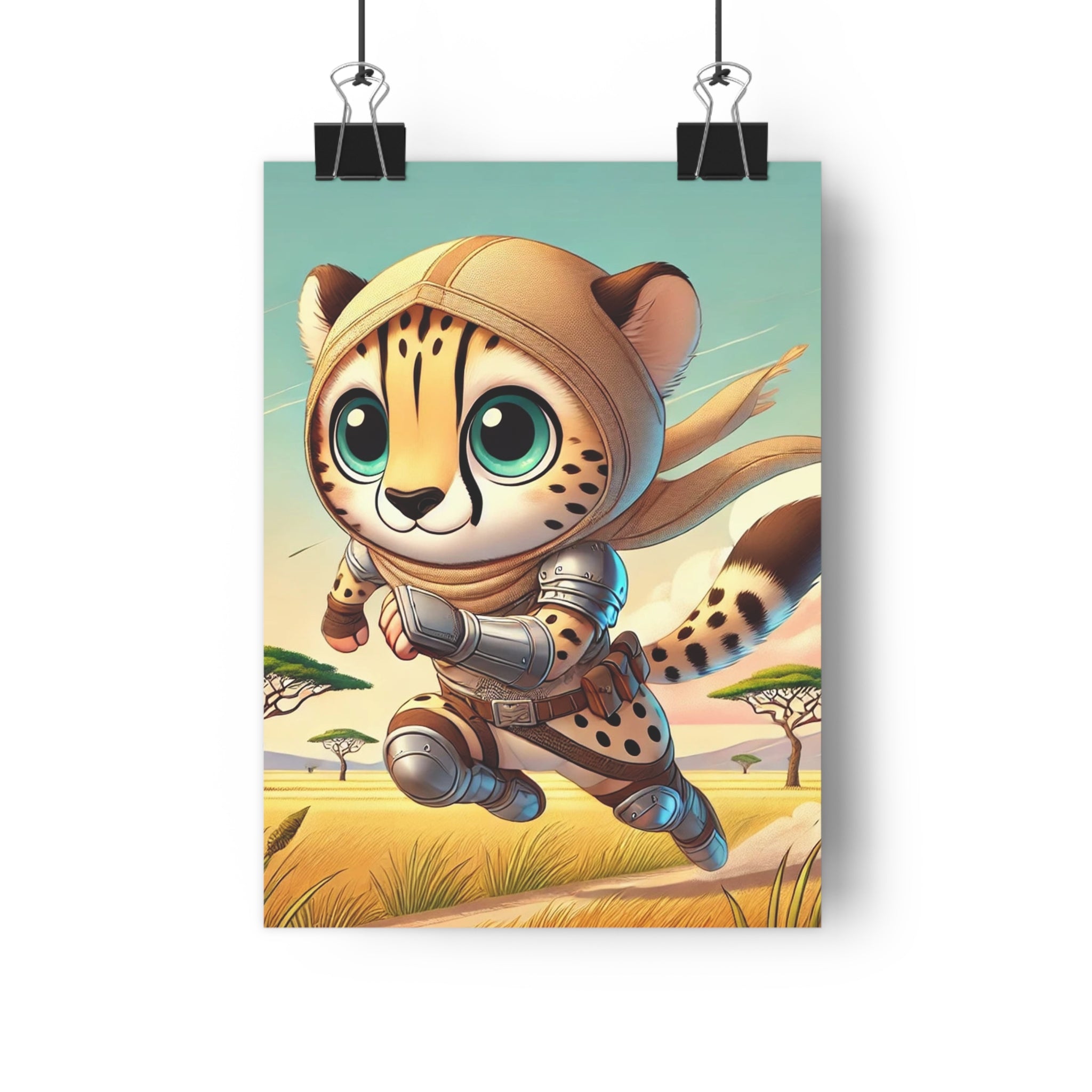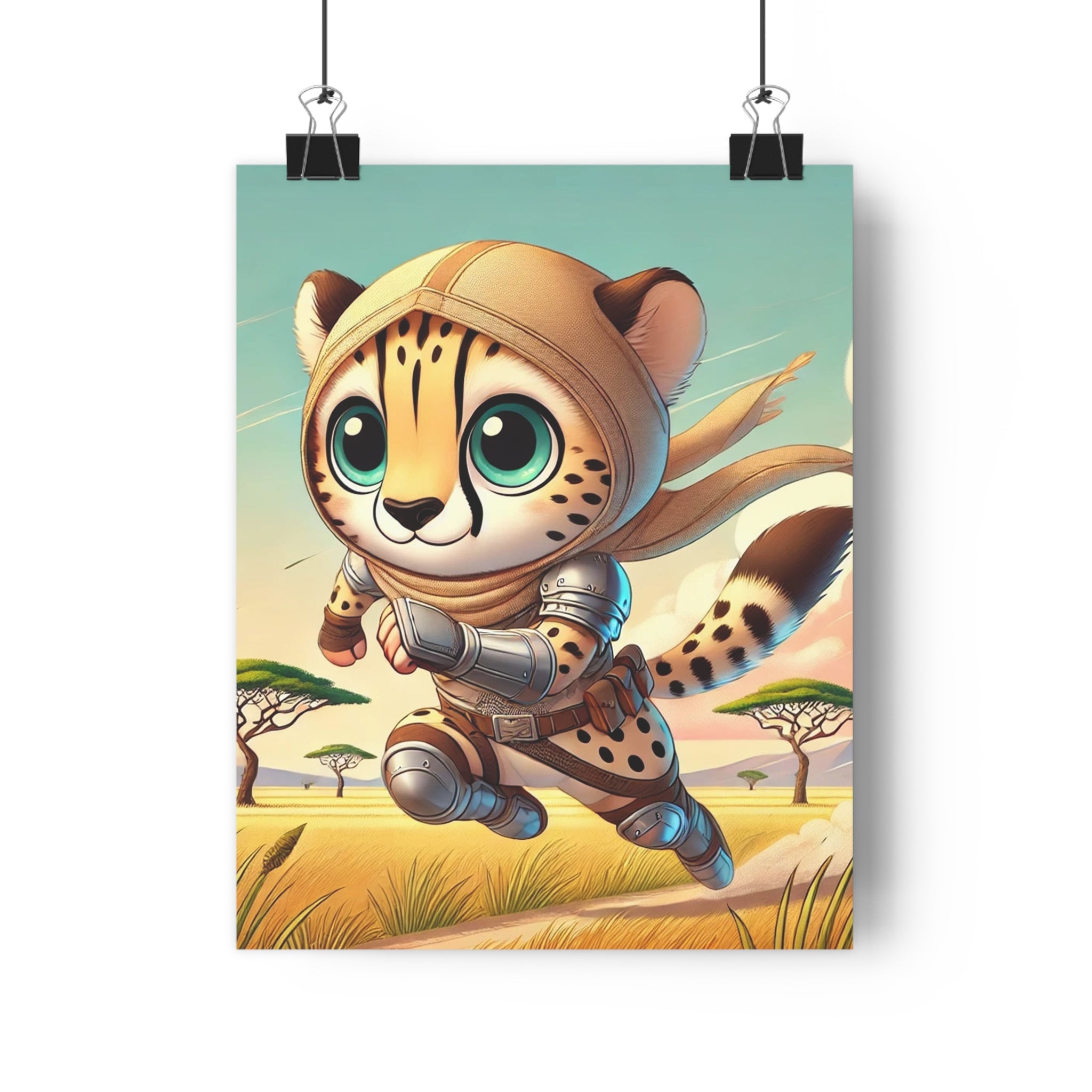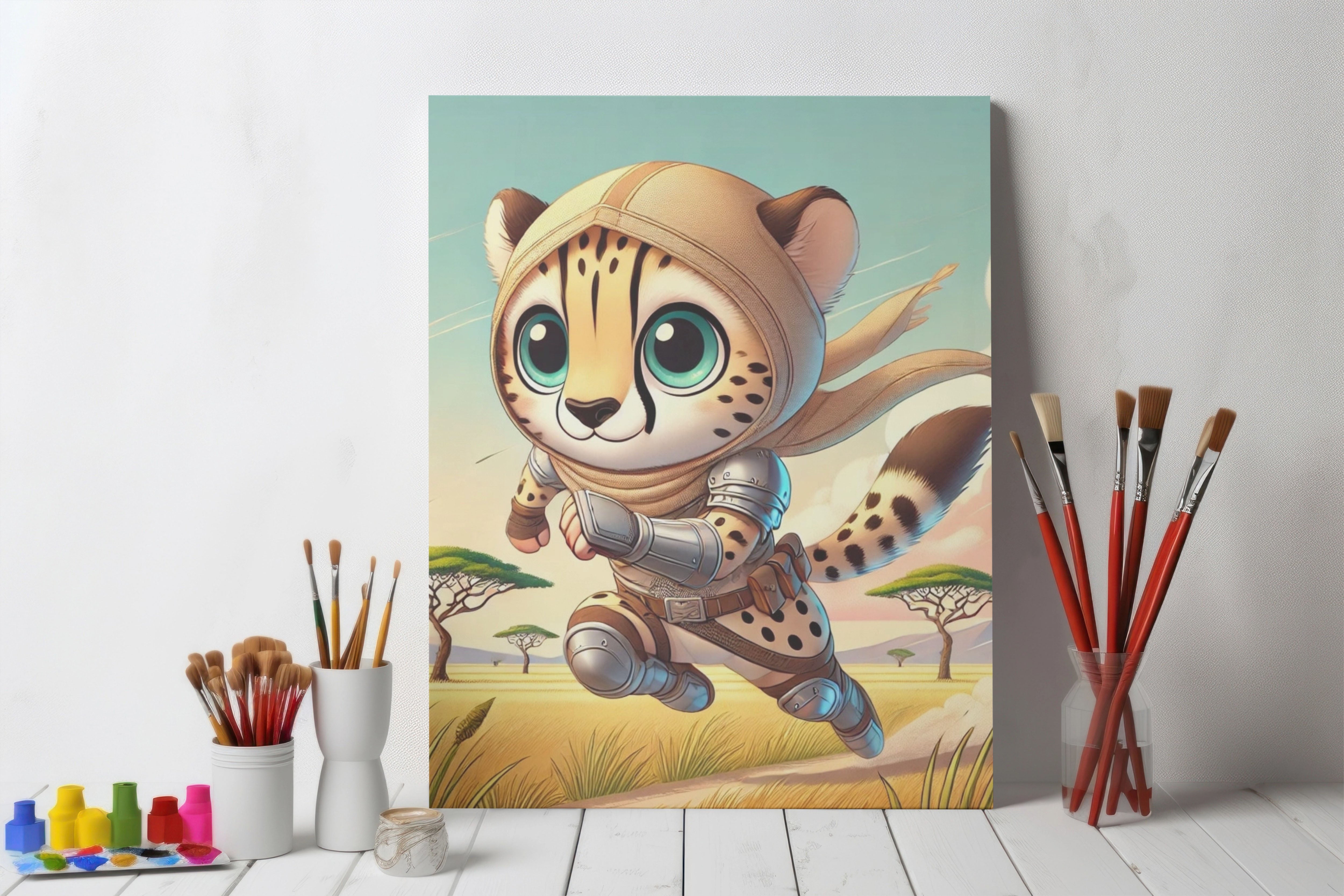 The striking illustration, Swift Cheetah, portrays a lightning-fast cheetah clad in light battle gear, racing across the open savanna. With bold strokes and vivid tones, the artwork captures the thrill of speed and the spirit of adventure while maintaining a whimsical charm. The motion-filled composition and expressive design convey both power and playfulness, making it a perfect piece for those who appreciate energy, imagination, and wild elegance.