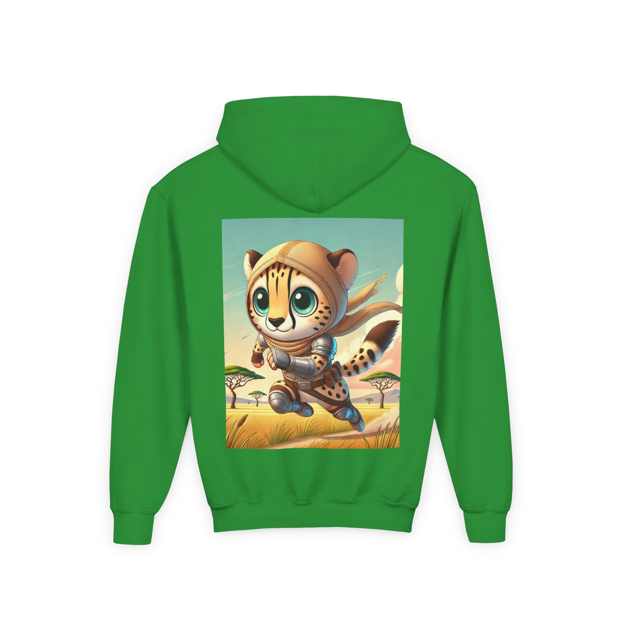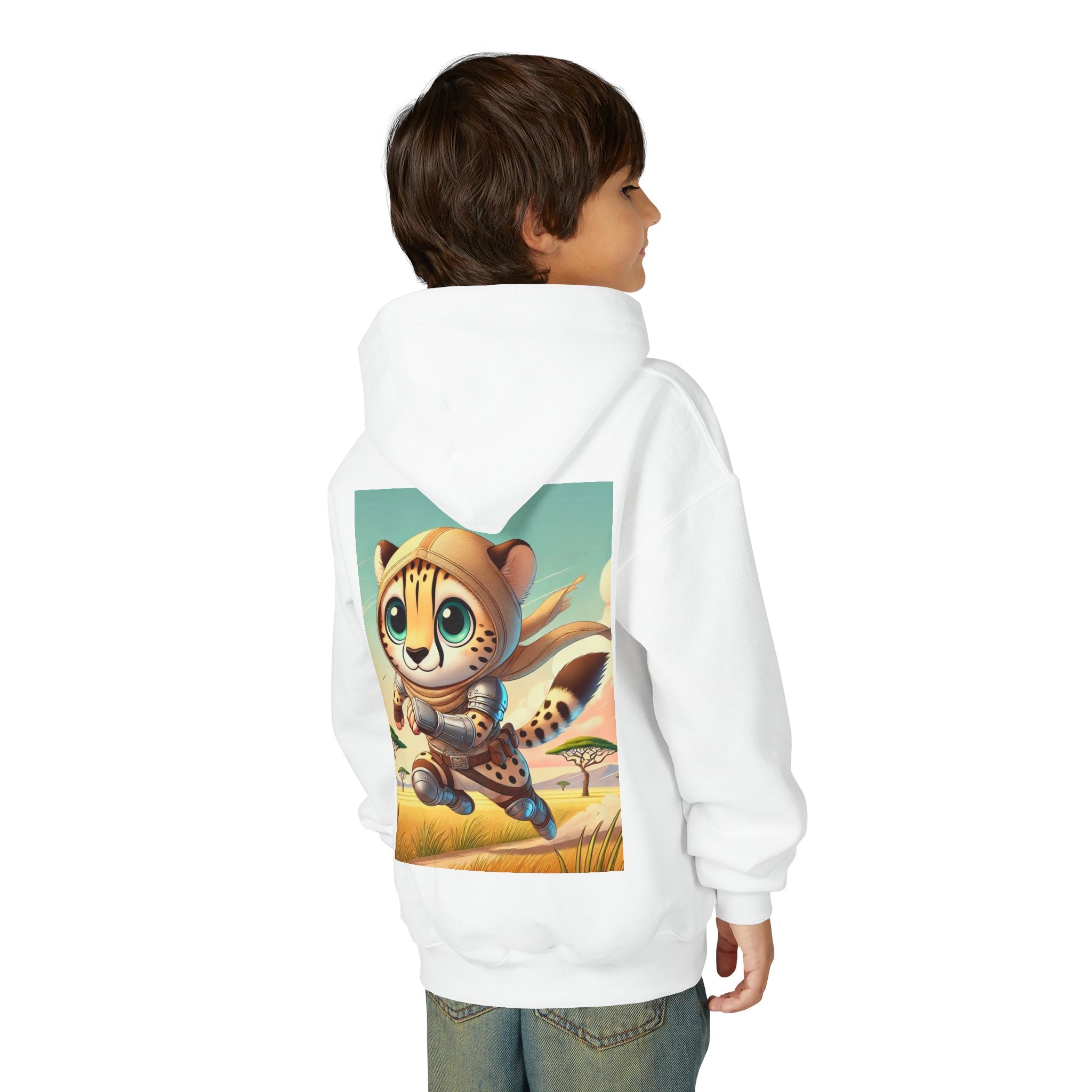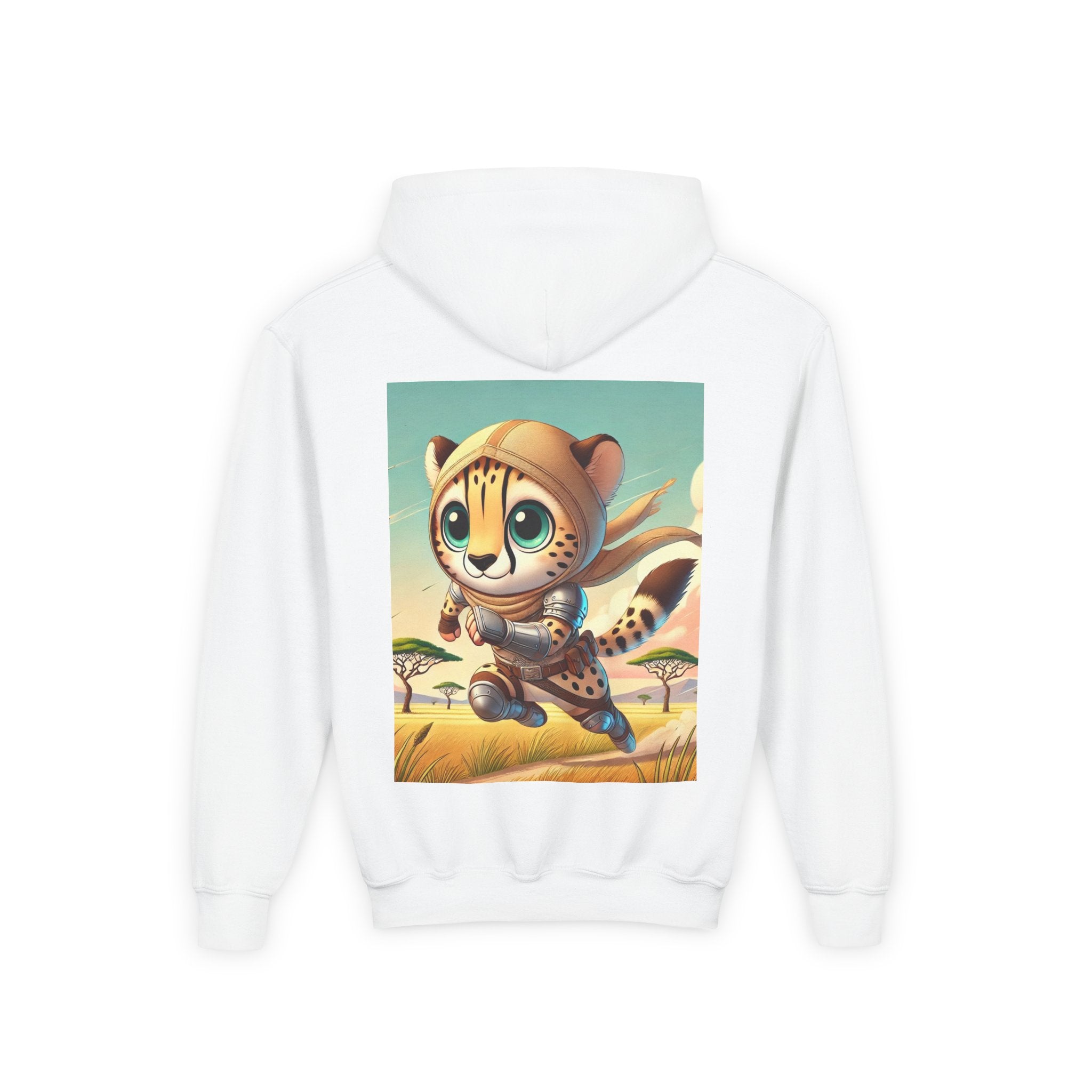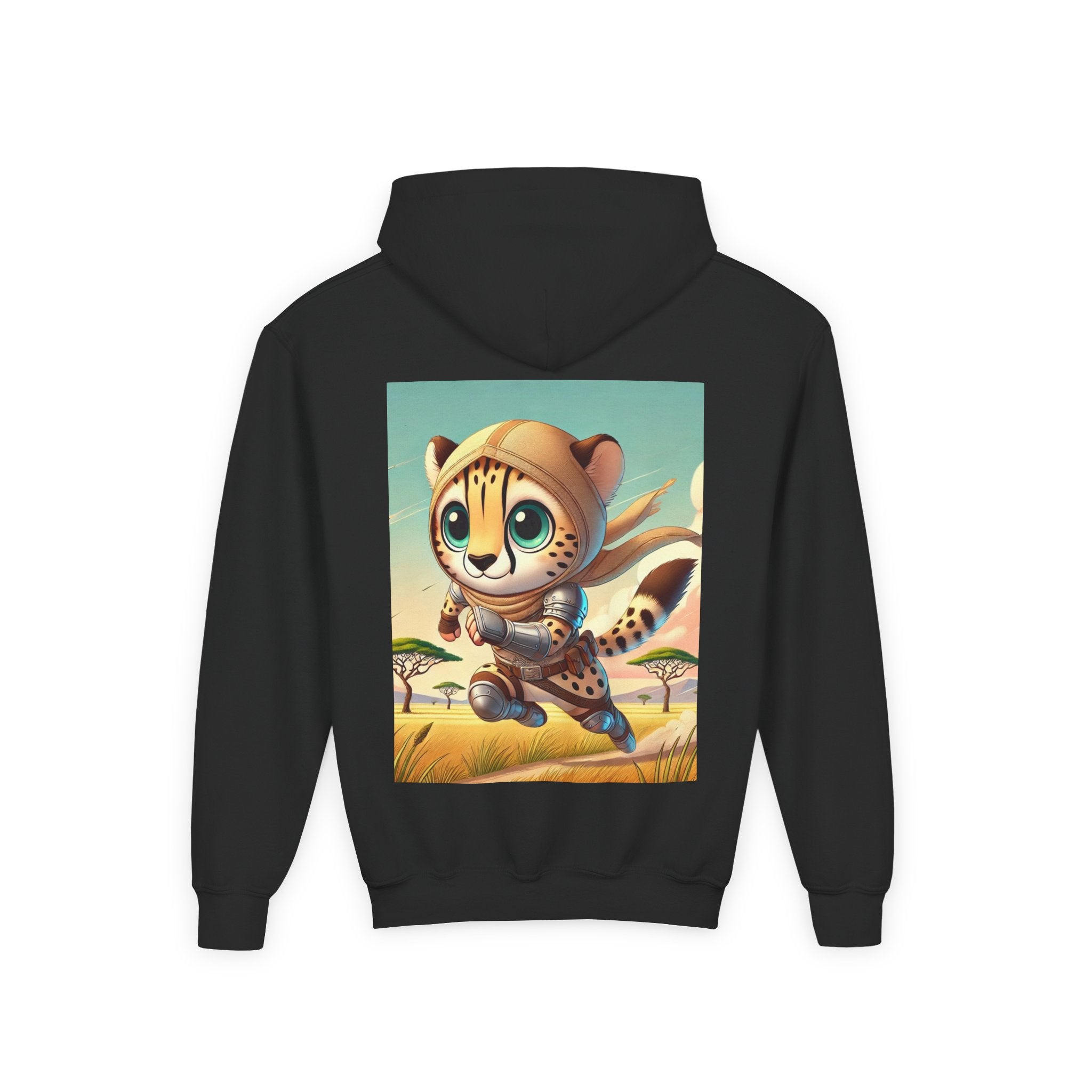 This whimsical illustration features a lightning-fast cheetah in light battle gear, racing across the open savanna with unstoppable energy. The vibrant artwork captures both speed and adventure, blending playful imagination with bold design. Perfect for young explorers and animal lovers, this hoodie brings excitement and color to any day.