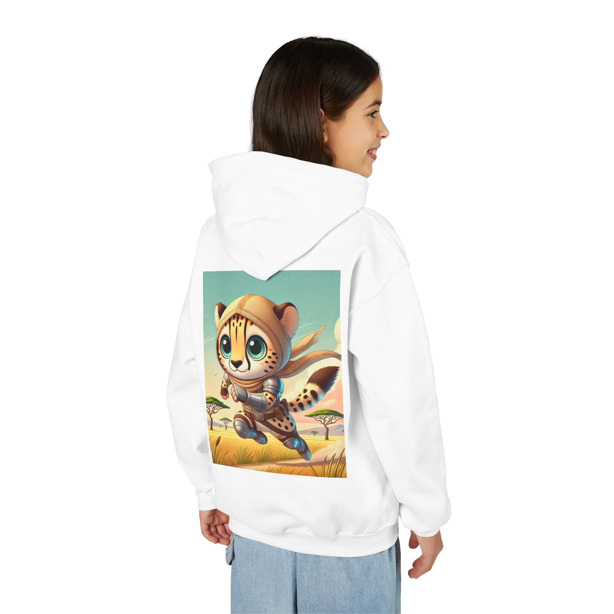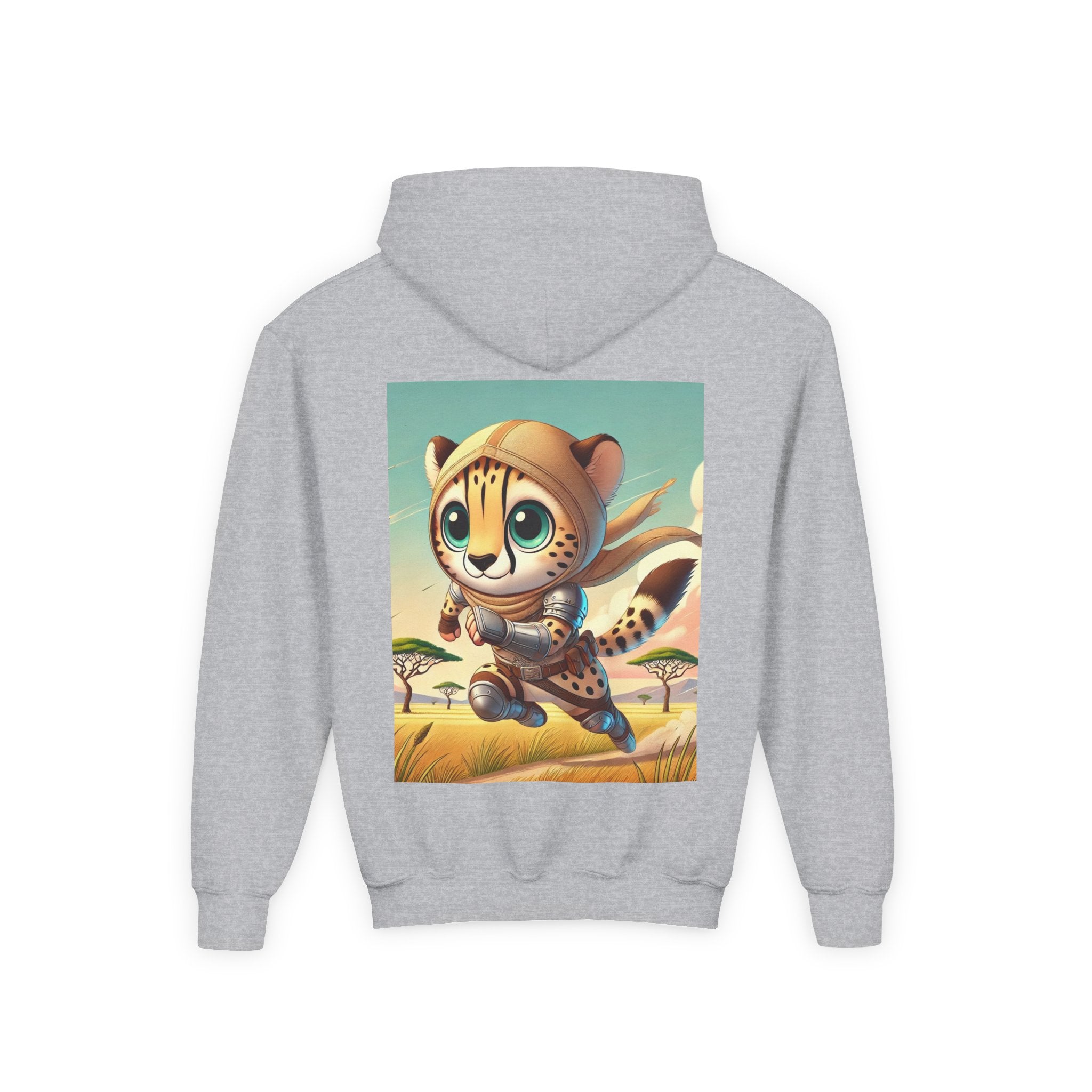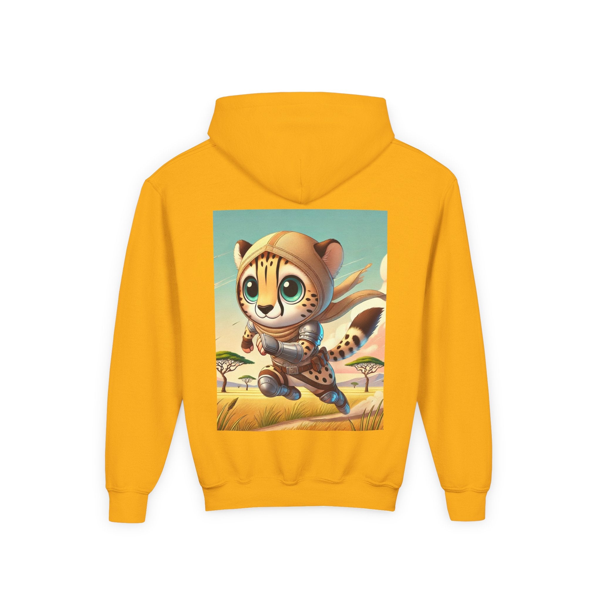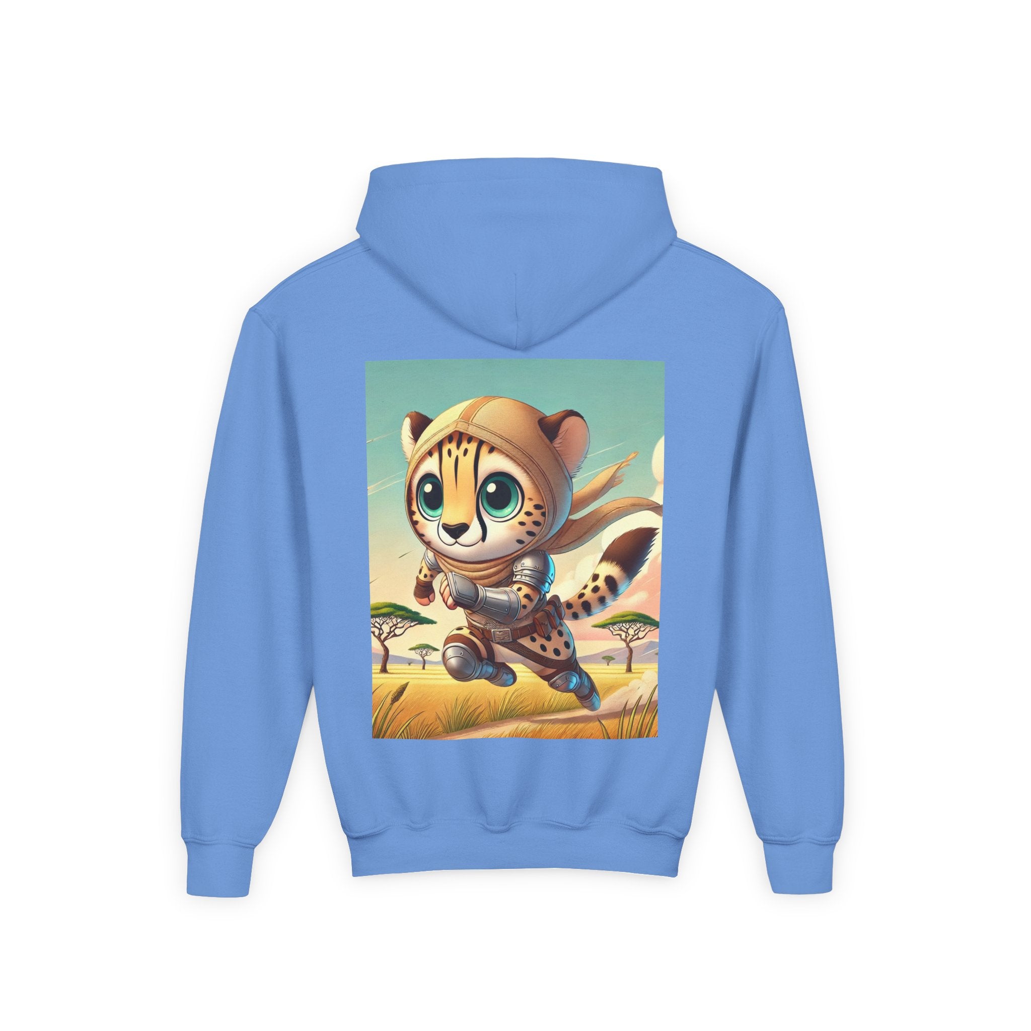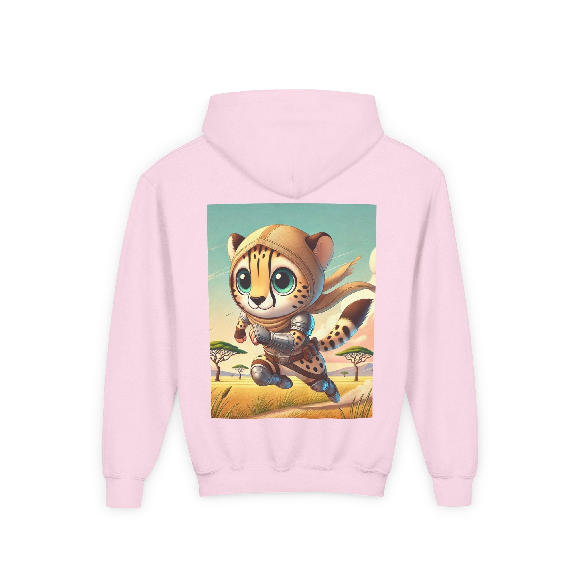 This whimsical illustration features a lightning-fast cheetah in light battle gear, racing across the open savanna with unstoppable energy. The vibrant artwork captures both speed and adventure, blending playful imagination with bold design. Perfect for young explorers and animal lovers, this hoodie brings excitement and color to any day.