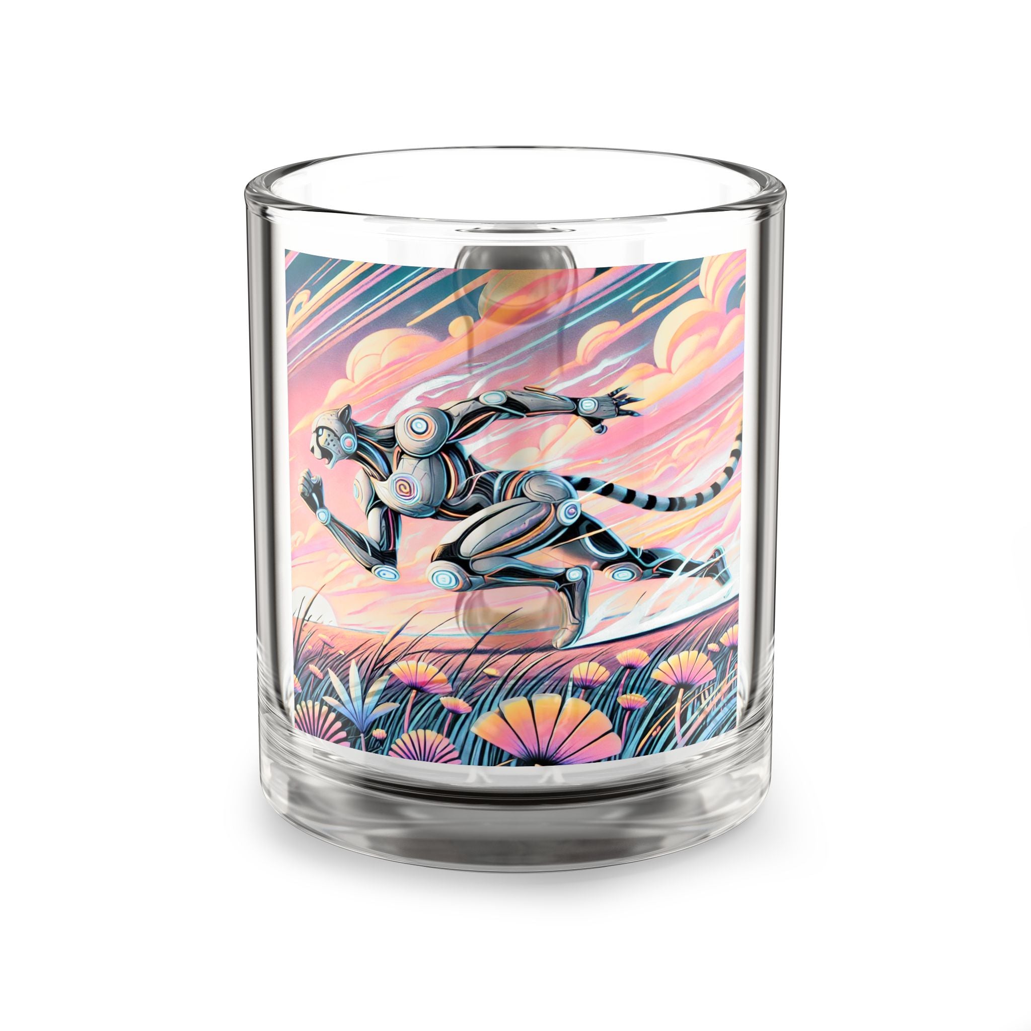 A dynamic illustration captures a cheetah in sleek, light battle gear, sprinting across the open savanna with breathtaking speed. The scene is set against a vibrant, colorful sunset sky, casting warm hues across the golden plains. The cheetah's armor is streamlined for agility, glinting subtly in the fading light as it races toward an unseen horizon—a striking blend of raw power, grace, and determination.