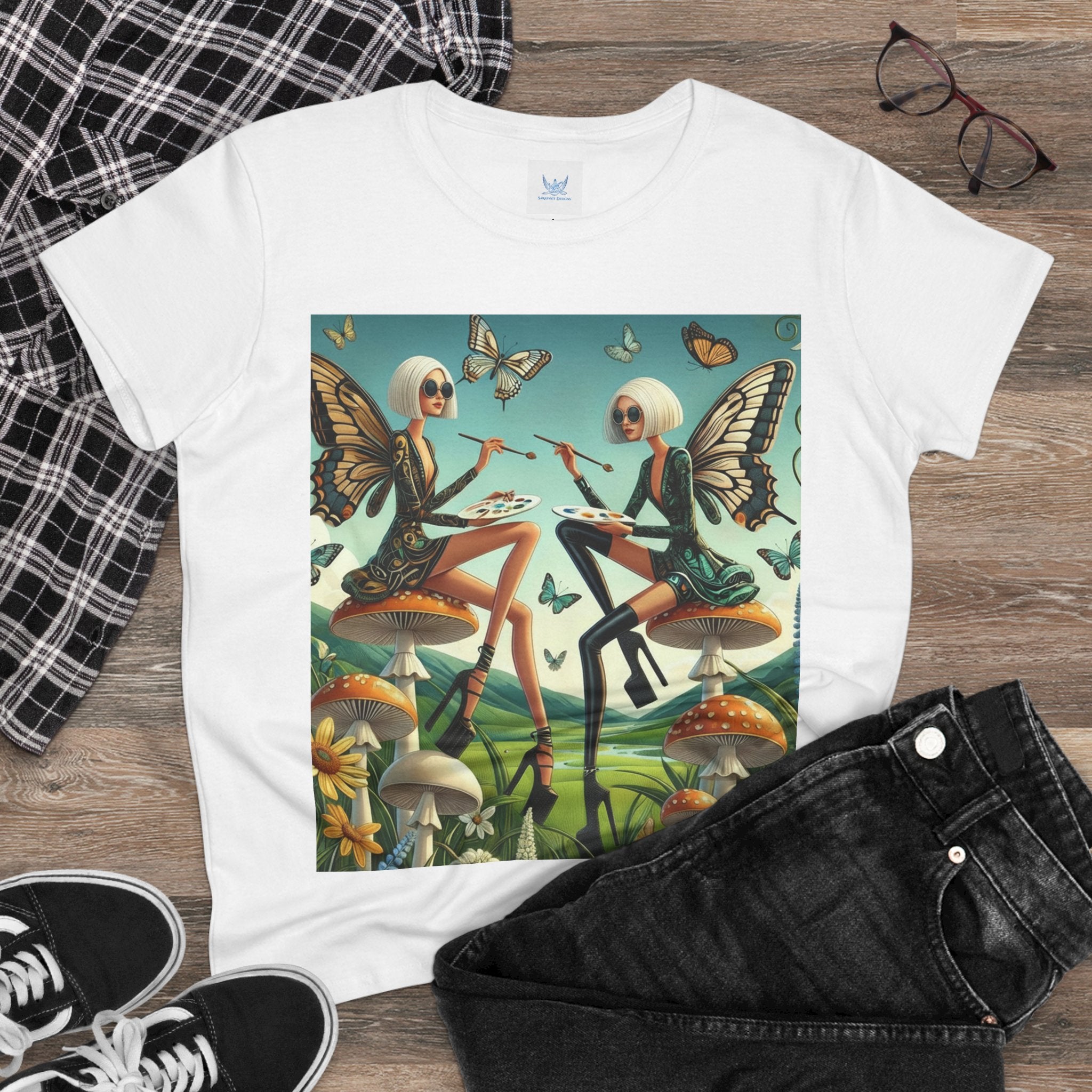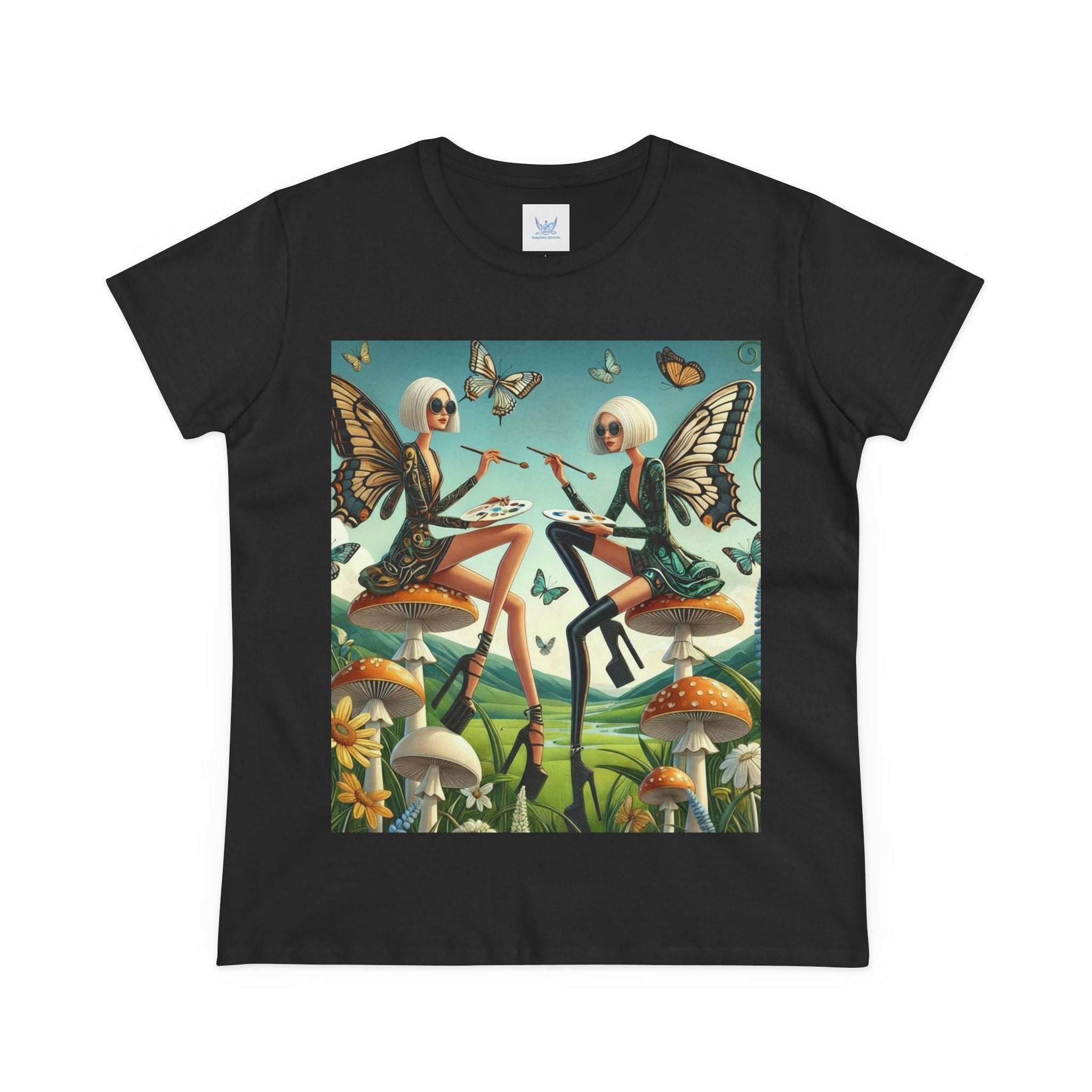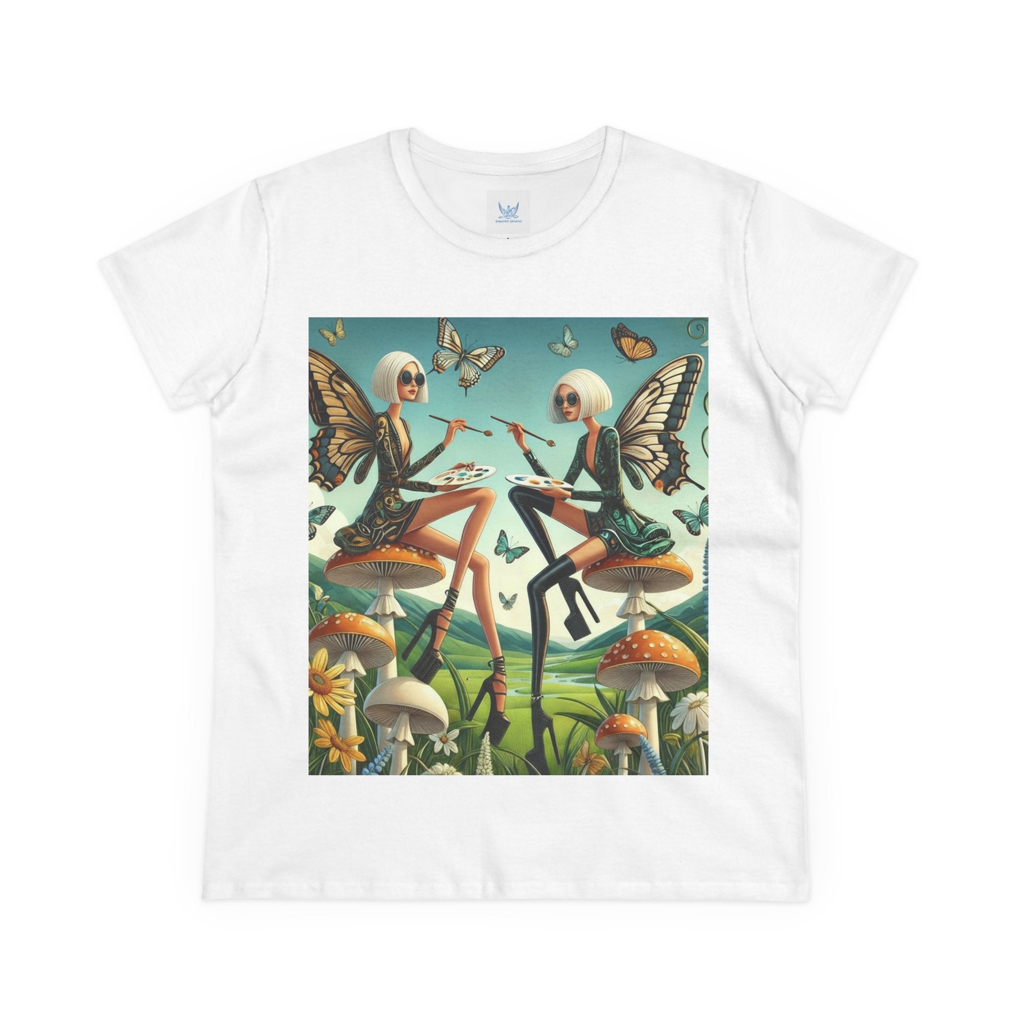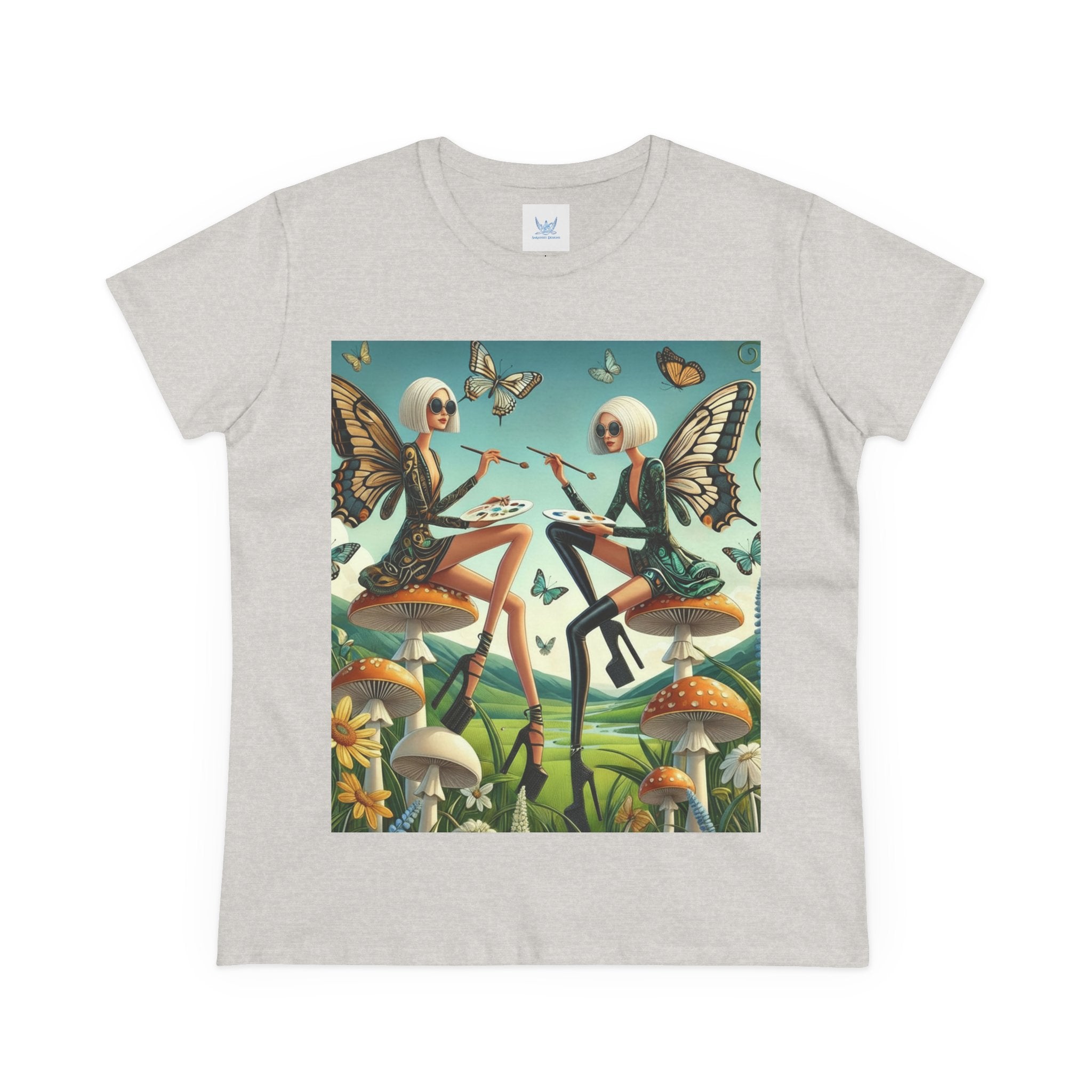 The Butterfly Atelier Cotton Tee What’s better than a soft, light cotton, quality t-shirt in your wardrobe? This comfy, contoured 100% cotton tee offers a semi-fitted silhouette and is pre-shrunk to ensure it stays a staple for longer. It features cap sleeves and a taped neck and shoulders. Paired with the dreamy artwork of The Butterfly Atelier, this tee brings a playful-yet-polished statement to everyday looks—two elegant fairy artists perched on sculptural toadstools, painting side by side beneath fluttering butterflies, curling vines, and a serene teal sky. The scene blends high-fashion attitude with storybook charm, turning casual comfort into wearable imagination.