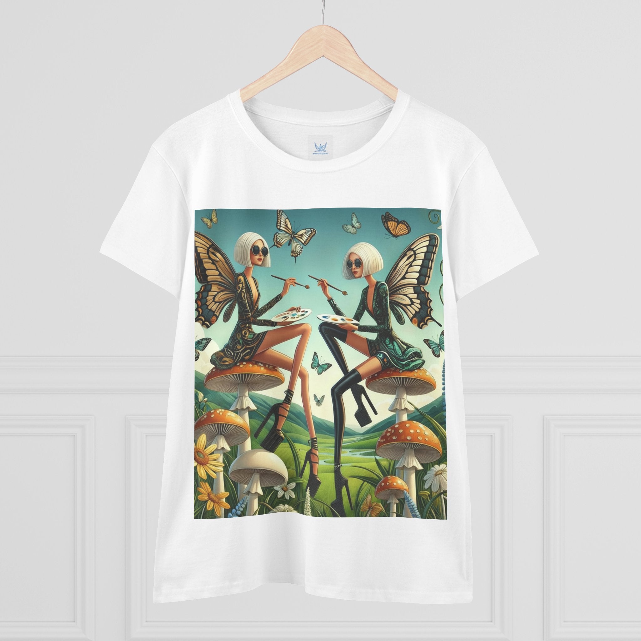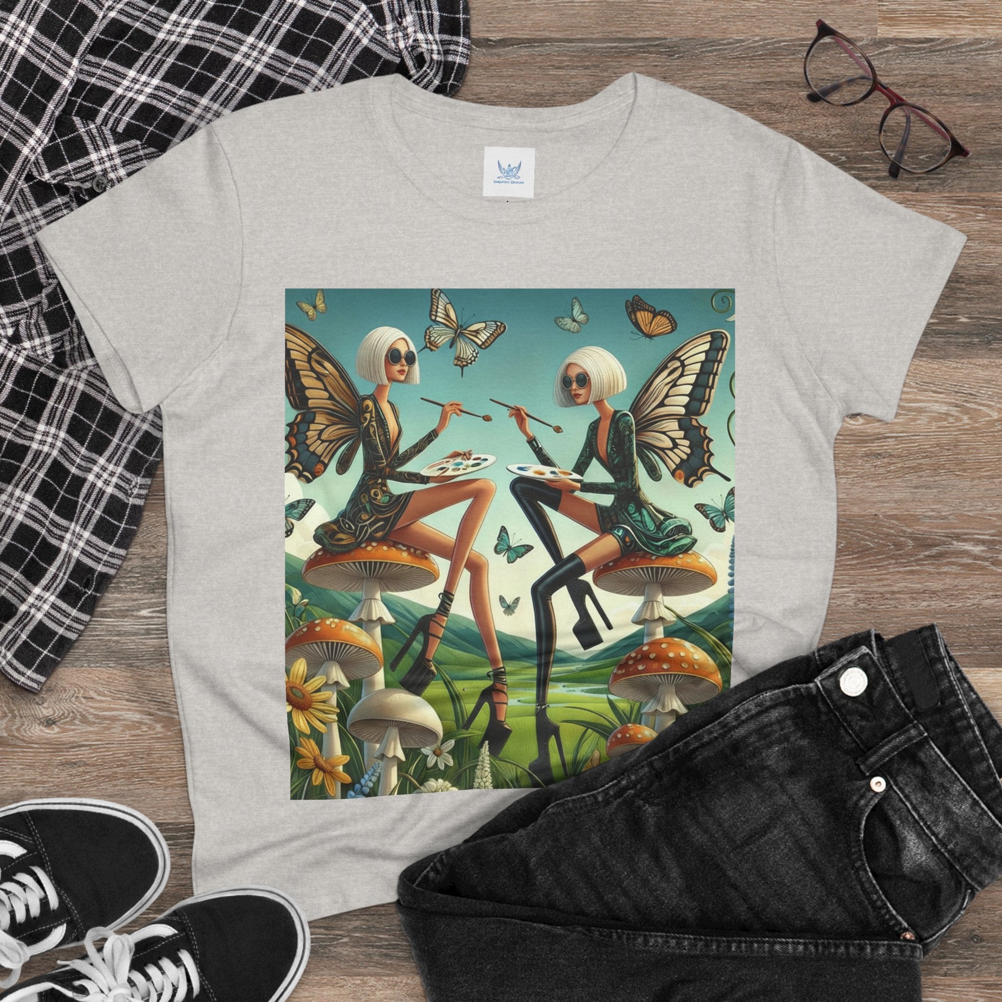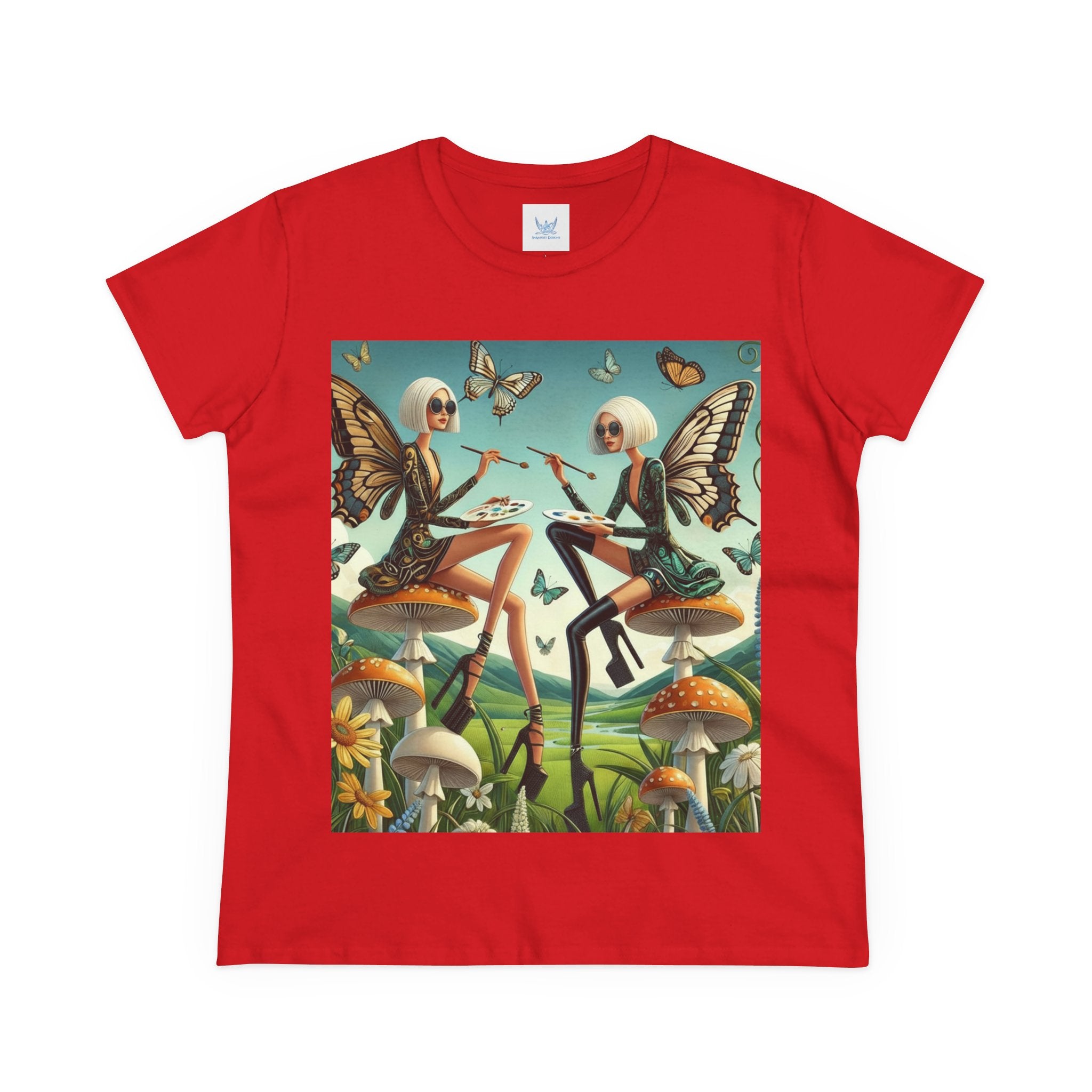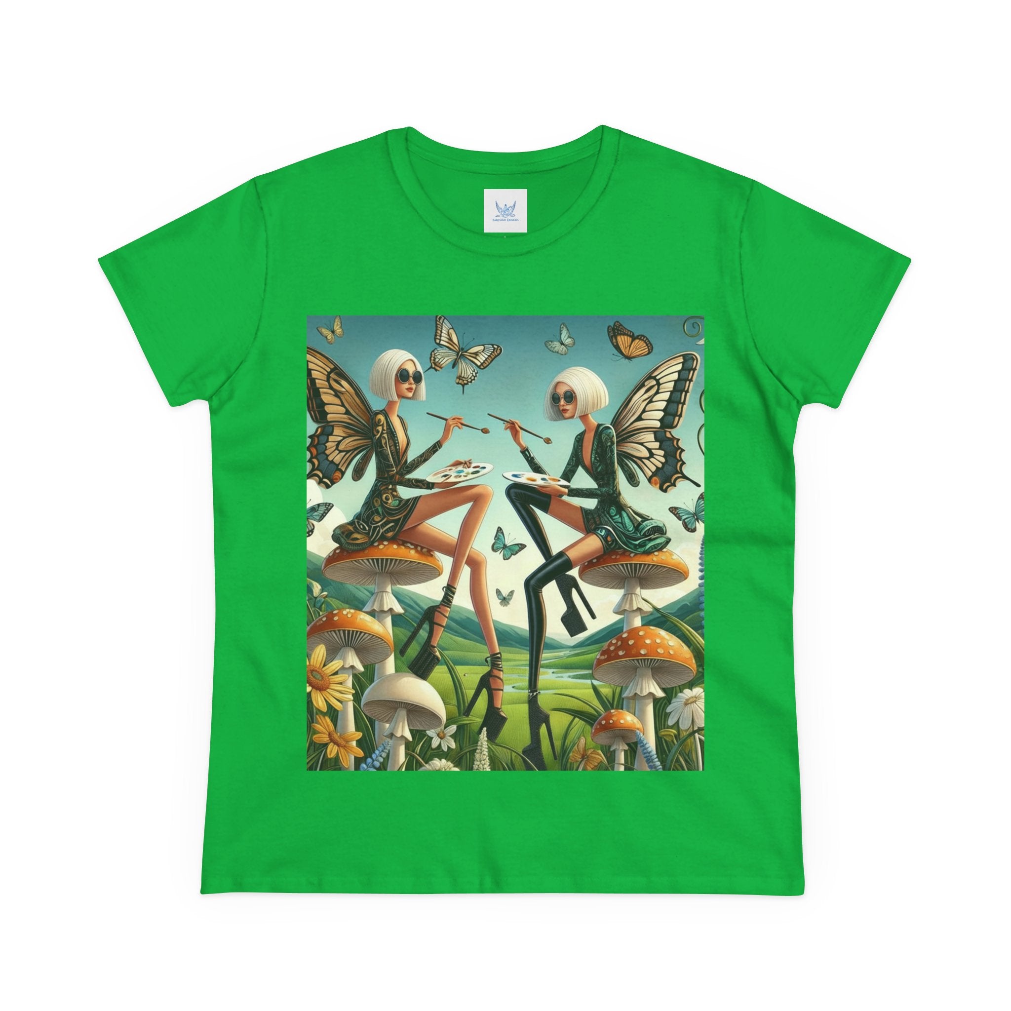 The Butterfly Atelier Cotton Tee What’s better than a soft, light cotton, quality t-shirt in your wardrobe? This comfy, contoured 100% cotton tee offers a semi-fitted silhouette and is pre-shrunk to ensure it stays a staple for longer. It features cap sleeves and a taped neck and shoulders. Paired with the dreamy artwork of The Butterfly Atelier, this tee brings a playful-yet-polished statement to everyday looks—two elegant fairy artists perched on sculptural toadstools, painting side by side beneath fluttering butterflies, curling vines, and a serene teal sky. The scene blends high-fashion attitude with storybook charm, turning casual comfort into wearable imagination.