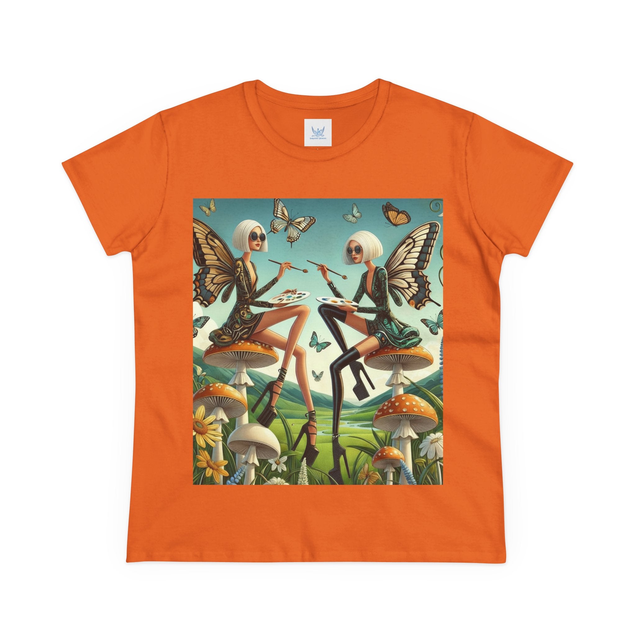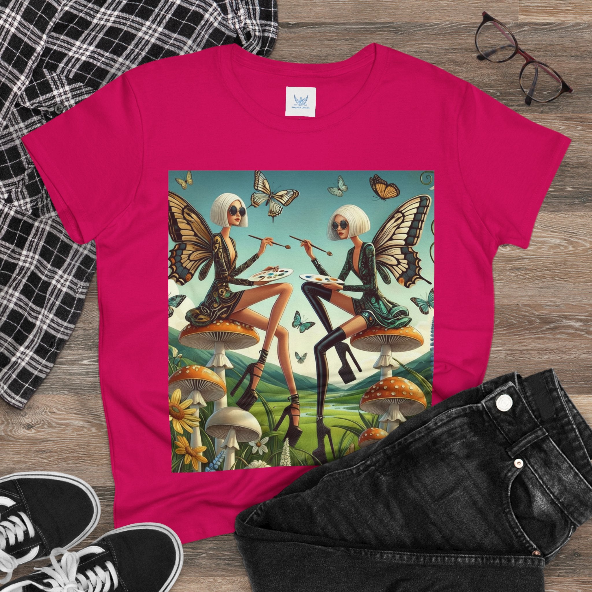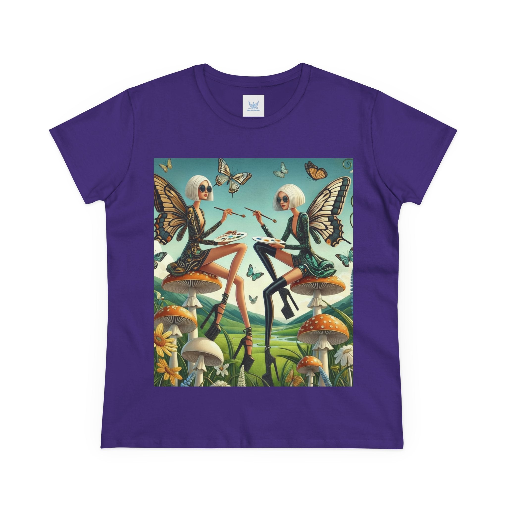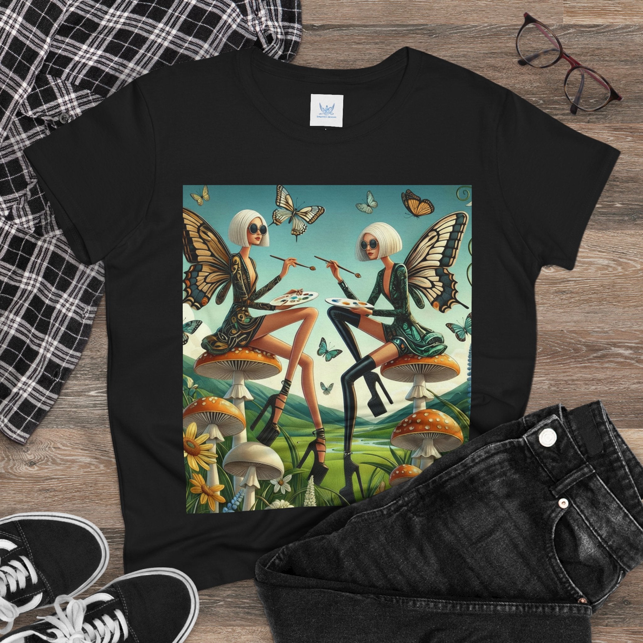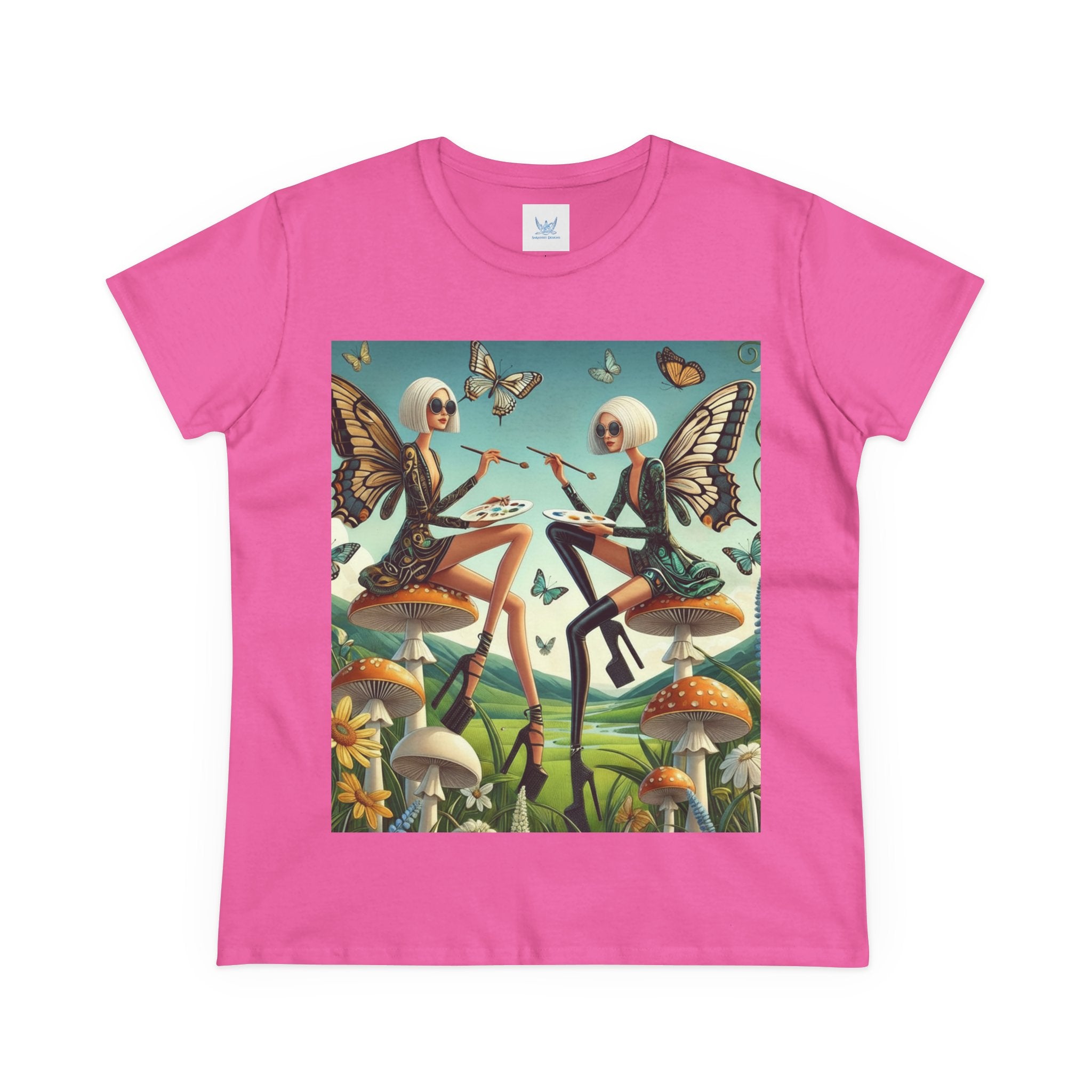 The Butterfly Atelier Cotton Tee What’s better than a soft, light cotton, quality t-shirt in your wardrobe? This comfy, contoured 100% cotton tee offers a semi-fitted silhouette and is pre-shrunk to ensure it stays a staple for longer. It features cap sleeves and a taped neck and shoulders. Paired with the dreamy artwork of The Butterfly Atelier, this tee brings a playful-yet-polished statement to everyday looks—two elegant fairy artists perched on sculptural toadstools, painting side by side beneath fluttering butterflies, curling vines, and a serene teal sky. The scene blends high-fashion attitude with storybook charm, turning casual comfort into wearable imagination.