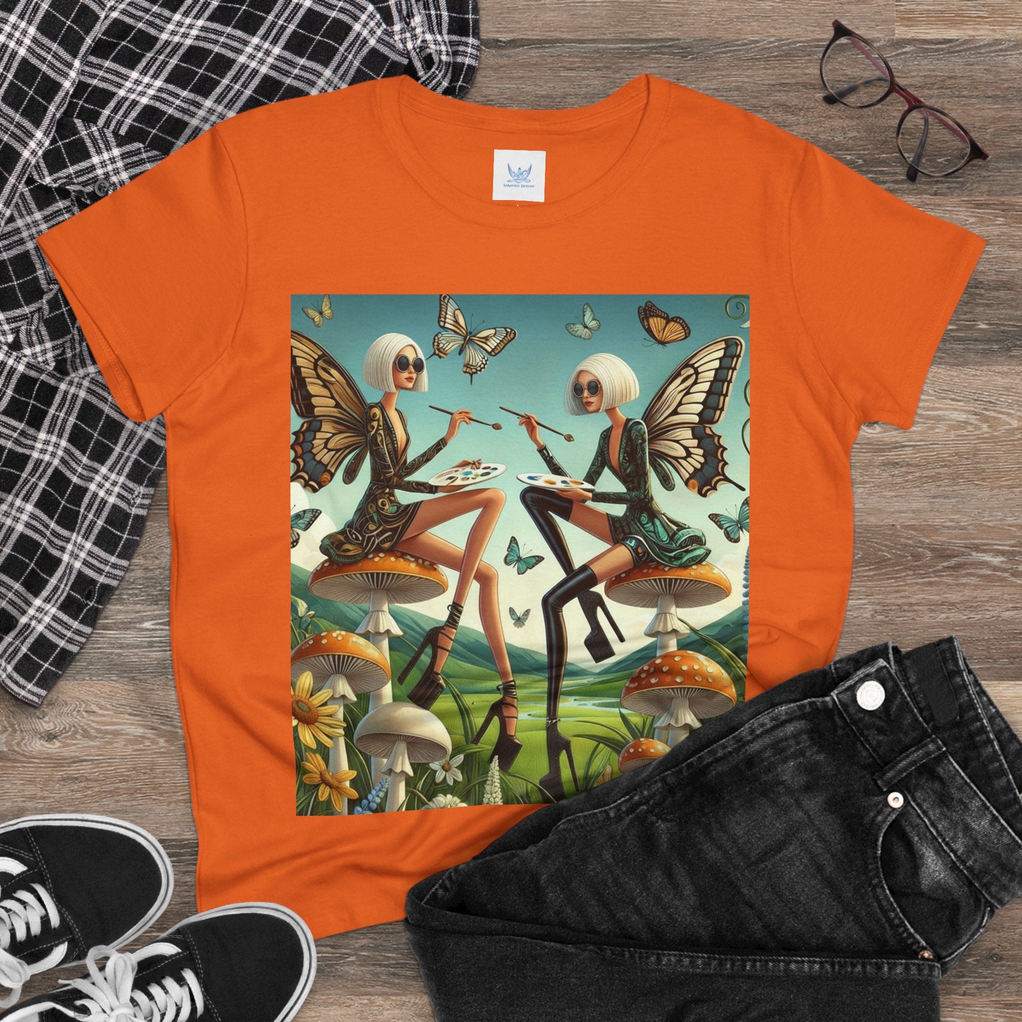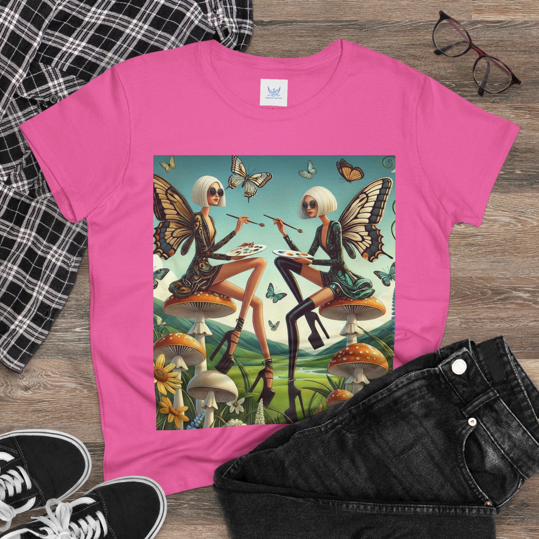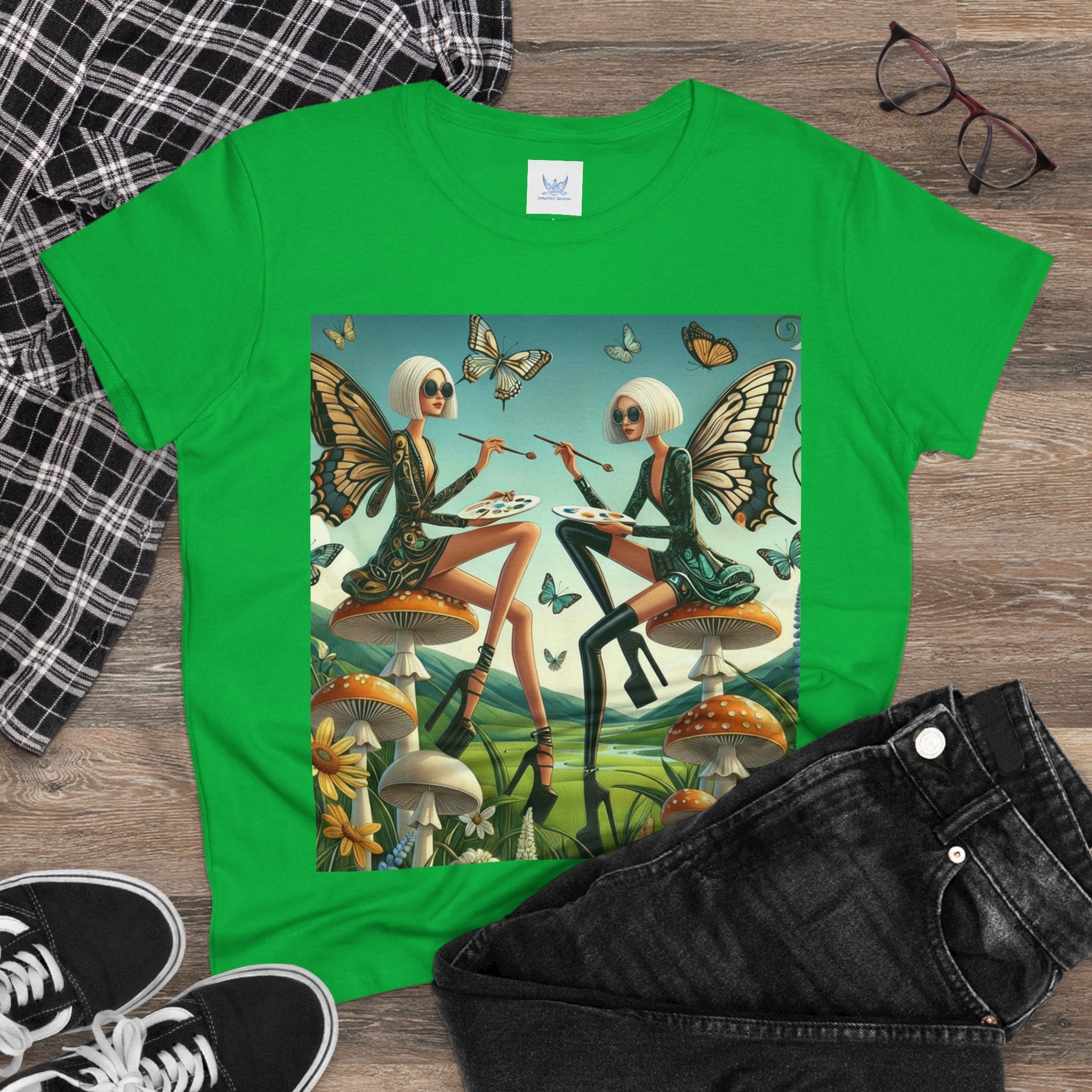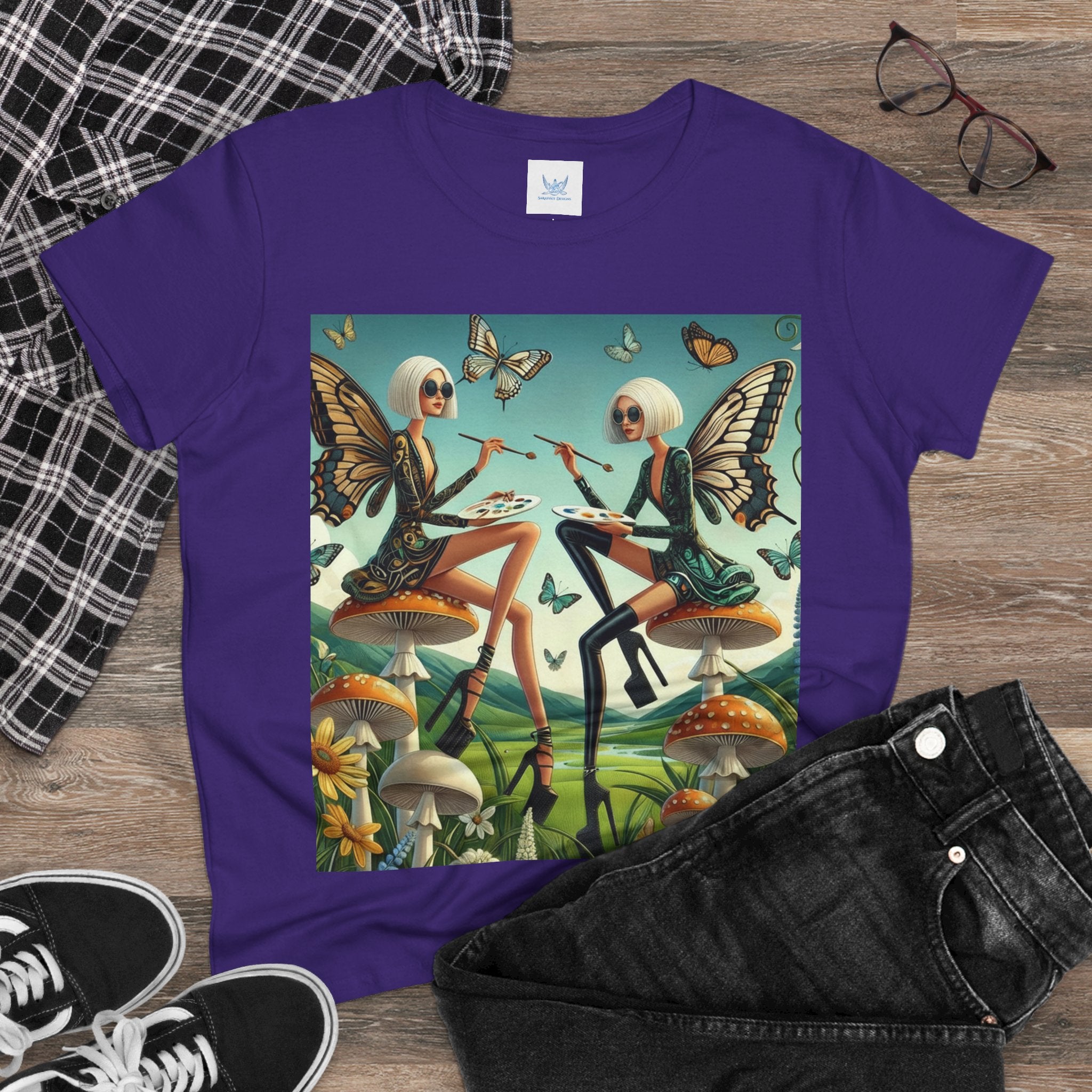 The Butterfly Atelier Cotton Tee What’s better than a soft, light cotton, quality t-shirt in your wardrobe? This comfy, contoured 100% cotton tee offers a semi-fitted silhouette and is pre-shrunk to ensure it stays a staple for longer. It features cap sleeves and a taped neck and shoulders. Paired with the dreamy artwork of The Butterfly Atelier, this tee brings a playful-yet-polished statement to everyday looks—two elegant fairy artists perched on sculptural toadstools, painting side by side beneath fluttering butterflies, curling vines, and a serene teal sky. The scene blends high-fashion attitude with storybook charm, turning casual comfort into wearable imagination.