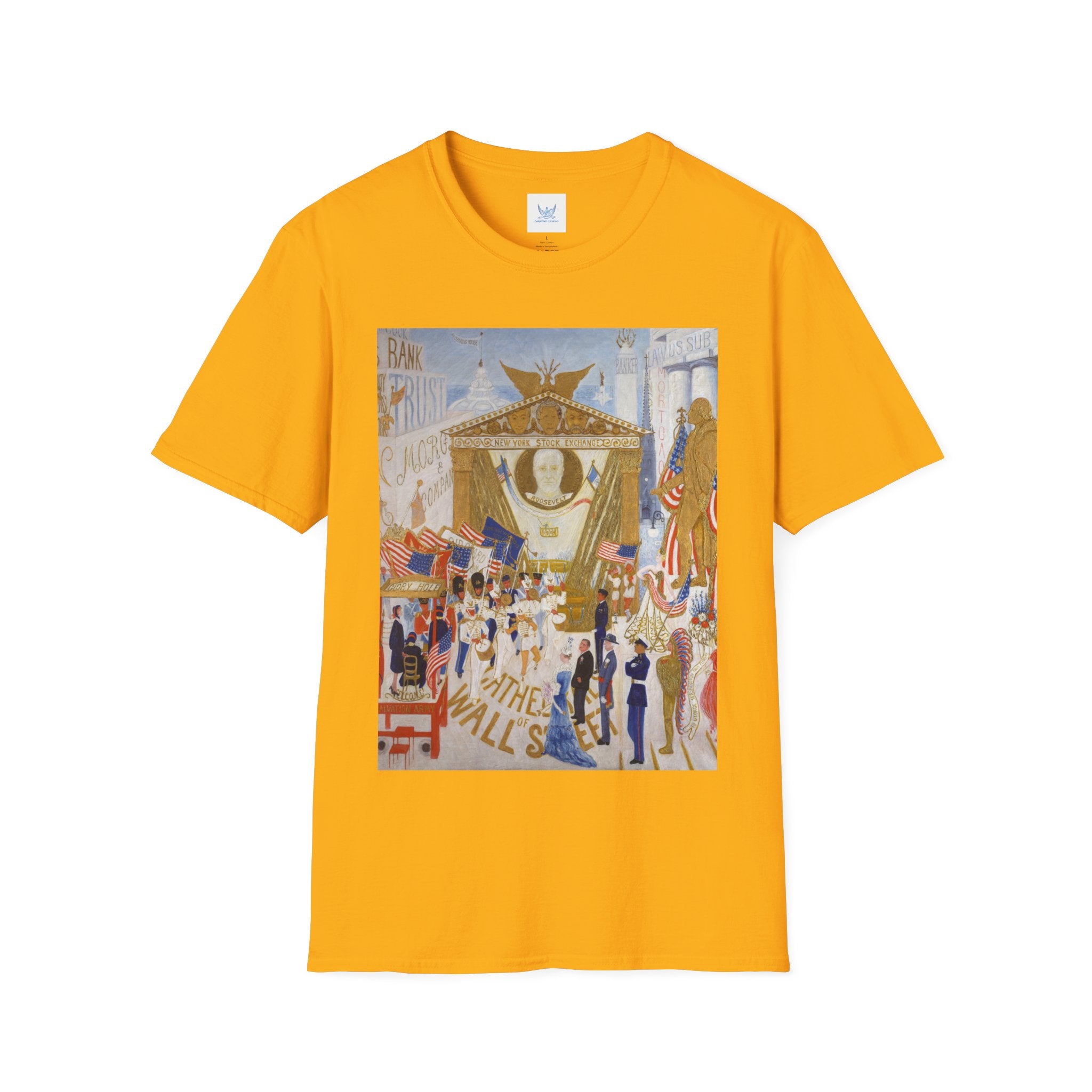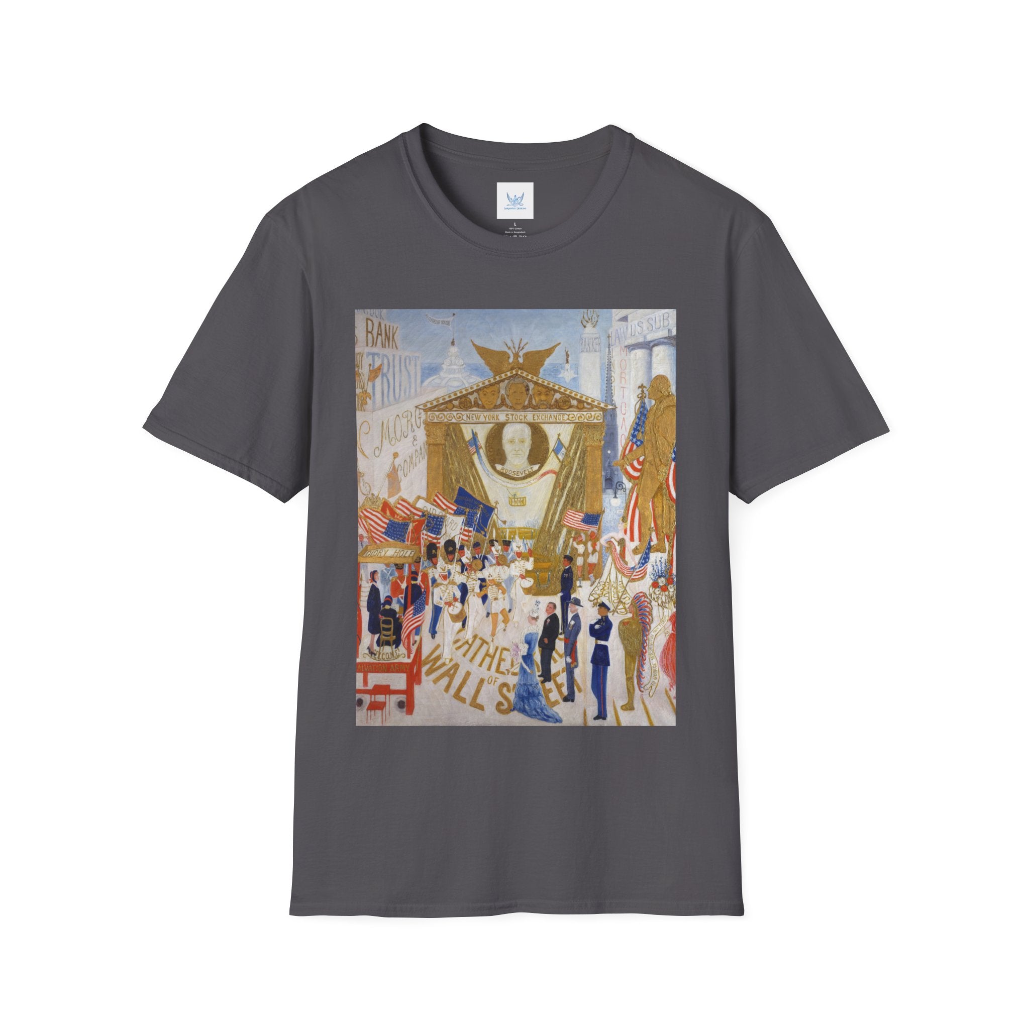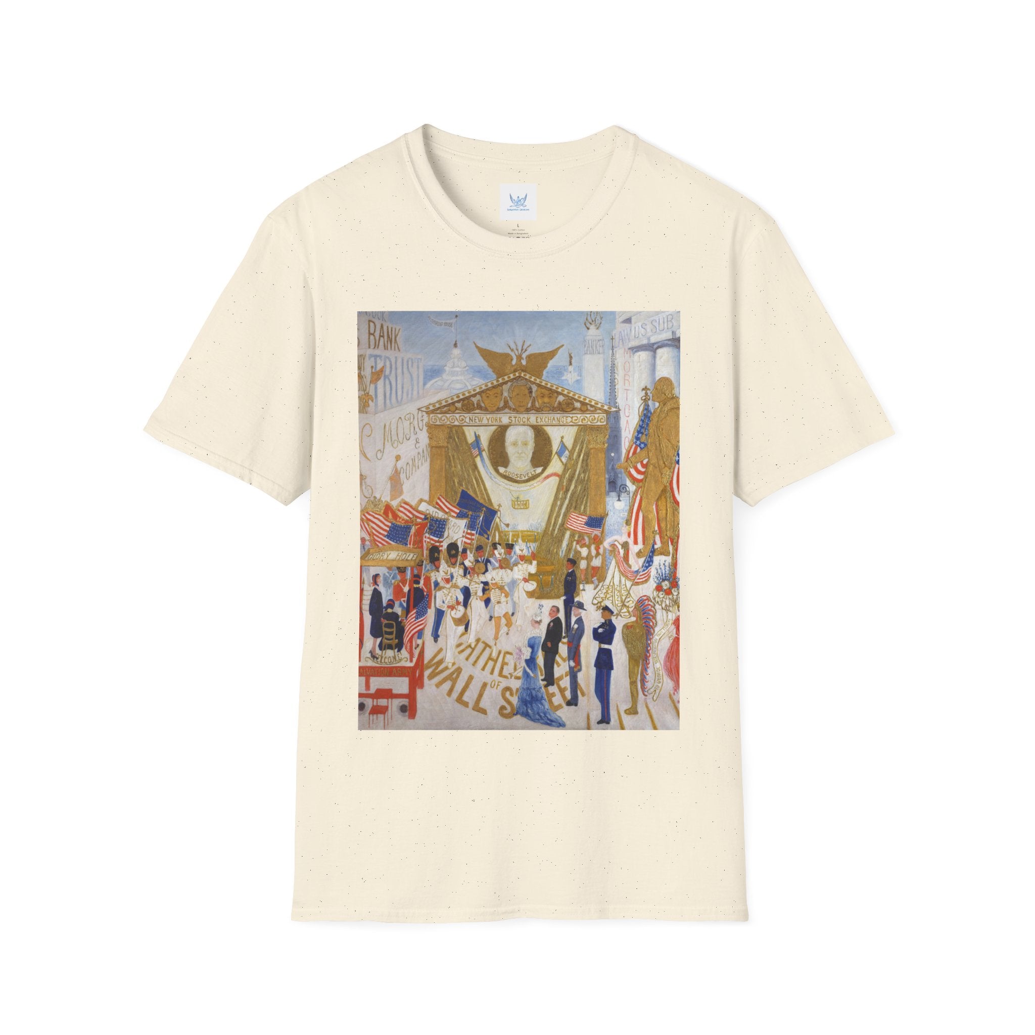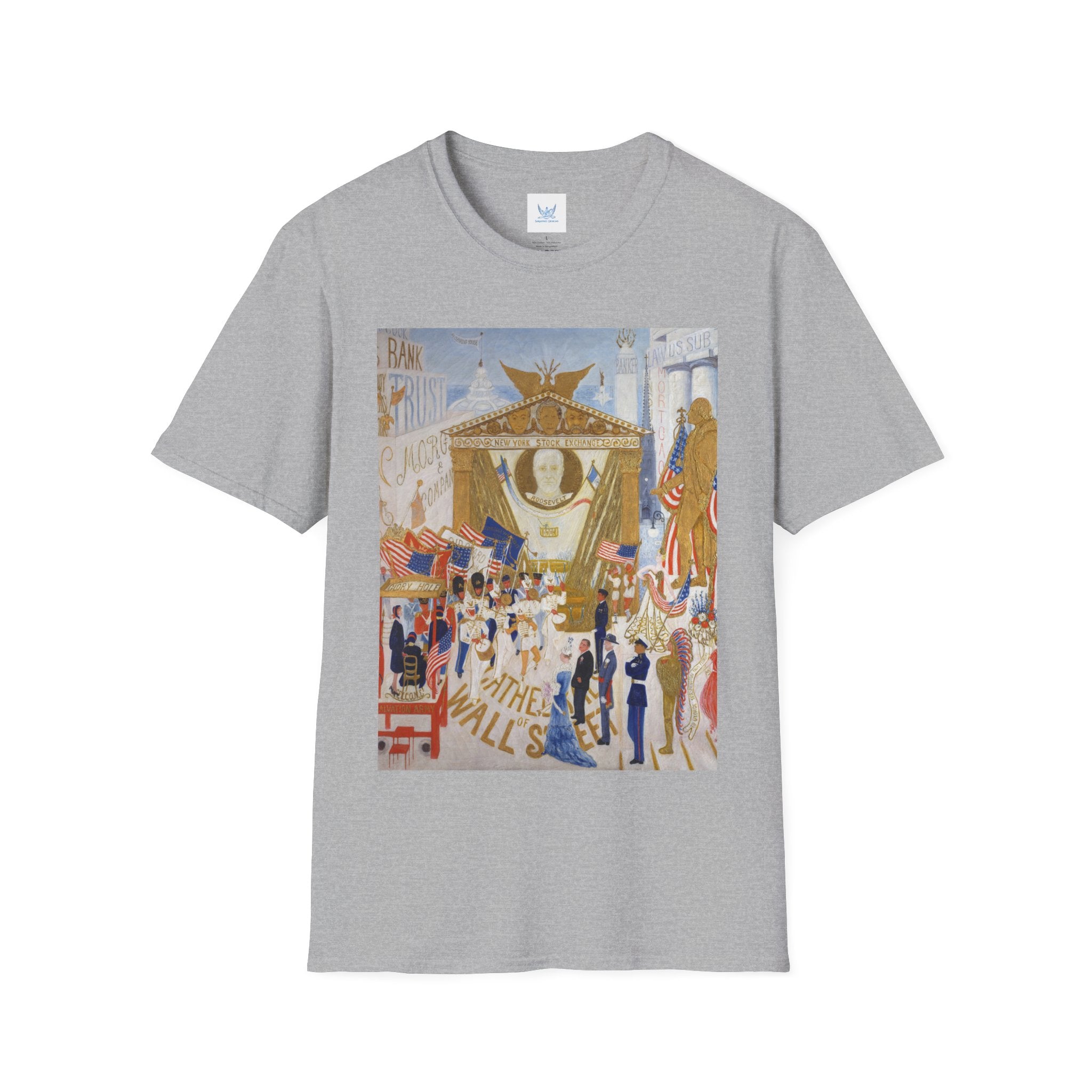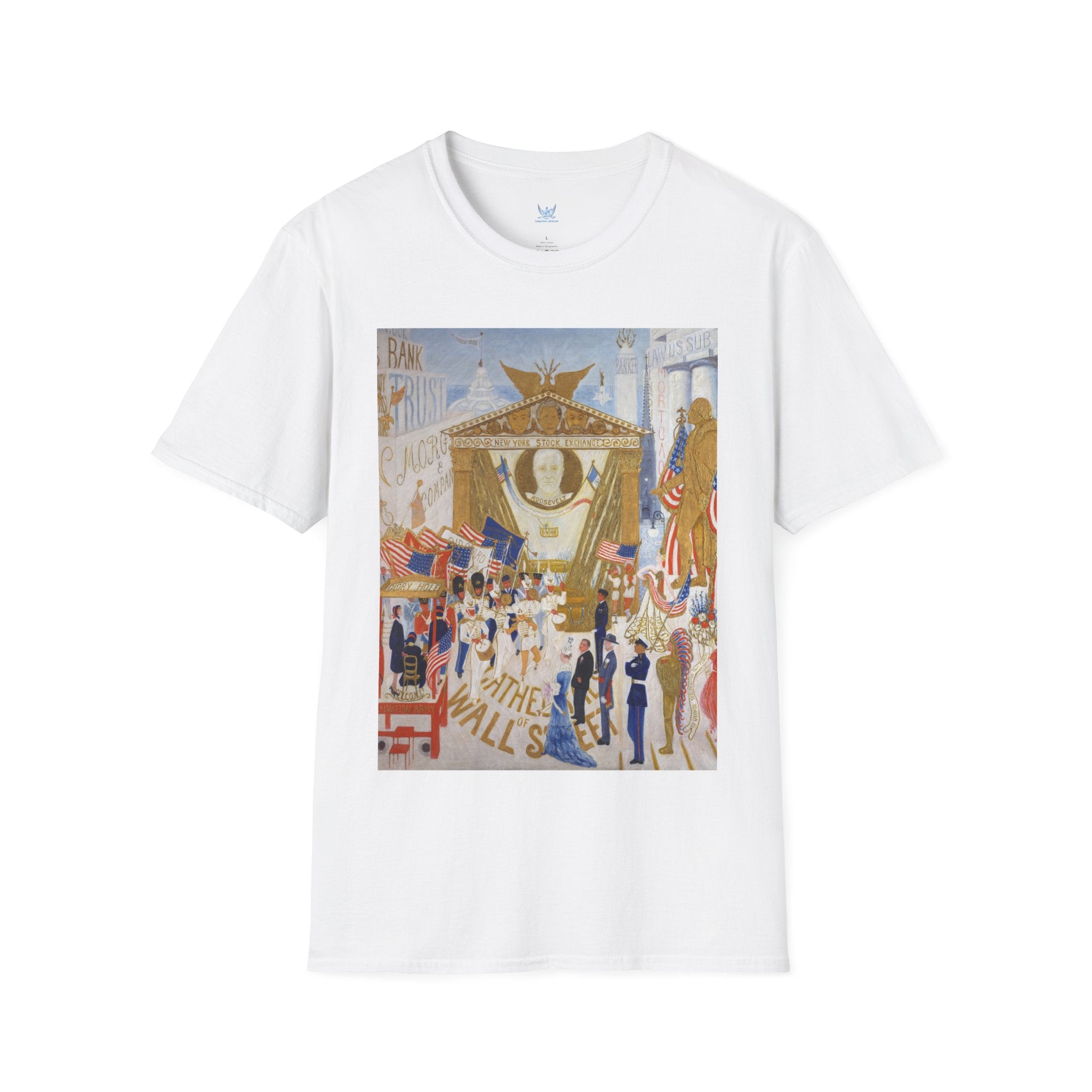 The Cathedrals of Wall Street Softstyle T-Shirt brings Florine Stettheimer’s witty modernist vision to life. In her vibrant painting, Wall Street’s towering buildings become ornate cathedrals — a playful, satirical take on the grandeur and excess of New York’s financial world. The scene brims with color, movement, and Stettheimer’s signature blend of elegance and irony.