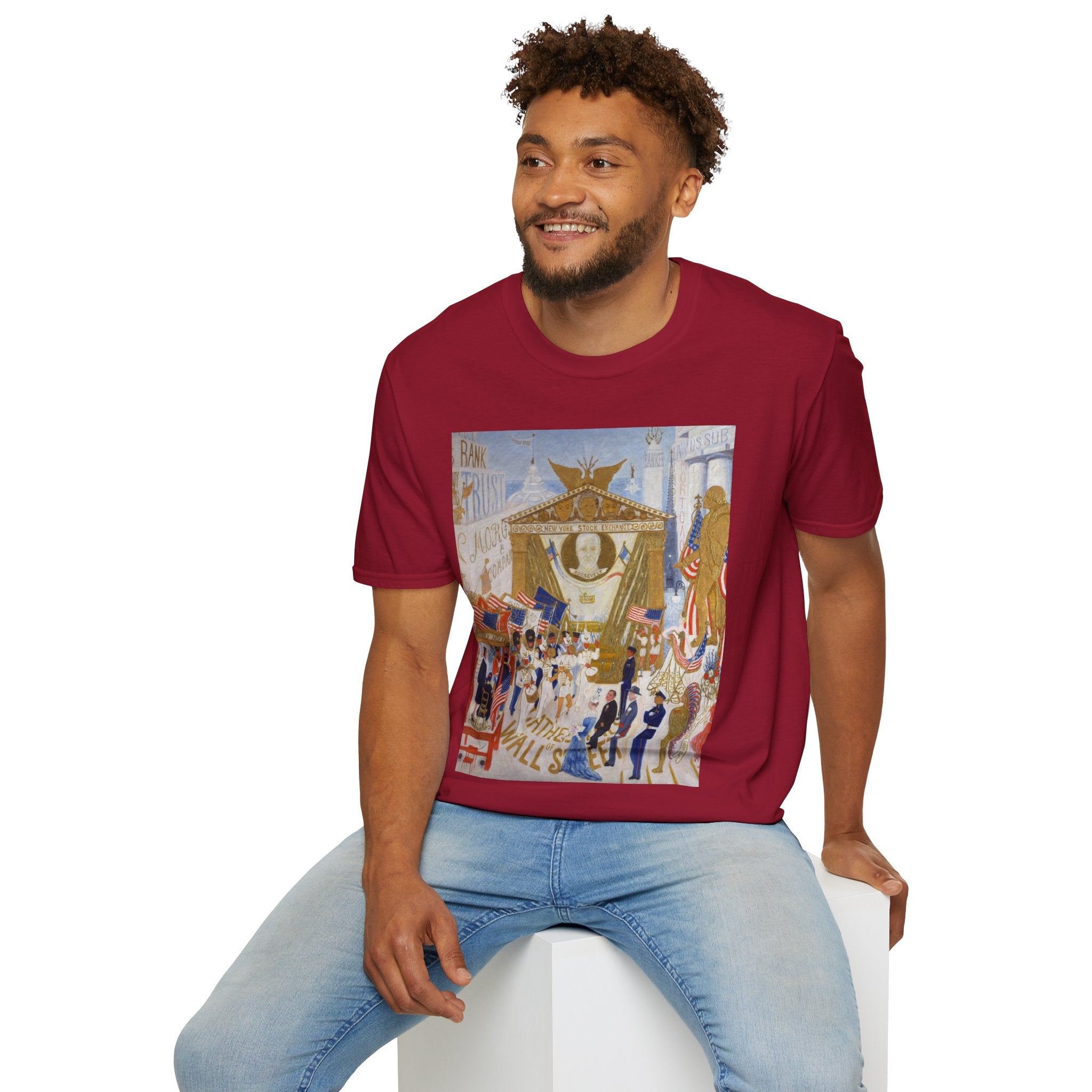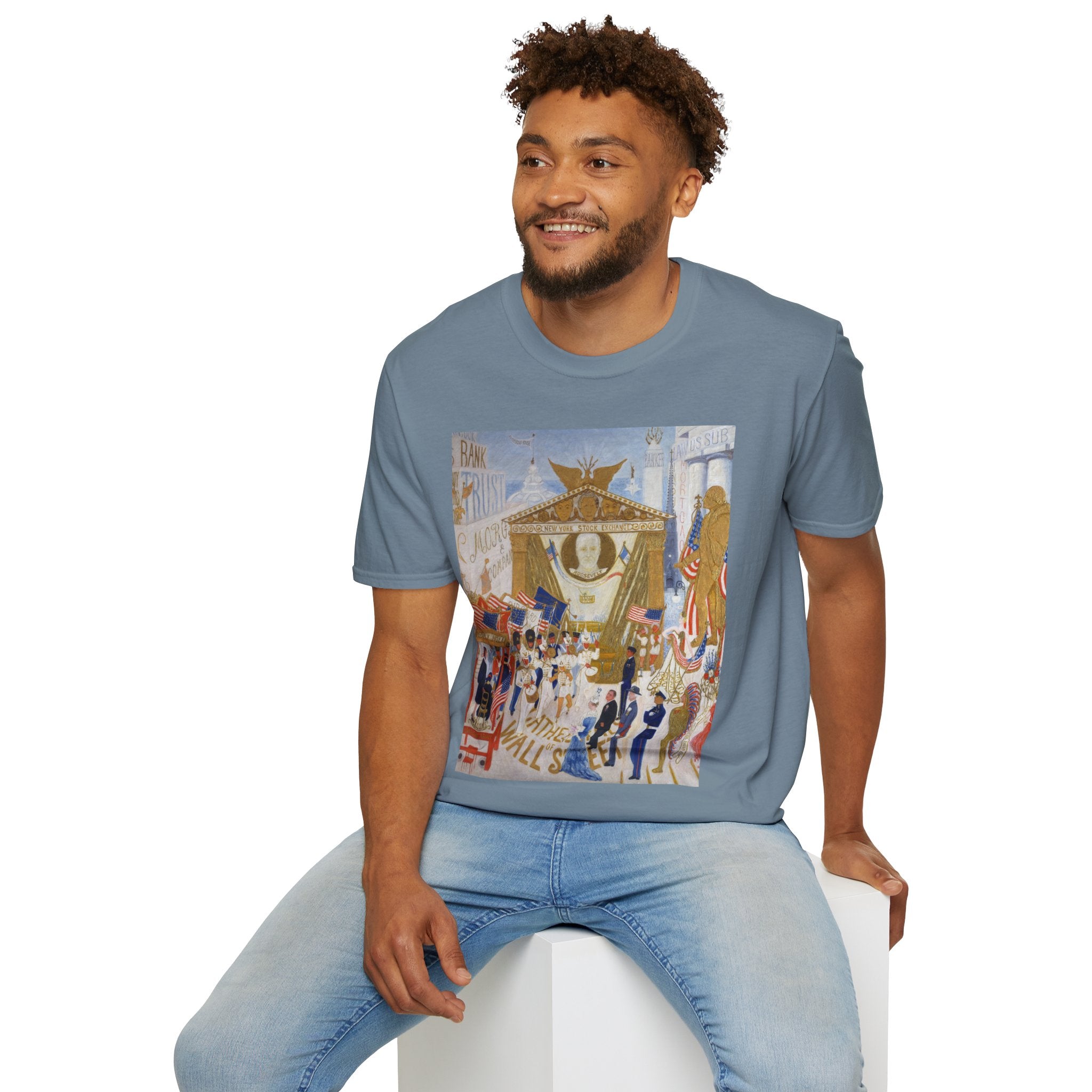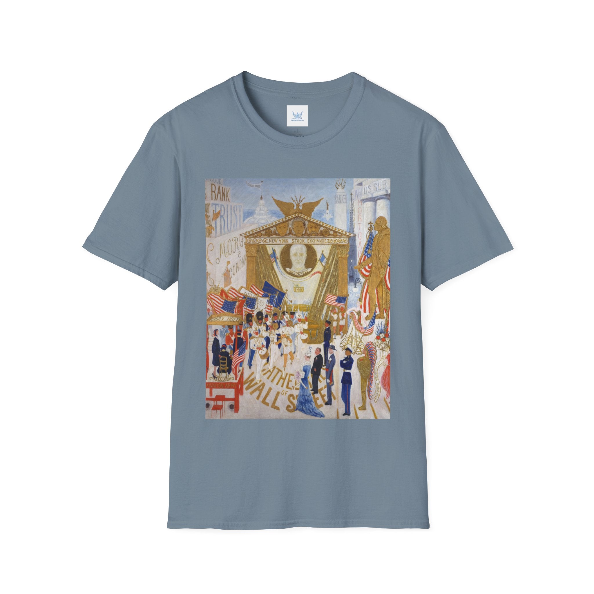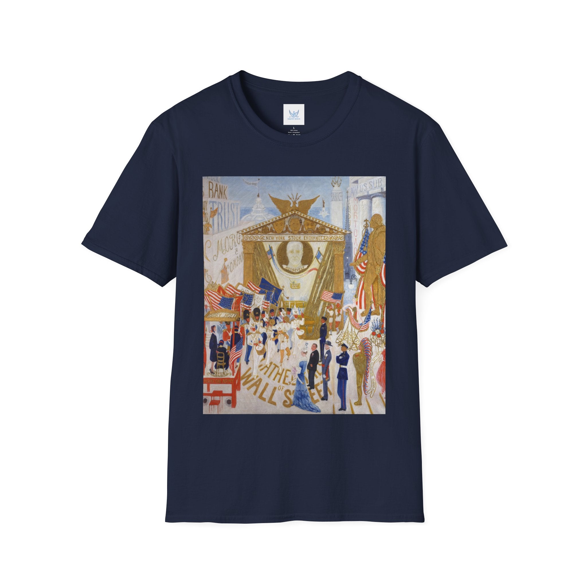 The Cathedrals of Wall Street Softstyle T-Shirt brings Florine Stettheimer’s witty modernist vision to life. In her vibrant painting, Wall Street’s towering buildings become ornate cathedrals — a playful, satirical take on the grandeur and excess of New York’s financial world. The scene brims with color, movement, and Stettheimer’s signature blend of elegance and irony.