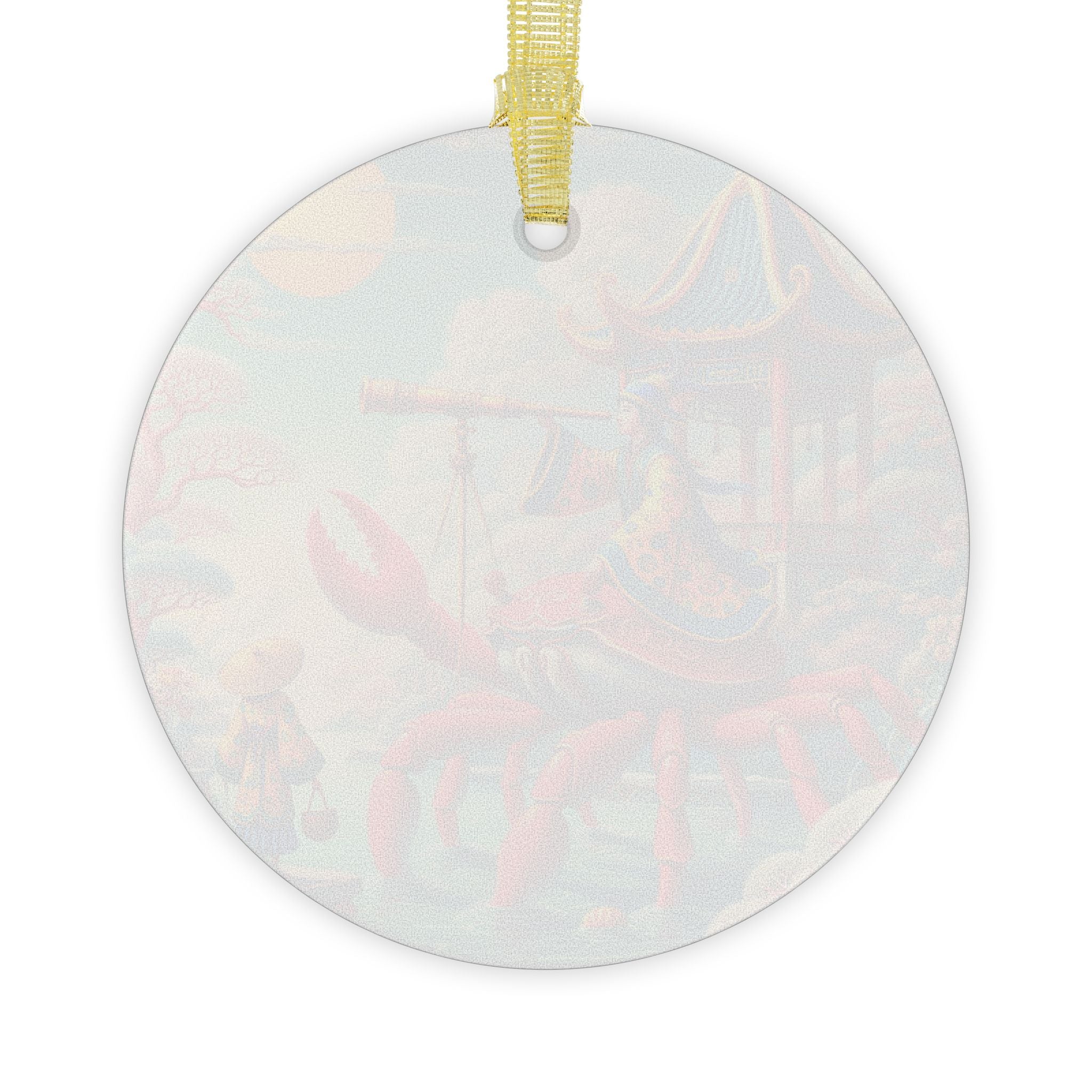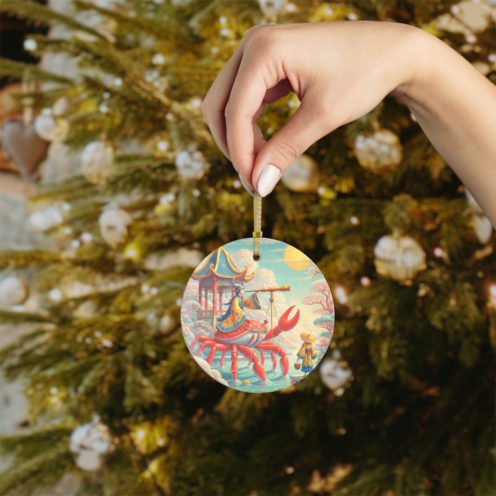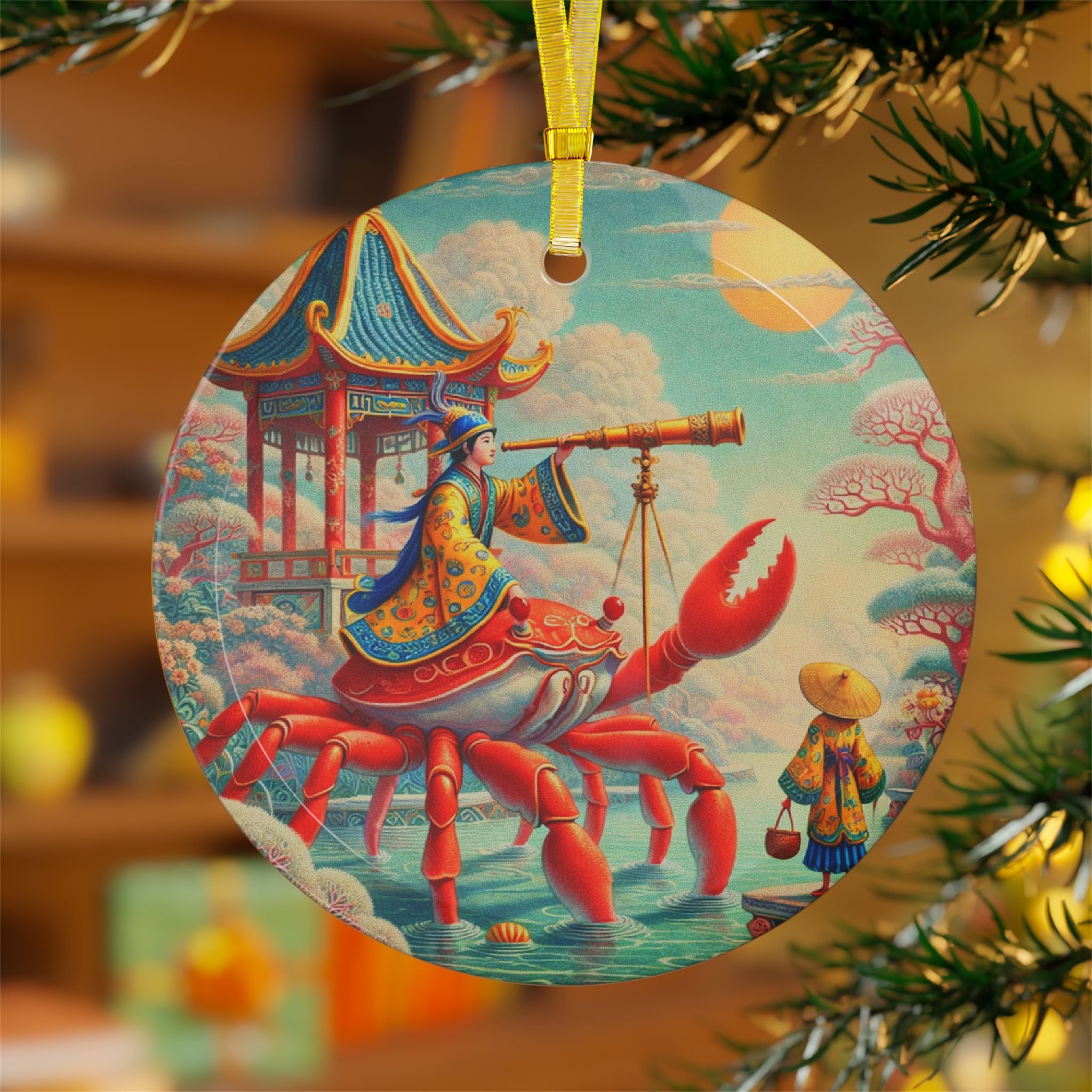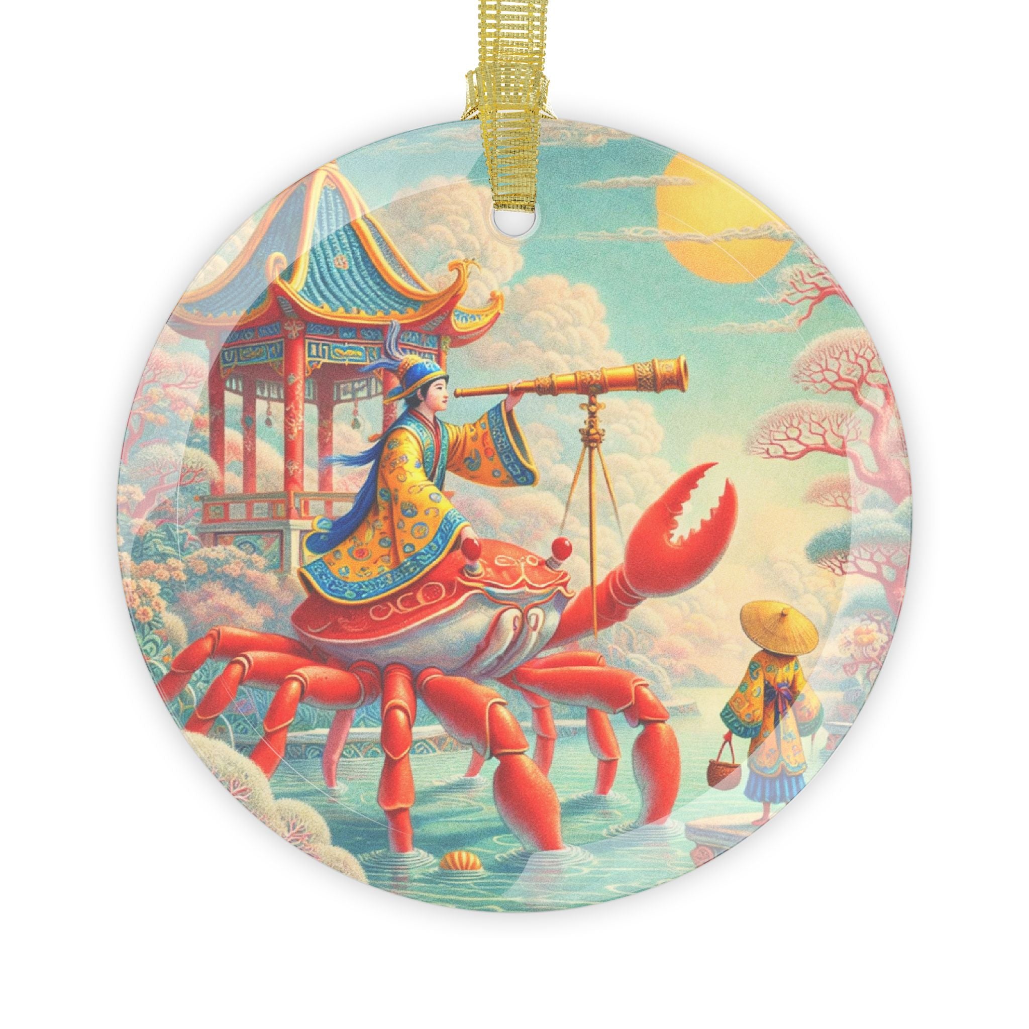 The Celestial Crab Navigator Glass Ornament brings art and ritual together in a refined decorative piece designed to catch the light and invite contemplation. Crafted from clear glass with beveled edges and finished with a gold ribbon for hanging, this ornament transforms a functional holiday or display accent into a small, luminous artwork suited for seasonal décor, collectors’ displays, or year-round ornamental use.